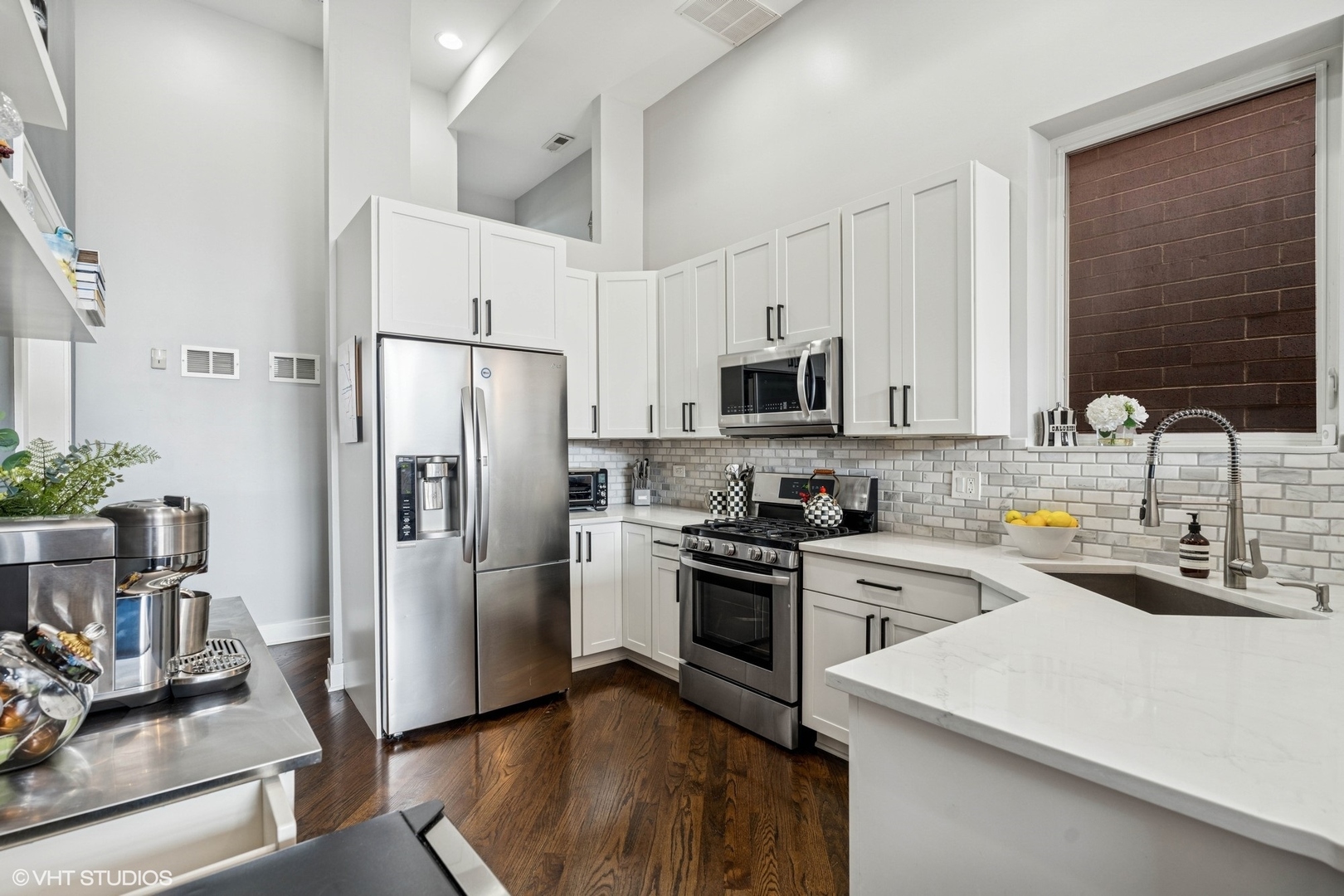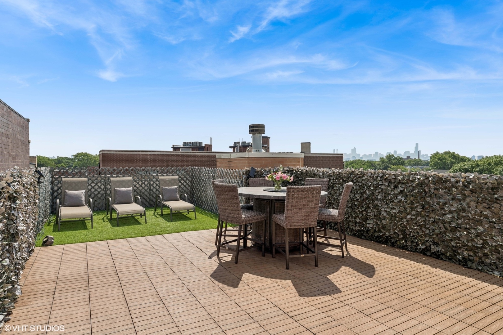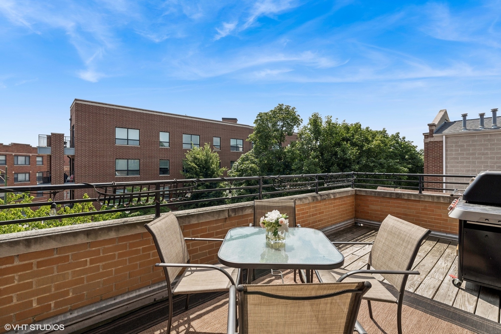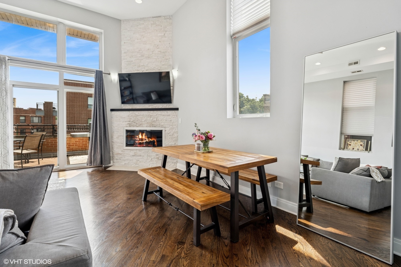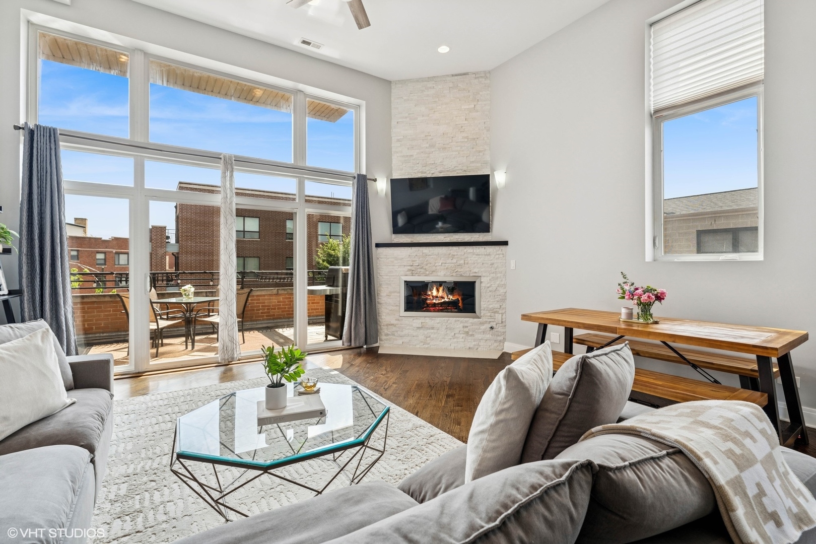 Experience elevated living in this stunning penthouse unit, offering expansive square footage and unmatched privacy. Rich oak hardwood floors in a sophisticated walnut finish flow seamlessly throughout, including all bedrooms. The main living space boasts soaring 15-foot ceilings and a striking modern stone wood-burning fireplace, creating a dramatic and inviting atmosphere. Step outside to your large private balcony-perfect for entertaining or relaxing in style. The chef’s kitchen is freshly upgraded with gleaming white marble quartz countertops, 42-inch cabinetry, LED under-cabinet lighting, and an elegant marble backsplash. The luxurious primary suite features a Juliet balcony, a spa-inspired en suite bath with a walk-in shower, and a soaking tub. Two additional generously sized bedrooms offer complete privacy, along with a well-appointed second bathroom. As a true top-floor unit, enjoy exclusive access to the newly finished rooftop deck with breathtaking views of the Chicago skyline. Garage parking is included. Situated in West Roscoe Village,close to premier dining, the West 312 Riverrrun path, vibrant parks, shopping and more. Don’t miss this amazing opportunity!