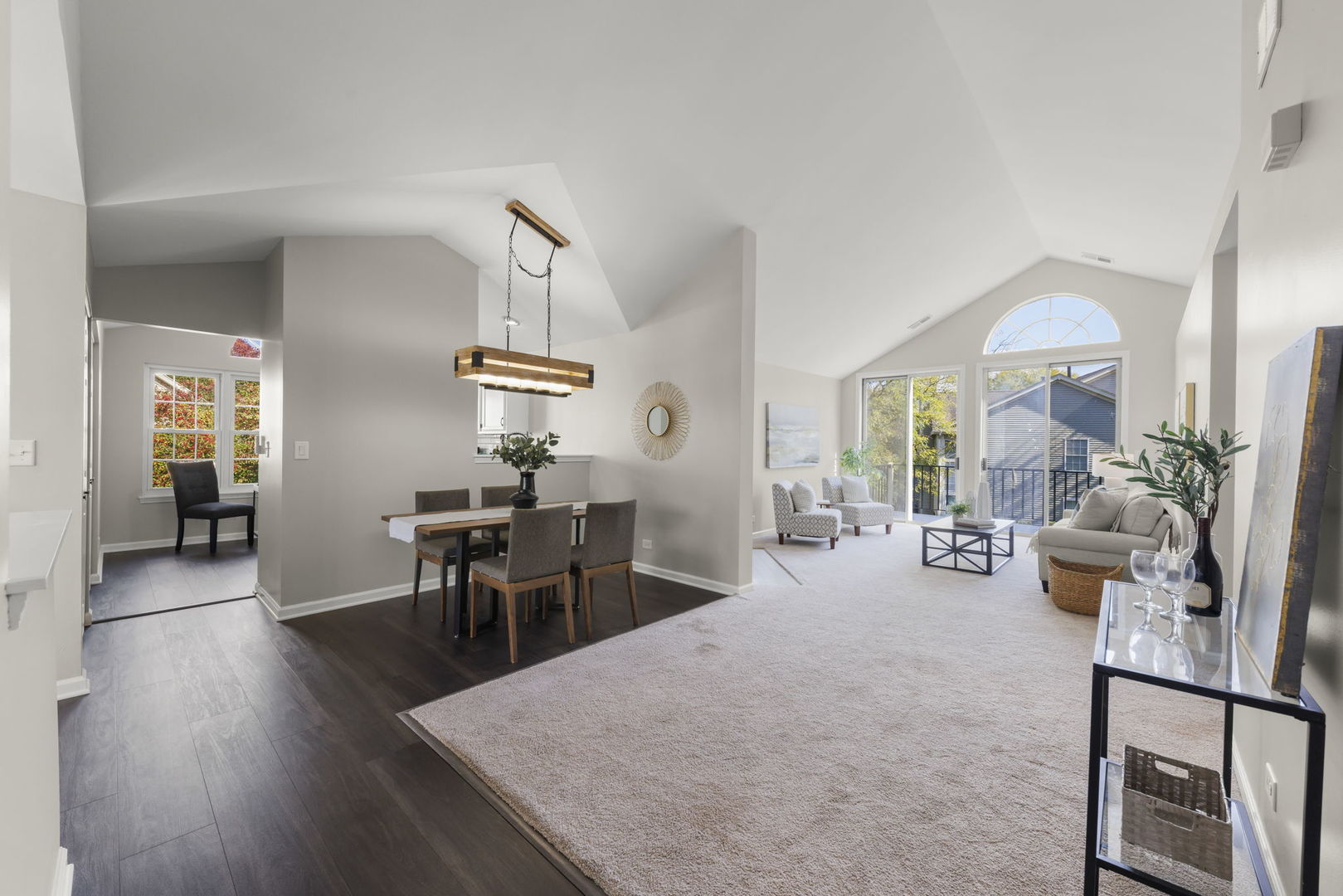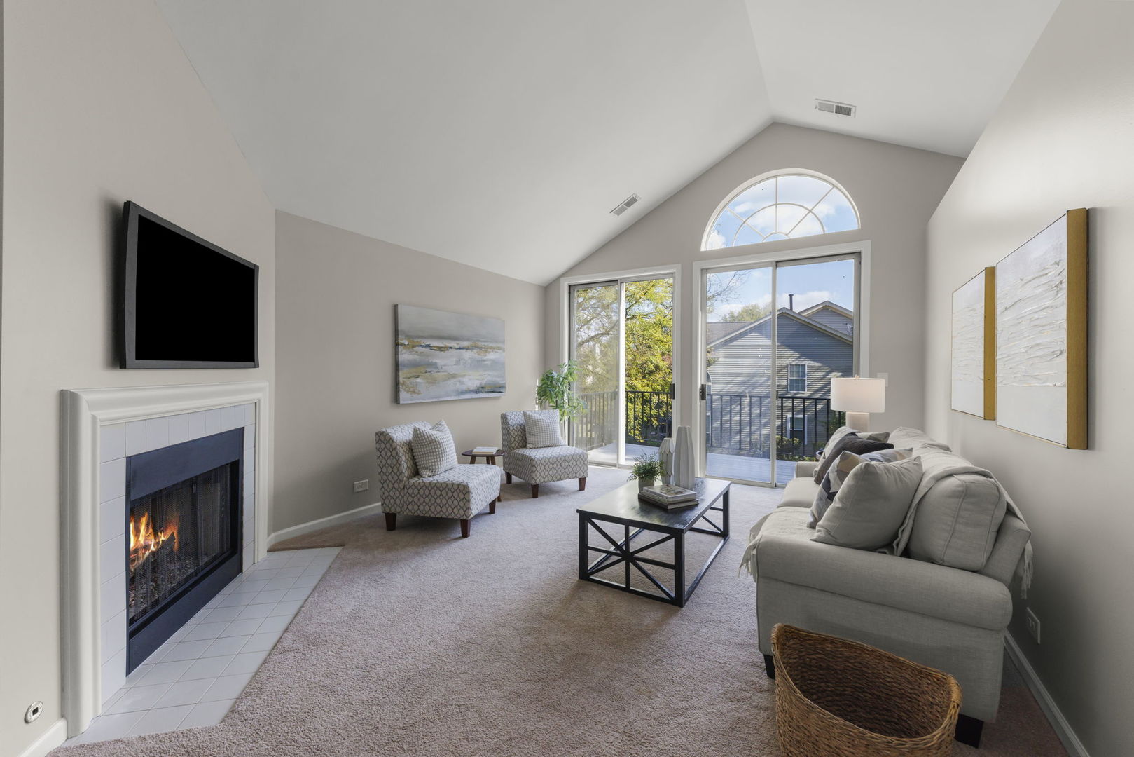 Welcome to the desirable Maple Hill Clubhouse Subdivision in Warrenville! This beautifully updated home features an open floor plan with vaulted ceilings, a cozy gas fireplace, and a private deck/balcony perfect for relaxing or watching the sunset. A flexible home office with a private entrance can also serve as a third bedroom. The updated kitchen offers two pantry closets, stainless steel appliances (2017), and plenty of workspace. The primary suite includes a walk-in closet and a remodeled full bath with dual sinks and neutral finishes. A second remodeled full bath features a newer vanity, toilet, and tiled shower connecting to the second bedroom and in unit laundry area with a high efficiency washer and dryer (2017). Additional updates include triple argon vinyl windows (2018), hot water heater and water softener (2017), garbage disposal (2017), fresh paint in the living, dining, and entry areas, new vinyl plank flooring (2025), a remodeled master bath (2017). Enjoy the convenience of an attached two-car garage and community amenities including a clubhouse, pool, and walking paths. Move right in and enjoy comfortable, low-maintenance living in a prime Warrenville location! AC 2016-2017, Furnace original.