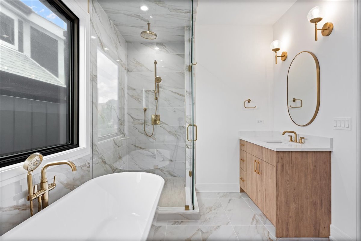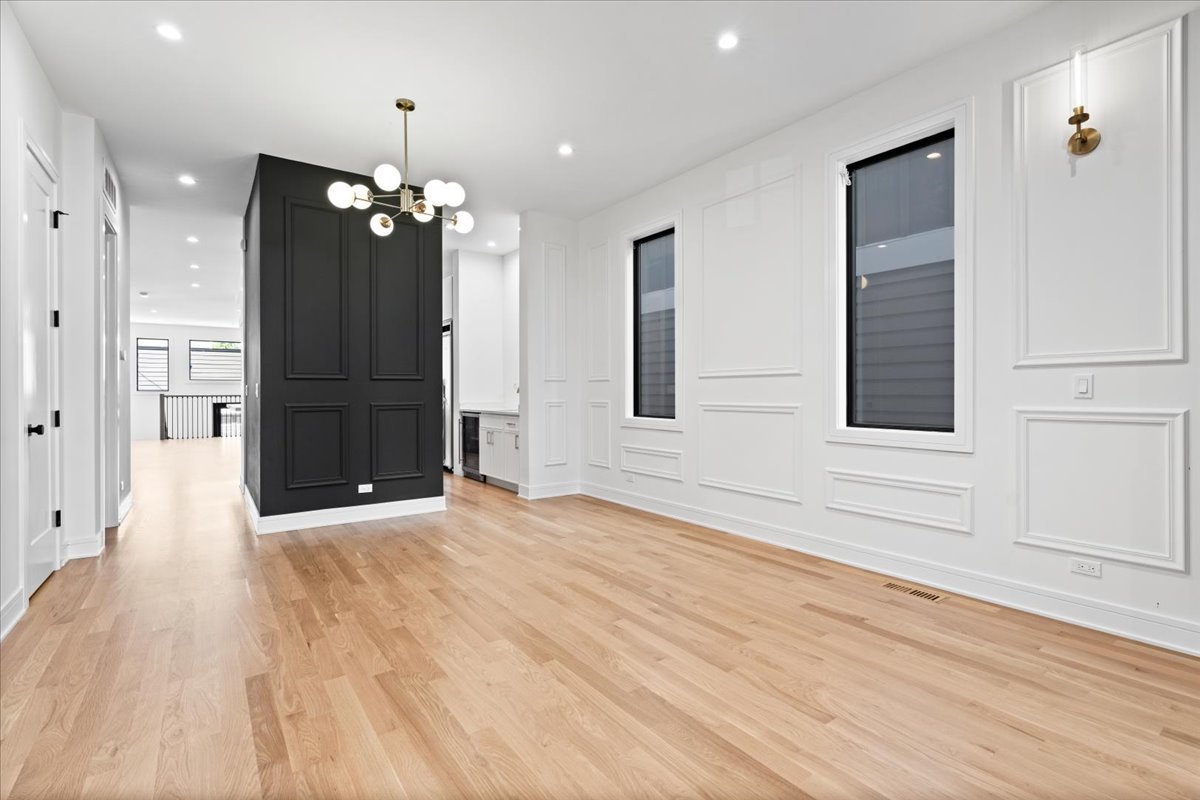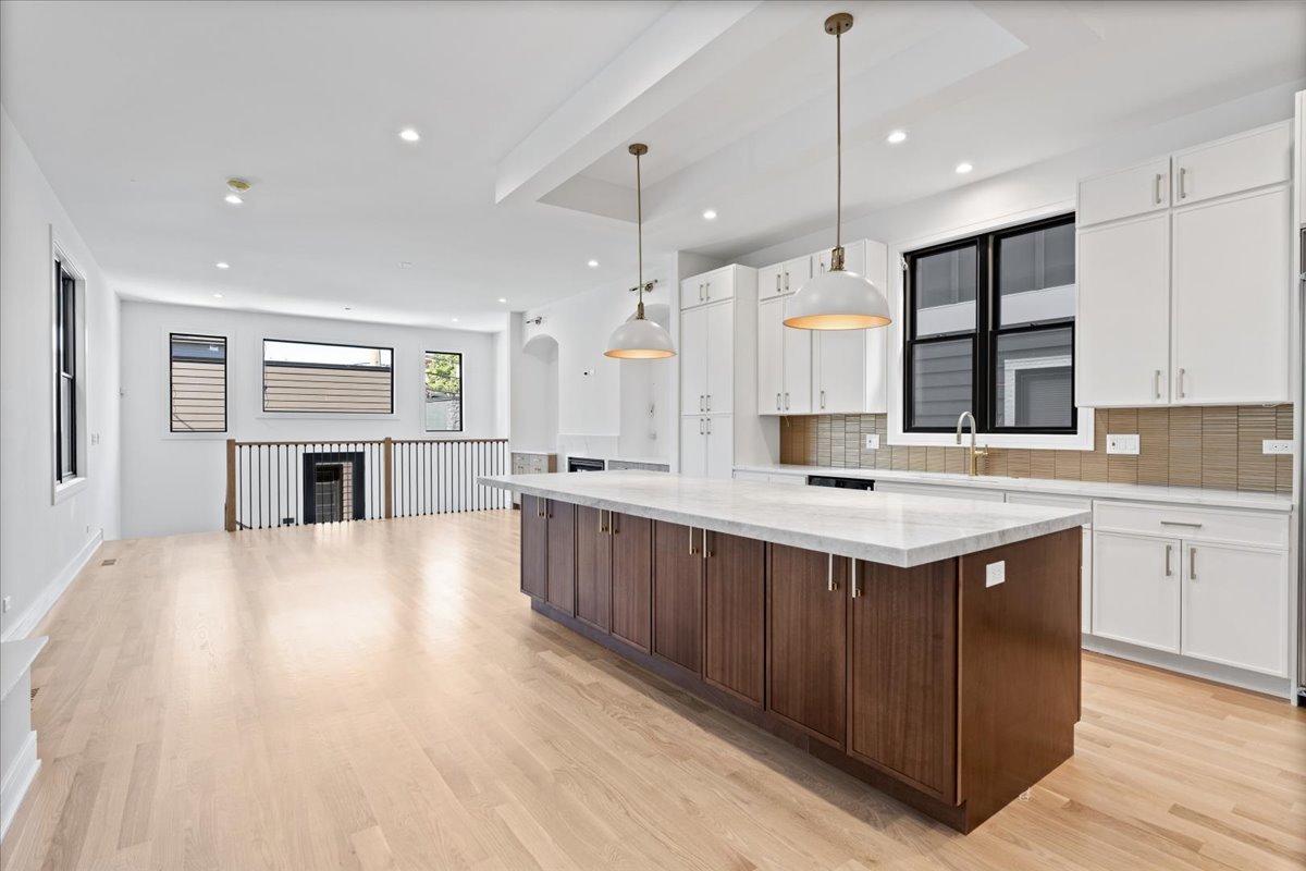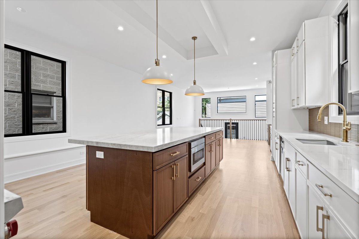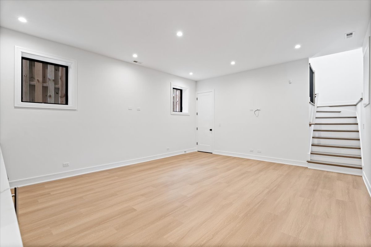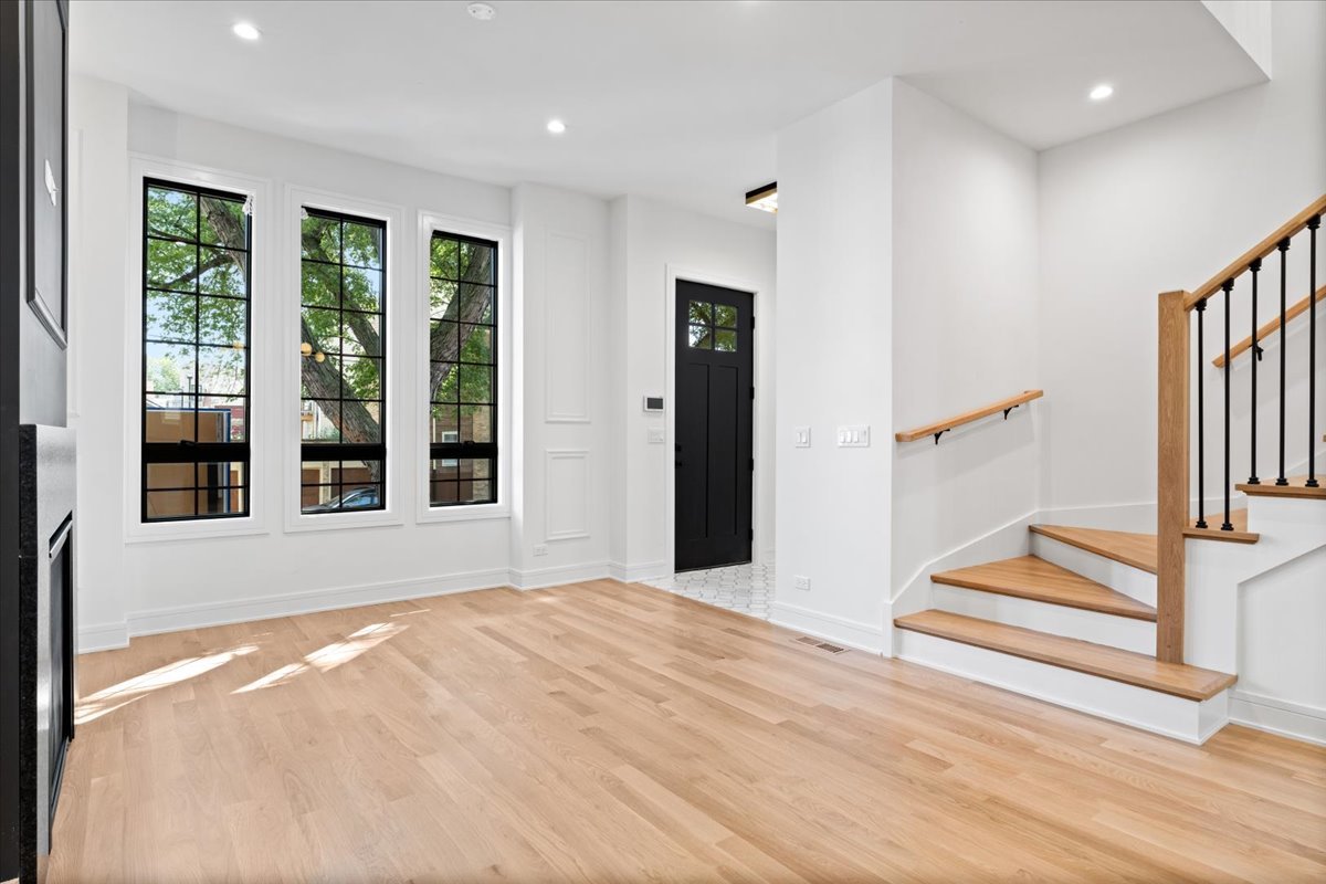 This stunning 6 Bedroom (4 Beds Up) 4.2 Bath New Construction single-family home is located just minutes from the heart of Hamlin Park and Roscoe Village. The bright and open floor-plan showcases, expansive room sizes, extensive millwork and lofty ceiling heights. The custom built; eat-in kitchen with banquet anchors the great room and was designed for day to day living and entertaining alike. The center island is enveloped by custom soft-close cabinetry, professional grade appliances and stunning tile work. The abundant interior living space is matched by multiple private outdoor areas including a rear patio with gas connection for grilling and a spacious garage roof deck with SW exposures. The upper lvl provides 4 large bedrooms, 3 full baths and full size front-load laundry. The primary bedroom features a dramatic walk-in closets with custom shelving and a serene primary bath with glass encased steam shower, stand-alone soaking tub, dual vanity and heated floors. The lower lvl includes two additional bedrooms and a sizable family room with radiant heated flooring + excellent storage. Additional features include 2 car garage parking, low voltage wiring for internet and AV, custom built closets and hardwood flooring throughout.