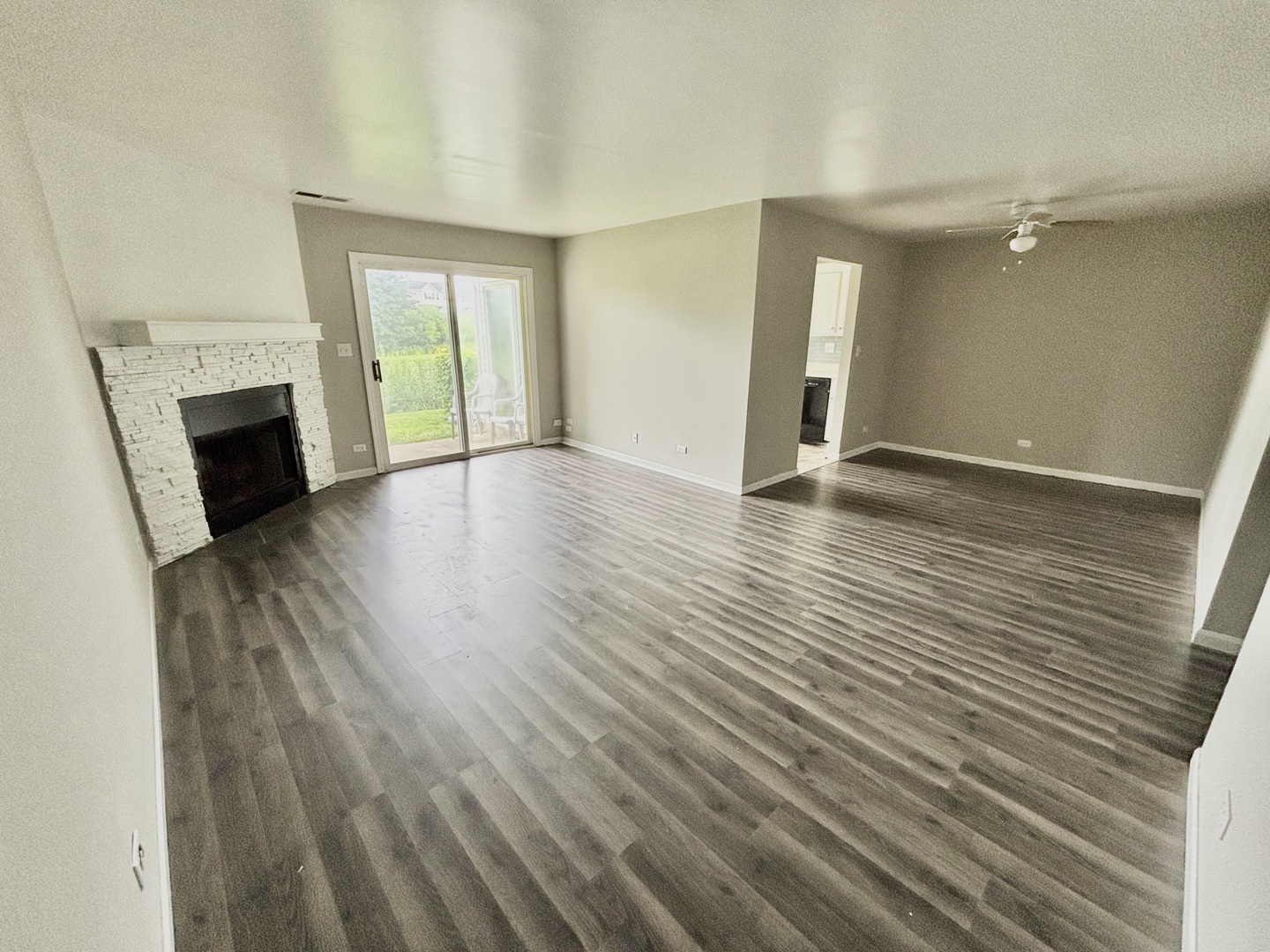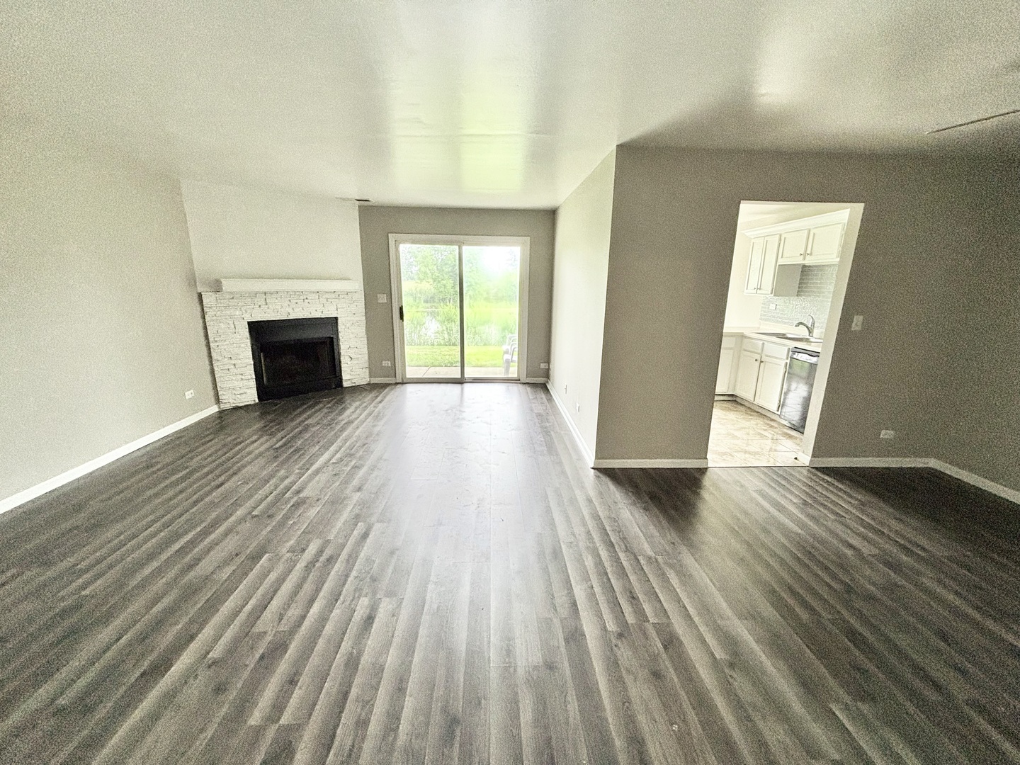 Welcome home to this beautifully designed first-floor condo offering an abundance of natural light from multiple sliding glass doors that seamlessly blend indoor and outdoor living. Step onto your private patio and enjoy tranquil views overlooking the pond, perfect for relaxing mornings or peaceful evenings. Inside, the spacious dine-in kitchen features classic white shaker cabinets and plenty of storage, while the open living room centers around a striking white stone fireplace that adds both warmth and style. Two generously sized bedrooms provide comfort and flexibility, complemented by the convenience of an in-unit laundry room. With its bright, airy feel and modern finishes throughout, this condo is move-in ready and designed for easy living.