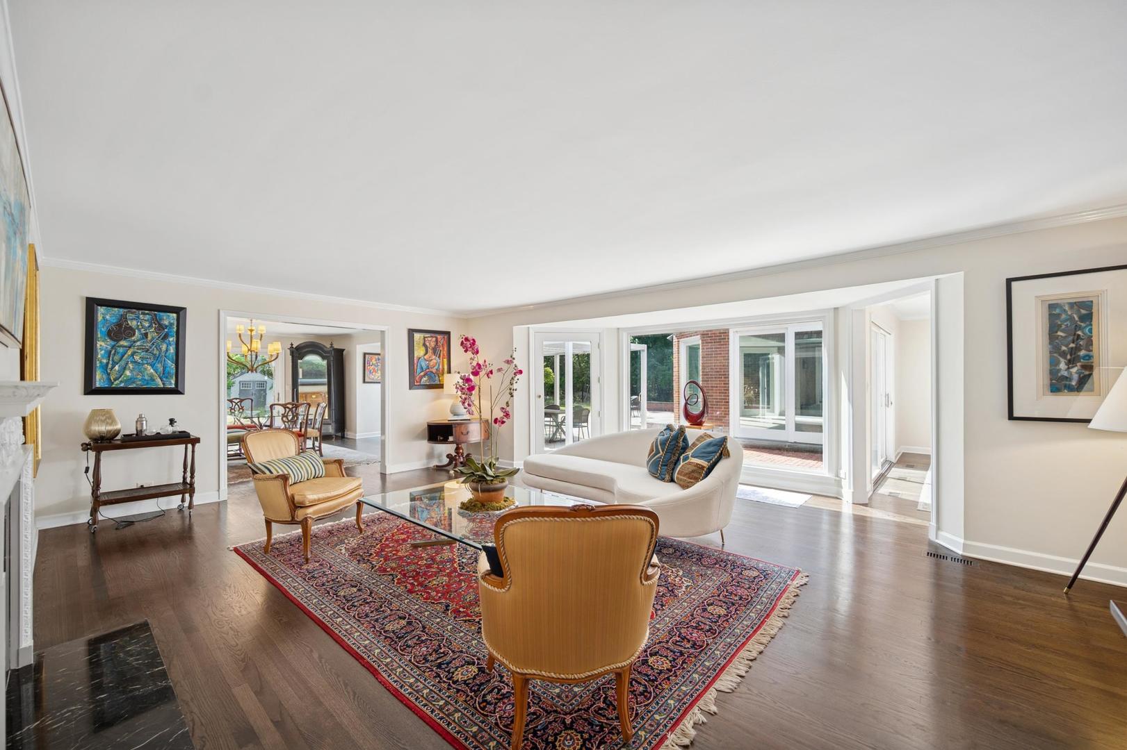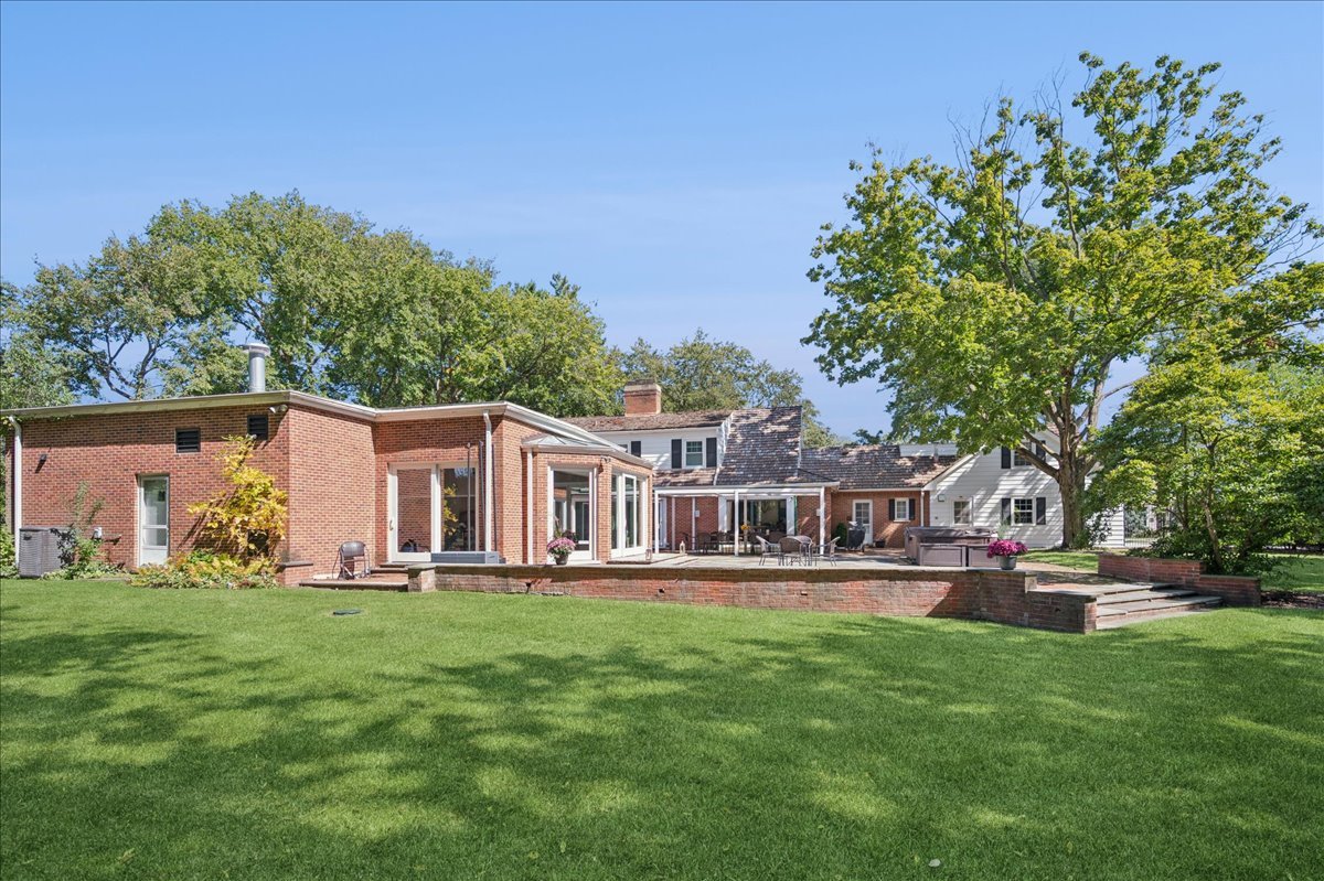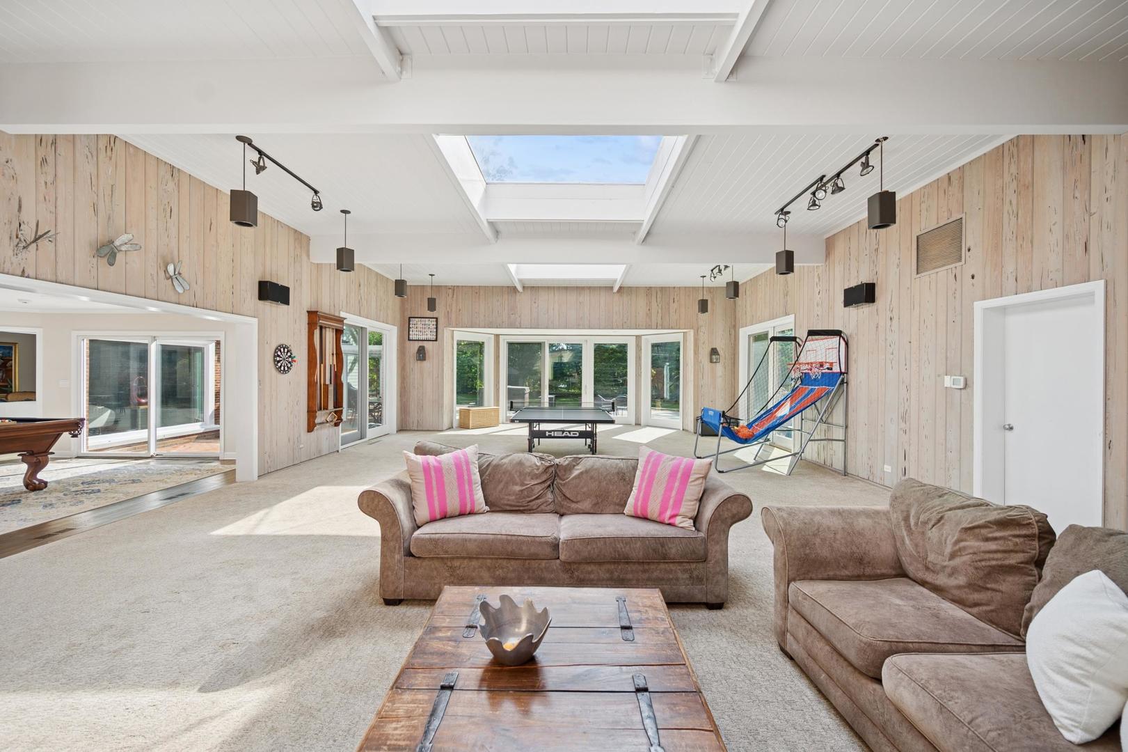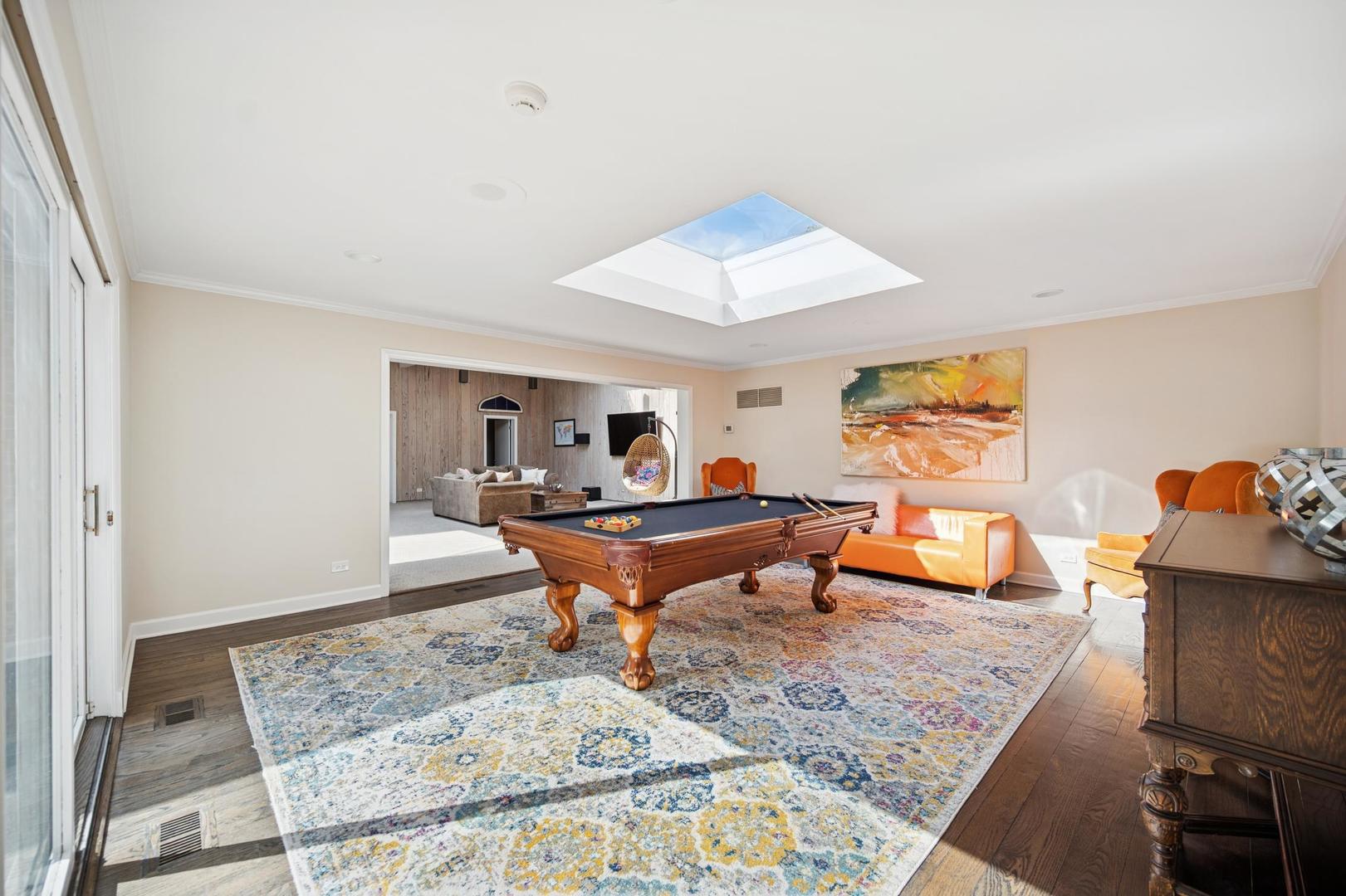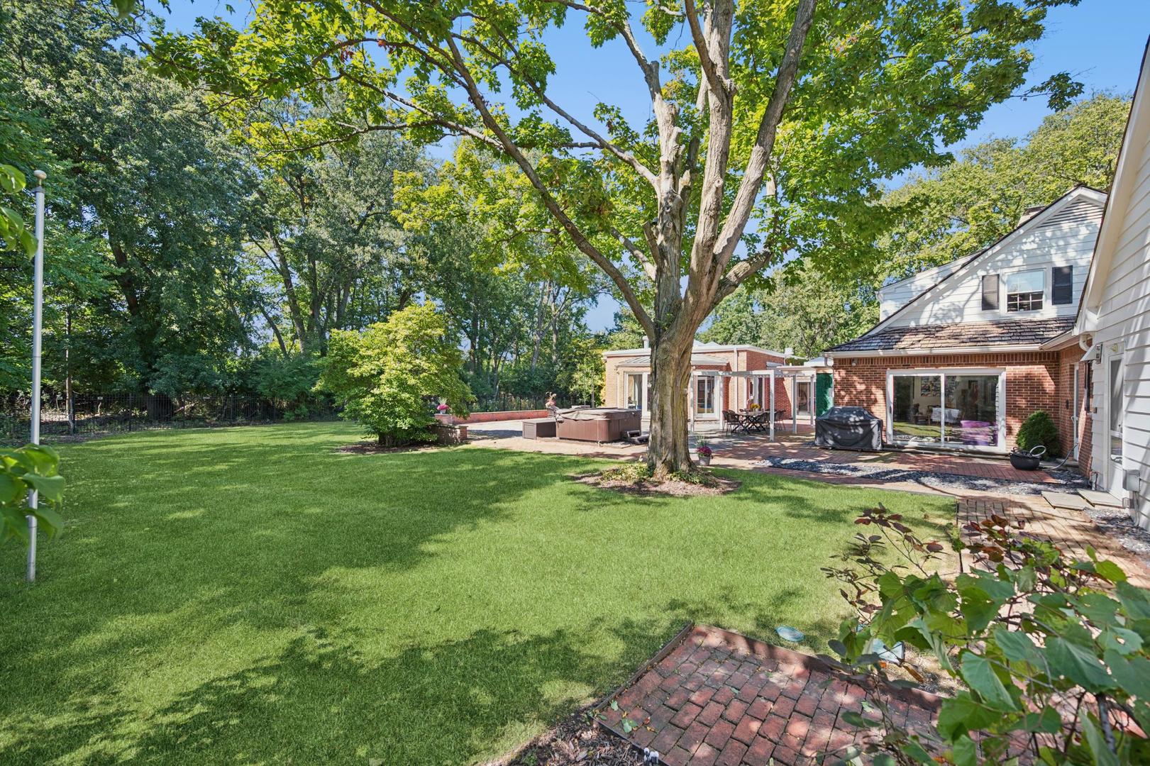 Desirable one-floor living, set privately on nearly an acre along a peaceful lane. With approximately 5,493 SF of comfortable living space, this fabulous 5 BR/5.1 BA home has been thoughtfully updated inside and out. The main level showcases the heart of the home: a sun-filled family room with a handsome fireplace, opening to a custom kitchen outfitted with top-tier appliances and wood mode cabinetry. The open floor plan, designed for comfort and expansive views, continues with living and dining rooms that flow seamlessly into a cheerful game room and an incredibly spacious rec room/second family room, featuring soaring ceilings, skylights, and doors to a sweeping bluestone terrace. A luxurious primary suite wing includes a large bath, generous walk-in closet, classic plantation shutters, and a private office. Upstairs in the family wing, you’ll find three spacious bedrooms and two updated baths. In the south wing, a private staircase leads to a separate suite with a sitting room, bedroom, and bath-ideal for guests, an au pair, or a teenager’s retreat. The beautiful fenced backyard overlooks a tranquil forest preserve, perfect for relaxation and outdoor gatherings. Additional highlights include new upstairs windows, hardwood floors, a Sonos whole-house sound system, a heated 3-car garage, and abundant attic storage. This move-in-ready home offers timeless comfort and modern living at its finest. Showings begin at broker open October 7th.