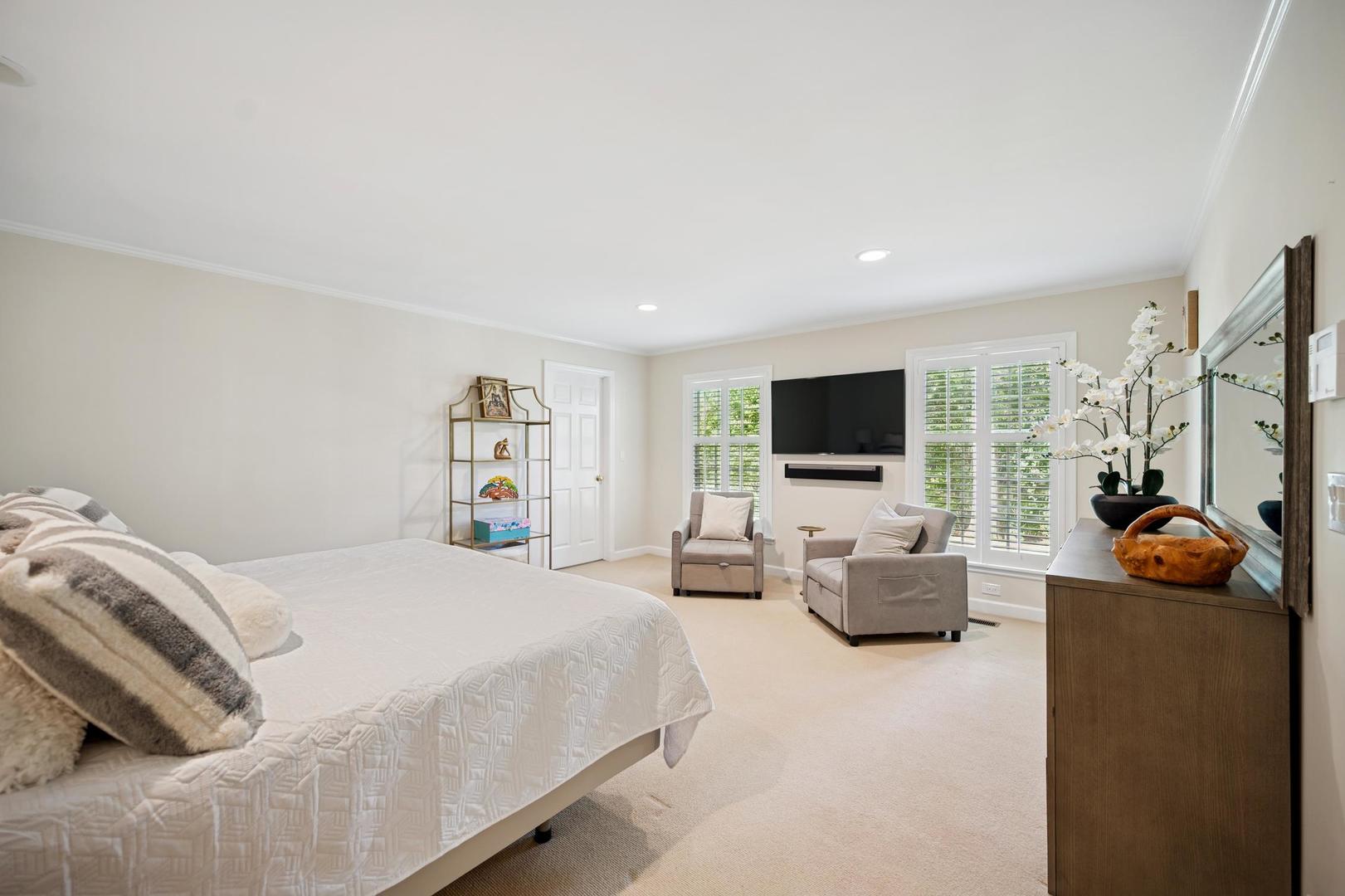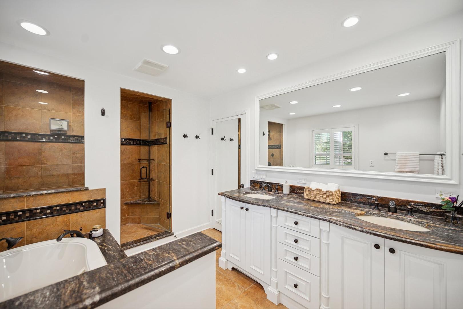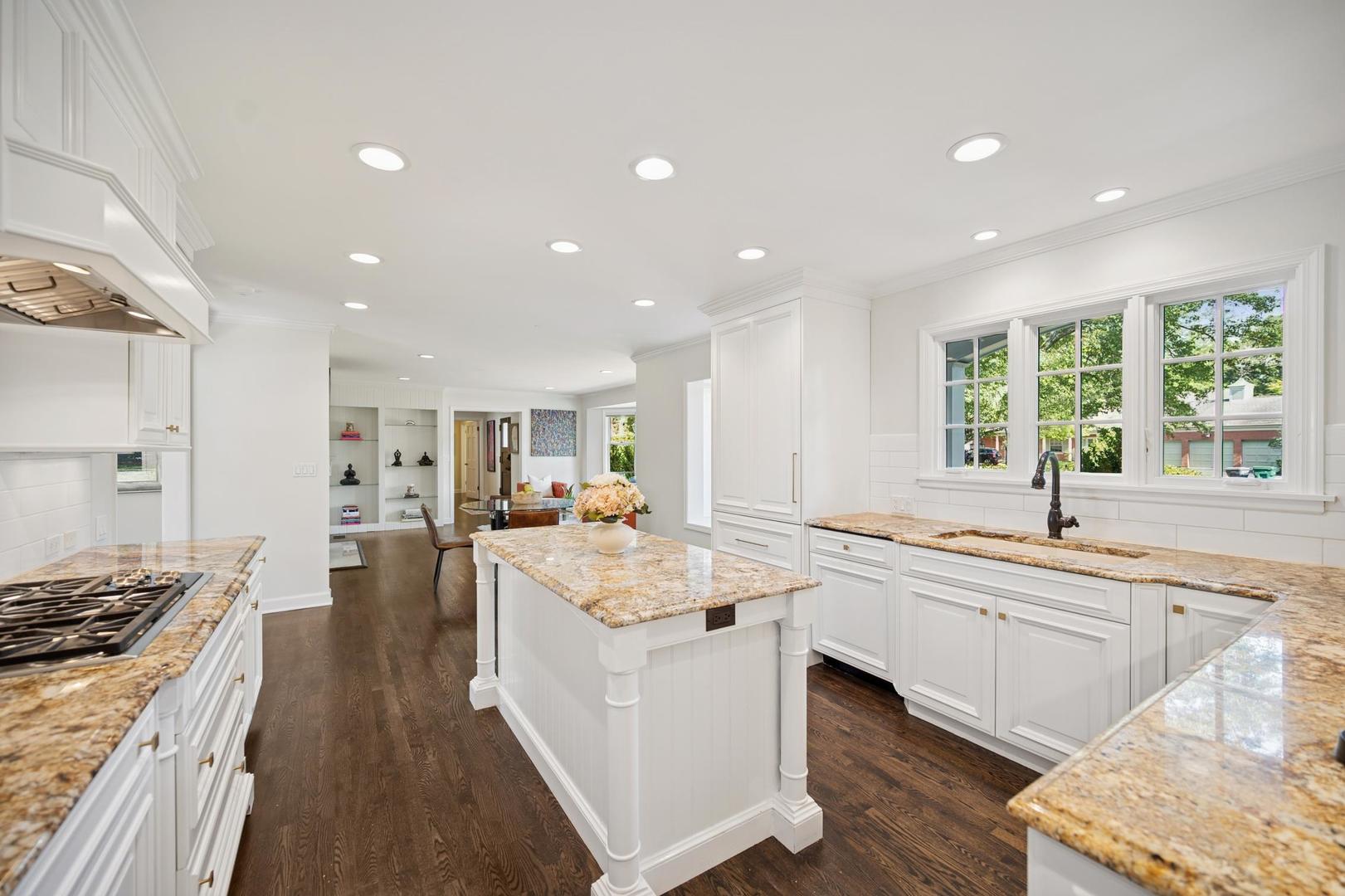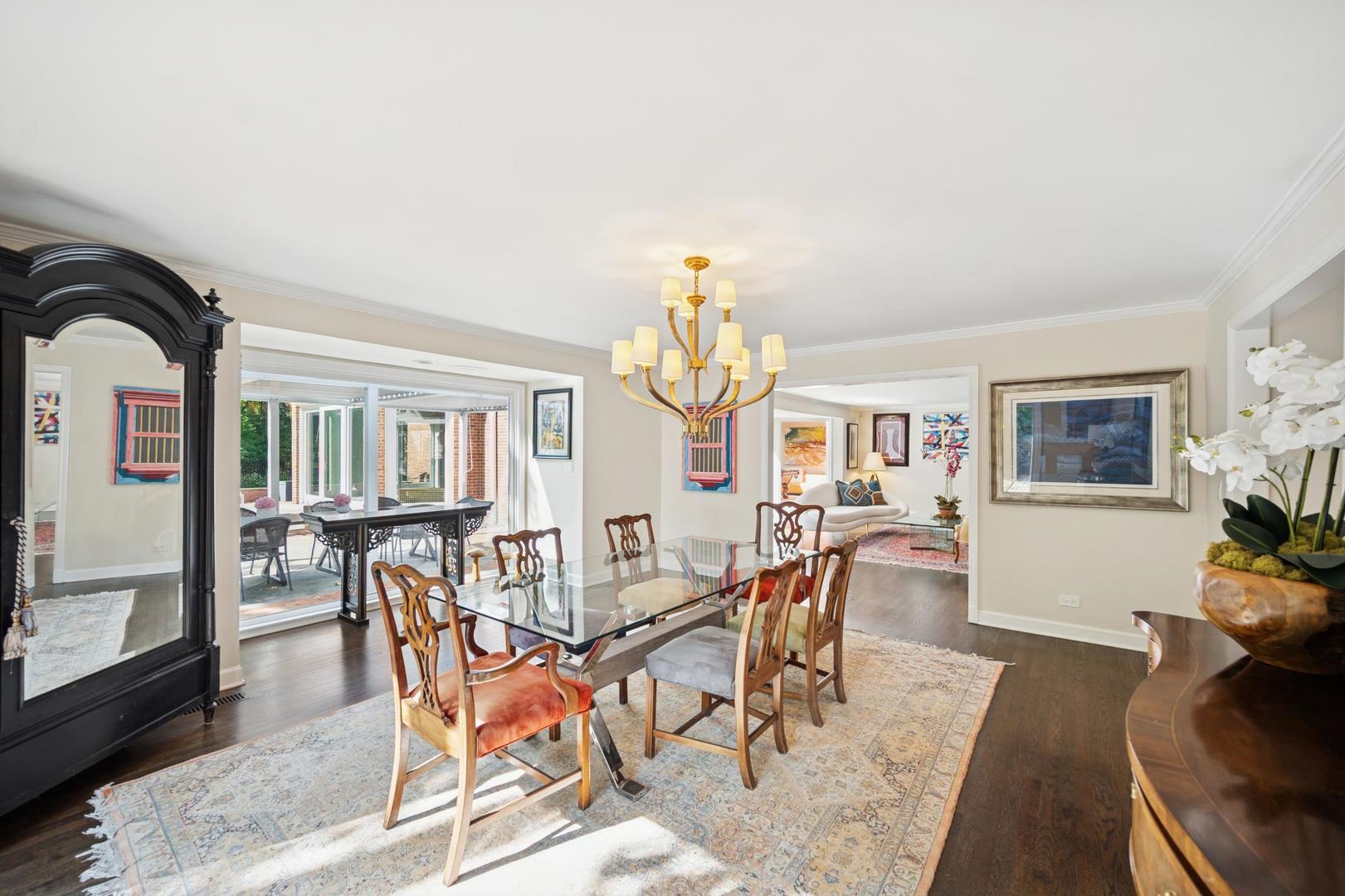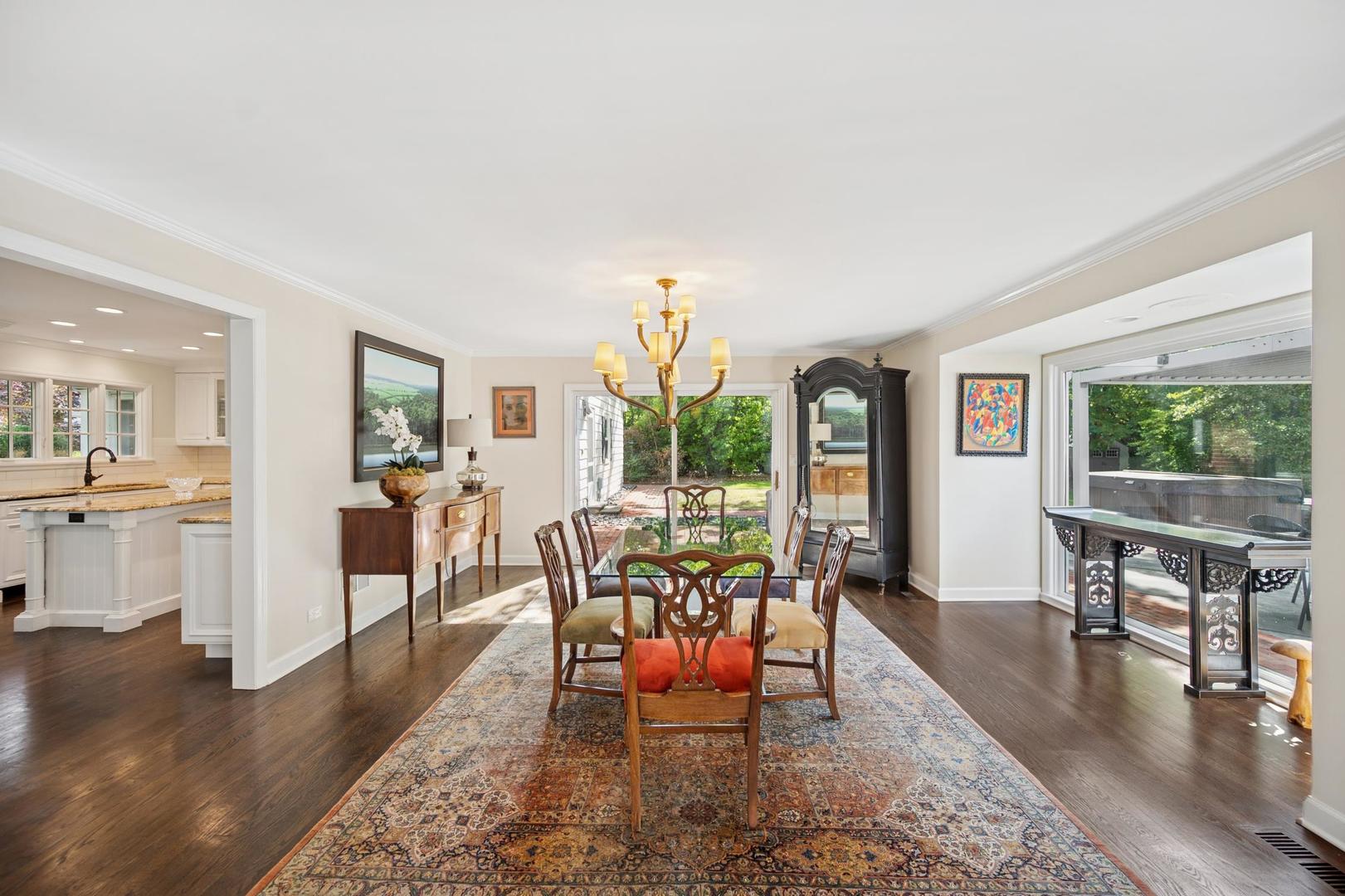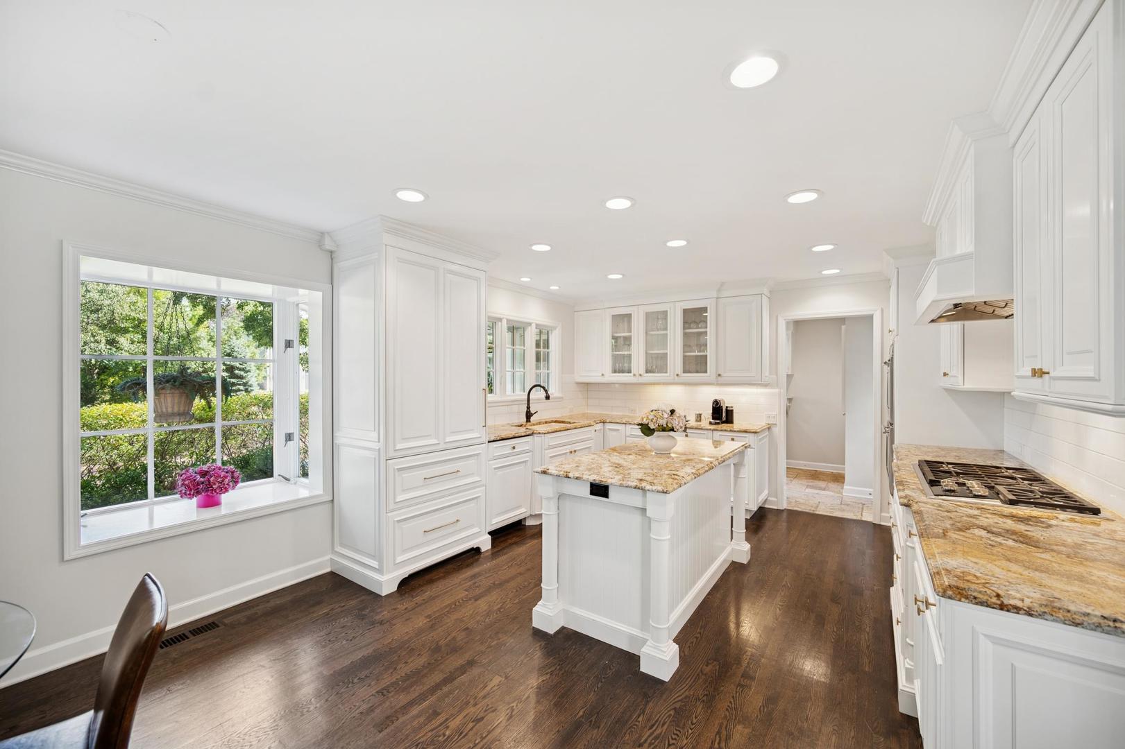 Desirable one-floor living, set privately on nearly an acre along a peaceful lane. With approximately 5,493 SF of comfortable living space, this fabulous 5 BR/5.1 BA home has been thoughtfully updated inside and out. The main level showcases the heart of the home: a sun-filled family room with a handsome fireplace, opening to a custom kitchen outfitted with top-tier appliances and wood mode cabinetry. The open floor plan, designed for comfort and expansive views, continues with living and dining rooms that flow seamlessly into a cheerful game room and an incredibly spacious rec room/second family room, featuring soaring ceilings, skylights, and doors to a sweeping bluestone terrace. A luxurious primary suite wing includes a large bath, generous walk-in closet, classic plantation shutters, and a private office. Upstairs in the family wing, you’ll find three spacious bedrooms and two updated baths. In the south wing, a private staircase leads to a separate suite with a sitting room, bedroom, and bath-ideal for guests, an au pair, or a teenager’s retreat. The beautiful fenced backyard overlooks a tranquil forest preserve, perfect for relaxation and outdoor gatherings. Additional highlights include new upstairs windows, hardwood floors, a Sonos whole-house sound system, a heated 3-car garage, and abundant attic storage. This move-in-ready home offers timeless comfort and modern living at its finest. Showings begin at broker open October 7th.