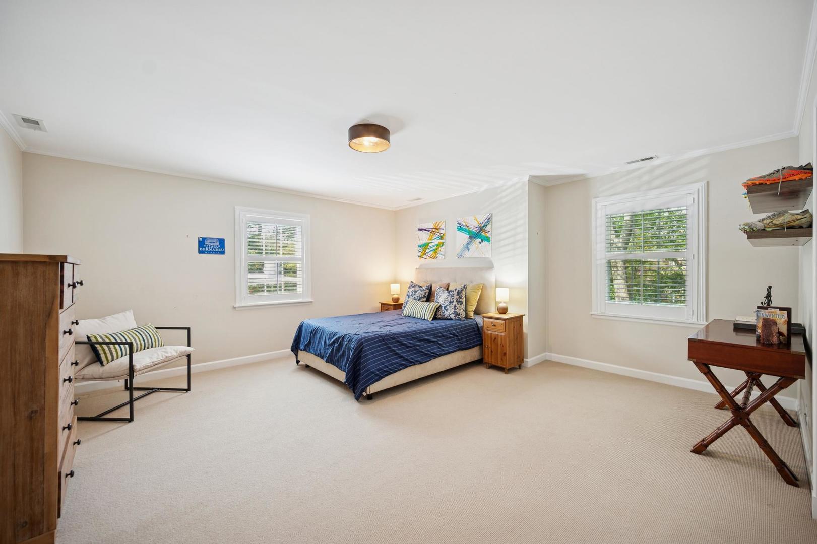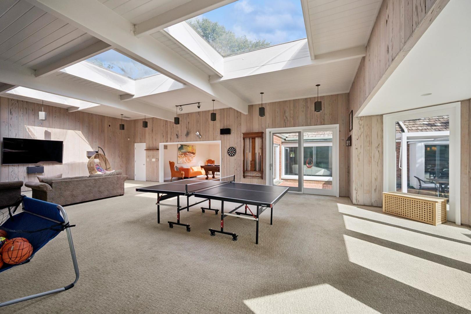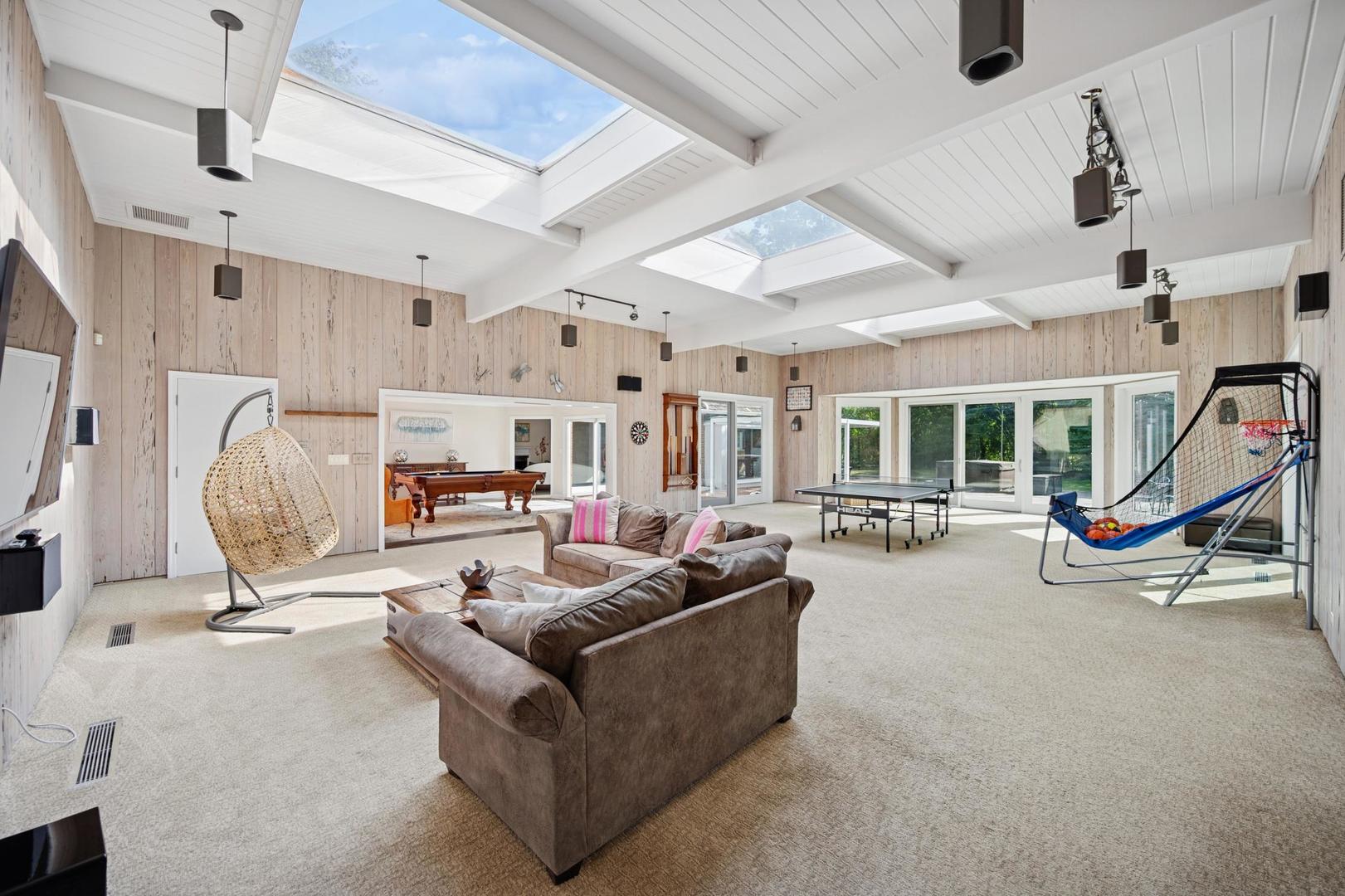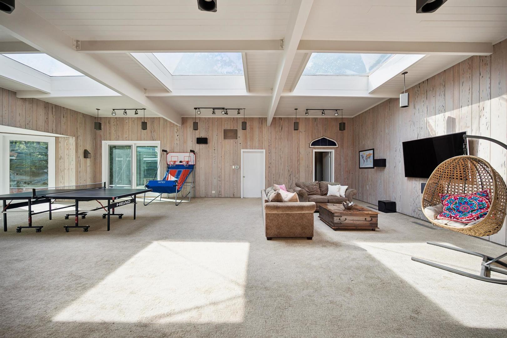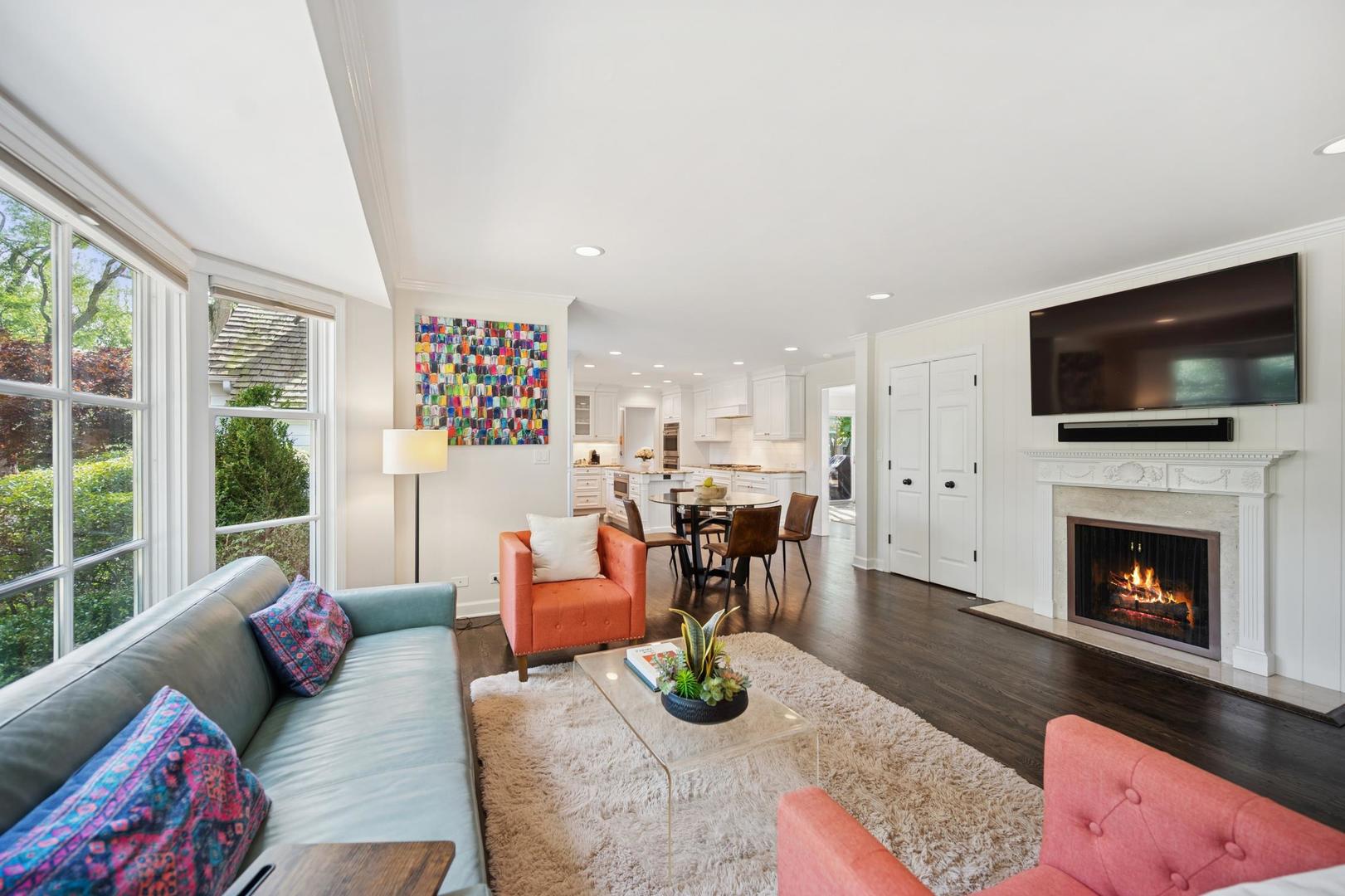 Desirable one-floor living, set privately on nearly an acre along a peaceful lane. With approximately 5,493 SF of comfortable living space, this fabulous 5 BR/5.1 BA home has been thoughtfully updated inside and out. The main level showcases the heart of the home: a sun-filled family room with a handsome fireplace, opening to a custom kitchen outfitted with top-tier appliances and wood mode cabinetry. The open floor plan, designed for comfort and expansive views, continues with living and dining rooms that flow seamlessly into a cheerful game room and an incredibly spacious rec room/second family room, featuring soaring ceilings, skylights, and doors to a sweeping bluestone terrace. A luxurious primary suite wing includes a large bath, generous walk-in closet, classic plantation shutters, and a private office. Upstairs in the family wing, you’ll find three spacious bedrooms and two updated baths. In the south wing, a private staircase leads to a separate suite with a sitting room, bedroom, and bath-ideal for guests, an au pair, or a teenager’s retreat. The beautiful fenced backyard overlooks a tranquil forest preserve, perfect for relaxation and outdoor gatherings. Additional highlights include new upstairs windows, hardwood floors, a Sonos whole-house sound system, a heated 3-car garage, and abundant attic storage. This move-in-ready home offers timeless comfort and modern living at its finest. Showings begin at broker open October 7th.