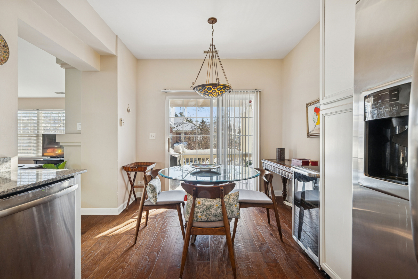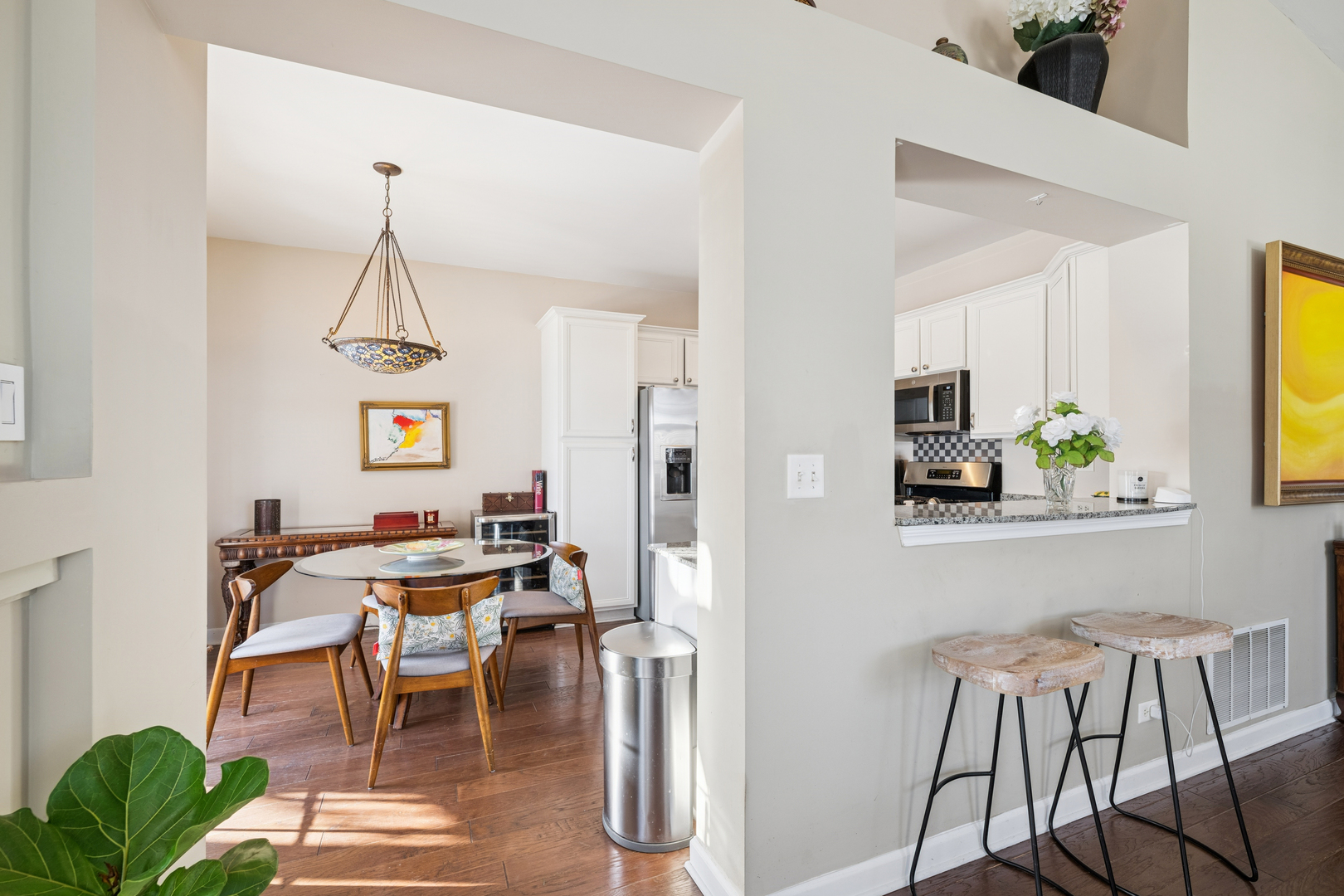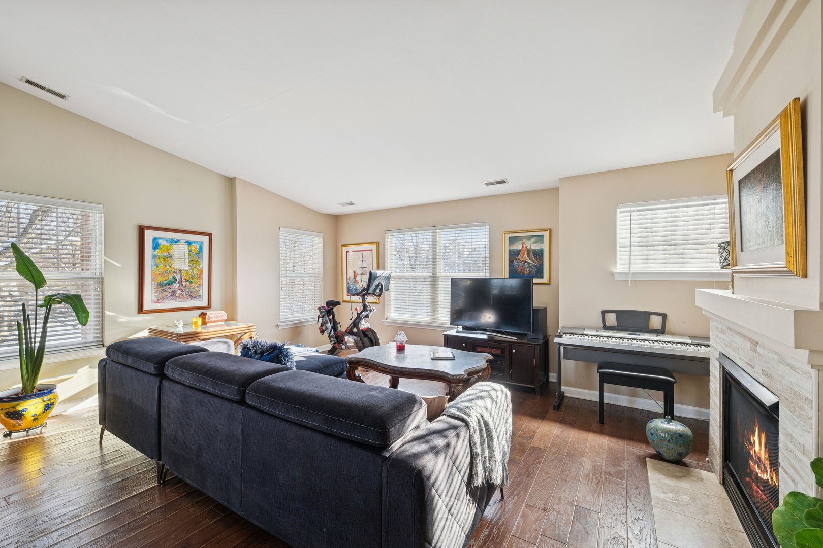 Beautifully updated in the highly desirable Southgate at The Glen, 2nd-floor sophisticated end-unit townhome offering a premium park setting with stunning seasonal views. This flexible floor plan features 2 bedrooms plus a versatile den/loft that can easily serve as a 3rd bedroom, along with 2 full baths, a private south-facing balcony, and an attached 2-car garage. The sun-filled cook’s kitchen shines with white cabinetry, stainless steel appliances, a gas stove, long granite counters, a closet pantry, and abundant natural light. A breakfast bar flows into the open concept living and dining rooms, where a redesigned stacked marble and stone fireplace creates a beautiful focal point-perfect for entertaining. Vaulted ceilings, palladium windows, hardwood floors, and a dramatic 2-story foyer enhance the inviting atmosphere. Double doors lead to a spacious primary suite, featuring a luxurious bath with dual vanity sinks, a glass-enclosed walk-in shower, a separate oversized jacuzzi tub, and a large custom-organized walk-in closet. The 2nd bedroom is generously sized, and 2nd full bath includes a tub/shower combination. A large laundry room with full-size stackable washer and dryer adds convenience & storage. Recent mechanical and exterior upgrades include a new furnace (2024), roof/gutters (2020), A/C (2021). Enjoy maintenance-free living in a tree-lined neighborhood close to award-winning schools, restaurants, shopping, two golf courses, Lake Glenview, parks, tennis/pickle courts, Glenview Park District- Rec Center, and the Metra train. A truly lovely home in an unbeatable location.