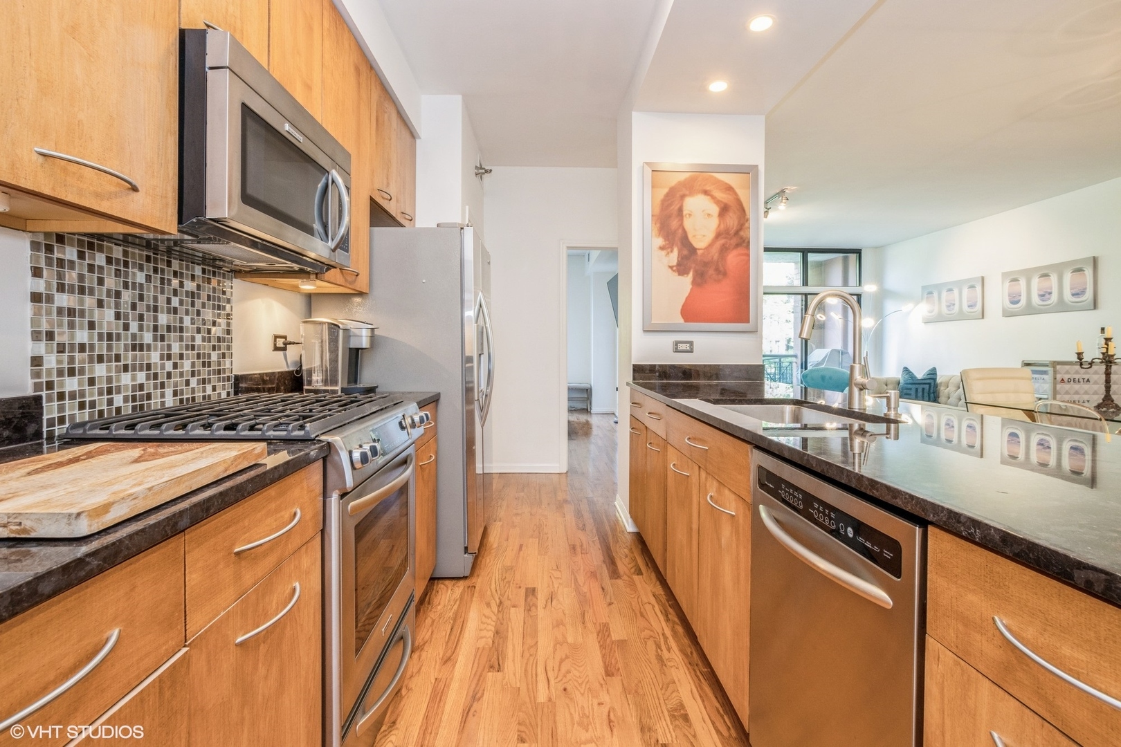 EAST LAKEVIEW – PLAZA32 – PRIME LOCATION. This beautiful home overlooks the tree-lined park and does not face Halsted. Stunning, renovated one bedroom, one bath with a balcony and heated garage parking space #126 is included in a boutique elevator building with 24-hour door staff. Beautiful kitchen with granite countertops, stainless steel appliances, and 42″ Solid wood cabinetry with pull out shelves and soft close drawers. The spacious bathroom features porcelain heated tile floors, soaking tub/shower, and a custom cherry wood vanity w/marble top and an oversized under mount sink. Beautiful living room with designer lighting, marble gas fireplace, custom window treatments and wire for sound. Walk-in laundry room with front load washer/dryer and storage shelving. The building has a beautiful large common landscaped park. Assessments include nearly everything: All gas (heat & cooking), water (hot & cold), ASTOUND/RCN Digital TV with HBO MAX, and two TIVO HD DVRs, and high-speed internet/Wi-Fi included!! Storage cage included. Dog and cat friendly, building has a private dog run/park. Close to the lakefront, Target, Whole Foods, Mariano’s, CTA-Belmont stop, Starbucks, shopping, & restaurants. Extremely well-managed building.