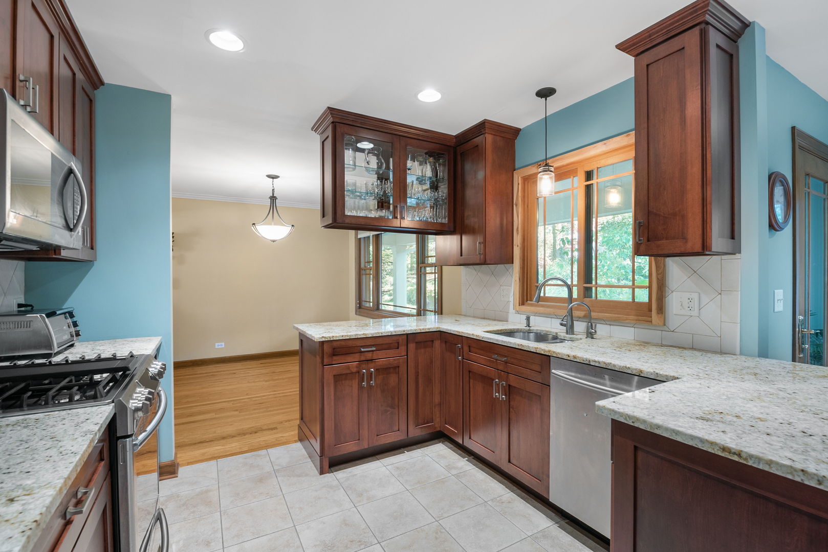 Extremely appealing 4-bedroom Craftsman style beauty with desirable location on a quiet cul-de-sac close to downtown Naperville with the Blue-Ribbon awarded Highland Elementary School just down the street and easy access to Riverwalk and bike path. Impeccable condition, lots of gorgeous hardwood flooring, great kitchen upgraded with highest quality custom made Amish cabinetry, granite counters and stainless-steel appliances, and the eat-in area has backyard entrance and is adjacent to full dining room open to huge living room and foyer for extremely flexible furnishing. Top notch addition of two-bedroom suite with separate full bath and sitting area plus exercise area or reading nook, with a second zoned furnace. Perfect for toddlers, teens or guests! The middle level has primary bedroom with an ensuite bathroom and also has an additional bedroom for either an office or nursery or bedroom as desired. Large carpeted lower level rec-room with fireplace for added living space has a half bath as well as a roomy laundry room with exit/entrance door to outside. Nice covered brick paver patio in the back and a very attractive over-sized custom lawn & garden shed on a full slab for added storage. Tons of beautiful trees and foliage for privacy and enjoyment with lots of curb appeal from the front porch and stone half-wall with sitting area. This is a “can’t miss” opportunity for quality living – you will be very happy here!