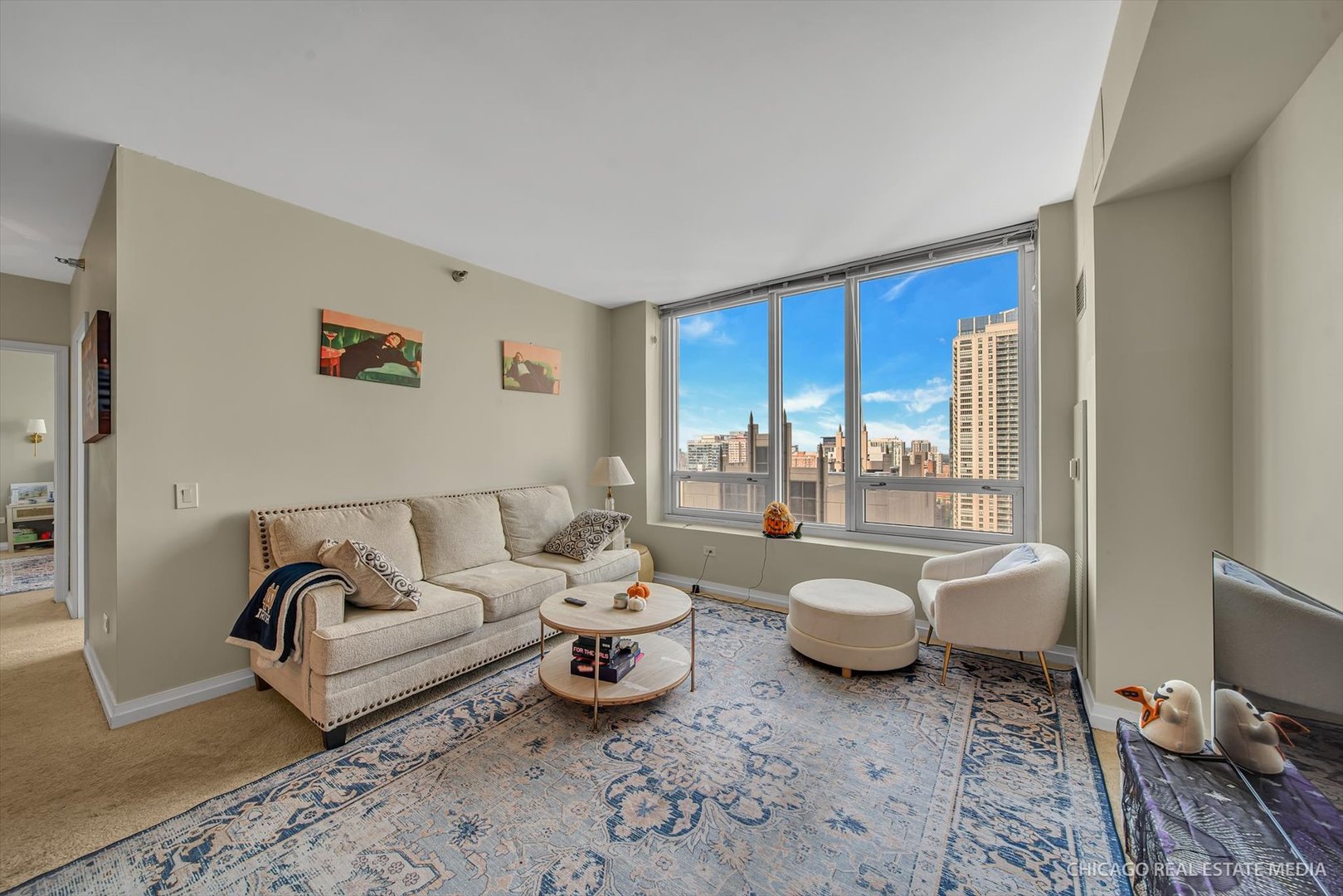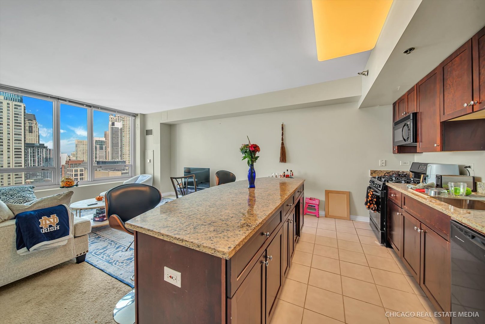 Prime unit in River North – 33rd floor with stunning views from the huge windows. Unit features 2-bedrooms, 1.5-bathrooms. Upgraded kitchen with cherry cabinets and granite countertops. Opening living space. In-unit washer/dryer. Good closet space. Full service building features: doorman, rooftop pool & deck, exercise room, party room. Amenities on the 14th floor. Assessments include heat, air, cable. Price includes garage parking space. Unit sold “as-is.” Tenant occupied until April 2026. Great investment opportunity!