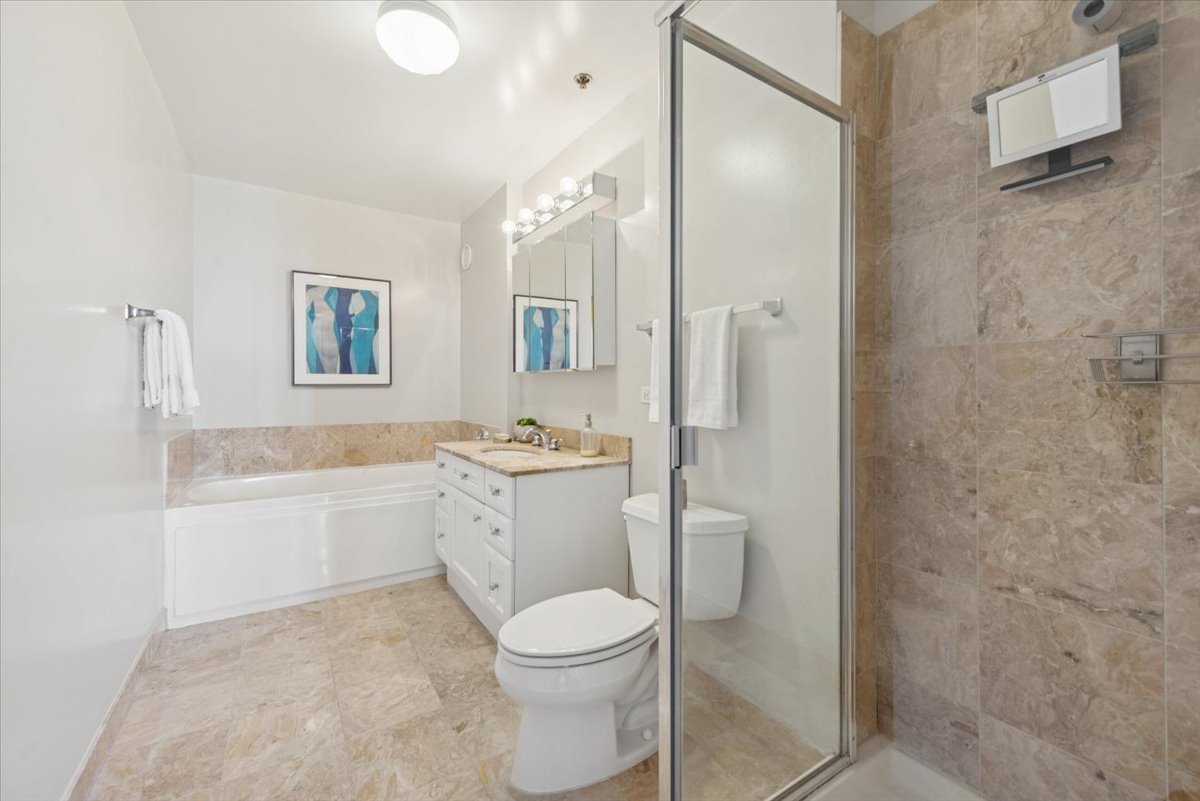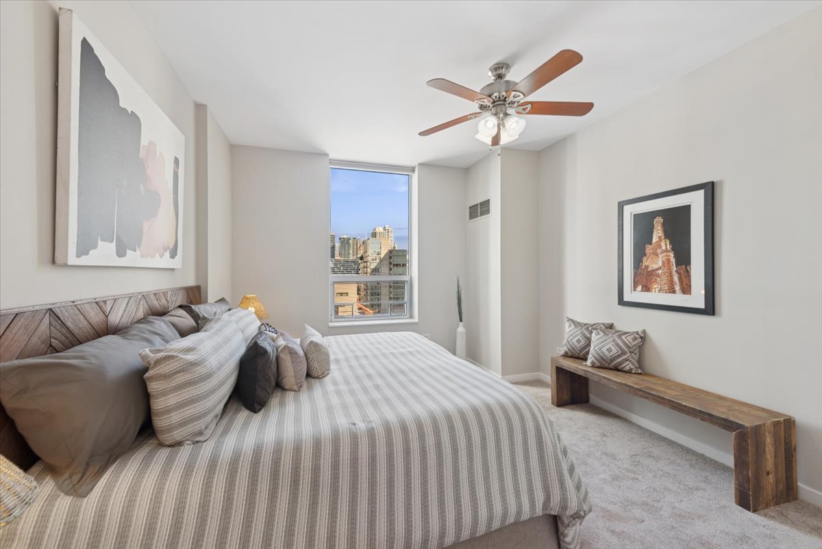 Rare opportunity to own a Southeast-facing 2-bed, 2-bath corner unit in the sought-after ’01’ tier at The Grand Orleans! This move-in ready home features a preferred split-bedroom layout and a number of recent updates, including new flooring and carpeting, a freshly painted interior, and a beautifully refreshed kitchen with quartz countertops and a breakfast bar! The expansive living and dining area comfortably fits a full dining setup, while the split floorplan provides added privacy. The spacious primary suite accommodates a king-sized bed and includes a walk-in closet and en-suite bath with a soaking tub, and a separate shower. The second bedroom is generously sized, ideal for guests or a home office, and is located conveniently next to another full bath. Flooded with natural light from expansive windows you can enjoy unobstructed city and skyline views from either inside your home or from the oversized private balcony, perfect for relaxing or entertaining! Additional features include excellent storage and a prime end-position garage parking space that allows for easier parking and added maneuvering space (parking additional $30,000). The Grand Orleans is a boutique, full-amenity building with only 98 units, offering 24-hour door staff, a fitness center, receiving room, business lounge, on-site garage, and an unbeatable River North location. Just steps from the Brown and Red lines, East Bank Club, Trader Joe’s, Whole Foods, Jewel, Ward Park, the Riverwalk, restaurants, nightlife, dog parks, and more. Welcome home!