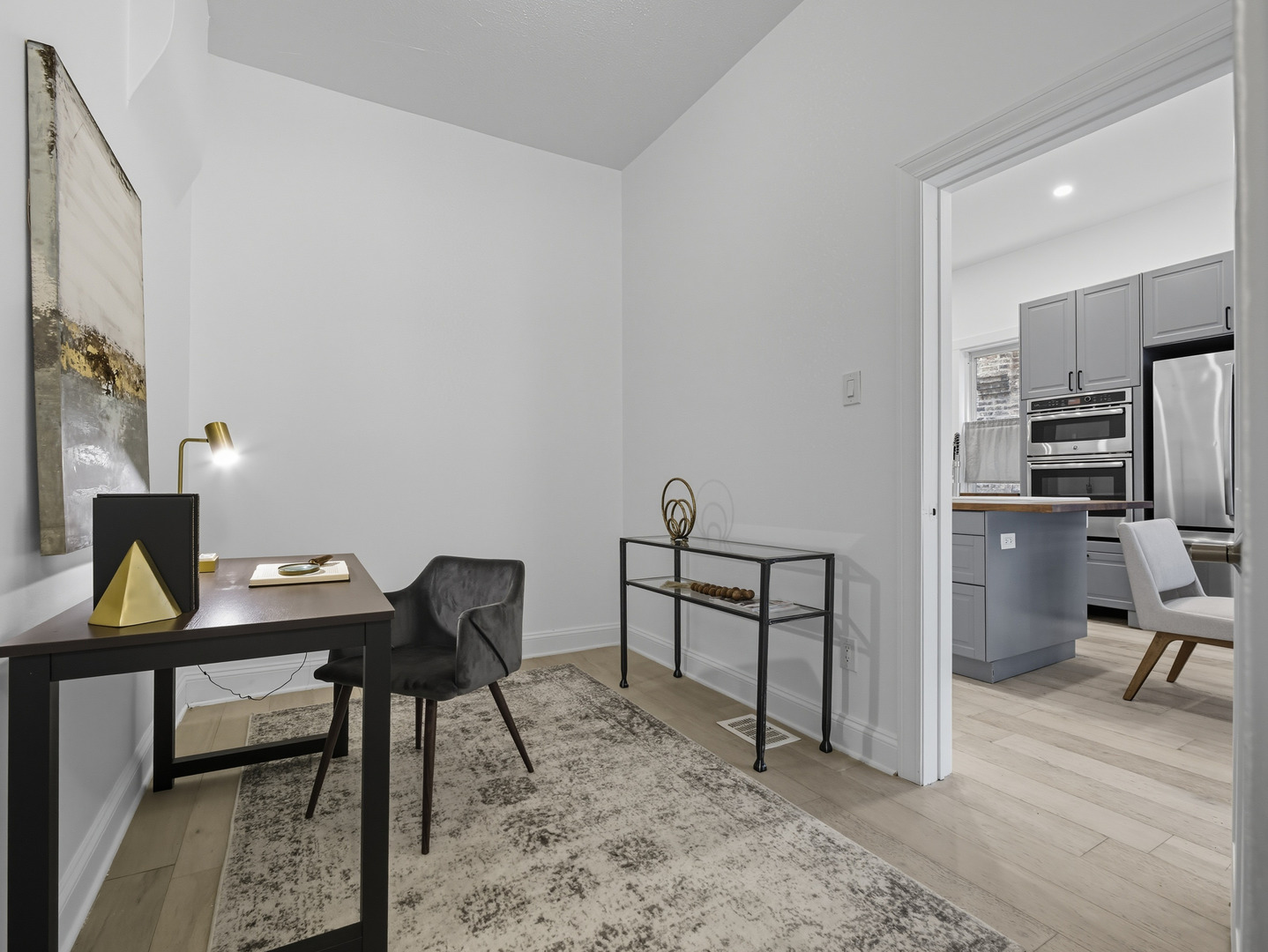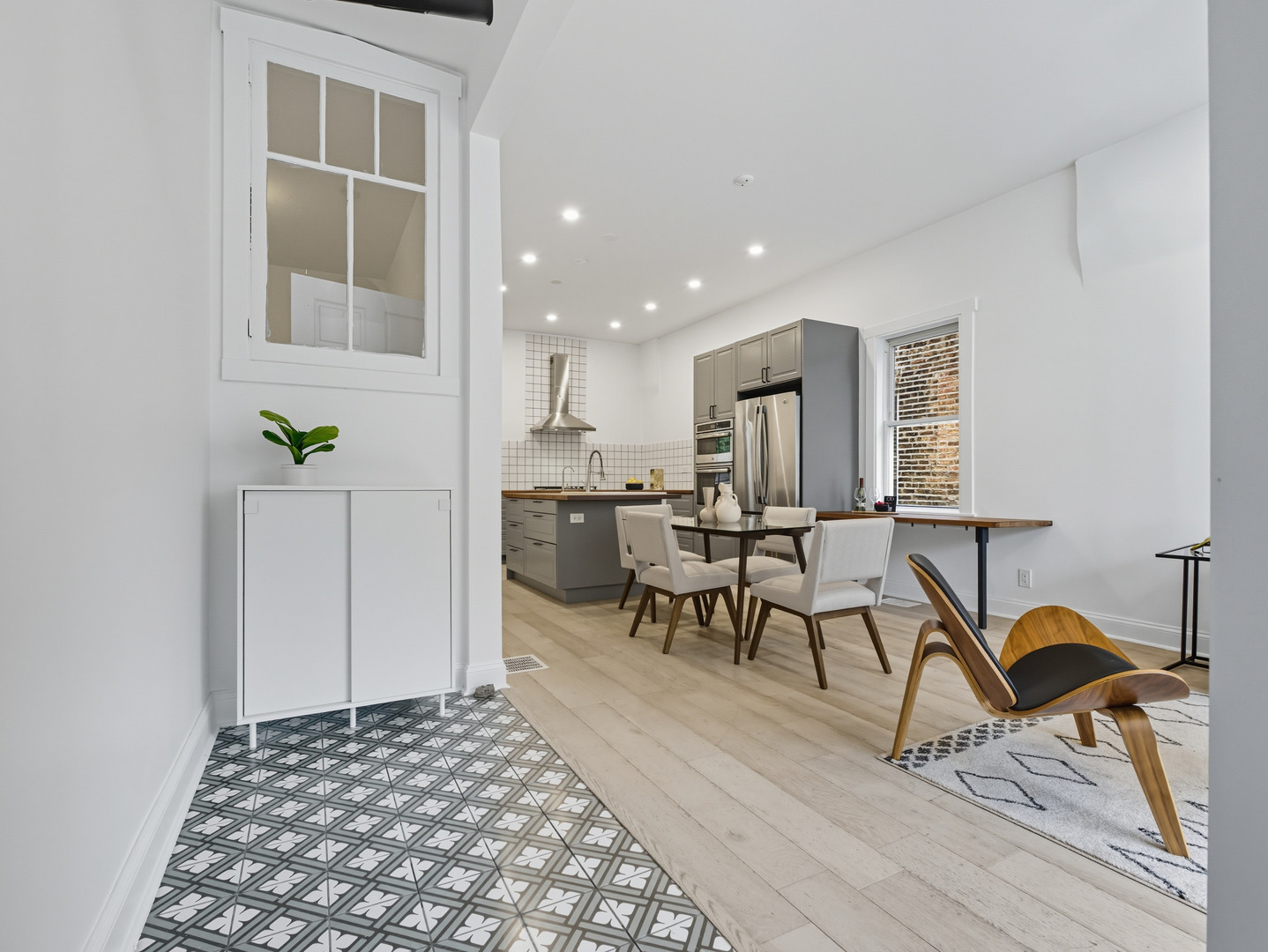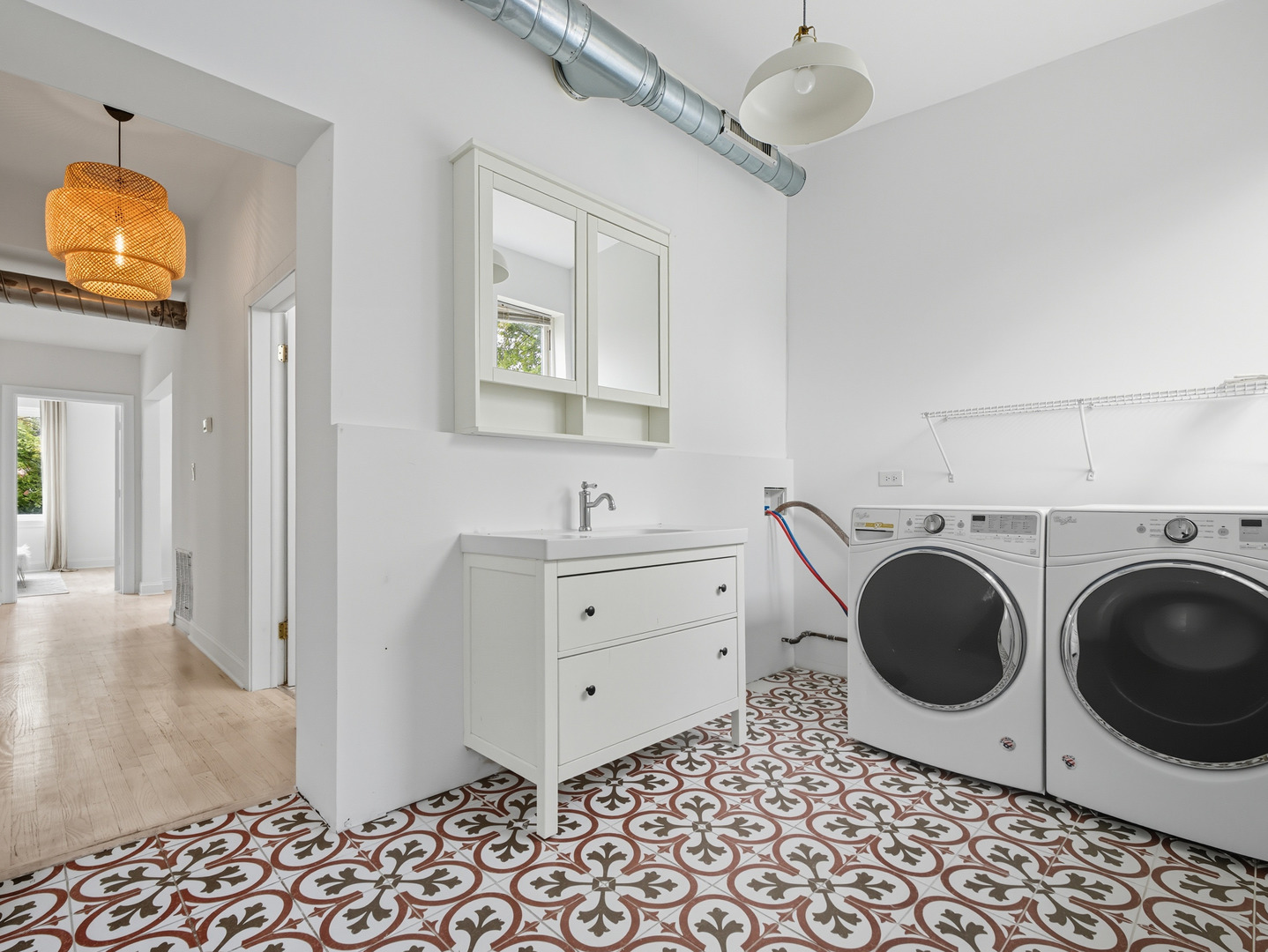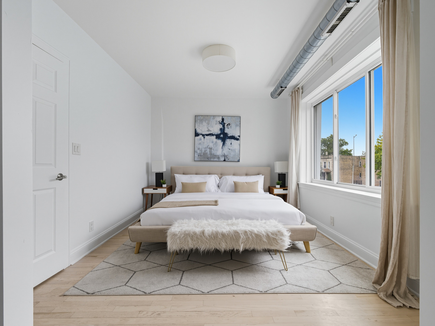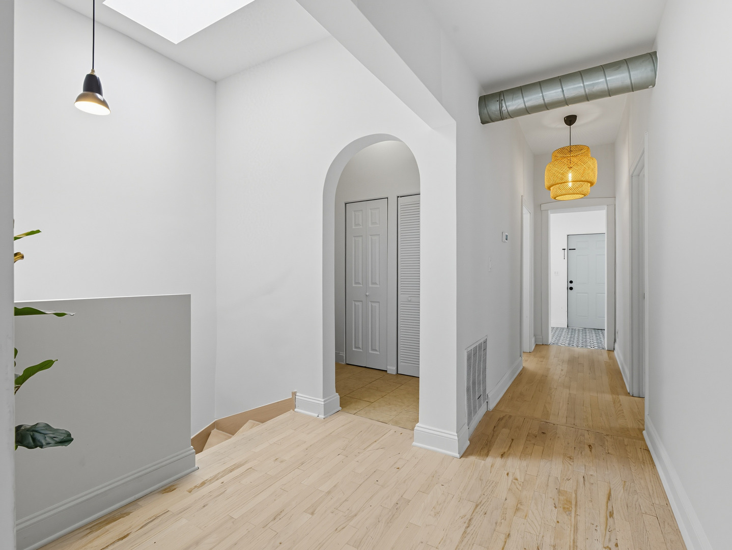 FEE SIMPLE AND NO HOA – ALL NEWLY RENOVATED brick farm house, originally built in 1888 before the first World Fair. This property is for EVERYONE- those who want new construction and those who love historic charm. The location, just a block west to Humboldt Park, IS on the brink of becoming THE MOST POPULAR spot in CHITOWN! Enjoy 197.26 acres of Humboldt Park with baseball fields, miles of running, ponds, field houses, and tamale trucks. A couple blocks away is Roeser’s Bakery, a quick bike ride to the 606 trail!, enjoy proximity to Logan Square restaurants and shopping on Armitage, easy access to the expressway at Kimball, head west and be in Oak Park in a few minutes, ride a bike to the other side of the park and grab a bagel at Steingold’s after you get your work out in at ‘First Ascent Climbing’ gym. This home was most recently purchased by a local Chicago designer who studied at our very own: the Art Institute of Chicago and the entire home was completely remodeled and renovated for her own family. This darling dazzler exudes a Scandinavian sophistication of quality and attention to detail in every space. The floor plan is open and the entire home is pleasantly filled with light and positive vibes. It’s a few steps up to the picture glass front door and a gorgeous tile vestibule that welcomes you into this very happy home. Super high ceilings and wide plank white oak flooring make it easy to drop your keys and take off your shoes. Find a completely new kitchen with butcher block walnut counters, a porcelain farm sink in the island, gray cabinets with lots of built-ins, drawers and other features, white tile backsplash and stainless steel appliances. On the main floor find an eat-in island, an attached modern breakfast table, and a open layout to the living and dining room that overlooks the front yard. Also on the main floor find an office/ 4th bedroom and a darling playroom that can also double as a family room. At the top of the second floor is a skylight and an arched doorway that radiates creativity. The master bedroom has a massive attached walk in closet with wardrobes and attached shelves offering additional hanging space. Upstairs are two more bedrooms and a perfectly located laundry room (near the bedrooms) with more storage and a sink. Fall in love with two full renovated bathrooms ( one on each floor) with custom tile, custom glass enclosures, lighting and seamless floor drains. The basement is fully finished, freshly painted and cleaned with a kitchen, family room, two bedrooms and a full bathroom (a really great home office with its own private detached entrance.) On each floor is a private deck space with room for a table and chairs or an outdoor sofa. Recently tuck pointed, newly coated flat roof, newly capped chimneys, new gutters, new rear vinyl siding, new back deck and stairs!!, new down spouts, all new electric everywhere in the house, all new copper plumbing and new plumbing connection to the city service all in 2023. NEW garage siding, new landscaping in backyard, newly painted front fence. NEW AC.