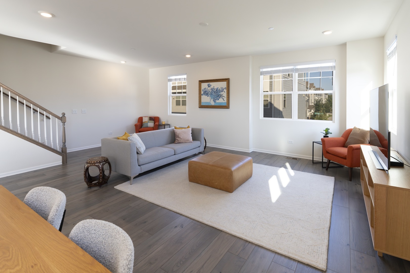 Built in 2022, this meticulously maintained 3-bedroom, 2.5-bathroom corner-unit townhome offers the feel of brand-new construction, minus the wait! The first floor features a large room with French doors and great sunlight, and is versatile enough to suit your needs-whether as a family room, home office, media room, or gym. A dedicated mudroom/foyer space with two hallway closets ensures a smooth transition between indoors and outdoors. The second floor showcases an open-concept living area, providing a seamless flow between the living room, dining room, and kitchen. The kitchen is a chef’s dream, complete with an 11-foot long island with seating for six, stainless steel appliances, 42″ white shaker cabinets, quartz countertops, subway tile backsplash, and a walk-in pantry-design details that are timeless and built to last. Step outside onto the spacious balcony, ideal for grilling, al fresco dining, entertaining, or simply enjoying the sun by day and the stars at night. A convenient half bath rounds out the second floor. Upstairs, the generously-sized master bedroom offers a private retreat featuring an ensuite bathroom that’s nothing short of luxurious. No expenses were spared, as seen in the floor-to-ceiling glass-enclosed rain shower, double vanity, separate toilet room, and walk-in closet. Two additional spacious bedrooms, a full hallway bathroom, and a laundry closet complete the third floor. With eastern, western, and southern exposures, natural light pours into this home all day long. The attached 2-car garage adds extra convenience. This townhome is a 5 minute walk to a full service grocery store and just minutes from community amenities like Rolling Meadows Library, Salk Park, and Kimball Hill Park, a variety of shopping, dining, and entertainment options at Woodfield Mall and downtown Arlington Heights, and the future home of the Chicago Bears. Commuting is a breeze with easy access to multiple Metra stations (Arlington Park, Arlington Heights, Palatine) and major expressways (I-53, I-90, I-290). Act now and make this turnkey home YOUR new home today!