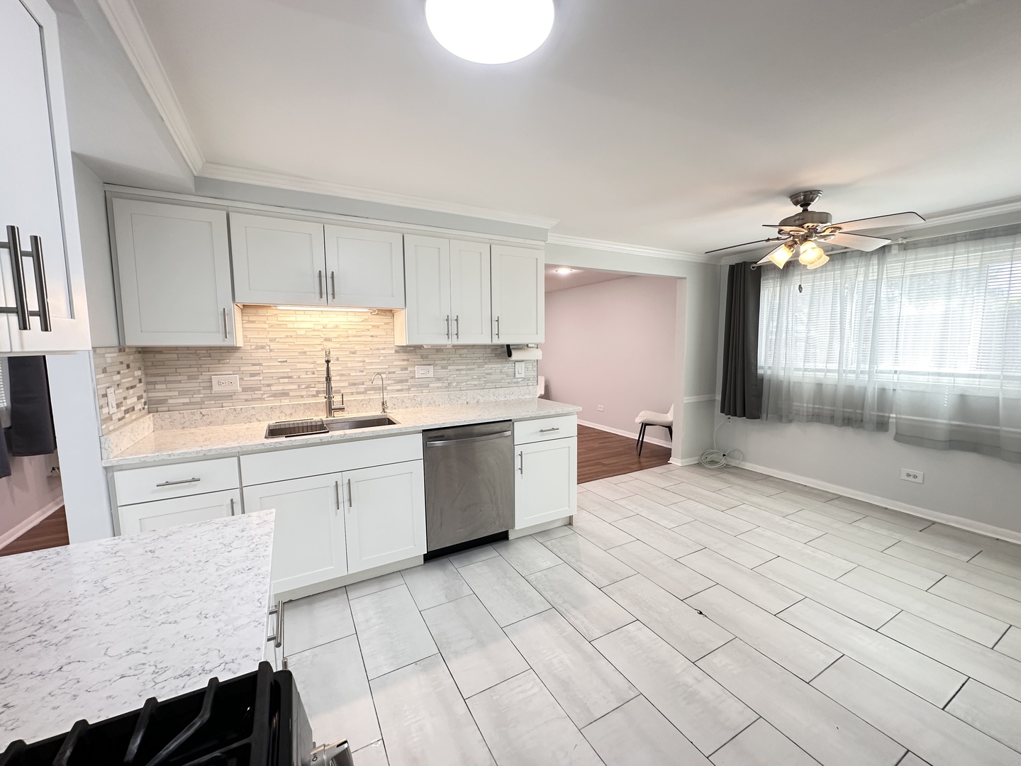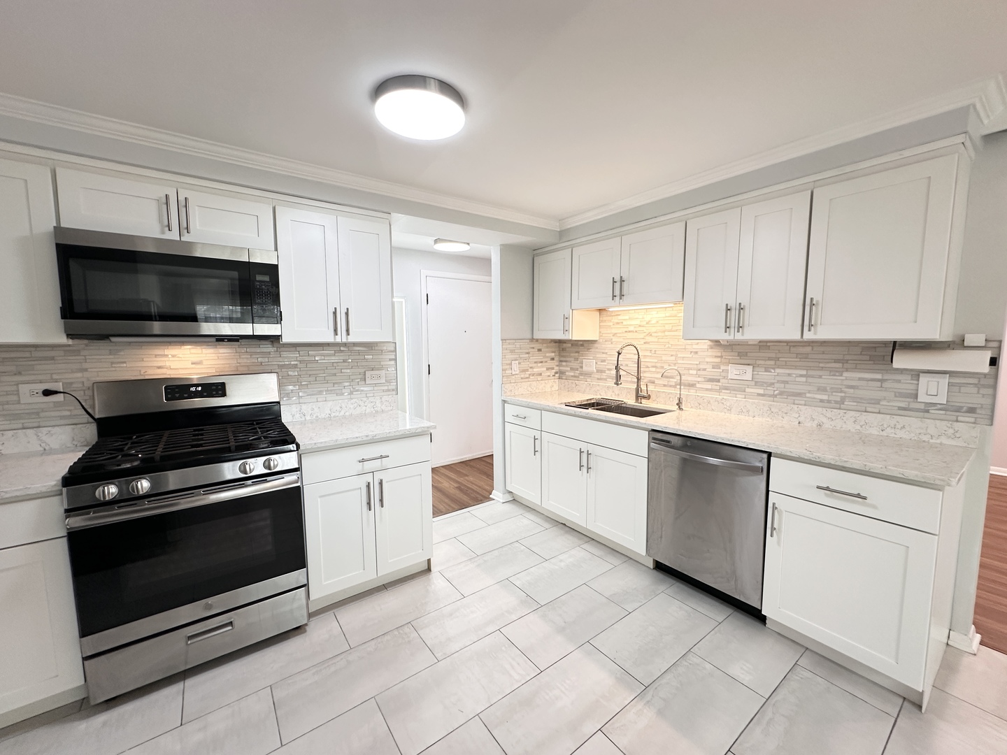 Spacious, sun-filled condo on 1st floor (no stairs)! This recently remodeled unit offers 2 generously sized bedrooms, kitchen with white, soft closing cabinets, quartz countertops and stainless steel appliances. Updated bathroom. Easy care wood laminate floors. Freshly painted and ready to move in. Laundry and storage located just outside the unit. 1 car assigned parking space included in the price. Great location with walking distance to Blue Line Station. No rentals. Cats allowed.