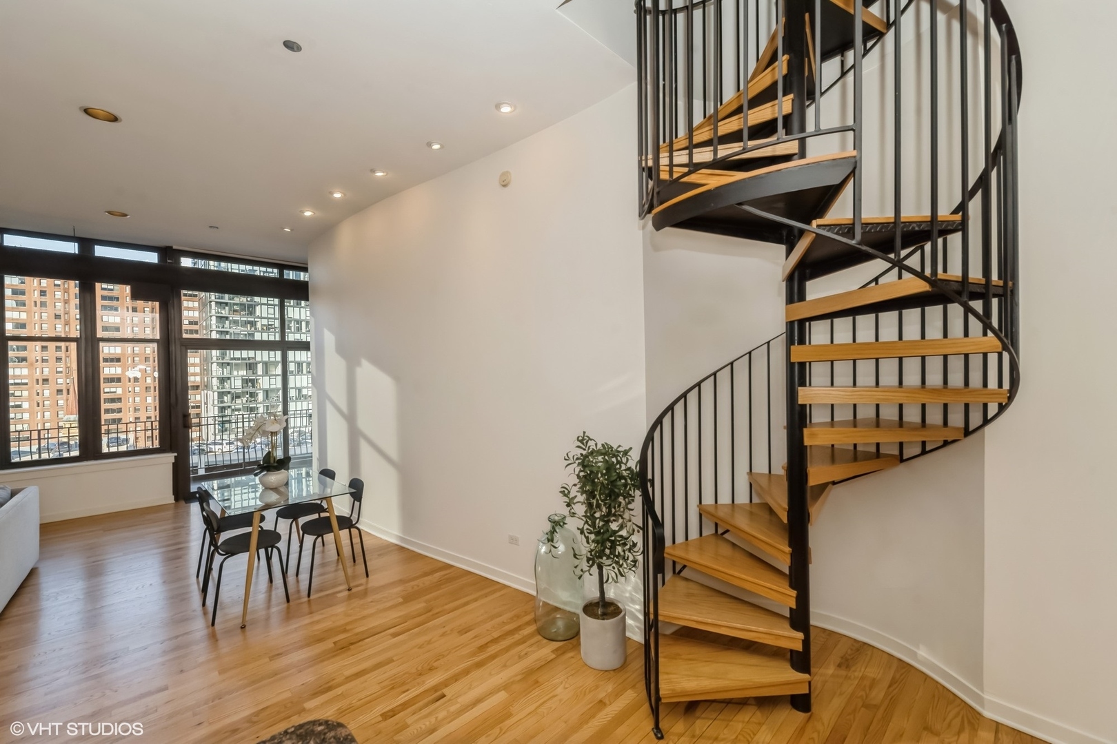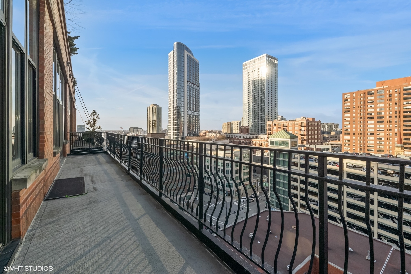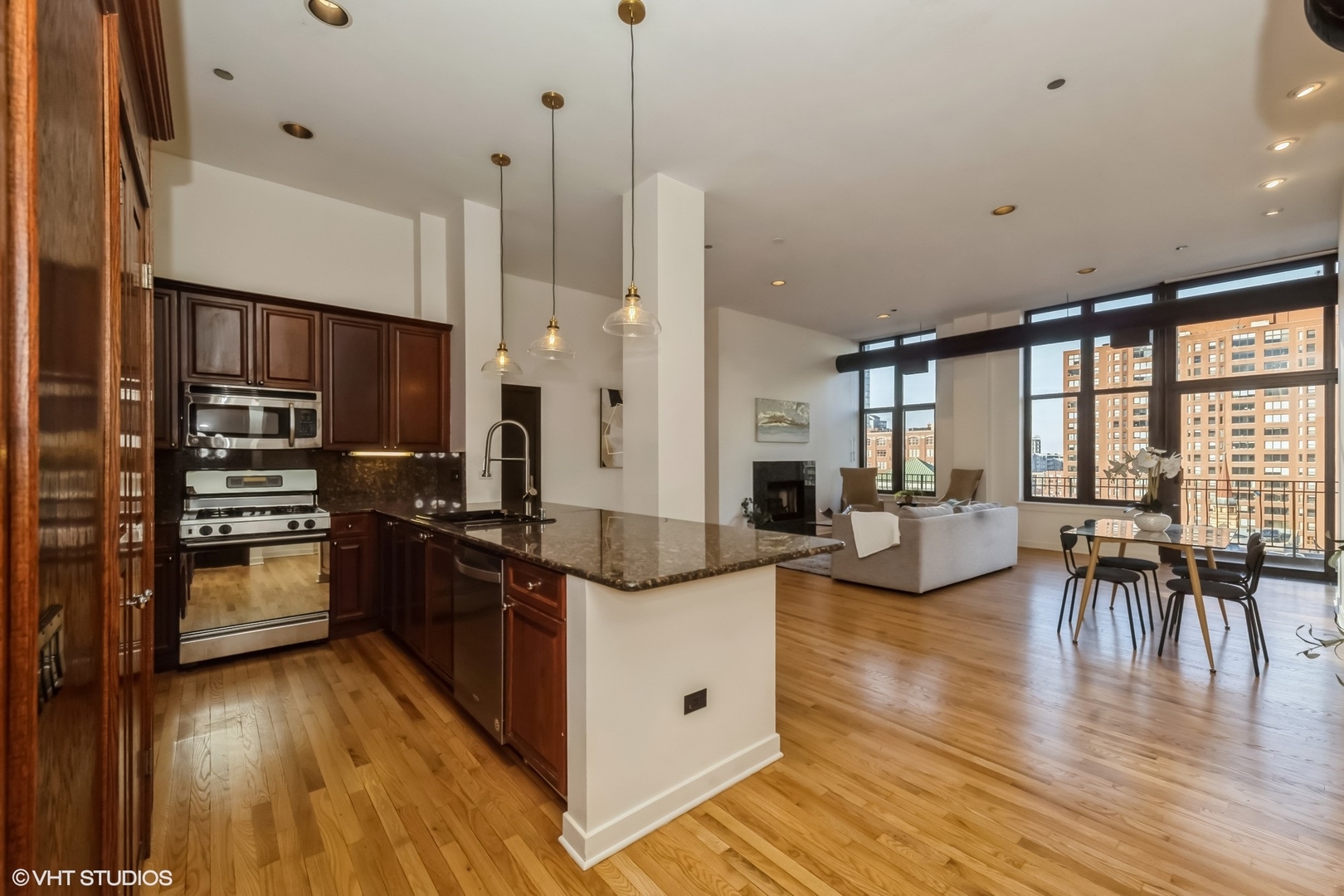 Bring us an offer! Seller ready to make a deal! Spacious and bright penthouse loft. 11ft ceilings and huge picture windows. The 2 private outdoor spaces are what really make this unit a standout; enjoy your balcony off of the main living space, and follow the spiral staircase up to your roof deck. So much potential to make the roof deck your own oasis in the middle of the bustling city. Large combined living and dining space with gas fireplace. The kitchen features gas appliances and a sizable granite counter-space with room for 4 stools at the breakfast bar. Your primary suite has a wonderfully sized walk-in closet as well as separate built in drawers and additional linen closet. En-suite bathroom with detached shower and tub as well as dual sinks. The second bedroom is connected to the second bath through another huge closet space! W/D in unit, newly re-finished floors and paint, heated parking space included in the price. Beautiful space, you must see!