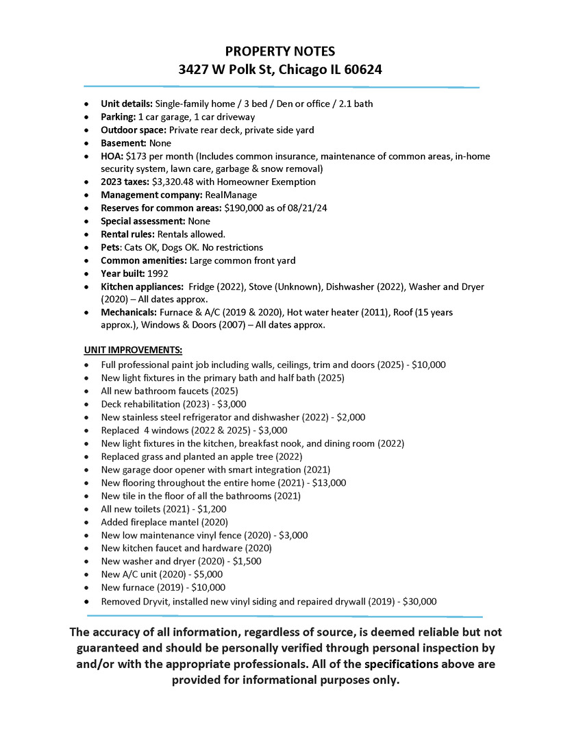 * Check out the video & the 3D tour of this home * Stunning and cozy, this 3-bedroom + Office/Den, 2.1-bath single-family home is in the desirable Homan Square community! This home is move-in ready and has the perfect mix of charm and modern updates. Step into this home and enjoy the open layout and large windows that bring in lots of natural light. The main floor flows beautifully; a large, sunny living room with a fireplace and custom mantel, a dedicated dining room, a breakfast nook, a powder room, and a large kitchen with shaker-style cabinetry, updated hardware, and stainless steel appliances – All leading to a sunny deck and side yard that is a true private oasis in the city. Sitting on an extra-wide 31-foot lot, the deck off the kitchen and the side yard are an entertainer’s dream, perfect for grilling, dining, relaxing, and watching your plants grow. Enjoy relaxing or being productive in the main level den/office featuring large windows and direct access to the large shared front yard. Down the hallway, you have a laundry closet, a second full bathroom, and access to the garage. This home has an attached one-car garage and a one-car driveway. The second floor features three good-sized bedrooms with ample closet space and one full bathroom, with the primary suite boasting vaulted ceilings and a large walk-in closet. Several big-ticket items and recent updates include: New paint throughout, including walls, ceilings, trim, and doors (2025), new flooring throughout the entire home & new tile in the floor of all the bathrooms (2021), new toilets (2021), new fence (2020), new A/C (2020), new furnace (2019), removed Dryvit and installed new vinyl siding (2019), updated light fixtures and faucets. Please ask your agent for the detailed list of improvements. Low HOA assessment of $173 per month includes common insurance, maintenance of common areas, an in-home security system, lawn care, garbage, and snow removal. Professionally managed HOA with healthy reserves: $190,000 as of 08/21/24. No special assessment. Rentals allowed. Cats & dogs allowed; no restrictions. This impeccable home is NOT a flip or investor-owned; it was updated with great attention to detail for the seller’s use, and it still looks and feels brand new. Fall in love with all that Homan Square has to offer – Extremely walkable to transit (Kedzie-Homan Blue Line train stop & bus stops) and easy highway access. Welcome home!
