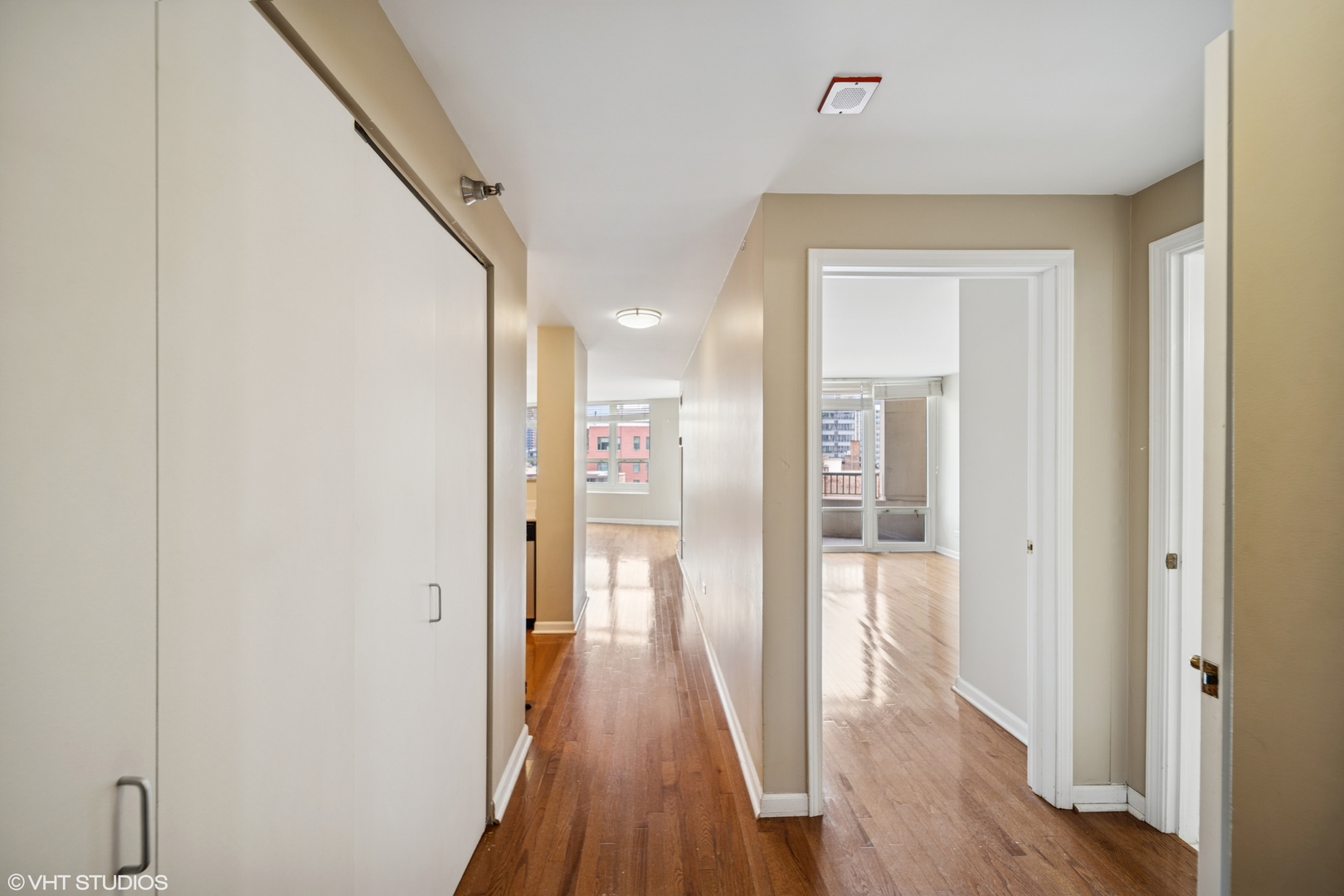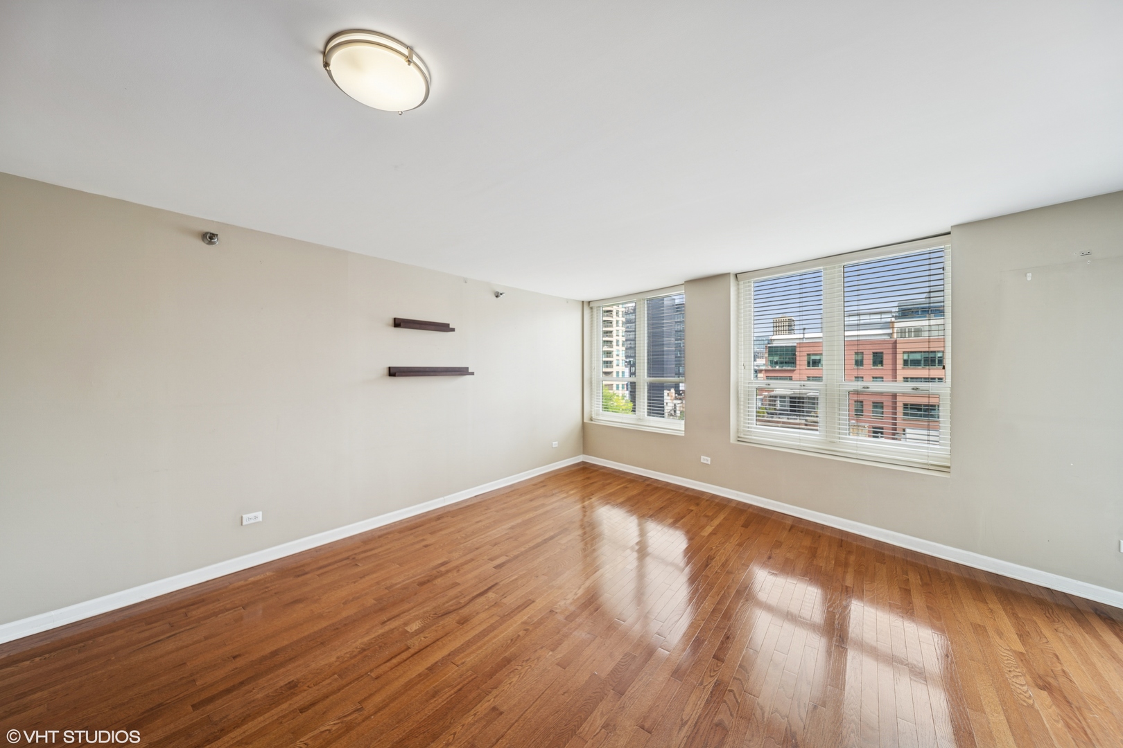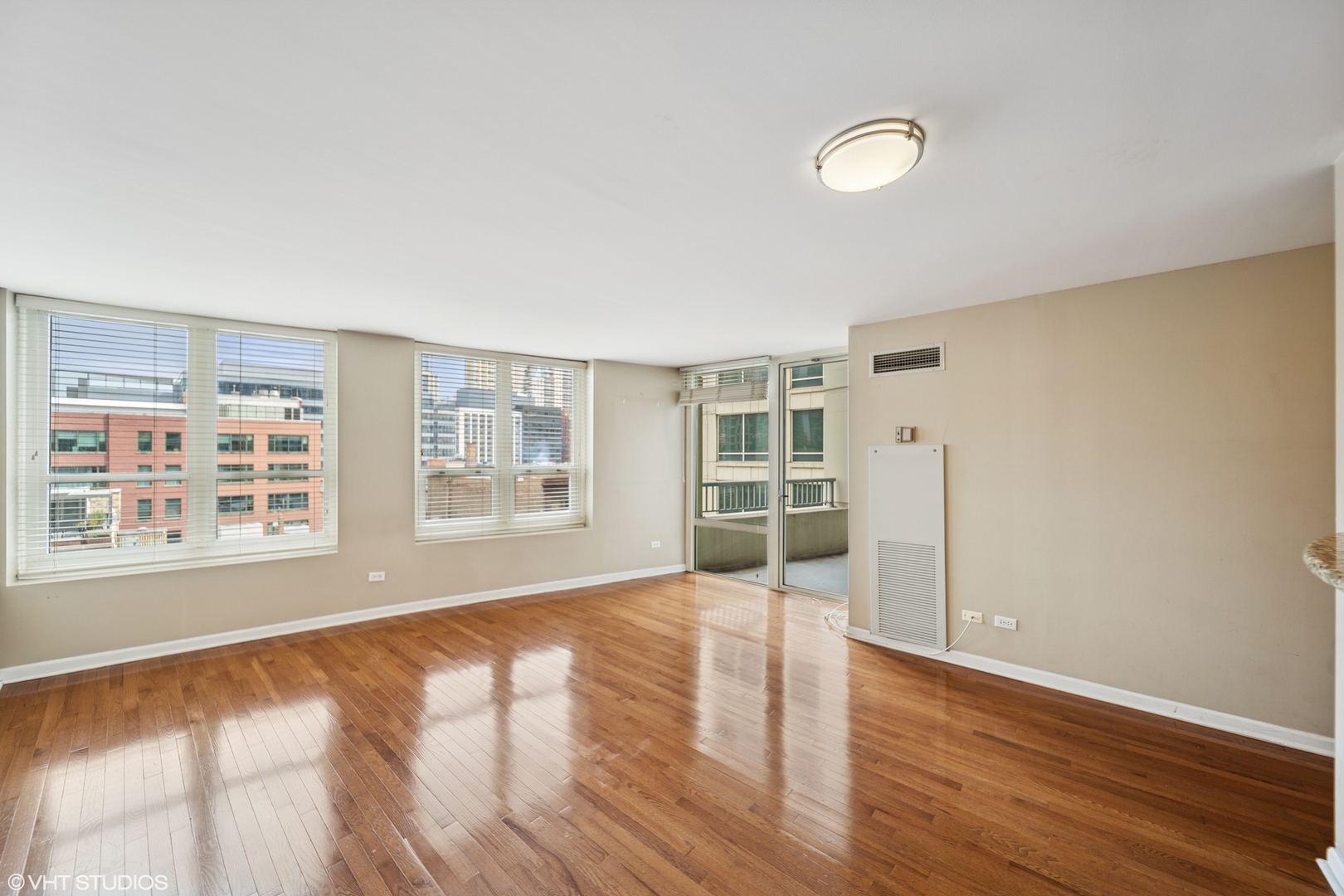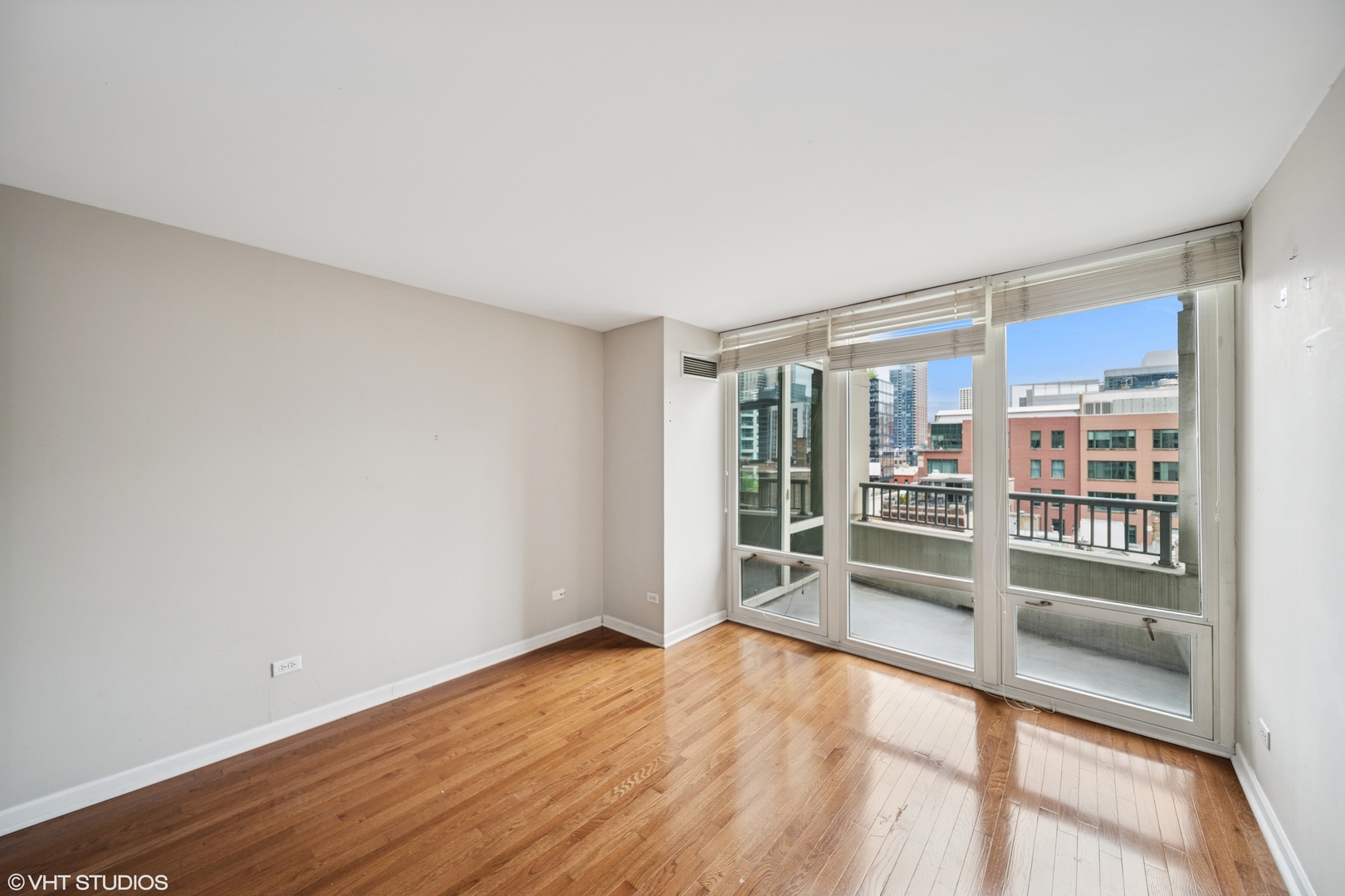 Spectacular River North 1BR w/ countless upgrades! Beautiful layout with open kitchen and large living area that feeds to your private balcony. Great views of the city facing North. Unit features gorgeous hardwood floors, In-Unit washer/dryer, custom California Closets, all stainless steel appliances, and kitchen granite bar. Building access to fitness rooms, sun deck w/ pool, tennis courts, and patios!