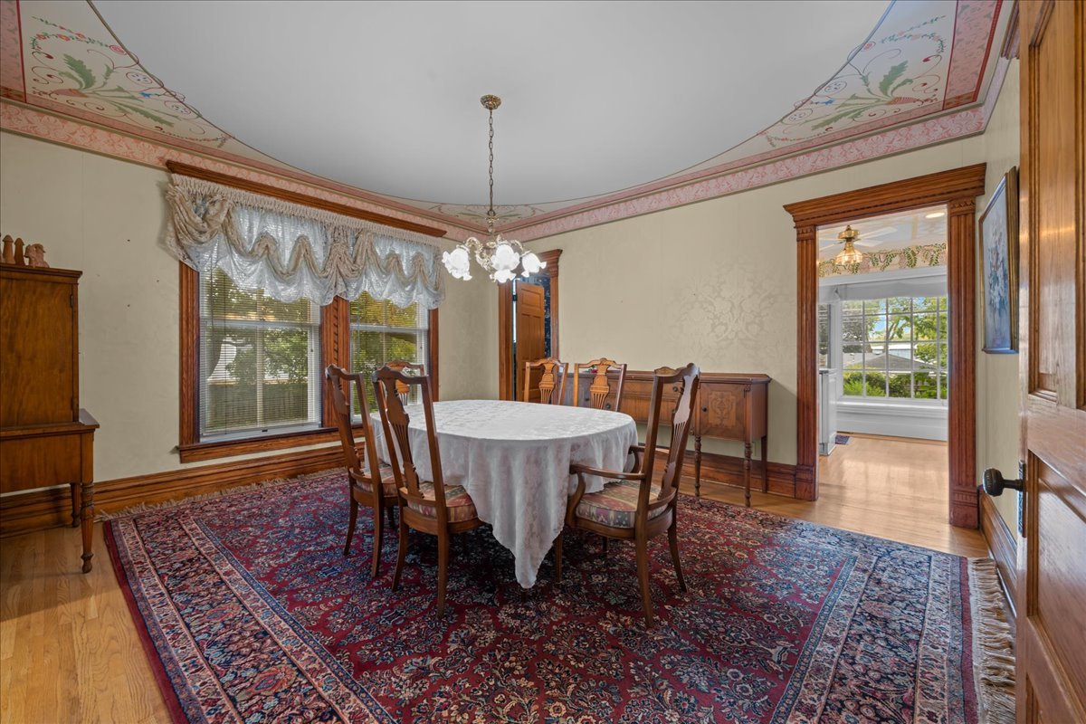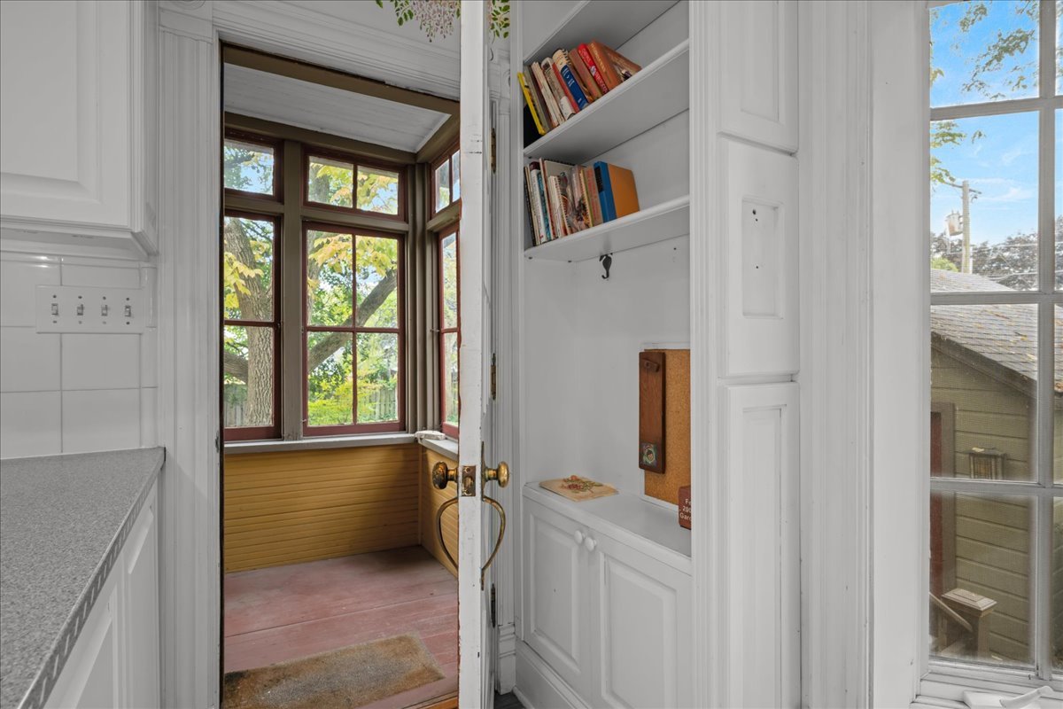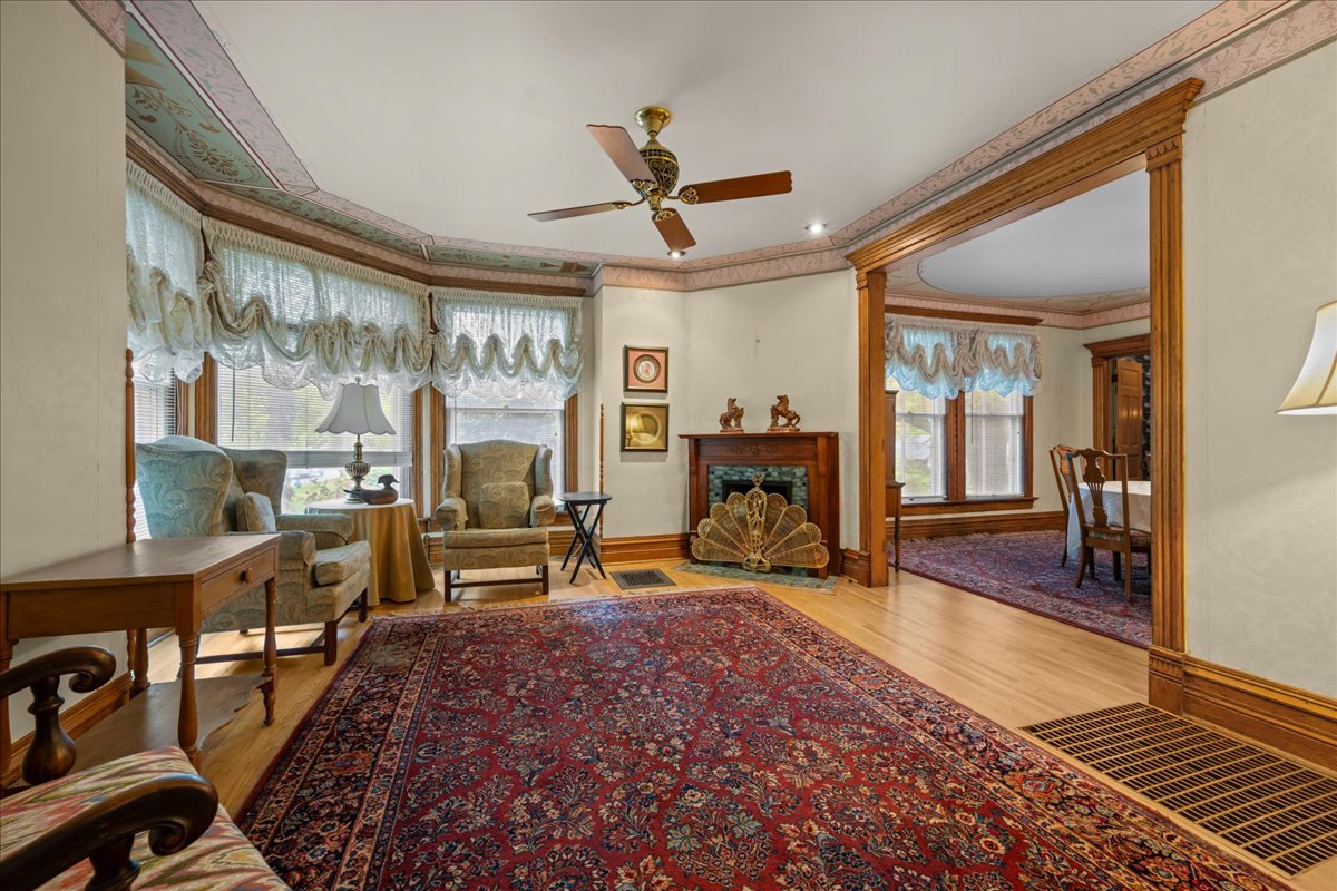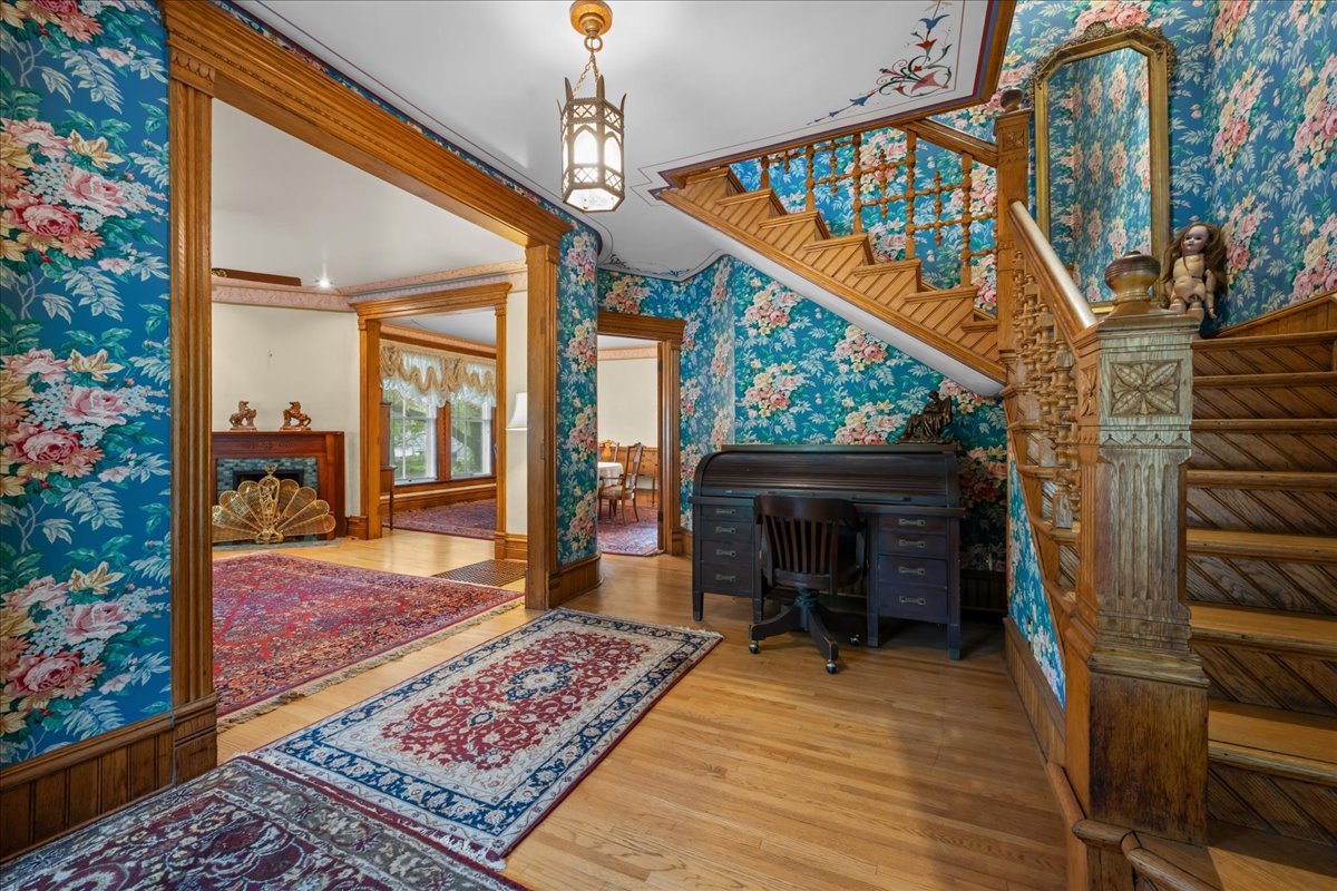 One of West Chicago’s most graceful and historic Queen Anne homes set on a DOUBLE LOT, welcome to 348 Arbor Avenue! The plaque near the front door notes this as “The Henry Bradley House” and a designated local landmark. Enter from the covered front porch into a gracefulness that is hard to find. ALL of the main floor woodwork and on the winding staircase has been hand scraped and refinished back to its original glory. Hardwood floors throughout most rooms, 10′ ceilings on the main level, extra-wide base trim, ceiling detail and rich crown moldings grace most rooms. The living room offers a fireplace, bay window and generous seating areas. The dining room has plenty of room to spread out. The versatile 1st floor den/library (or 4th BR) has a walk-in closet and built-in bookcases. The kitchen was updated not too many years ago and features white cabinetry, beautiful bay window with window seat, Corian counters, special lighting, Dacor and Kitchen Aid Appliances. There is access to the back porch, and out to the yard and the 2-car garage. There is also access in the kitchen to a back staircase and a staircase leading down to the basement. An updated 1/2 bath completes the main level. The 2nd floor offers 3 spacious bedrooms, a full updated bath, a sleeping porch and a nursery/craft room. There is also a finished walk-up attic with endless possibilities. The basement offers great storage, the laundry area, an outside entry and an UPDATED AMP ELECTRIC SERVICE PANEL, and a NEWER Hi-Efficiency heating/cooling system. The double-wide lot (102′ wide & 132′ deep) has many gardens, plenty of play space and privacy. The 2-car garage is accessible off the alley in the rear. Easy walk to downtown West Chicago and even to the commuter train station. Plenty of shopping nearby as well and close to the schools. This home has been lovingly cared for AND it shows. Originally built by the West Chicago Door and Sash Company, it has been owned (and improved-note NEW ROOF on home & garage in ’24) by this family for over 64 years! This is your chance to own a piece of history!