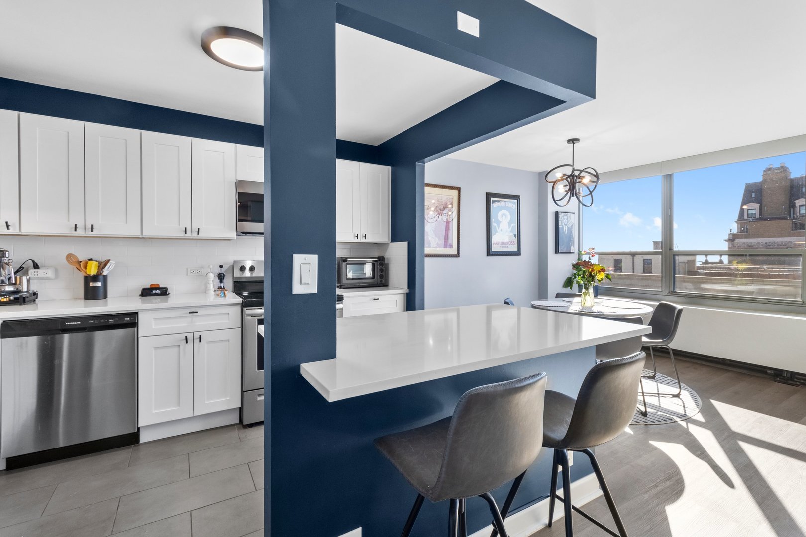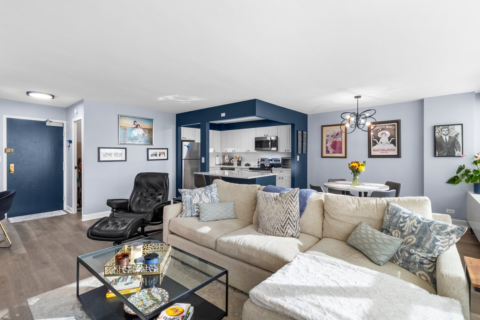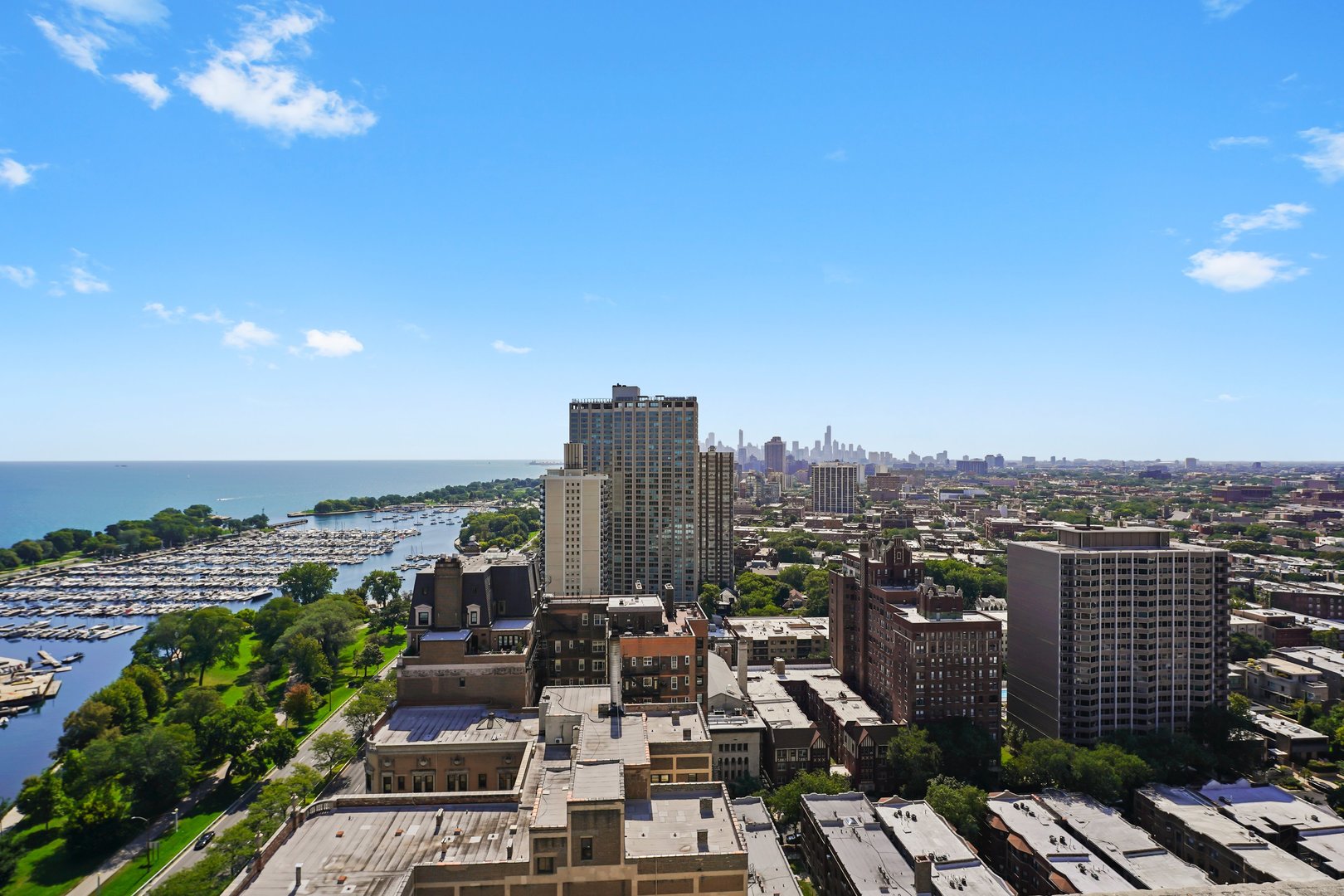 You must have a look at this condo on a high floor, south facing in the south tower! Welcome to Unit 1706 at 3550 N. Lake Shore Drive. This condo/home features a wide open living space complete with panoramic views of The Lake, Belmont Harbor and the City. The open cook’s kitchen is a dream with shaker style cabinetry (easy/self-close), beautiful white quartz countertops, full subway backsplash, large island with plenty of room for bar stools, stainless steel appliances and a wonderful Culligan osmosis system providing the ultimate drinking water. The living room along with the dining alcove offers several ways for furniture placement. The bedroom is “huge” and can easily accommodate a king-size bed with night stands. There’s a large walk-in closet too. There’s also a large walk-in closet in the entry way that has been built out to function as a kitchen pantry! Gorgeous luxury vinyl floors throughout…so easy to maintain. The bathroom features a newer vanity, lighting, tile and mirror. Beautiful window treatments too (solar shades and blackout in the bedroom). 3550 North Lake Shore Drive is a high-end, full-service building with 24-hour door staff, roof top decks, party room, fitness room, commissary, 2 laundry rooms, secure receiving room, on-site management office, and maintenance staff. Monthly valet parking is available for 160…no wait. Public transportation at your front door. Walk to the Lake, Wrigley Field, and all of East Lakeview. Assessments include heat, water, and Xfinity expanded cable. Owner pays electricity and internet. No dog and non-smoking building. No in unit washer/dryer allowed. Owners must own for 18 months before renting, but there is no “Rental Cap”. Reserves are approximately 9M | No specials planned or pending. NOTE: 3550 has first right of refusal, therefore, FHA financing is not allowed.