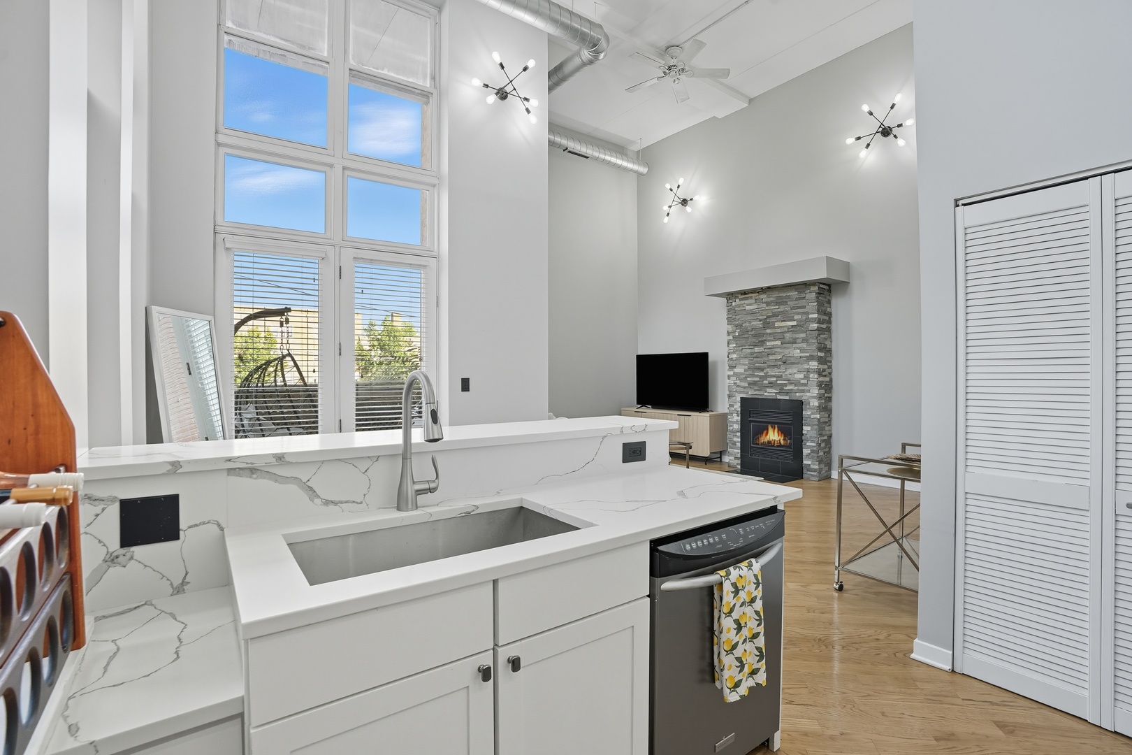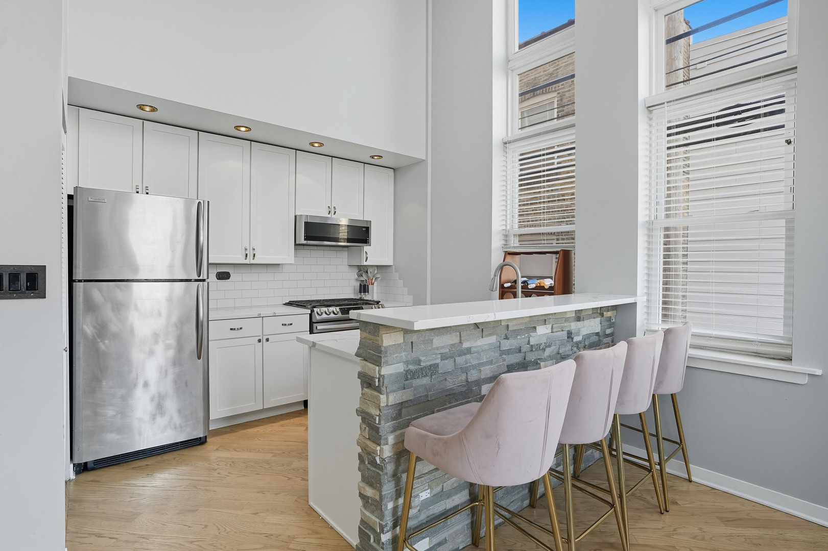 Experience modern elegance at the confluence of Irving Park and Albany Park with this rare and spacious 2-bedroom, 2-bathroom duplex-up corner unit. Designed to impress, the dramatic great room boasts soaring 20′ ceilings, floor-to-ceiling windows that flood the home with natural light, and a striking stone-clad fireplace. The open-concept kitchen features white shaker cabinets, quartz countertops, subway tile backsplash, and a breakfast bar overlooking the living and dining area-perfect for entertaining. Step outside to your private covered terrace for morning coffee or evening relaxation. The main level includes a full bedroom, updated full bath, and front-loading washer/dryer. Upstairs, the entire second floor is dedicated to the primary suite, complete with a custom walk-in closet, office/reading nook, and a luxurious en-suite bath with double vanity, jetted tub, and separate shower. One heated garage parking space is included. Located in a secure boutique elevator building, you’ll enjoy easy access to public transit, parks, shopping, dining, and entertainment at the intersection of Irving Park and Albany Park. A unique opportunity to call this exceptional home yours!