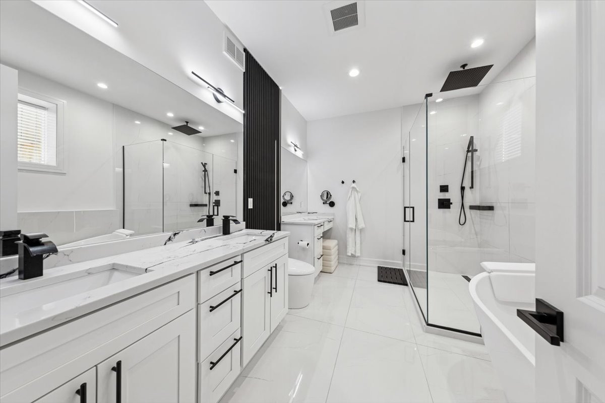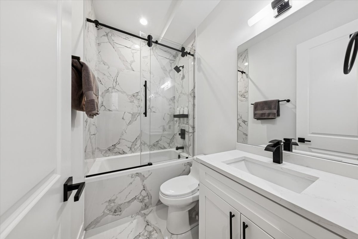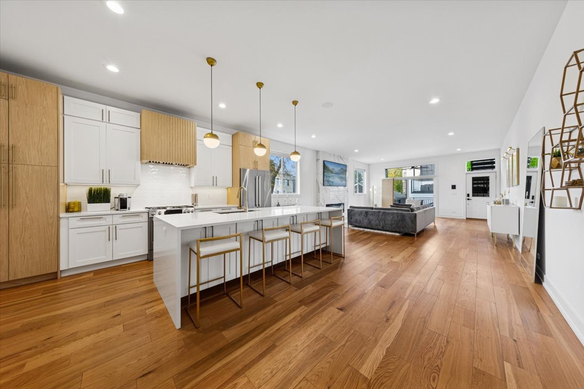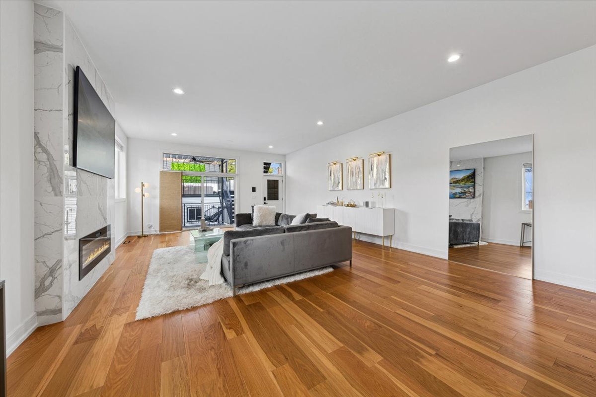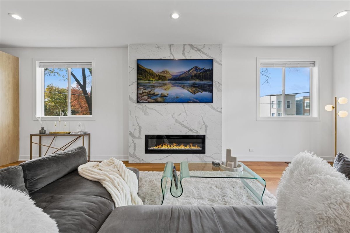Discover the perfect blend of modern luxury and everyday comfort in this beautifully designed four-bedroom, three-bathroom duplex down, ideally located near the 606 and the heart of Chicago’s most vibrant neighborhoods. The main level impresses with soaring 10-foot ceilings, multiple living areas with fireplaces, and a showstopping 10-foot kitchen island wrapped in quartz. The gourmet kitchen features premium stainless steel appliances and sleek finishes throughout. A full bath and a versatile bedroom or office on this level offer flexibility for guests or remote work. White oak hardwood floors and recessed lighting add warmth and sophistication to every space. The lower level reveals a serene primary suite with heated porcelain tile floors, a spa-inspired bath featuring a soaking tub, custom glass shower doors, and a generous walk-in closet. Two additional bedrooms, a full bath, and abundant storage complete the level. Enjoy exceptional outdoor living with a covered rear deck featuring a built-in grill station and an upgraded garage rooftop deck – perfect for entertaining or unwinding with city views. Recent upgrades include Tesla charger, composite decking, built-in water filtration system, motorized blinds, designer lighting, custom closets, smart bidet toilet, an integrated sound system and more. Located just steps from the 606 trail, Humboldt Park, Palmer Square, local restaurants, nightlife, and boutique shops, with easy access to downtown – this home truly has it all.