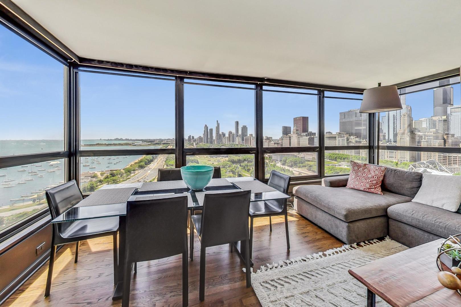 Highly-sought after Southwest corner 2 bedroom 2 bathroom unit in The Buckingham Private Residences. Views Forever. Year-round, sun-drenched, privacy and tranquility with 18 wrap-around windows of providing 300 degree views South, West, East and North showing Chicago’s iconic architecture, Monroe Harbor and Lake Michigan. Sunrises over lake, sunshine all day out Chicago’s front yard and Sunsets with city skyline lights nightly. The open floor plan of the living room/dining room allow for multiple seating spaces. The unit has many upgrades including open kitchen, hardwood floors throughout and smooth ceilings! The kitchen is an entertainers delight with beautiful new quartz countertops and tile backsplash, stainless-steel Sub Zero refrigerator, freezer drawers and wine refrigerator, Wolf cook top and oven, and custom solid wood cabinetry in kitchen. Master bath has textured wall tiles, quartz topped floating vanity, Grohe push button rain shower and wand. In the guest bath there’s granite countertop, granite floor, custom cabinetry. Open concept living room, perfect for entertainment with unforgettable views. Enormous closets spaces with custom shelving and storage. Laundry room has new storage and full size washer dryer. Included in the price is a prime tandem parking space for two cars in attached heated garage! All residents enjoy sweeping penthouse views from the outdoor sundeck, indoor pool and gym. The party room and professionally landscaped patio offer cooking grills perfect for working, relaxing and entertaining. Boutique building amenities include: 24-hour door-staff and engineering team, on-site management, a library, 2 bike rooms, saunas, a community laundry room, drycleaners with an efficient package system and valet guest parking. Nature surrounds this urban treasure with many parks, The Chicago Riverwalk and 20 miles of Lakefront trails. To the North and South of The Buckingham are award winning gardens with winding walking paths, tennis courts, ice skating rinks and a dog park. Steps from Mariano’s grocery, local dining, The Village Market and CVS. Nearby Michigan Avenue’s finest shopping, dining and cultural institutions. Easy access to the pedway, the loop, CTA buses and trains, the highways and airports. Close to many world-recognized educational and medical facilities.
