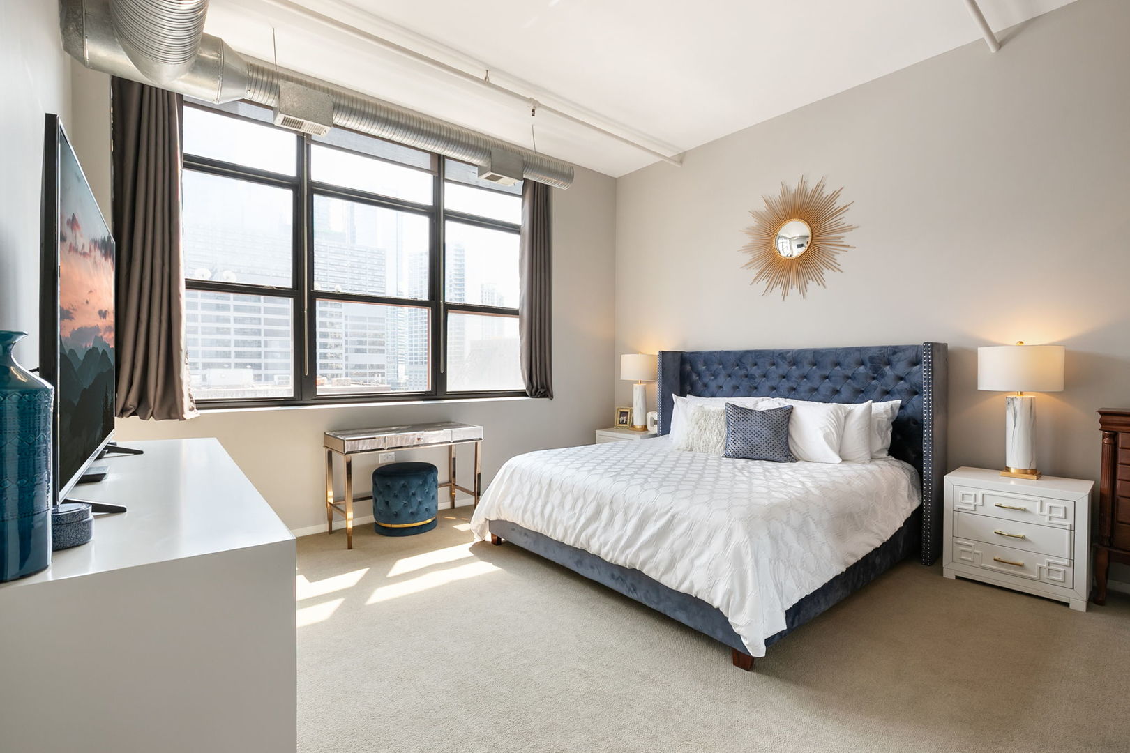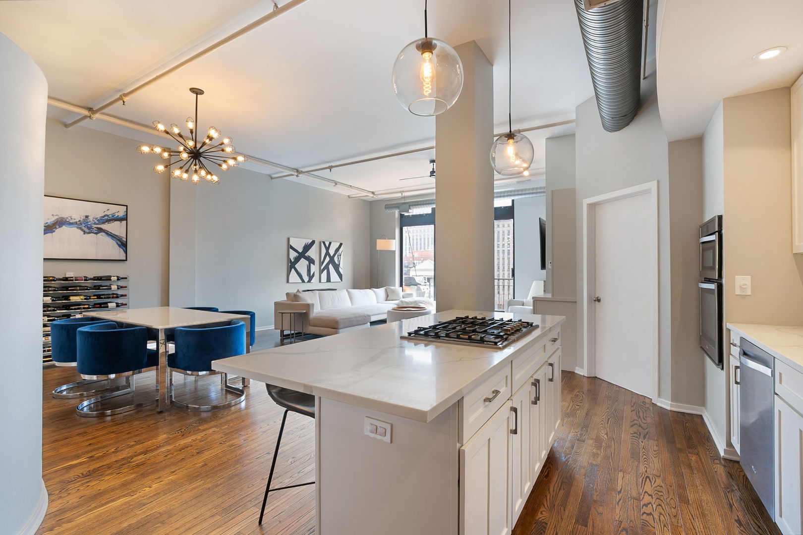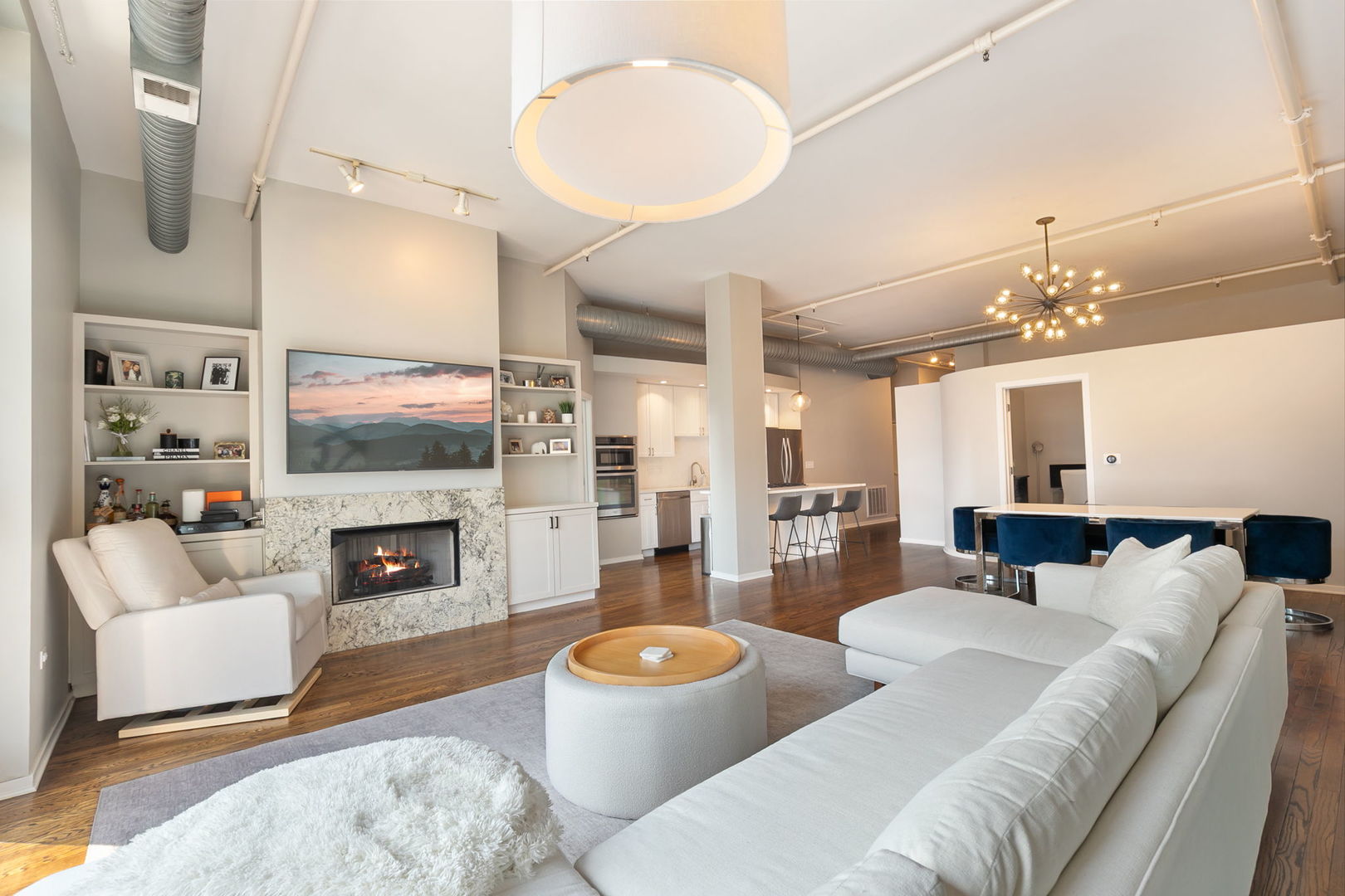 Welcome to The Sexton, a premier full-concrete loft building. This stunning 2BD/2BA residence offers nearly 1700 square feet of living space and an expansive open-concept layout with soaring 11′ ceilings, abundant natural light, exceptional privacy, and unobstructed striking south-facing views from the sought-after tower tier. The recently redesigned chef’s kitchen is designed for both style and function, featuring quartz countertops, a large island, striking herringbone backsplash, stainless steel appliances, and gas cooking. The spacious, fully enclosed primary suite includes a huge walk-through closet and a luxurious bathroom with dual sinks, new shower, and new soaking tub. The king-sized second bedroom provides plenty of versatility for guests or home office. Additional highlights include beautiful oak hardwood floors, gas fireplace, wall of built-ins, sunny southern exposure, private balcony, and stunning city views. One premier parking spot, directly beside the elevator, included in purchase price. Full-amenity building with 24-hour door staff, sun deck, fitness center with brand-new equipment, on-site dry cleaners, and a large 5 X 7.5 enclosed storage unit. Unbeatable River North location-just steps from East Bank Club, Easy Loop access, Surrounded by top dining, shopping, and entertainment options, this home blends luxury and convenience in one of Chicago’s most vibrant neighborhoods.