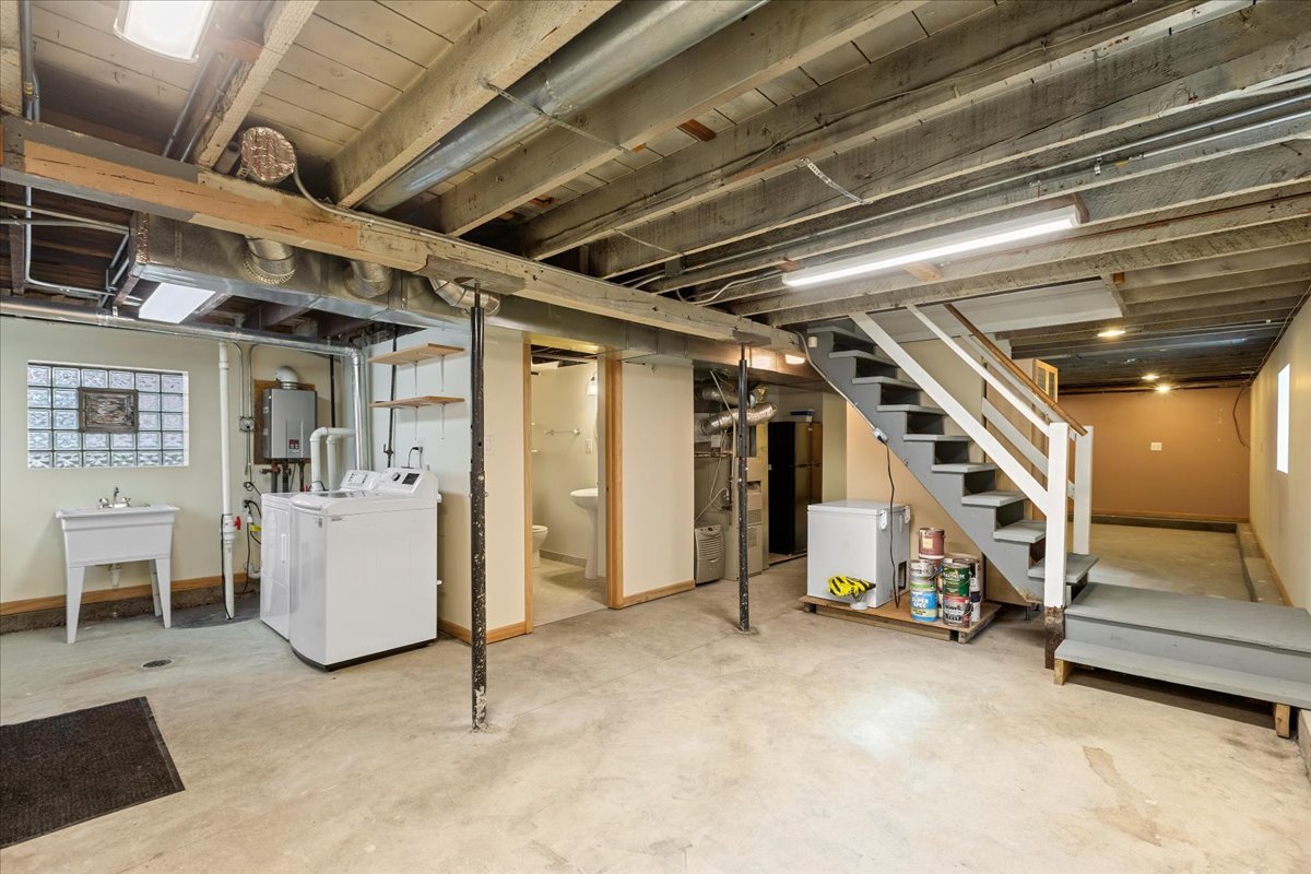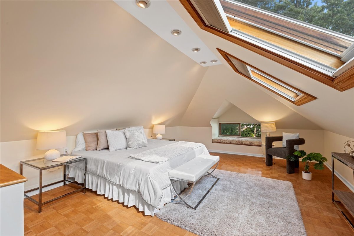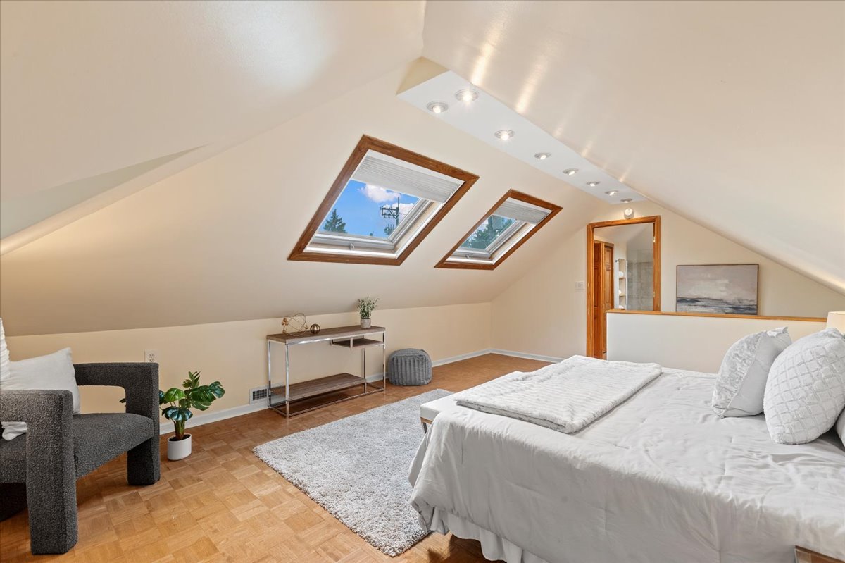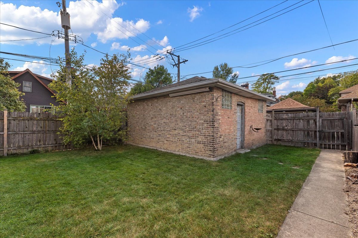 Get ready to check off all the “must have items” on your wish list! This brick bungalow sits on a corner lot, gets an enormous amount of sunlight, has been very well updated and cared for by thoughtful owners, and is in the prestigious The Villa historic neighborhood! The main level has a large living room with a gas fireplace and lovely windows that overlook the tree-lined street. The dining area is open to the living room and while it easily fits a table for 4, a table can extend into the living area for larger gatherings! The kitchen was totally renovated in 2016 and has quality wood cabinets, granite counters, and stainless steel appliances including double refrigerated drawers. Large windows and a glass door to the back yard allow loads of light into the kitchen, and easy outdoor entertaining. There is a custom built 2-tired deck out the kitchen door with a bay for a grill and built-in bench seating. The main level also features two generous bedrooms and a spacious full bathroom with a whirlpool tub! The 2nd floor is a primary suite complete with space for a king size bed, 2 large south facing skylights, a window seat at the front window, and an en-suite bathroom that was totally renovated in 2020, complete with walk-in shower, skylight, and a closet. The partially finished basement is prepped and ready for your plans! The basement was dug down in 2009 and has a perimeter drain tile and sump pump, the walls have been drywalled, there is a full bathroom (new in 2010), and lots of open space to make another bedroom/family room/recreation space. There is a dark room equipped with a stainless steel utility sink and exhaust fan, and a laundry room with a door to access to the back yard. The back yard is fully fenced in, has a 2 car brick garage, a lovely edible garden along the south side of the home (grape vines, raspberries, a producing peach tree, rhubarb, and more!) and lots of beautiful perennial landscaping thru the property. Enjoy sunny days and cool nights in the backyard while you watch movies on the movie screen that operates on a switch on the garage wall! This home underwent a large renovation in 2007 that included new windows and roof. The home has been updated with central heat and air conditioning. The sellers have done many updates, including basement rennovations; gas fireplace; deck; new 100amp electric panel; 2016 new kitchen and appliances; new back and front doors; refinished hardwood floors; 2020 primary bathroom; rebuilt front concrete steps and brick wall and tuckpointed chimney 2022. Included in sale: basement fridge and deep freezer, window ac (which sellers used to supplement central ac in primary bedroom), security system, curtains/blinds, movie screen, wardrobes in bedroom, linen cabinet in bathroom. Close to Blue Line, 90/94, Metra, Irving Park restaurants like Smoque, LaVilla, CTA Tacos, Backlot, Lou Malnati’s, Eris Cider and Brewery, Old Irving Brewery, and Independence Park (with farmers markets)! If you have been looking for a home that is well maintained, move in ready, and a perfect Goldilocks size…here it is!