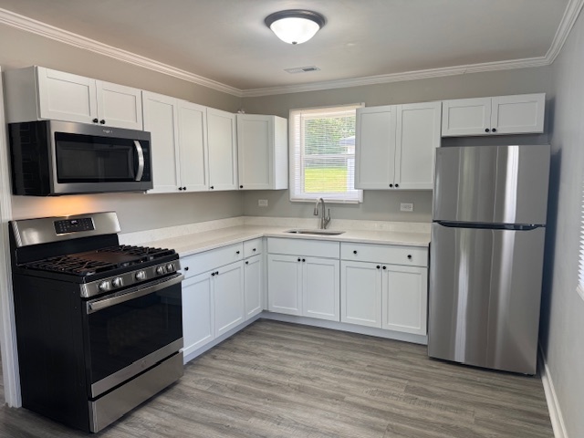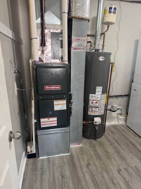 Beautifully Remodeled Ranch featuring a side drive and detached 2-car garage. Exterior painted in modern black with new vinyl siding, fascia, and soffits. Interior offers a bright kitchen with white cabinets, quartz countertops, and stainless steel appliances. Freshly painted gray walls with white trim and laminate flooring throughout. Updated full bathroom with modern finishes. Mechanical room includes washer and dryer. Recent improvements: new roof, furnace, central air, hot water tank, vinyl siding, fascia, soffit, and white thermopane windows. Spacious backyard with large concrete patio, ideal for entertaining. Move-in ready-schedule your showing today!