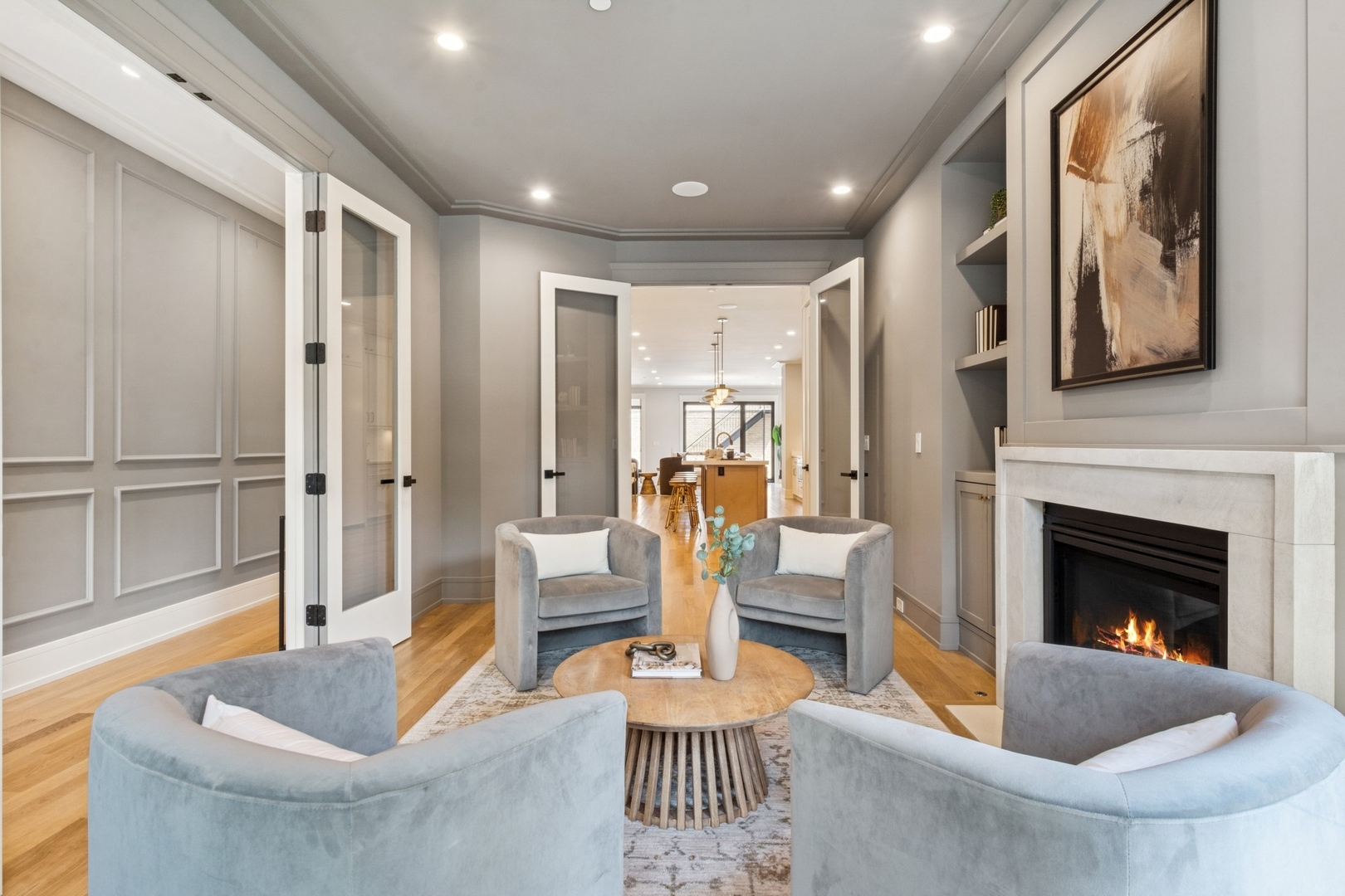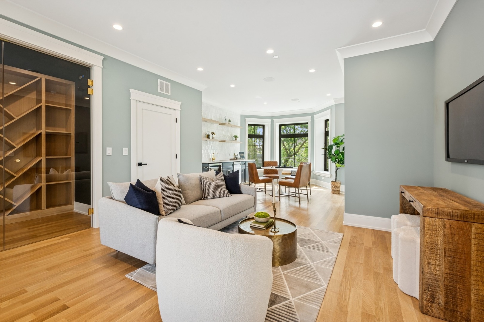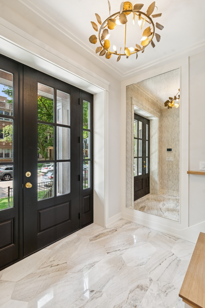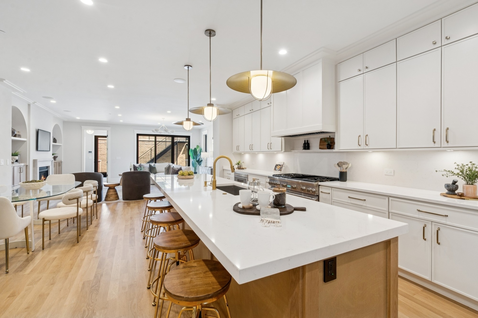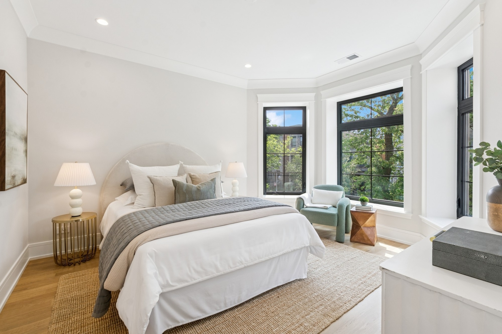 Experience city living at its finest in this remarkable, newly renovated, and expanded luxury residence, featuring 6 bedrooms, 6.5-baths, and 5,400+ SF of refined, professionally designed interiors, plus 2,000 SF of unmatched outdoor space spread across 4 private areas. Situated on a 30′ wide lot along picturesque Magnolia Ave, this stunning greystone showcases truly superb craftsmanship and exudes luxury at every turn. Striking facade w/broad limestone steps leads into a beautiful marble foyer complimented by antique mirror, accent panel wall, and elegant bronze chandelier. Formal living room sets warm inviting tone w/limestone fireplace framed by built-in floating shelves and flooded w/sunlight through oversized French windows. The heart of home is gourmet kitchen designed w/custom shaker-style cabinetry and paired w/massive Calacatta quartz island, gleaming brass pendants, and top-of-the-line smart Thermador appliances. Perfectly suited for both intimate and grand-scale gatherings, the open layout flows seamlessly from expansive kitchen and dining into spacious family room adorned w/arched custom built-ins and a fireplace connecting to outdoors for alfresco dining on a heated raised patio or further to the garage roof deck for entertaining. Designed with intention, this floor includes a built-out mudroom w/direct access to the heated garage, a stylish powder room wrapped in opulent wallcoverings, and a practical walk-in pantry for added storage. Second level offers 4 bedrooms/3 baths, including serene primary suite w/balcony, dual walk-in closets, Kohler spa-like bath w/custom white oak vanity, steam & rain shower, floating soaking tub, water closet, and porcelain checkerboard floors. Laundry room completes this level for convenience. Penthouse floor unveils versatile lounge w/kitchenette, wine cellar, and spa-like bath. It opens to a spectacular 800 SF terrace w/sweeping city views. The 9-foot deep lower level w/heated LVT floors expands w/2 additional bedrooms, 2 full baths, a second laundry, a cozy media room w/built-ins, fireplace, and a wet bar-perfect for guests, in-laws, or au pair living. Additional highlights include white oak flooring across three levels, all radiant heat baths, full smart-home AV automation w/intercom/surround sound & security system w/cameras, snow-melt on front steps & patio, and a newly built brick 3-car garage w/dual EV chargers. Situated in coveted Blaine School District, steps from Southport Corridor dining, boutiques, cafes, and iconic Wrigley Field. This exceptional-quality home in a stellar location is a rare offering poised to preserve and grow its value for generations to come.