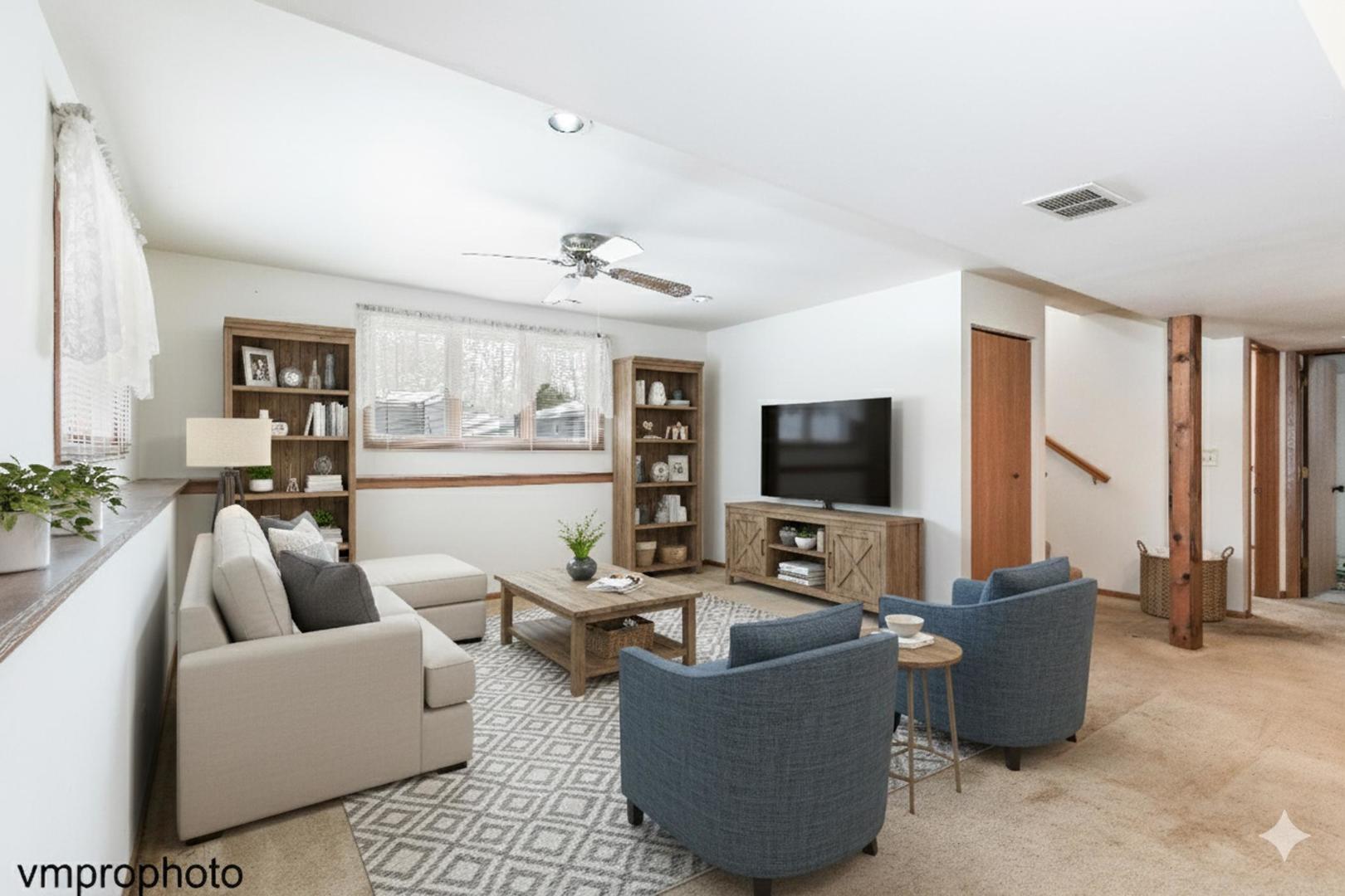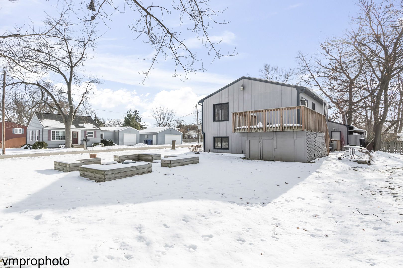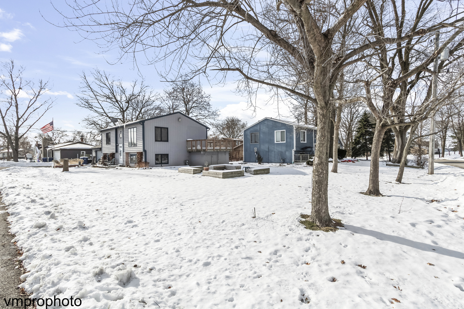 This is such a lovely and serene setting just steps away from access to Fox Lake. This spacious 3 bedroom raised ranch sits proudly on a corner lot with a great yard and raised garden beds with paver patio artfully placed between the gardens. ROOF – 3 YEARS OLD, HVAC – 3-4 YEARS OLD, DECK – 10 YEARS OLD, WELL PUMP – 10 YEARS OLD. Sun-drenched and roomy inside with a dining area with sliders to deck. Open Kitchen design with breakfast bar and spacious Living Room. The baths have newer counters and faucets and the Family Room offers fabulous space to spread out and plumbed for sink, Laundry Room has door to exterior access. The 2.5 car garage is heated and offers great space for the car buff or hobby person. This delightful neighborhood is sought after for the quiet ambience and park access to the lake. This home needs some TLC, but can be made a shiny penny!! Home being sold As-Is, hence the aggressive price. Rooms are virtually staged.