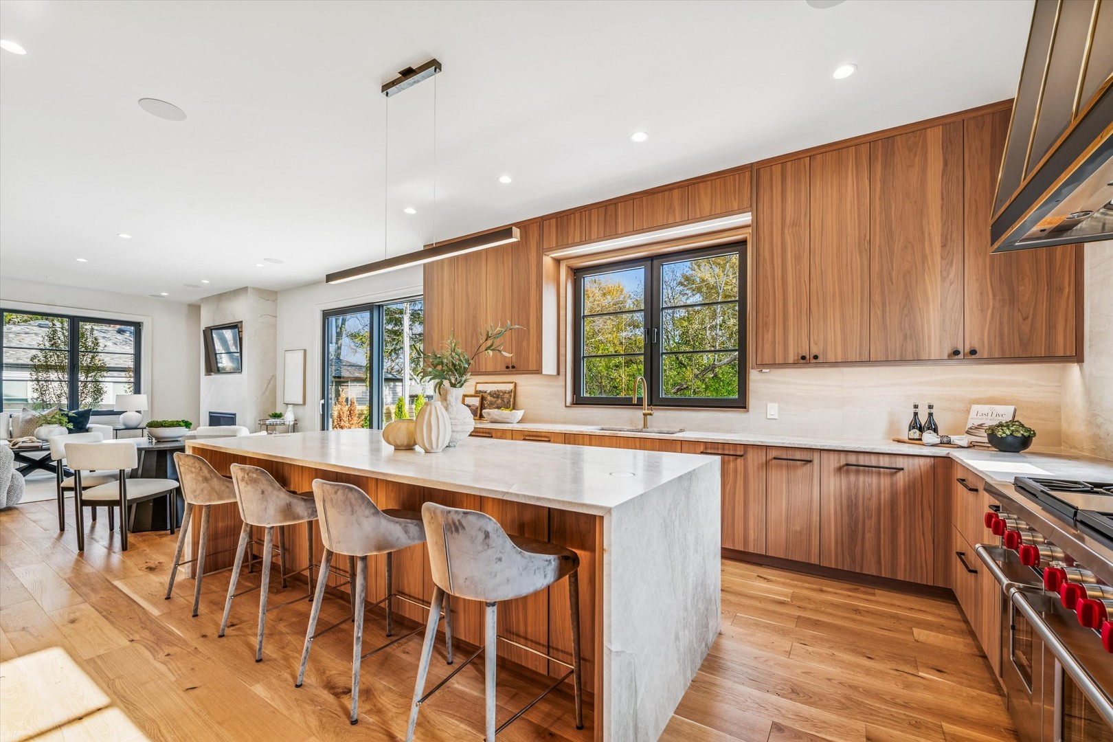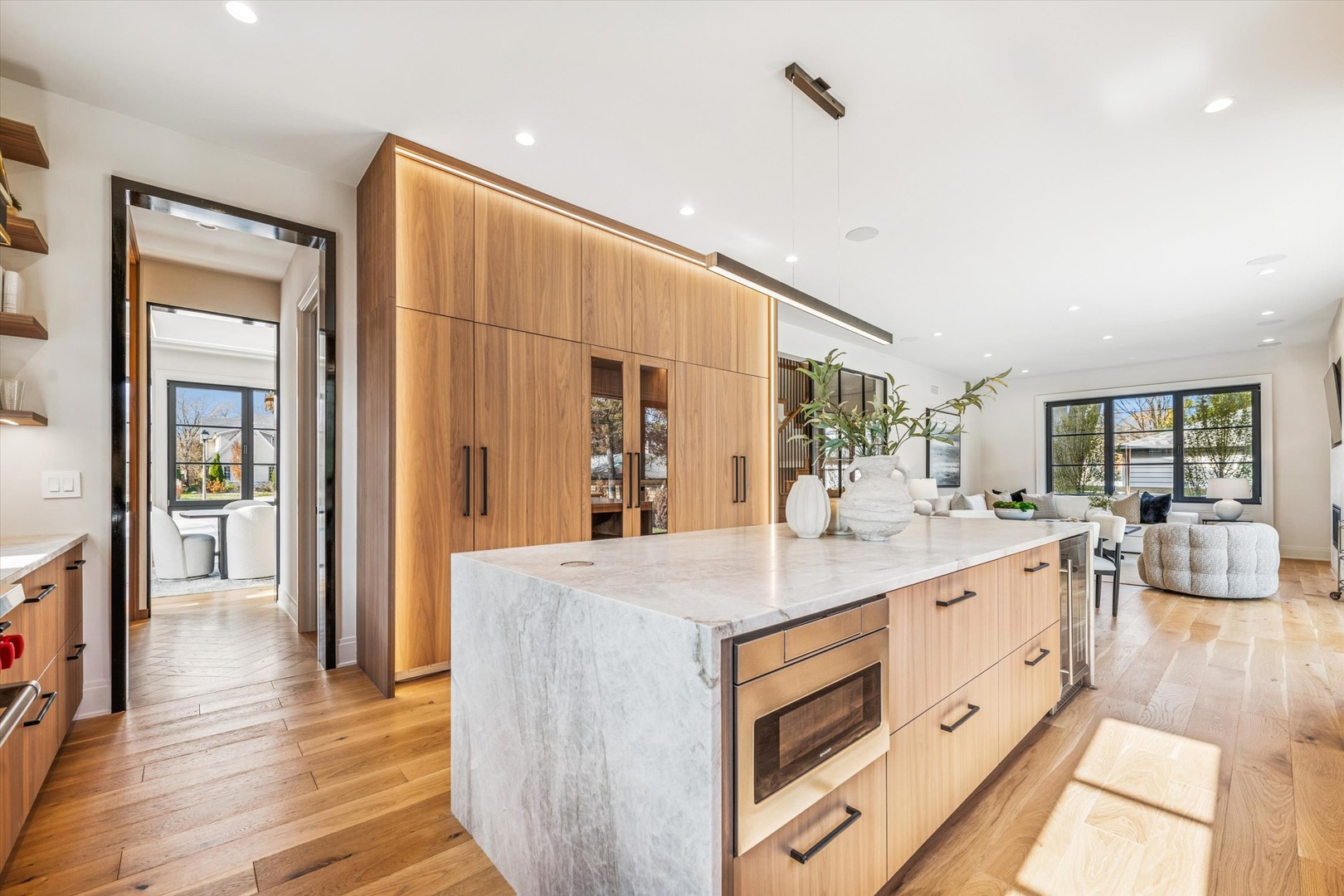 In Elmhurst’s coveted Cherry Farm enclave, where tree-lined streets meet architectural artistry, a new chapter of luxury living unfolds at 377 S. Prairie Avenue. This 5,700-square-foot custom home by Bloomfield Development was designed for those who value beauty, substance, and connection-a residence where every detail feels intentional and every space invites you to live effortlessly. With seven bedrooms and six-and-a-half baths, it’s a home that blends modern elegance with timeless warmth, crafted for gatherings that flow as easily as quiet mornings in the sunlight. Bathed in natural light from charcoal-framed European casement windows, the interior reveals 5-inch white oak flooring, glass-and-metal staircase dividers, and layers of custom millwork that speak to Bloomfield’s meticulous craftsmanship. At the heart of the home, the chef’s kitchen pairs Taj Mahal quartz countertops with waterfall edges and custom Bloomfield-designed walnut cabinetry with a Sub-Zero, Wolf, and Cove appliance suite. A striking matte-black range hood trimmed in polished gold creates a sculptural focal point, while the butler’s pantry with wet bar adds hidden functionality for seamless entertaining. The kitchen flows effortlessly into the formal dining room and a living area centered on a custom stone fireplace-spaces designed for both celebration and calm. A private main-level bedroom suite offers flexibility as a guest retreat or home office, blending convenience with privacy-a thoughtful touch that adapts beautifully to changing needs. A powder room nearby serves guests during gatherings, adding convenience without interrupting the home’s flow. The second level offers five spacious bedrooms, each with ensuite baths and walk-in closets, creating a rare sense of harmony and privacy throughout. The primary suite is a true sanctuary, showcasing a paneled accent wall, two expansive walk-in closets, and a spa-inspired bath with heated floors. A second-floor laundry room adds practical ease to daily life without compromising the home’s refined rhythm. Downstairs, the radiant-heated lower level expands the living experience with a recreation lounge, exercise studio, and sleek wet bar with a modern wine cellar. A bedroom with a large walk-in closet completes the space-perfect for an additional guest suite, media room, or creative retreat. Every square foot was intentionally designed to deliver both comfort and versatility. Outside, bluestone pathways and professional landscaping frame a large fenced yard, ideal for outdoor entertaining or relaxed evenings under the stars. A heated three-car garage, whole-home audio pre-wiring, and energy-efficient mechanical systems complete the home’s blend of innovation and timeless design. Recognized by Architectural Digest, Luxe Magazine, and Bravo TV, Bloomfield Development is celebrated for creating homes that combine enduring quality with striking beauty-a reputation built on over two decades of craftsmanship and integrity. Every detail at 377 S. Prairie Avenue was imagined for those who expect more-more light, more luxury, more connection. A custom home that’s as functional as it is beautiful, ready to welcome its first chapter of modern Elmhurst living.