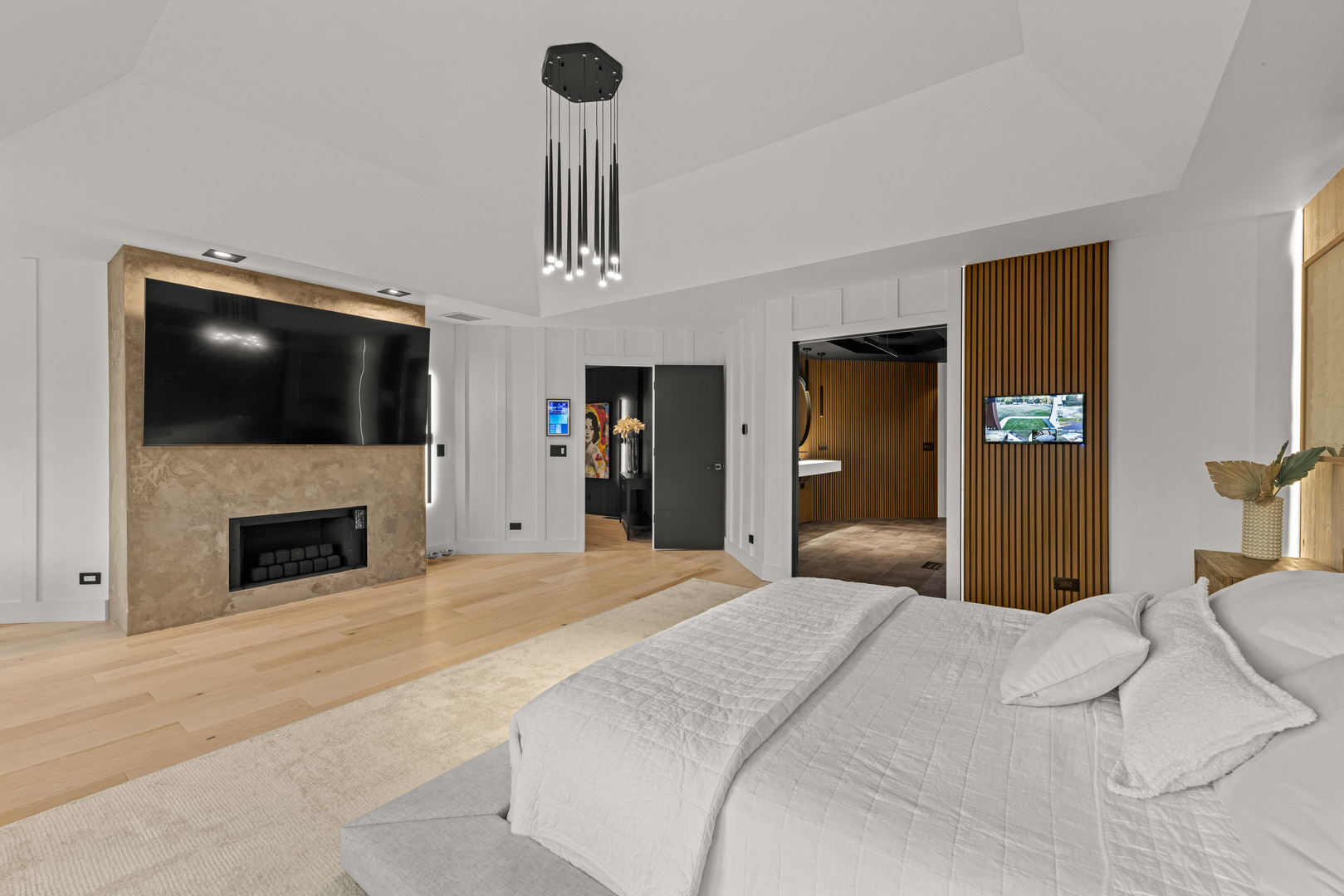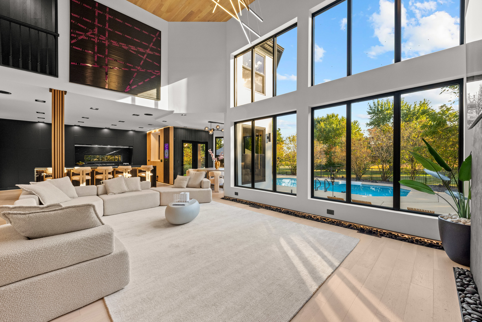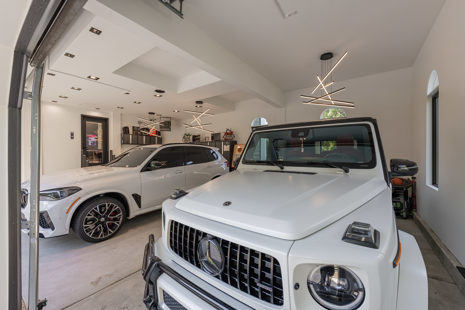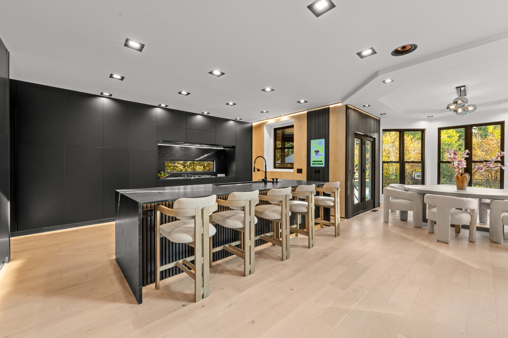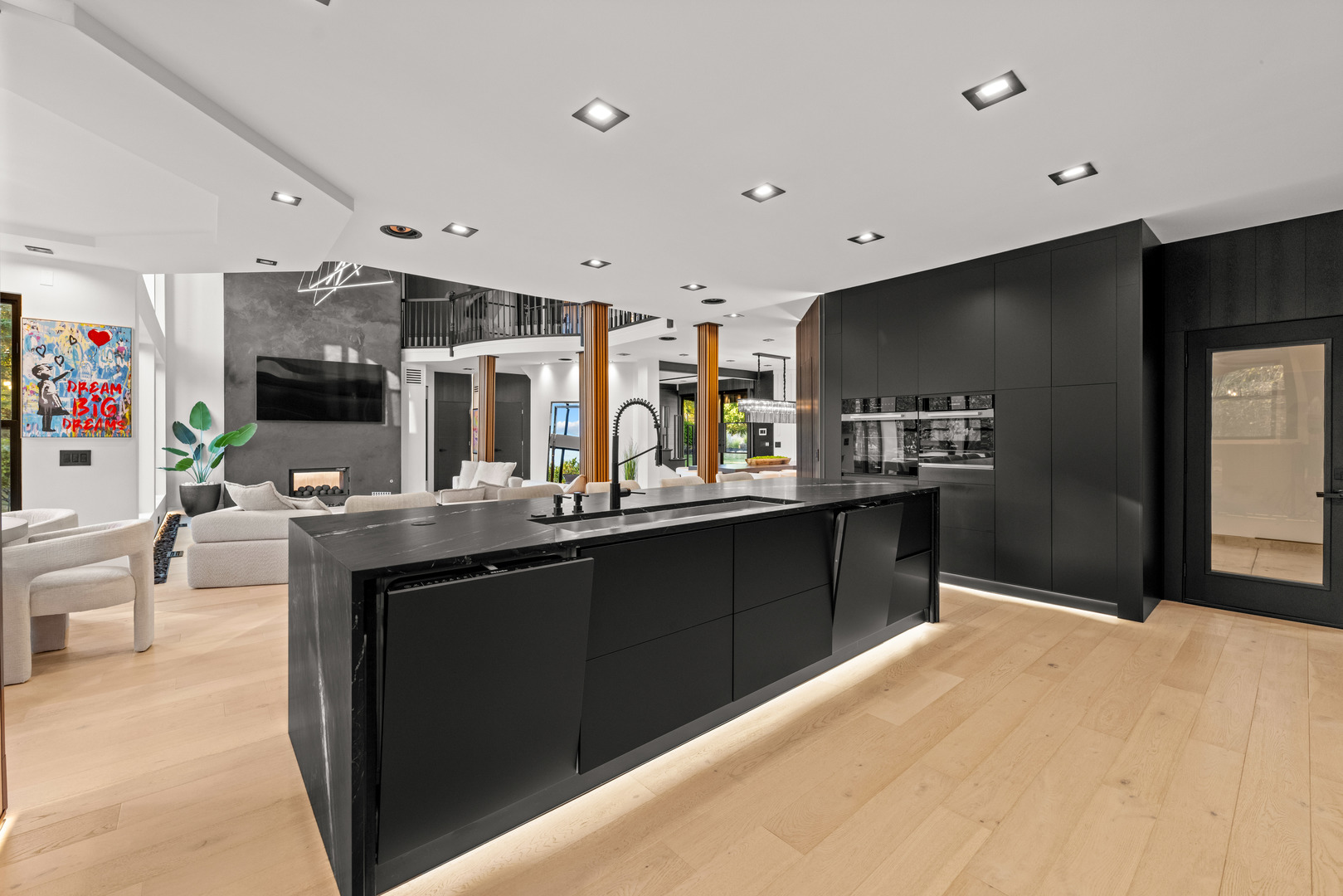 Experience the pinnacle of modern luxury living in this one of a kind custom built estate perfectly situated on a private 2.86-acre lot in the highly sought after Heritage Oaks. Every inch of this home has been thoughtfully designed with the perfect balance of sophistication, innovation, and function, offering an unmatched living experience for the most discerning buyer. As you enter through the grand custom iron and glass double doors by Pinky’s Iron Doors of California, favored by many celebrities, you are immediately greeted by a breathtaking 20 ft bamboo clad ceiling and a dramatic 40in chandelier that set the tone for what lies ahead. The open concept design flows seamlessly with white oak flooring throughout and all new black aluminum tinted windows with a wall of windows overlooking the private resort inspired backyard, filling the home with natural light and beauty. The main level showcases a striking 18 foot gas fireplace finished in custom black concrete, complemented by custom accent walls, modern LED lighting, and an integrated Klipsch in ceiling sound system. To the right of the foyer, a beautiful office or reading room features 9 foot ceilings, custom design elements, and serene views of the lush landscaping. To the left, an elegant formal dining room impresses with a smoked glass chandelier, built in cabinetry with soapstone countertops, and ample space for entertaining 12 to 14 guests.The chef’s kitchen is a true masterpiece, combining aesthetics and functionality at the highest level. The centerpiece 12 foot Brazilian matte soapstone book matched island with book matched waterfall sides and full height, matching soapstone backsplash surrounded by custom flush panel floor to ceiling cabinetry with LED lit interiors. Top of the line German appliances, a Liebherr Monolith refrigerator 2 Miele dishwashers with patented knock to open, Miele wall oven, Miele combo speed oven, Miele warming drawer, U-Line 2 drawer under counter refrigerator and a 59in commercial workstation sink make this a culinary dream. The appliances are custom paneled and integrated for a seamless modern look. The space also features a built in Samsung Frame TV and custom LED architectural lighting throughout, blending sophistication, and technology. The main level guest suite is both elegant and inviting, featuring a 92 inch all glass pivot door, 9 foot ceilings, a fireplace with black concrete surround, a custom wood accent wall with LED lighting, and expansive views of the backyard and pool. The adjoining full bath is designed with luxury materials, including a concrete shower base, in ceiling rain shower, solid stone vanity, European NewTechWood accent wall, and custom lighting. Upstairs, the primary suite is a private re treat designed for tranquility and indulgence. Vaulted ceilings, wood accent walls, and designer lighting create a serene atmosphere. The suite includes a spacious lounge area with a fireplace, a private balcony overlooking the pool and mature trees, and a spa inspired bathroom featuring a freestanding solid stone tub under a skylight, concrete shower base, floating 72 inch vanity, and NewTechWood cladding for a warm organic aesthetic. The expansive walk in closet includes custom built ins, LED lighting, and an in suite Samsung washer and dryer for added convenience. Three additional bedrooms, all with walk in closets and unique architectural details, provide ample space for family or guests. The fully finished lower level extends the luxury with bamboo flooring, custom cabinetry, LED lighting, a complete Klipsch home theater system, a dedicated gym room, and a beautifully designed bathroom with premium finishes. Step outside to your private resort. The outdoor space features a 38 foot heated lap pool with color-changing LED lighting, Trex gazebo with privacy wall, integrated lighting, and a 72 inch HEATSTRIP USA heater for year round enjoyment. Over 200 landscape lights illuminate the property’s 35 plus tons of hand
