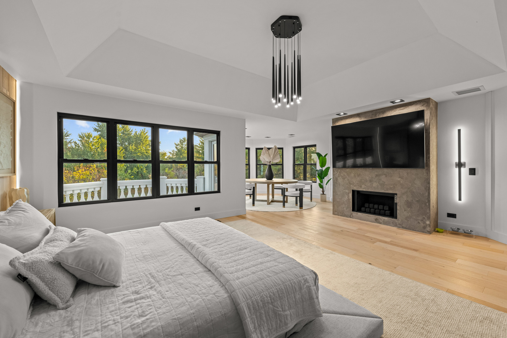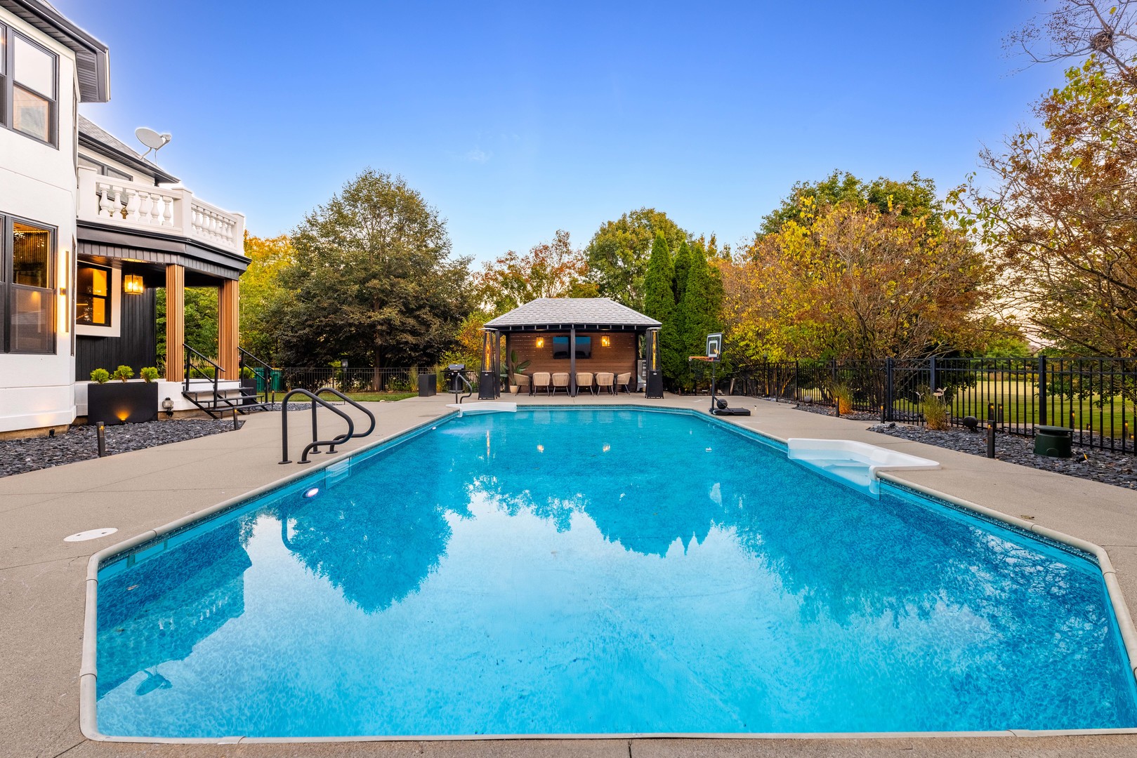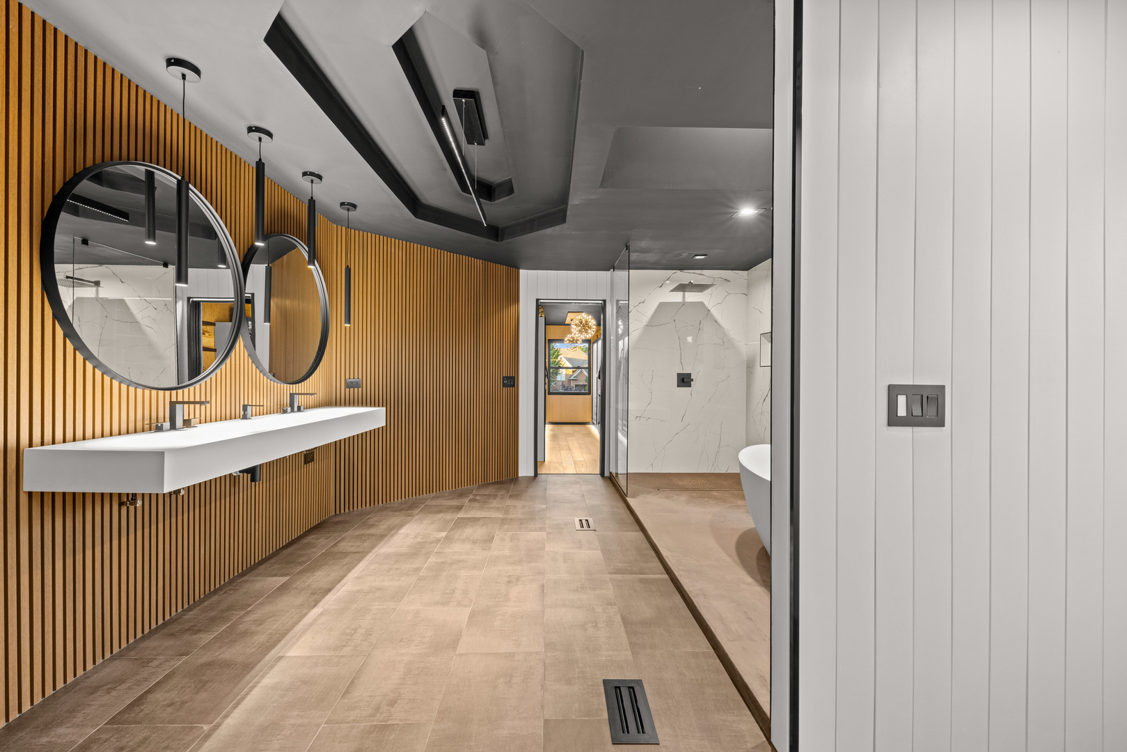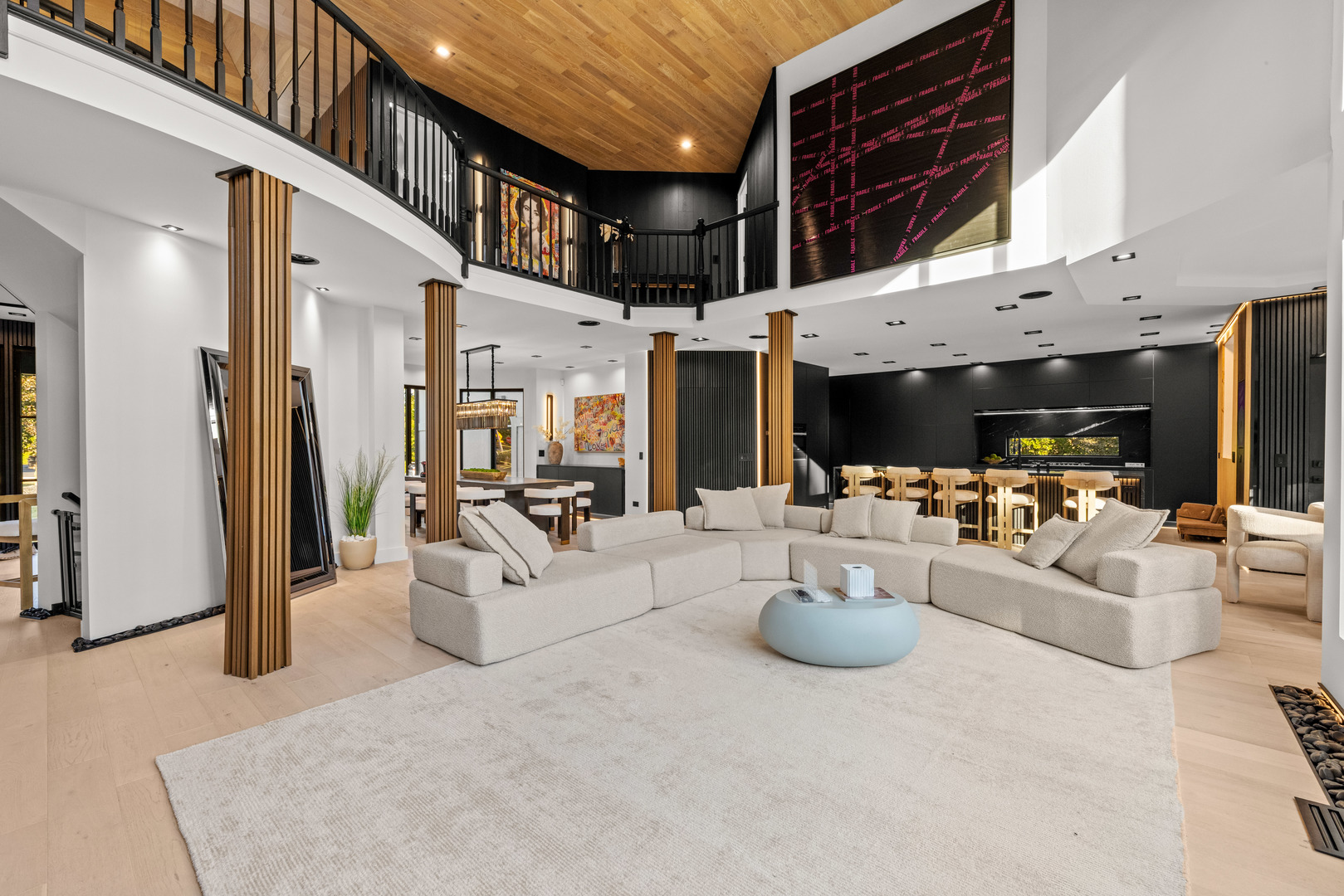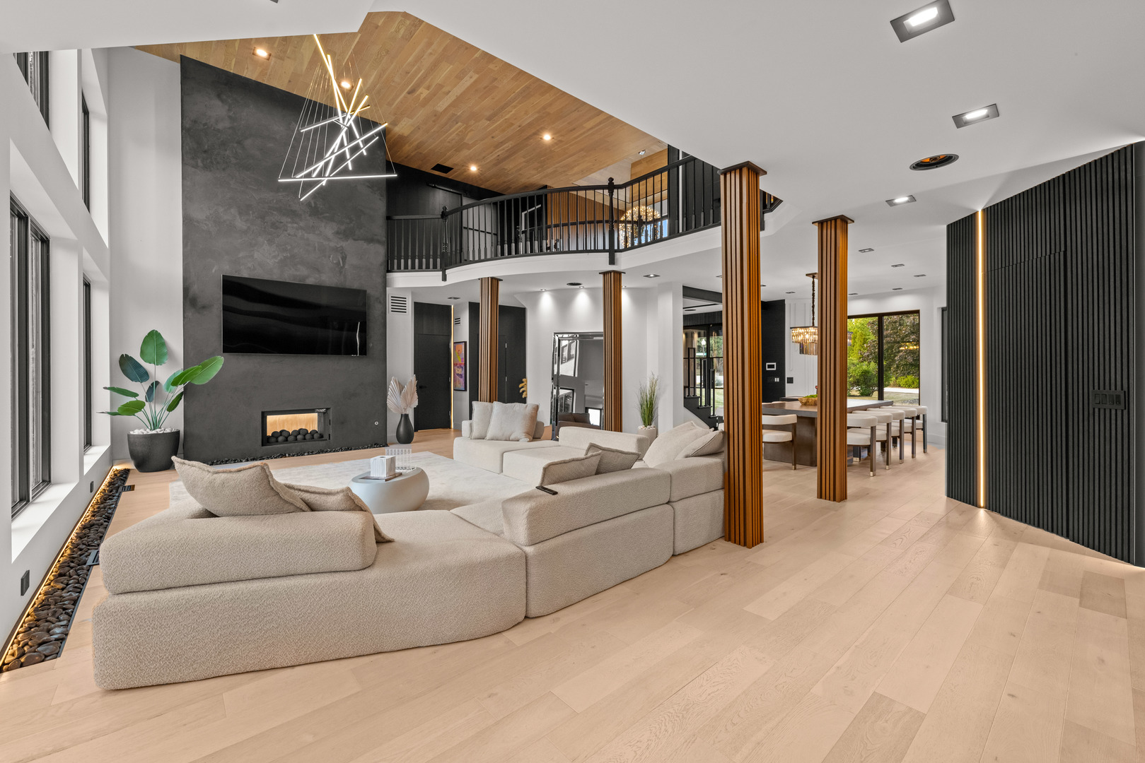Experience the pinnacle of modern luxury living in this one of a kind custom built estate perfectly situated on a private 2.86-acre lot in the highly sought after Heritage Oaks. Every inch of this home has been thoughtfully designed with the perfect balance of sophistication, innovation, and function, offering an unmatched living experience for the most discerning buyer. As you enter through the grand custom iron and glass double doors by Pinky’s Iron Doors of California, favored by many celebrities, you are immediately greeted by a breathtaking 20 ft bamboo clad ceiling and a dramatic 40in chandelier that set the tone for what lies ahead. The open concept design flows seamlessly with white oak flooring throughout and all new black aluminum tinted windows with a wall of windows overlooking the private resort inspired backyard, filling the home with natural light and beauty. The main level showcases a striking 18 foot gas fireplace finished in custom black concrete, complemented by custom accent walls, modern LED lighting, and an integrated Klipsch in ceiling sound system. To the right of the foyer, a beautiful office or reading room features 9 foot ceilings, custom design elements, and serene views of the lush landscaping. To the left, an elegant formal dining room impresses with a smoked glass chandelier, built in cabinetry with soapstone countertops, and ample space for entertaining 12 to 14 guests.The chef’s kitchen is a true masterpiece, combining aesthetics and functionality at the highest level. The centerpiece 12 foot Brazilian matte soapstone book matched island with book matched waterfall sides and full height, matching soapstone backsplash surrounded by custom flush panel floor to ceiling cabinetry with LED lit interiors. Top of the line German appliances, a Liebherr Monolith refrigerator 2 Miele dishwashers with patented knock to open, Miele wall oven, Miele combo speed oven, Miele warming drawer, U-Line 2 drawer under counter refrigerator and a 59in commercial workstation sink make this a culinary dream. The appliances are custom paneled and integrated for a seamless modern look. The space also features a built in Samsung Frame TV and custom LED architectural lighting throughout, blending sophistication, and technology. The main level guest suite is both elegant and inviting, featuring a 92 inch all glass pivot door, 9 foot ceilings, a fireplace with black concrete surround, a custom wood accent wall with LED lighting, and expansive views of the backyard and pool. The adjoining full bath is designed with luxury materials, including a concrete shower base, in ceiling rain shower, solid stone vanity, European NewTechWood accent wall, and custom lighting. Upstairs, the primary suite is a private re treat designed for tranquility and indulgence. Vaulted ceilings, wood accent walls, and designer lighting create a serene atmosphere. The suite includes a spacious lounge area with a fireplace, a private balcony overlooking the pool and mature trees, and a spa inspired bathroom featuring a freestanding solid stone tub under a skylight, concrete shower base, floating 72 inch vanity, and NewTechWood cladding for a warm organic aesthetic. The expansive walk in closet includes custom built ins, LED lighting, and an in suite Samsung washer and dryer for added convenience. Three additional bedrooms, all with walk in closets and unique architectural details, provide ample space for family or guests. The fully finished lower level extends the luxury with bamboo flooring, custom cabinetry, LED lighting, a complete Klipsch home theater system, a dedicated gym room, and a beautifully designed bathroom with premium finishes. Step outside to your private resort. The outdoor space features a 38 foot heated lap pool with color-changing LED lighting, Trex gazebo with privacy wall, integrated lighting, and a 72 inch HEATSTRIP USA heater for year round enjoyment. Over 200 landscape lights illuminate the property’s 35 plus tons of hand