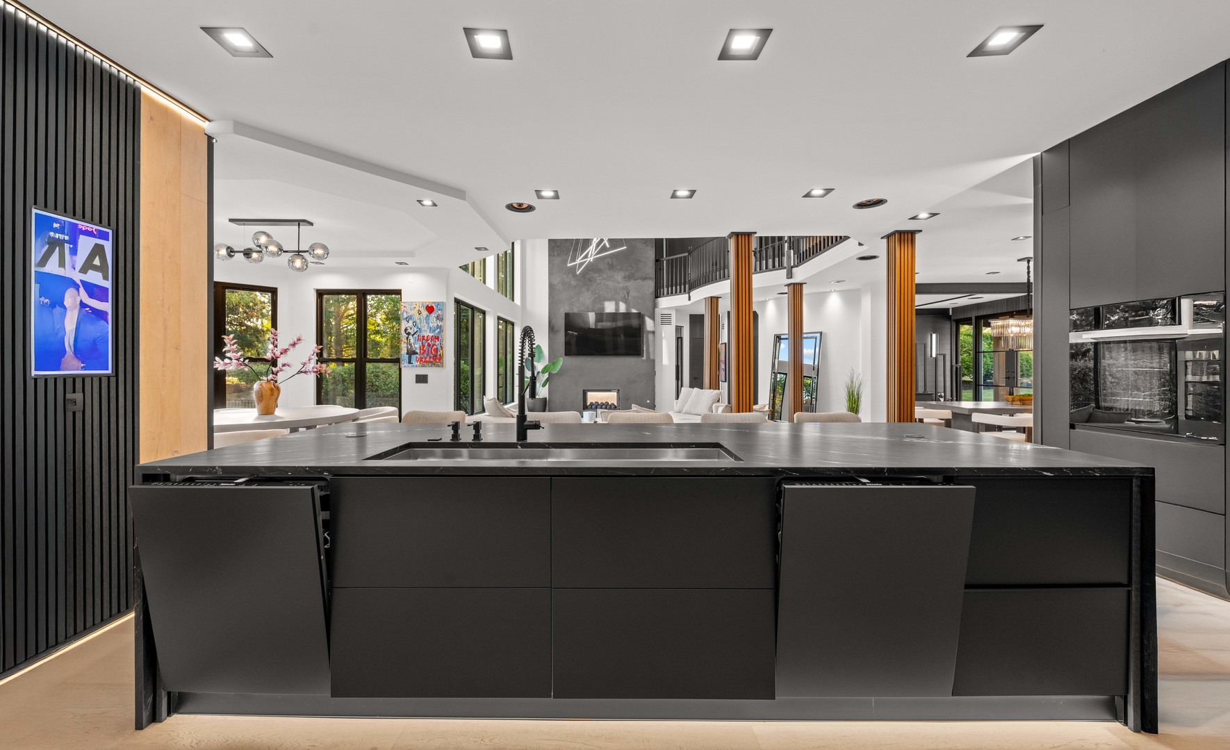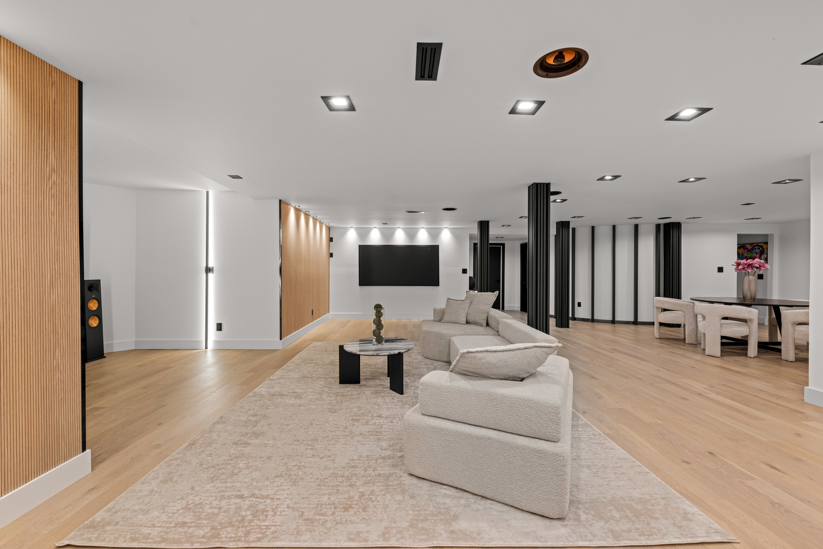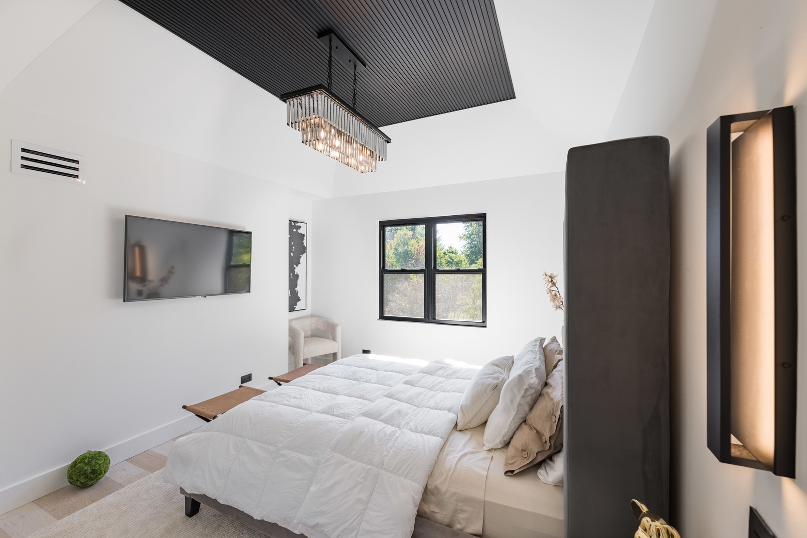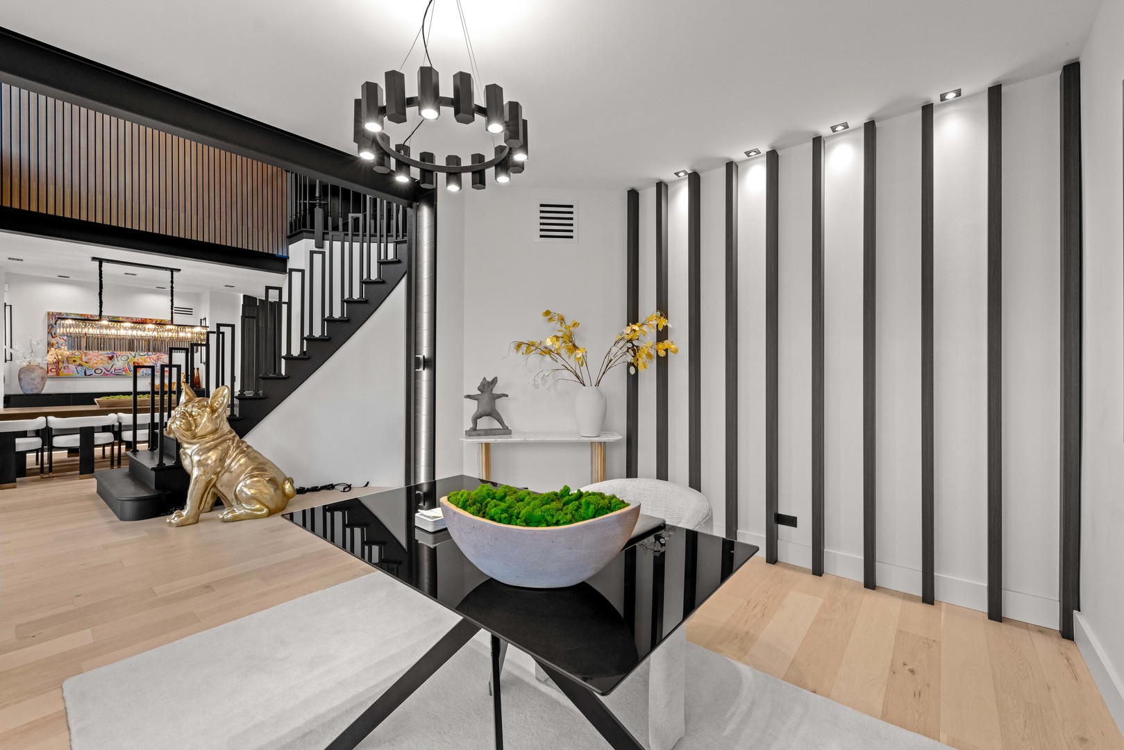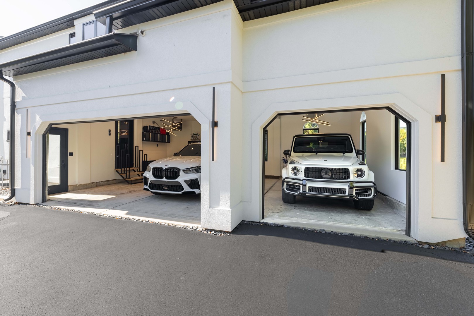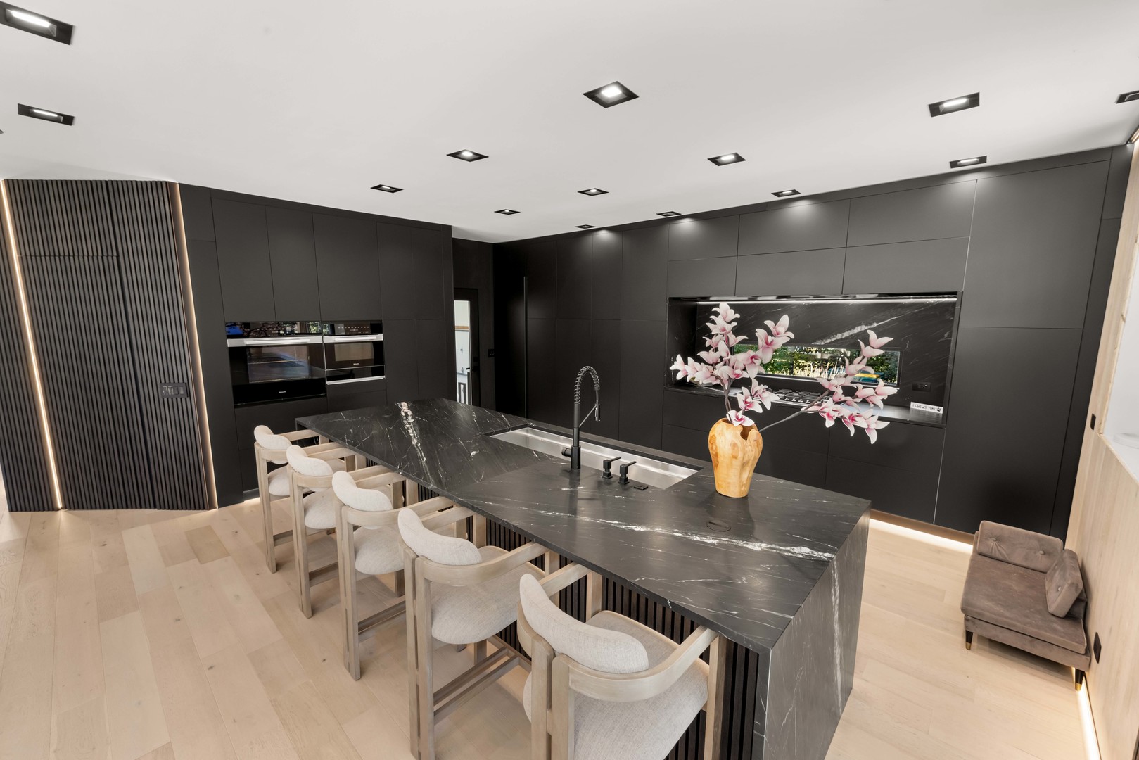 Experience the pinnacle of modern luxury living in this one of a kind custom built estate perfectly situated on a private 2.86-acre lot in the highly sought after Heritage Oaks. Every inch of this home has been thoughtfully designed with the perfect balance of sophistication, innovation, and function, offering an unmatched living experience for the most discerning buyer. As you enter through the grand custom iron and glass double doors by Pinky’s Iron Doors of California, favored by many celebrities, you are immediately greeted by a breathtaking 20 ft bamboo clad ceiling and a dramatic 40in chandelier that set the tone for what lies ahead. The open concept design flows seamlessly with white oak flooring throughout and all new black aluminum tinted windows with a wall of windows overlooking the private resort inspired backyard, filling the home with natural light and beauty. The main level showcases a striking 18 foot gas fireplace finished in custom black concrete, complemented by custom accent walls, modern LED lighting, and an integrated Klipsch in ceiling sound system. To the right of the foyer, a beautiful office or reading room features 9 foot ceilings, custom design elements, and serene views of the lush landscaping. To the left, an elegant formal dining room impresses with a smoked glass chandelier, built in cabinetry with soapstone countertops, and ample space for entertaining 12 to 14 guests.The chef’s kitchen is a true masterpiece, combining aesthetics and functionality at the highest level. The centerpiece 12 foot Brazilian matte soapstone book matched island with book matched waterfall sides and full height, matching soapstone backsplash surrounded by custom flush panel floor to ceiling cabinetry with LED lit interiors. Top of the line German appliances, a Liebherr Monolith refrigerator 2 Miele dishwashers with patented knock to open, Miele wall oven, Miele combo speed oven, Miele warming drawer, U-Line 2 drawer under counter refrigerator and a 59in commercial workstation sink make this a culinary dream. The appliances are custom paneled and integrated for a seamless modern look. The space also features a built in Samsung Frame TV and custom LED architectural lighting throughout, blending sophistication, and technology. The main level guest suite is both elegant and inviting, featuring a 92 inch all glass pivot door, 9 foot ceilings, a fireplace with black concrete surround, a custom wood accent wall with LED lighting, and expansive views of the backyard and pool. The adjoining full bath is designed with luxury materials, including a concrete shower base, in ceiling rain shower, solid stone vanity, European NewTechWood accent wall, and custom lighting. Upstairs, the primary suite is a private re treat designed for tranquility and indulgence. Vaulted ceilings, wood accent walls, and designer lighting create a serene atmosphere. The suite includes a spacious lounge area with a fireplace, a private balcony overlooking the pool and mature trees, and a spa inspired bathroom featuring a freestanding solid stone tub under a skylight, concrete shower base, floating 72 inch vanity, and NewTechWood cladding for a warm organic aesthetic. The expansive walk in closet includes custom built ins, LED lighting, and an in suite Samsung washer and dryer for added convenience. Three additional bedrooms, all with walk in closets and unique architectural details, provide ample space for family or guests. The fully finished lower level extends the luxury with bamboo flooring, custom cabinetry, LED lighting, a complete Klipsch home theater system, a dedicated gym room, and a beautifully designed bathroom with premium finishes. Step outside to your private resort. The outdoor space features a 38 foot heated lap pool with color-changing LED lighting, Trex gazebo with privacy wall, integrated lighting, and a 72 inch HEATSTRIP USA heater for year round enjoyment. Over 200 landscape lights illuminate the property’s 35 plus tons of hand