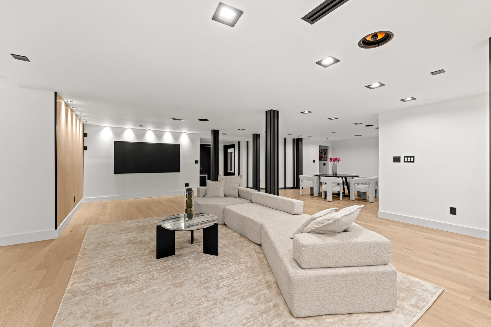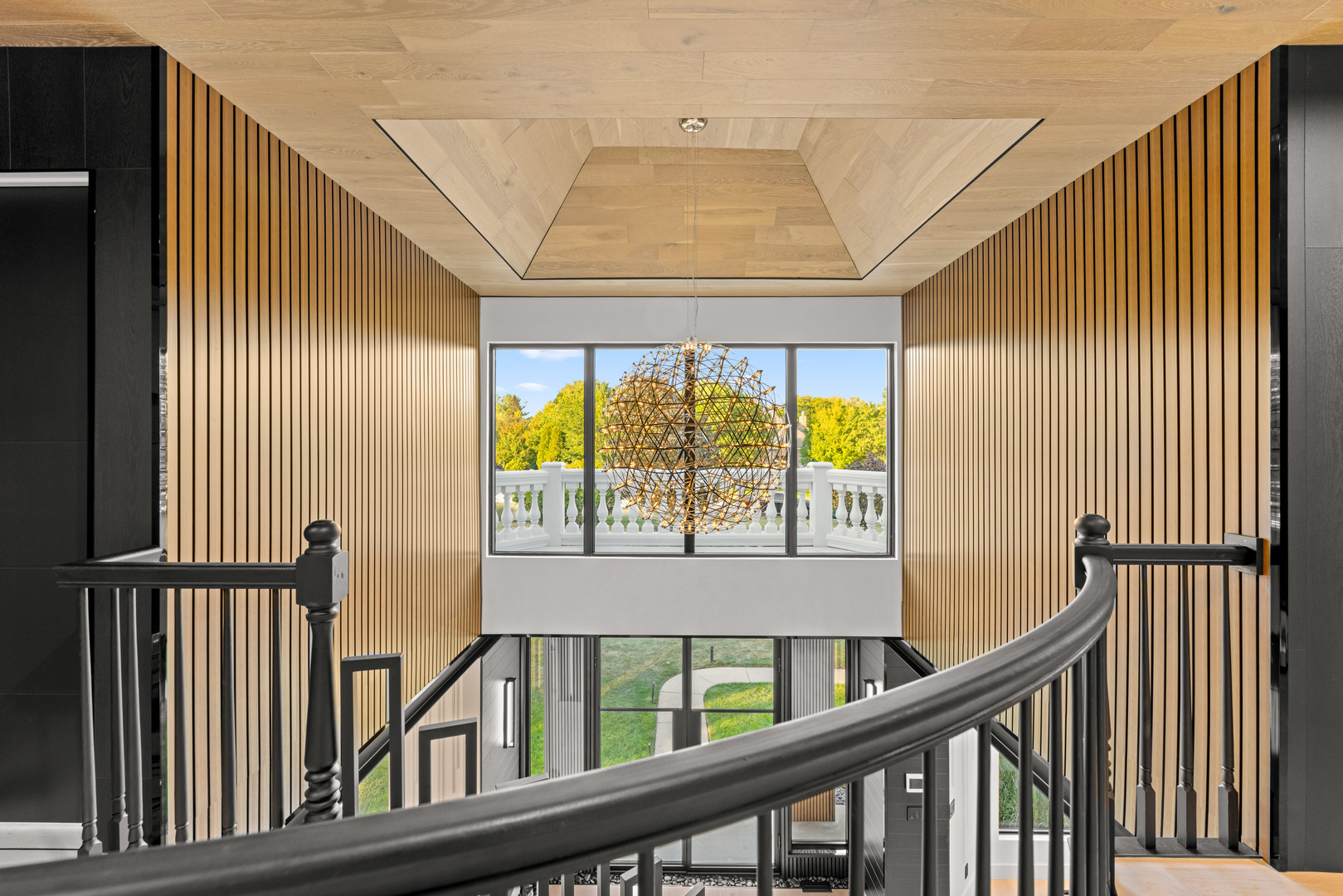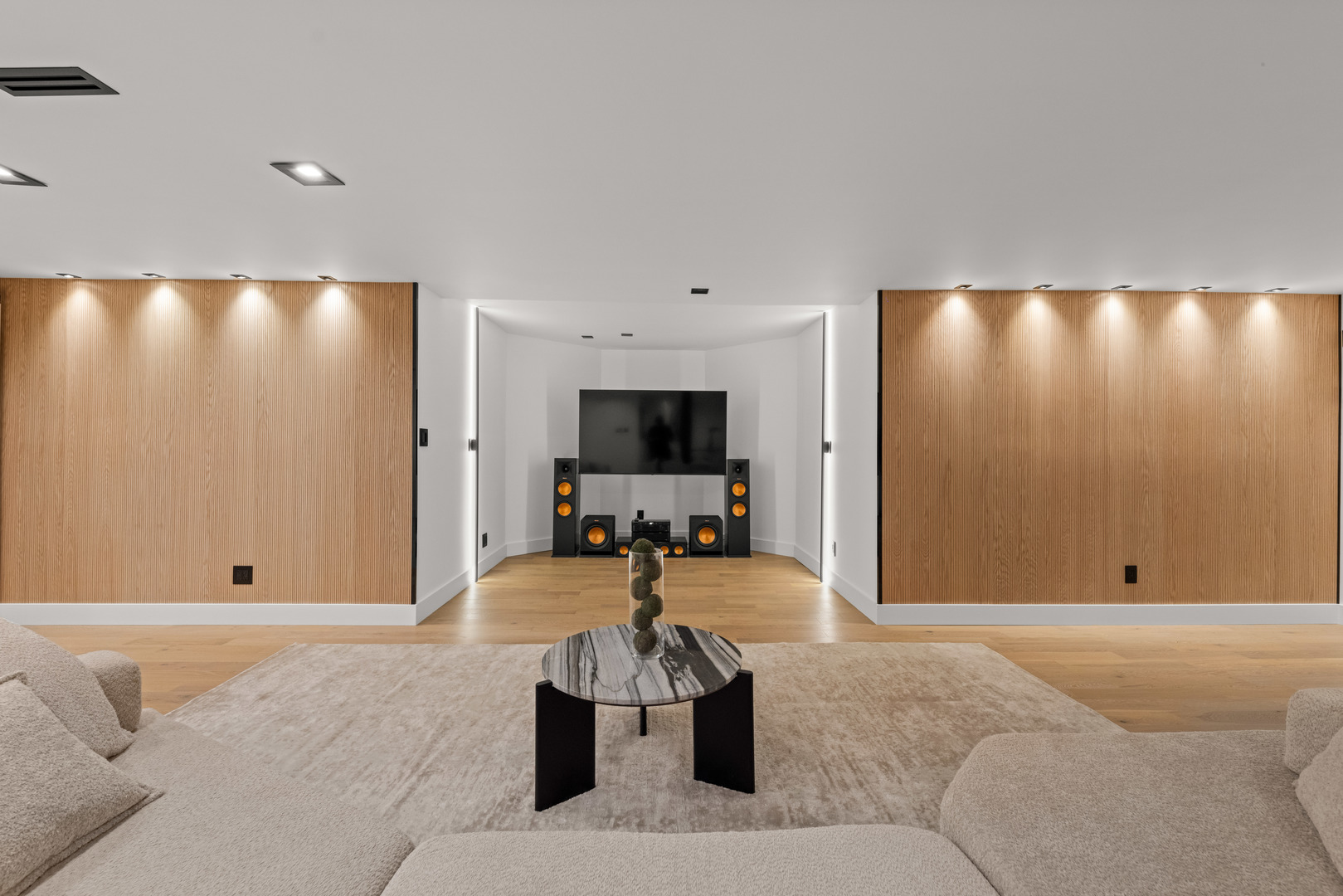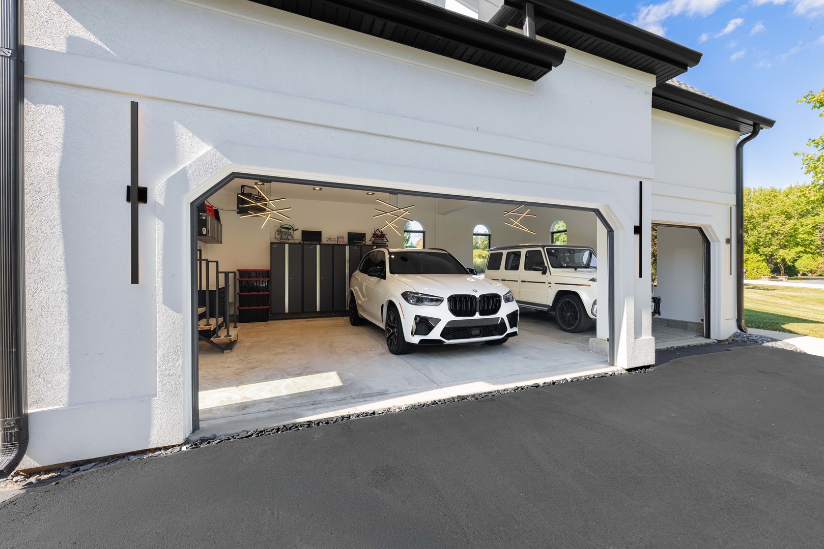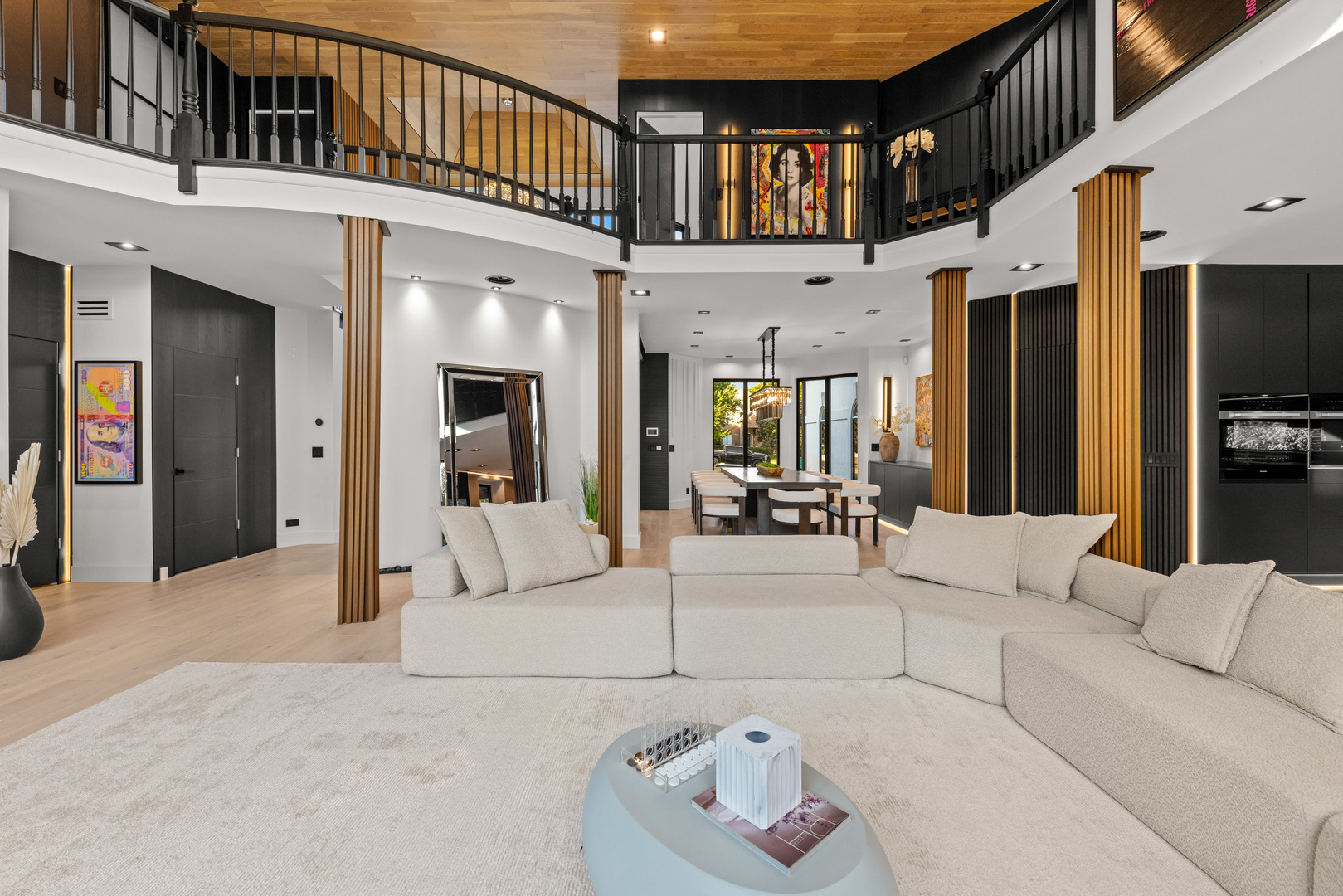 Experience the pinnacle of modern luxury living in this one of a kind custom built estate perfectly situated on a private 2.86-acre lot in the highly sought after Heritage Oaks. Every inch of this home has been thoughtfully designed with the perfect balance of sophistication, innovation, and function, offering an unmatched living experience for the most discerning buyer. As you enter through the grand custom iron and glass double doors by Pinky’s Iron Doors of California, favored by many celebrities, you are immediately greeted by a breathtaking 20 ft bamboo clad ceiling and a dramatic 40in chandelier that set the tone for what lies ahead. The open concept design flows seamlessly with white oak flooring throughout and all new black aluminum tinted windows with a wall of windows overlooking the private resort inspired backyard, filling the home with natural light and beauty. The main level showcases a striking 18 foot gas fireplace finished in custom black concrete, complemented by custom accent walls, modern LED lighting, and an integrated Klipsch in ceiling sound system. To the right of the foyer, a beautiful office or reading room features 9 foot ceilings, custom design elements, and serene views of the lush landscaping. To the left, an elegant formal dining room impresses with a smoked glass chandelier, built in cabinetry with soapstone countertops, and ample space for entertaining 12 to 14 guests.The chef’s kitchen is a true masterpiece, combining aesthetics and functionality at the highest level. The centerpiece 12 foot Brazilian matte soapstone book matched island with book matched waterfall sides and full height, matching soapstone backsplash surrounded by custom flush panel floor to ceiling cabinetry with LED lit interiors. Top of the line German appliances, a Liebherr Monolith refrigerator 2 Miele dishwashers with patented knock to open, Miele wall oven, Miele combo speed oven, Miele warming drawer, U-Line 2 drawer under counter refrigerator and a 59in commercial workstation sink make this a culinary dream. The appliances are custom paneled and integrated for a seamless modern look. The space also features a built in Samsung Frame TV and custom LED architectural lighting throughout, blending sophistication, and technology. The main level guest suite is both elegant and inviting, featuring a 92 inch all glass pivot door, 9 foot ceilings, a fireplace with black concrete surround, a custom wood accent wall with LED lighting, and expansive views of the backyard and pool. The adjoining full bath is designed with luxury materials, including a concrete shower base, in ceiling rain shower, solid stone vanity, European NewTechWood accent wall, and custom lighting. Upstairs, the primary suite is a private re treat designed for tranquility and indulgence. Vaulted ceilings, wood accent walls, and designer lighting create a serene atmosphere. The suite includes a spacious lounge area with a fireplace, a private balcony overlooking the pool and mature trees, and a spa inspired bathroom featuring a freestanding solid stone tub under a skylight, concrete shower base, floating 72 inch vanity, and NewTechWood cladding for a warm organic aesthetic. The expansive walk in closet includes custom built ins, LED lighting, and an in suite Samsung washer and dryer for added convenience. Three additional bedrooms, all with walk in closets and unique architectural details, provide ample space for family or guests. The fully finished lower level extends the luxury with bamboo flooring, custom cabinetry, LED lighting, a complete Klipsch home theater system, a dedicated gym room, and a beautifully designed bathroom with premium finishes. Step outside to your private resort. The outdoor space features a 38 foot heated lap pool with color-changing LED lighting, Trex gazebo with privacy wall, integrated lighting, and a 72 inch HEATSTRIP USA heater for year round enjoyment. Over 200 landscape lights illuminate the property’s 35 plus tons of hand