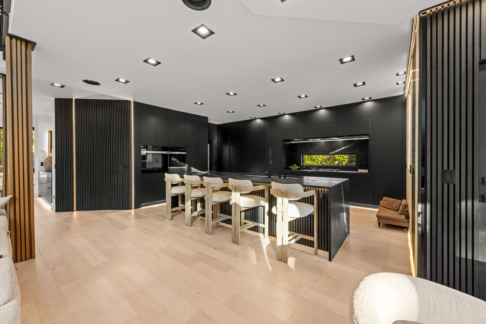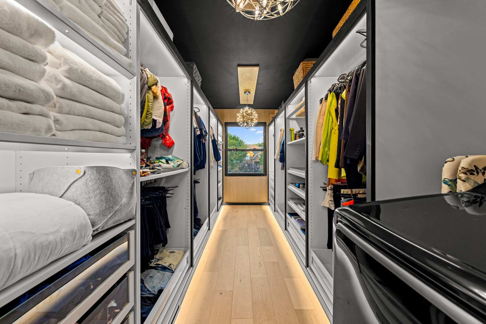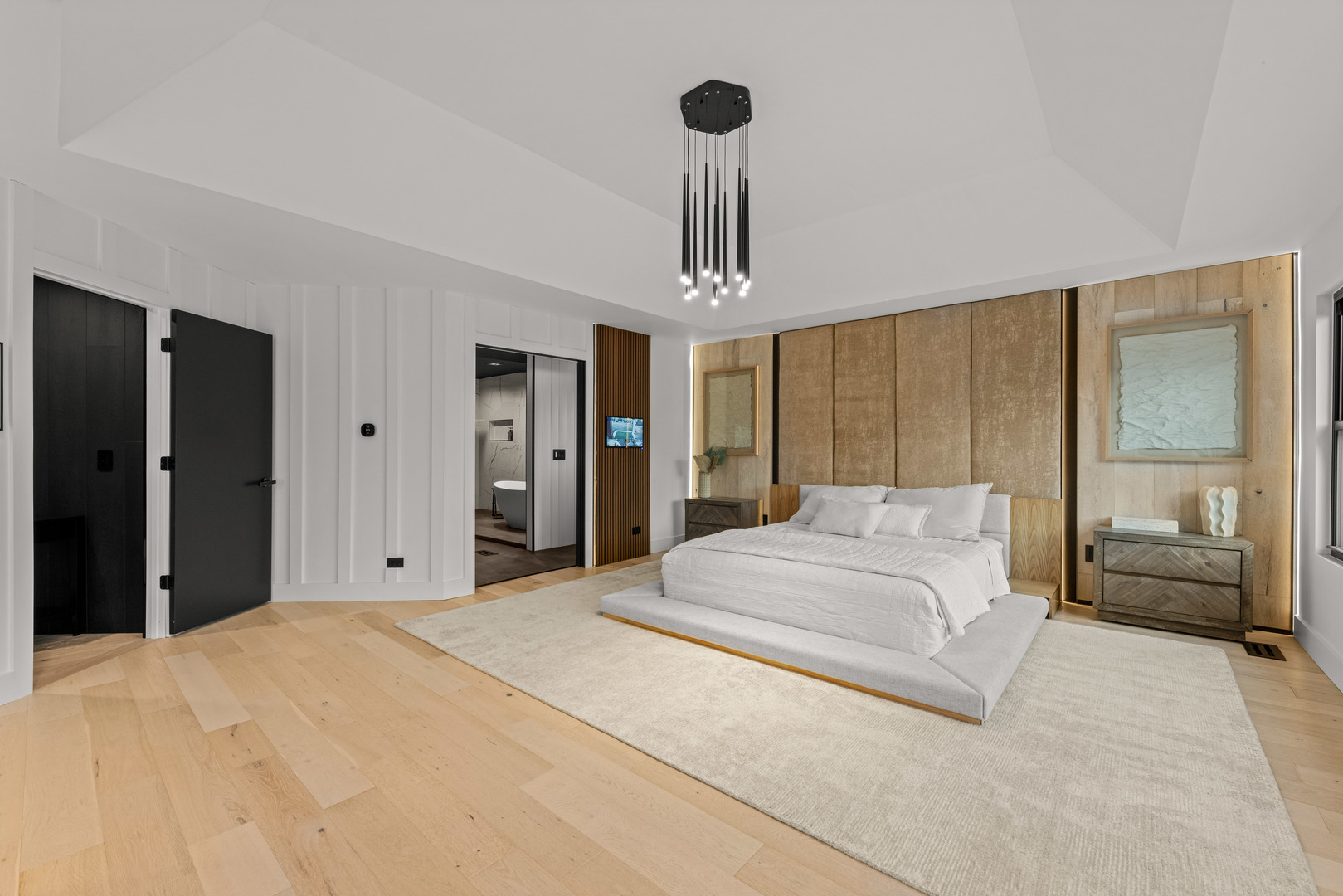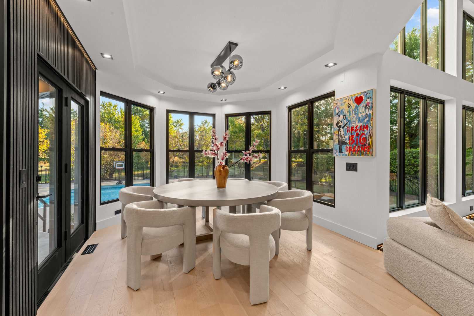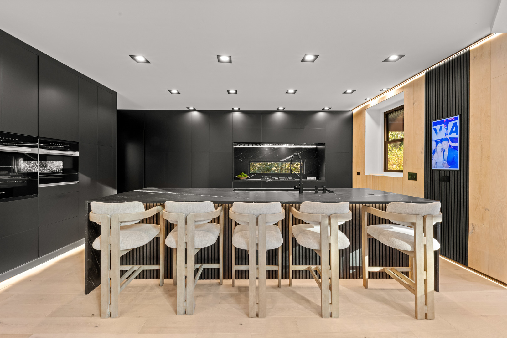 Experience the pinnacle of modern luxury living in this one of a kind custom built estate perfectly situated on a private 2.86-acre lot in the highly sought after Heritage Oaks. Every inch of this home has been thoughtfully designed with the perfect balance of sophistication, innovation, and function, offering an unmatched living experience for the most discerning buyer. As you enter through the grand custom iron and glass double doors by Pinky’s Iron Doors of California, favored by many celebrities, you are immediately greeted by a breathtaking 20 ft bamboo clad ceiling and a dramatic 40in chandelier that set the tone for what lies ahead. The open concept design flows seamlessly with white oak flooring throughout and all new black aluminum tinted windows with a wall of windows overlooking the private resort inspired backyard, filling the home with natural light and beauty. The main level showcases a striking 18 foot gas fireplace finished in custom black concrete, complemented by custom accent walls, modern LED lighting, and an integrated Klipsch in ceiling sound system. To the right of the foyer, a beautiful office or reading room features 9 foot ceilings, custom design elements, and serene views of the lush landscaping. To the left, an elegant formal dining room impresses with a smoked glass chandelier, built in cabinetry with soapstone countertops, and ample space for entertaining 12 to 14 guests.The chef’s kitchen is a true masterpiece, combining aesthetics and functionality at the highest level. The centerpiece 12 foot Brazilian matte soapstone book matched island with book matched waterfall sides and full height, matching soapstone backsplash surrounded by custom flush panel floor to ceiling cabinetry with LED lit interiors. Top of the line German appliances, a Liebherr Monolith refrigerator 2 Miele dishwashers with patented knock to open, Miele wall oven, Miele combo speed oven, Miele warming drawer, U-Line 2 drawer under counter refrigerator and a 59in commercial workstation sink make this a culinary dream. The appliances are custom paneled and integrated for a seamless modern look. The space also features a built in Samsung Frame TV and custom LED architectural lighting throughout, blending sophistication, and technology. The main level guest suite is both elegant and inviting, featuring a 92 inch all glass pivot door, 9 foot ceilings, a fireplace with black concrete surround, a custom wood accent wall with LED lighting, and expansive views of the backyard and pool. The adjoining full bath is designed with luxury materials, including a concrete shower base, in ceiling rain shower, solid stone vanity, European NewTechWood accent wall, and custom lighting. Upstairs, the primary suite is a private re treat designed for tranquility and indulgence. Vaulted ceilings, wood accent walls, and designer lighting create a serene atmosphere. The suite includes a spacious lounge area with a fireplace, a private balcony overlooking the pool and mature trees, and a spa inspired bathroom featuring a freestanding solid stone tub under a skylight, concrete shower base, floating 72 inch vanity, and NewTechWood cladding for a warm organic aesthetic. The expansive walk in closet includes custom built ins, LED lighting, and an in suite Samsung washer and dryer for added convenience. Three additional bedrooms, all with walk in closets and unique architectural details, provide ample space for family or guests. The fully finished lower level extends the luxury with bamboo flooring, custom cabinetry, LED lighting, a complete Klipsch home theater system, a dedicated gym room, and a beautifully designed bathroom with premium finishes. Step outside to your private resort. The outdoor space features a 38 foot heated lap pool with color-changing LED lighting, Trex gazebo with privacy wall, integrated lighting, and a 72 inch HEATSTRIP USA heater for year round enjoyment. Over 200 landscape lights illuminate the property’s 35 plus tons of hand