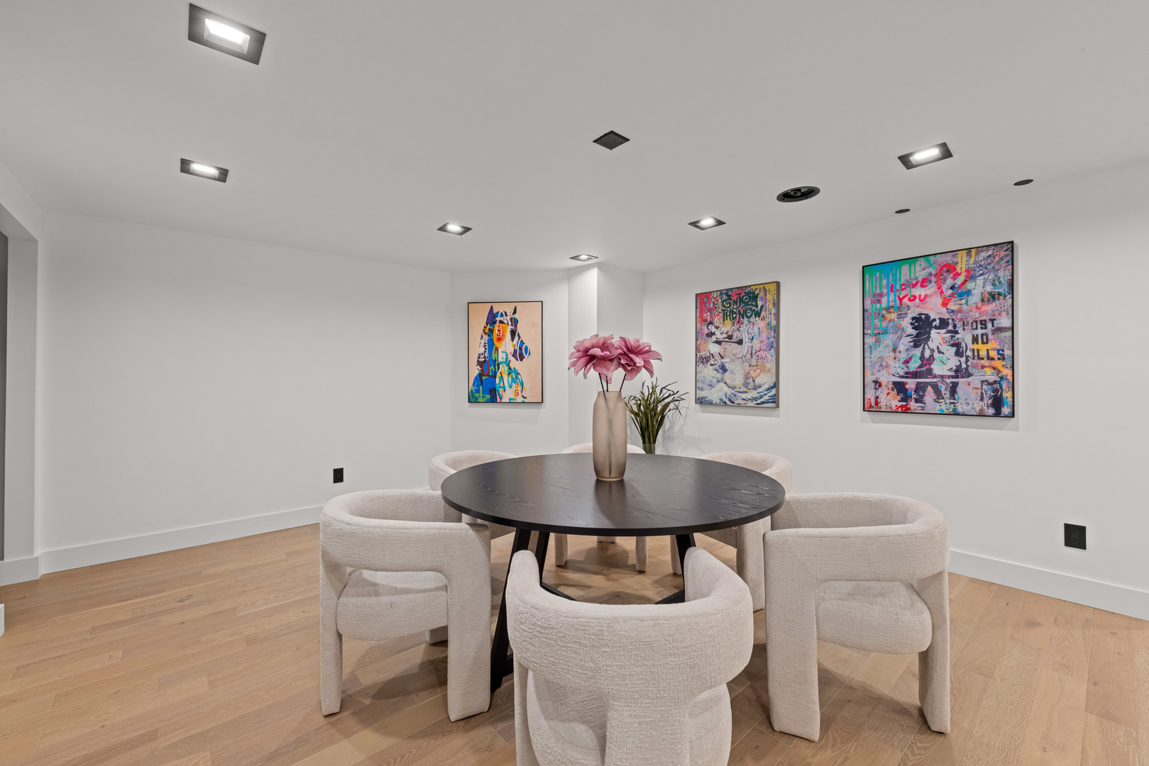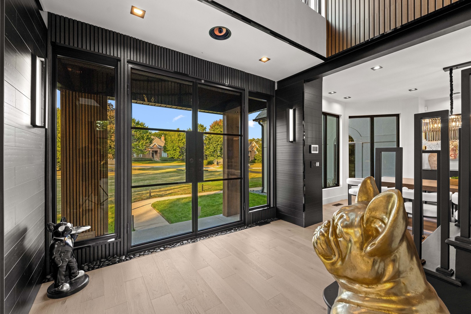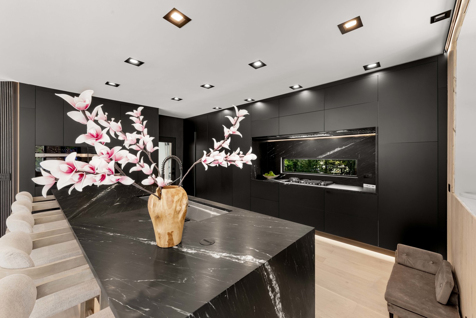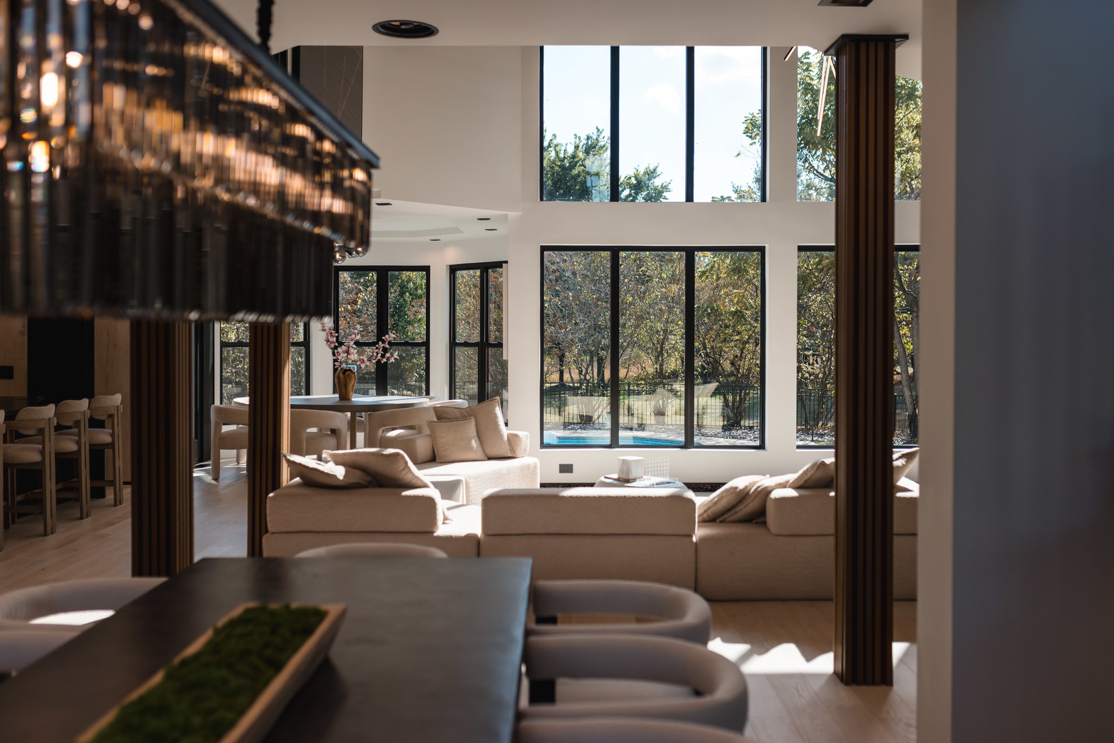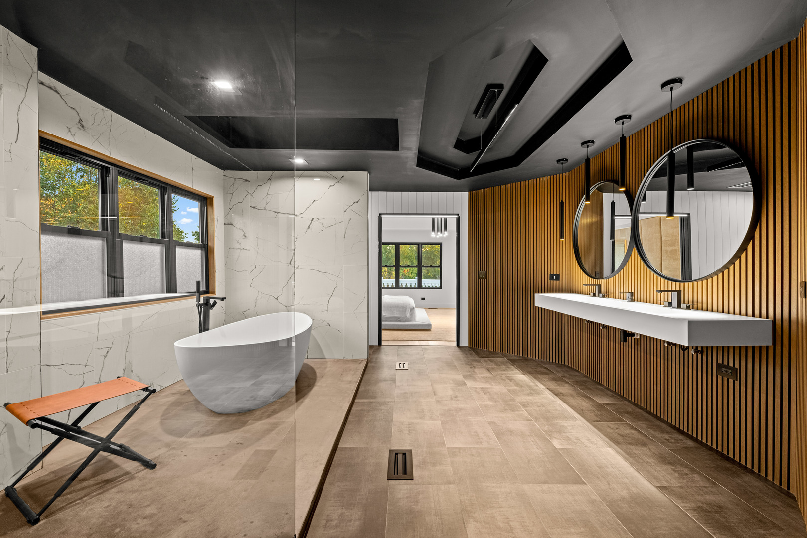 Experience the pinnacle of modern luxury living in this one of a kind custom built estate perfectly situated on a private 2.86-acre lot in the highly sought after Heritage Oaks. Every inch of this home has been thoughtfully designed with the perfect balance of sophistication, innovation, and function, offering an unmatched living experience for the most discerning buyer. As you enter through the grand custom iron and glass double doors by Pinky’s Iron Doors of California, favored by many celebrities, you are immediately greeted by a breathtaking 20 ft bamboo clad ceiling and a dramatic 40in chandelier that set the tone for what lies ahead. The open concept design flows seamlessly with white oak flooring throughout and all new black aluminum tinted windows with a wall of windows overlooking the private resort inspired backyard, filling the home with natural light and beauty. The main level showcases a striking 18 foot gas fireplace finished in custom black concrete, complemented by custom accent walls, modern LED lighting, and an integrated Klipsch in ceiling sound system. To the right of the foyer, a beautiful office or reading room features 9 foot ceilings, custom design elements, and serene views of the lush landscaping. To the left, an elegant formal dining room impresses with a smoked glass chandelier, built in cabinetry with soapstone countertops, and ample space for entertaining 12 to 14 guests.The chef’s kitchen is a true masterpiece, combining aesthetics and functionality at the highest level. The centerpiece 12 foot Brazilian matte soapstone book matched island with book matched waterfall sides and full height, matching soapstone backsplash surrounded by custom flush panel floor to ceiling cabinetry with LED lit interiors. Top of the line German appliances, a Liebherr Monolith refrigerator 2 Miele dishwashers with patented knock to open, Miele wall oven, Miele combo speed oven, Miele warming drawer, U-Line 2 drawer under counter refrigerator and a 59in commercial workstation sink make this a culinary dream. The appliances are custom paneled and integrated for a seamless modern look. The space also features a built in Samsung Frame TV and custom LED architectural lighting throughout, blending sophistication, and technology. The main level guest suite is both elegant and inviting, featuring a 92 inch all glass pivot door, 9 foot ceilings, a fireplace with black concrete surround, a custom wood accent wall with LED lighting, and expansive views of the backyard and pool. The adjoining full bath is designed with luxury materials, including a concrete shower base, in ceiling rain shower, solid stone vanity, European NewTechWood accent wall, and custom lighting. Upstairs, the primary suite is a private re treat designed for tranquility and indulgence. Vaulted ceilings, wood accent walls, and designer lighting create a serene atmosphere. The suite includes a spacious lounge area with a fireplace, a private balcony overlooking the pool and mature trees, and a spa inspired bathroom featuring a freestanding solid stone tub under a skylight, concrete shower base, floating 72 inch vanity, and NewTechWood cladding for a warm organic aesthetic. The expansive walk in closet includes custom built ins, LED lighting, and an in suite Samsung washer and dryer for added convenience. Three additional bedrooms, all with walk in closets and unique architectural details, provide ample space for family or guests. The fully finished lower level extends the luxury with bamboo flooring, custom cabinetry, LED lighting, a complete Klipsch home theater system, a dedicated gym room, and a beautifully designed bathroom with premium finishes. Step outside to your private resort. The outdoor space features a 38 foot heated lap pool with color-changing LED lighting, Trex gazebo with privacy wall, integrated lighting, and a 72 inch HEATSTRIP USA heater for year round enjoyment. Over 200 landscape lights illuminate the property’s 35 plus tons of hand