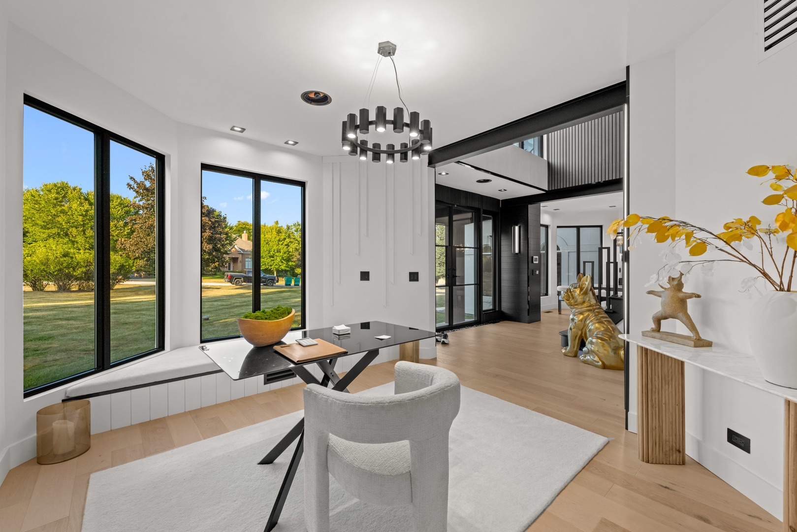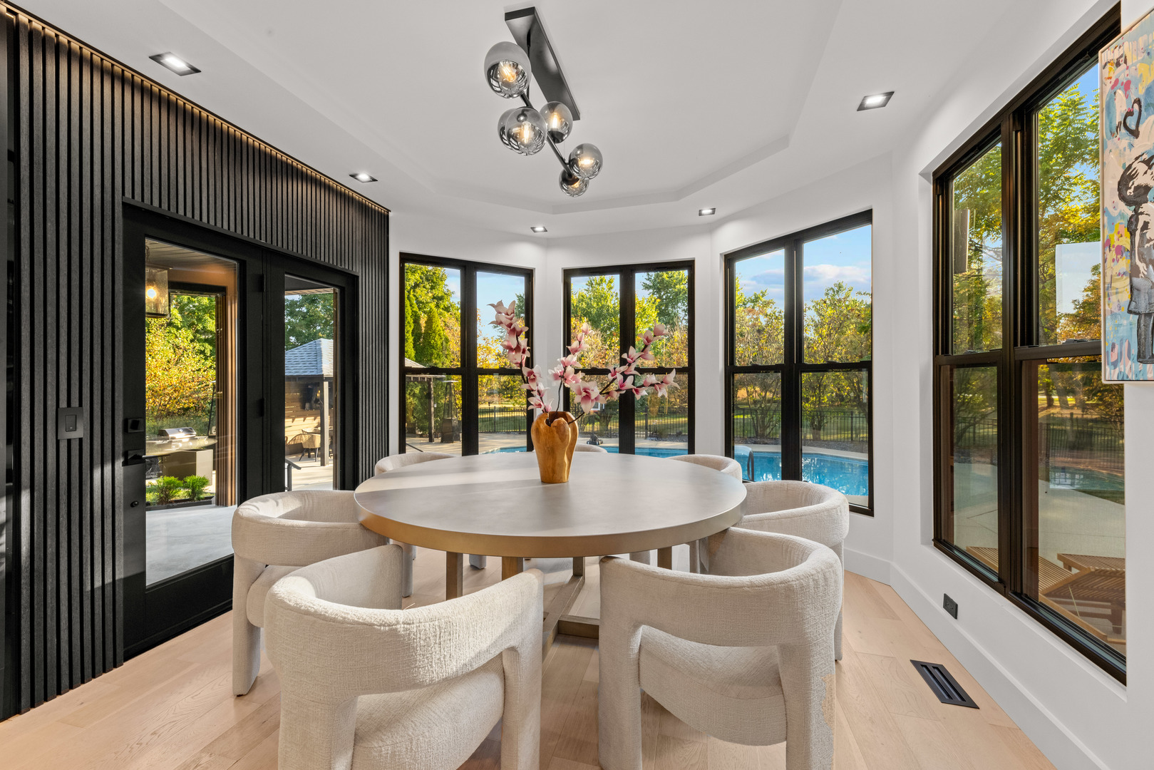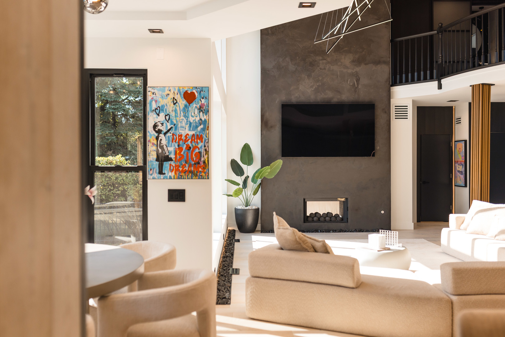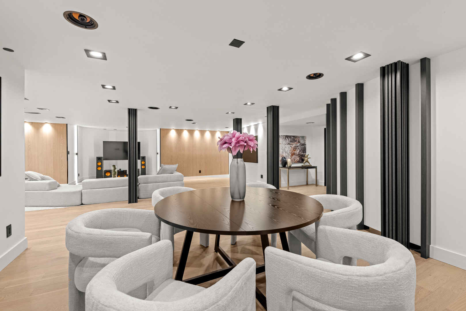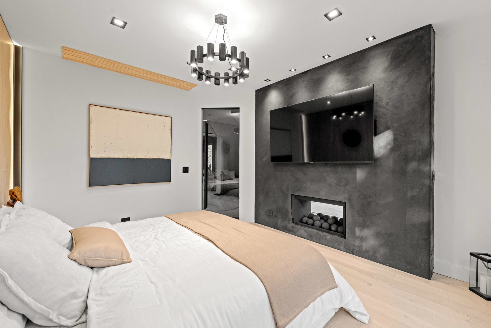Experience the pinnacle of modern luxury living in this one of a kind custom built estate perfectly situated on a private 2.86-acre lot in the highly sought after Heritage Oaks. Every inch of this home has been thoughtfully designed with the perfect balance of sophistication, innovation, and function, offering an unmatched living experience for the most discerning buyer. As you enter through the grand custom iron and glass double doors by Pinky’s Iron Doors of California, favored by many celebrities, you are immediately greeted by a breathtaking 20 ft bamboo clad ceiling and a dramatic 40in chandelier that set the tone for what lies ahead. The open concept design flows seamlessly with white oak flooring throughout and all new black aluminum tinted windows with a wall of windows overlooking the private resort inspired backyard, filling the home with natural light and beauty. The main level showcases a striking 18 foot gas fireplace finished in custom black concrete, complemented by custom accent walls, modern LED lighting, and an integrated Klipsch in ceiling sound system. To the right of the foyer, a beautiful office or reading room features 9 foot ceilings, custom design elements, and serene views of the lush landscaping. To the left, an elegant formal dining room impresses with a smoked glass chandelier, built in cabinetry with soapstone countertops, and ample space for entertaining 12 to 14 guests.The chef’s kitchen is a true masterpiece, combining aesthetics and functionality at the highest level. The centerpiece 12 foot Brazilian matte soapstone book matched island with book matched waterfall sides and full height, matching soapstone backsplash surrounded by custom flush panel floor to ceiling cabinetry with LED lit interiors. Top of the line German appliances, a Liebherr Monolith refrigerator 2 Miele dishwashers with patented knock to open, Miele wall oven, Miele combo speed oven, Miele warming drawer, U-Line 2 drawer under counter refrigerator and a 59in commercial workstation sink make this a culinary dream. The appliances are custom paneled and integrated for a seamless modern look. The space also features a built in Samsung Frame TV and custom LED architectural lighting throughout, blending sophistication, and technology. The main level guest suite is both elegant and inviting, featuring a 92 inch all glass pivot door, 9 foot ceilings, a fireplace with black concrete surround, a custom wood accent wall with LED lighting, and expansive views of the backyard and pool. The adjoining full bath is designed with luxury materials, including a concrete shower base, in ceiling rain shower, solid stone vanity, European NewTechWood accent wall, and custom lighting. Upstairs, the primary suite is a private re treat designed for tranquility and indulgence. Vaulted ceilings, wood accent walls, and designer lighting create a serene atmosphere. The suite includes a spacious lounge area with a fireplace, a private balcony overlooking the pool and mature trees, and a spa inspired bathroom featuring a freestanding solid stone tub under a skylight, concrete shower base, floating 72 inch vanity, and NewTechWood cladding for a warm organic aesthetic. The expansive walk in closet includes custom built ins, LED lighting, and an in suite Samsung washer and dryer for added convenience. Three additional bedrooms, all with walk in closets and unique architectural details, provide ample space for family or guests. The fully finished lower level extends the luxury with bamboo flooring, custom cabinetry, LED lighting, a complete Klipsch home theater system, a dedicated gym room, and a beautifully designed bathroom with premium finishes. Step outside to your private resort. The outdoor space features a 38 foot heated lap pool with color-changing LED lighting, Trex gazebo with privacy wall, integrated lighting, and a 72 inch HEATSTRIP USA heater for year round enjoyment. Over 200 landscape lights illuminate the property’s 35 plus tons of hand