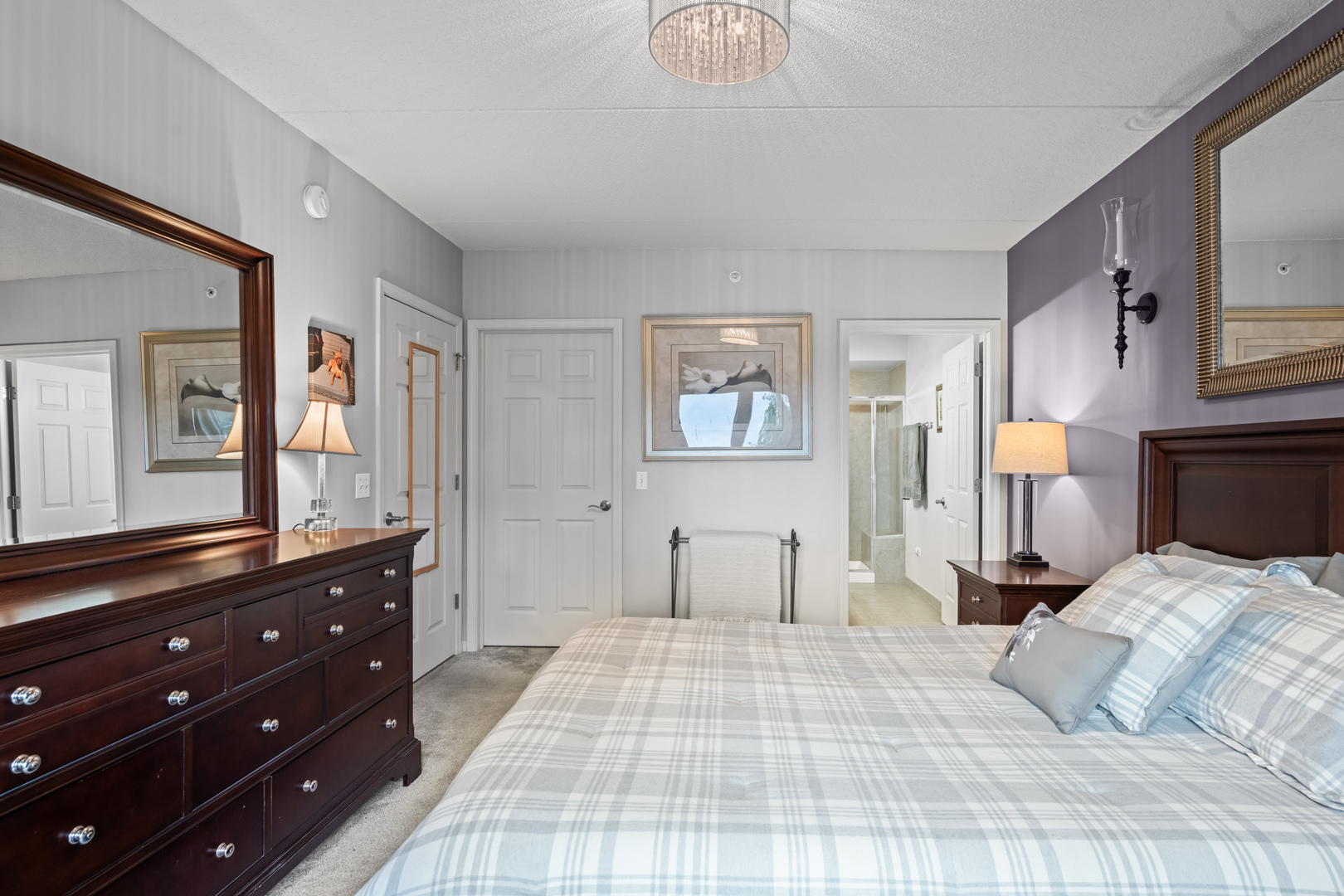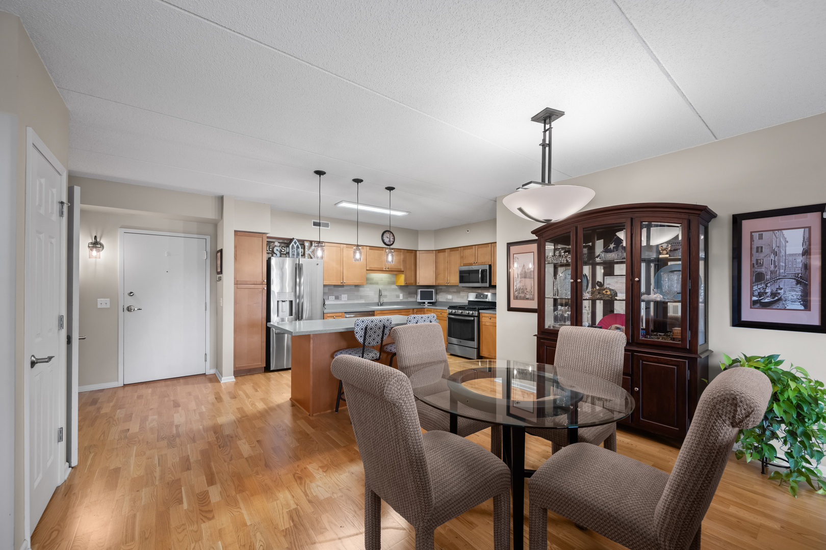 Bright and Spacious 2 Bed / 2 Bath + Den Condo in the Heart of Downtown Des Plaines. Enjoy open-concept living in this beautifully maintained condo featuring a smart split-bedroom layout and modern upgrades throughout. The kitchen impresses with 42″ maple cabinets, Corian countertops, stainless steel appliances, touchless faucet, a center island with a 12″ breakfast bar overhang, pendant lighting, roll-out shelving, and a wine fridge-perfect for entertaining or everyday living. The generous living room opens to a large west-facing patio, ideal for relaxing in the afternoon sun or enjoying stunning sunsets. Gleaming wood floors, radiant heat, and abundant natural light add warmth and comfort. The expansive primary suite offers a walk-in closet and bath with a step-in ceramic tile shower, built-in seat, and overhead lighting. Great Den with French doors for work from home/or extra bedroom. A separate laundry room includes a side-by-side washer (New) and dryer. Additional details include white six-panel doors with matching trim, stainless steel fixtures, and wire-shelved closets throughout. This pet-friendly, owner-occupied elevator building offers heated garage parking with storage room, plus ample guest and secondary parking behind the building. Security cameras provide added peace of mind. Unbeatable location-just steps from the Metra UP-Northwest Line, Pace Bus, restaurants, the library, and the newly renovated Des Plaines Theater. Quick access to I-294 and O’Hare Airport makes commuting effortless.