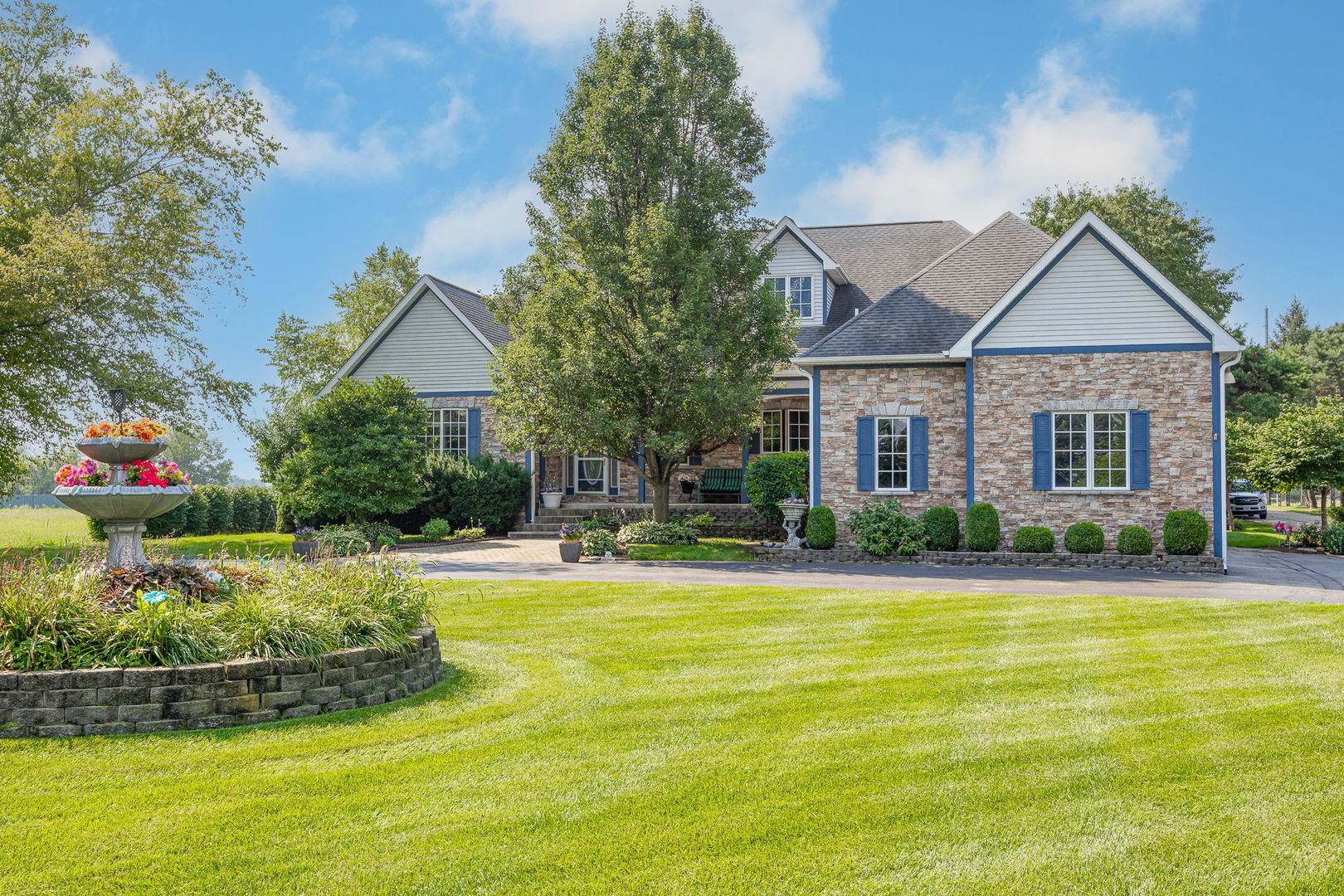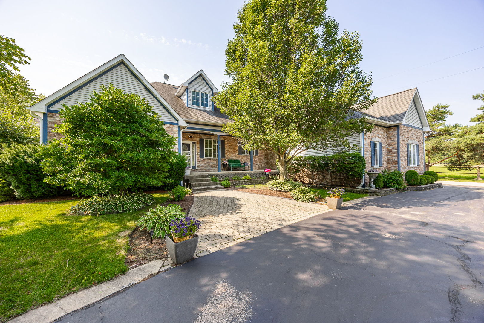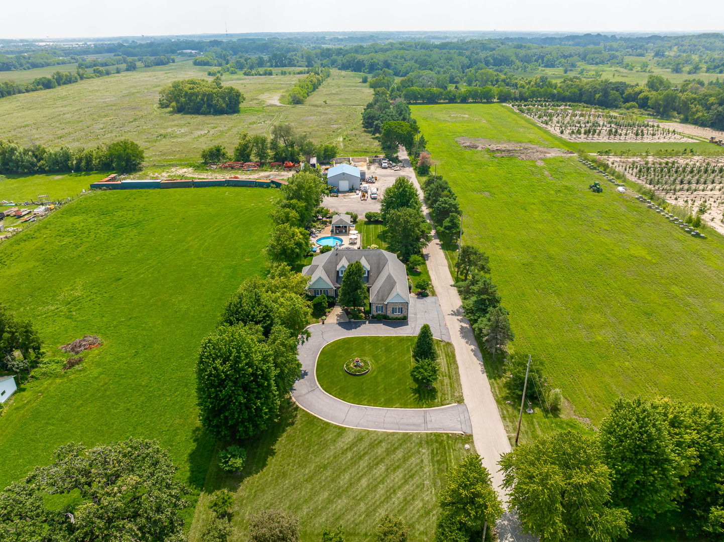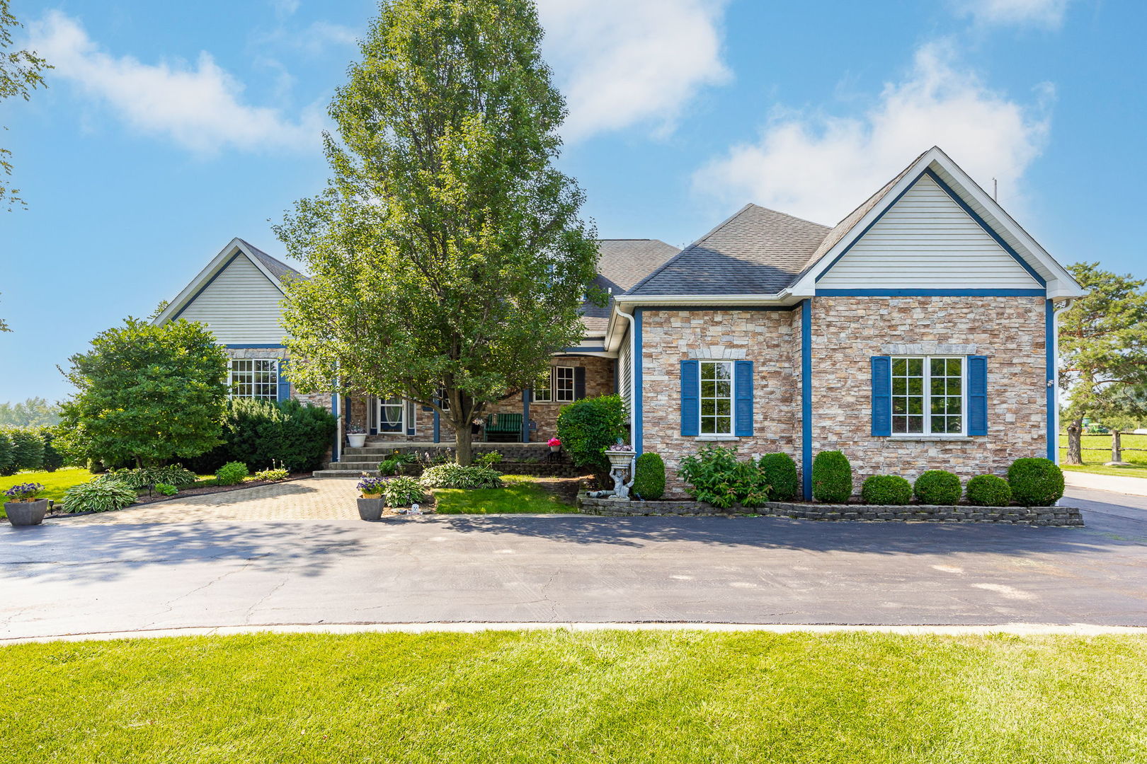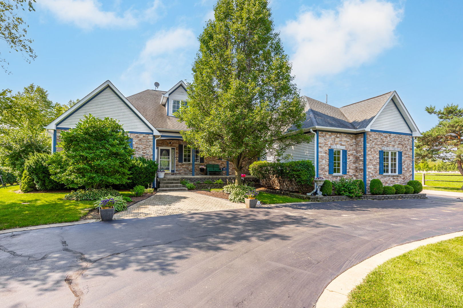 Escape to your own private sanctuary set on over 2 acres of peaceful land. Tucked away beyond a private driveway and elegant circular entrance, this exquisite custom-built brick ranch is perfectly nestled on a sprawling rural lot, embraced by a tranquil forest preserve and a picturesque tree farm. Whether you envision serene country living or require ample space for a home-based business, this exceptional property offers it all including a substantial pole barn with generous room for equipment, recreational vehicles, or prized collections. The expansive grounds open up endless possibilities for multi-use living, recreation, or expansion. Step inside and be captivated by soaring cathedral ceilings and striking exposed wood beams in the great room, where rustic charm meets refined design. The heart of the home boasts a spacious, well-appointed chef’s kitchen designed for both functionality and effortless entertaining. Gleaming hardwood floors, strategically placed overstory windows, and a wealth of natural light flow seamlessly throughout, enhancing the warmth and elegance of every room. The main level is thoughtfully designed with two luxurious primary suites, each featuring their own inspired spa baths, a cozy fireplace and custom walk-in closets ideal for multi-generational living or hosting with sophistication and comfort. A third bedroom, complete with its own private en-suite bath, offers an inviting retreat for guests. Built-in shelving adds tasteful charm and convenience to the home’s overall aesthetic. Through glass French doors, extend your living experience into a beautifully enclosed Florida/Sun Room with heated floors-an all-season escape. Entertain in style or unwind in the fully finished lower level, a true extension of the home’s luxurious living space. Featuring a full bar, kitchenette, heated floors, a stylish tiled fireplace, additional bedroom, and full bathroom, this space provides exceptional versatility perfectly suited for an in-law suite or a private haven for a family member seeking independence. Outdoors, enjoy a sweeping brick paver patio with a built-in grill, ideal for al fresco dining and entertaining. Take a dip in the sparkling in-ground pool, retreat to your private pool house, or find peace in the calming sounds of your own waterfall pond. Completing this extraordinary offering is a heated three-car garage, combining practicality with luxury. This is more than a home it’s an experience. A destination where refined rustic, comfort, and versatility converge to create resort-style living at its finest. Located in a quiet neighborhood with walking trails, parks, and just minutes from I-90, shopping, and dining.