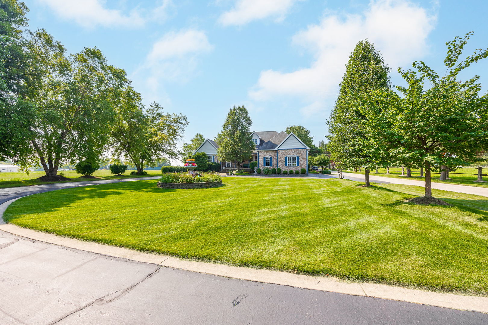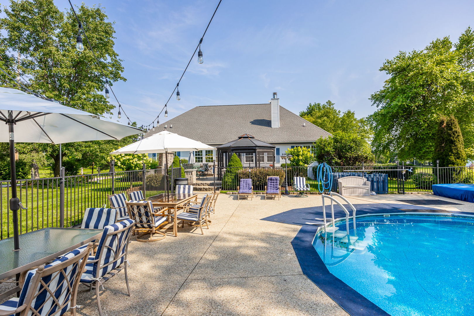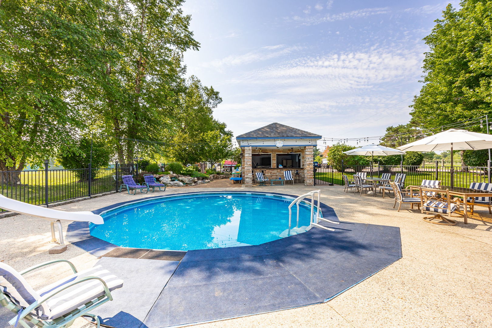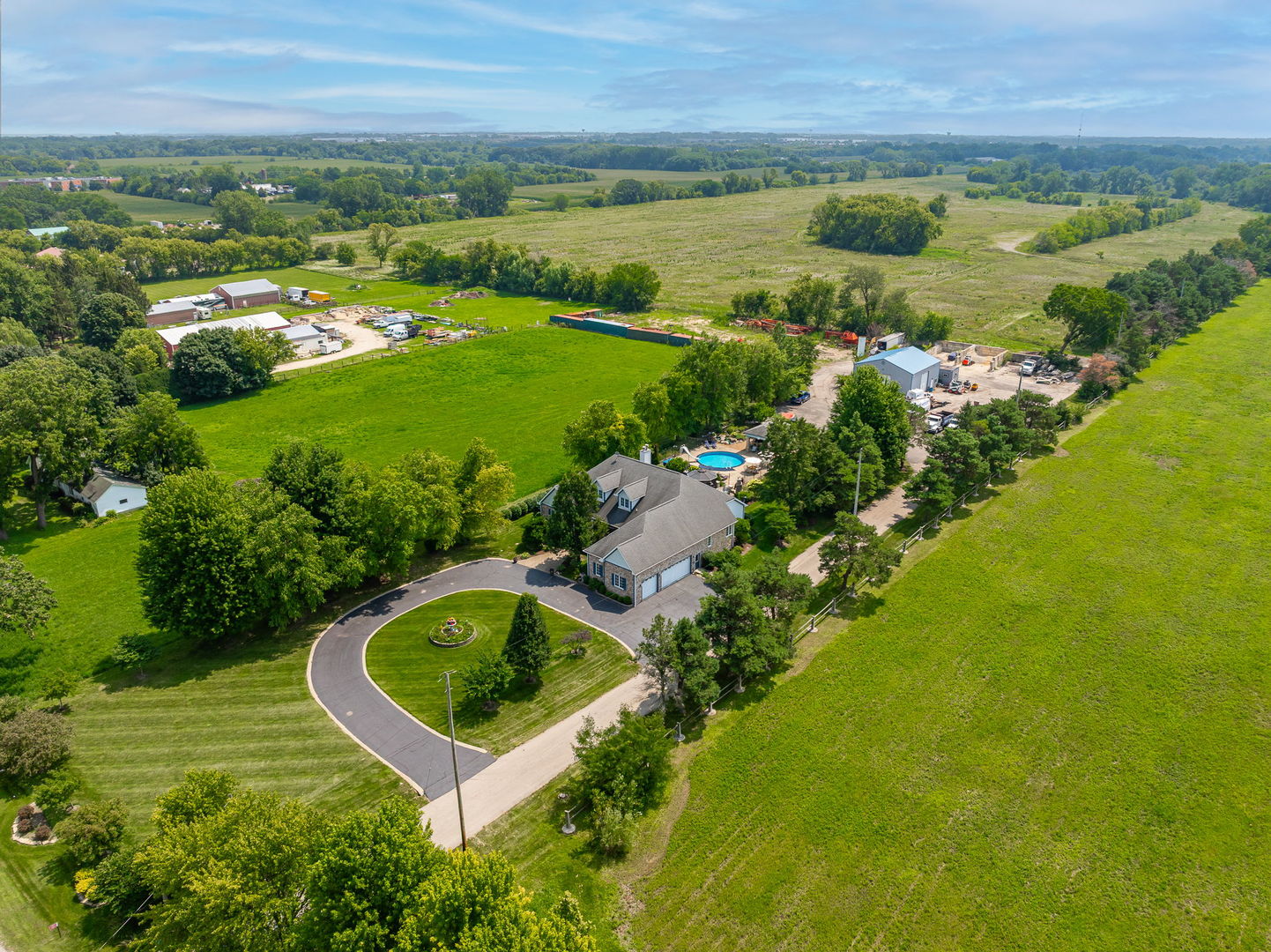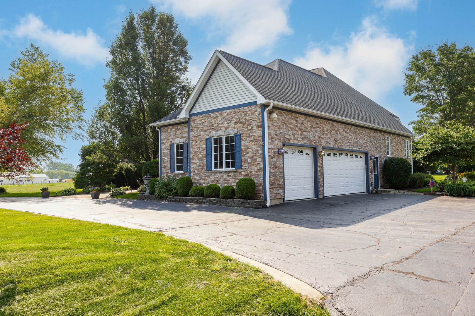 Escape to your own private sanctuary set on over 2 acres of peaceful land. Tucked away beyond a private driveway and elegant circular entrance, this exquisite custom-built brick ranch is perfectly nestled on a sprawling rural lot, embraced by a tranquil forest preserve and a picturesque tree farm. Whether you envision serene country living or require ample space for a home-based business, this exceptional property offers it all including a substantial pole barn with generous room for equipment, recreational vehicles, or prized collections. The expansive grounds open up endless possibilities for multi-use living, recreation, or expansion. Step inside and be captivated by soaring cathedral ceilings and striking exposed wood beams in the great room, where rustic charm meets refined design. The heart of the home boasts a spacious, well-appointed chef’s kitchen designed for both functionality and effortless entertaining. Gleaming hardwood floors, strategically placed overstory windows, and a wealth of natural light flow seamlessly throughout, enhancing the warmth and elegance of every room. The main level is thoughtfully designed with two luxurious primary suites, each featuring their own inspired spa baths, a cozy fireplace and custom walk-in closets ideal for multi-generational living or hosting with sophistication and comfort. A third bedroom, complete with its own private en-suite bath, offers an inviting retreat for guests. Built-in shelving adds tasteful charm and convenience to the home’s overall aesthetic. Through glass French doors, extend your living experience into a beautifully enclosed Florida/Sun Room with heated floors-an all-season escape. Entertain in style or unwind in the fully finished lower level, a true extension of the home’s luxurious living space. Featuring a full bar, kitchenette, heated floors, a stylish tiled fireplace, additional bedroom, and full bathroom, this space provides exceptional versatility perfectly suited for an in-law suite or a private haven for a family member seeking independence. Outdoors, enjoy a sweeping brick paver patio with a built-in grill, ideal for al fresco dining and entertaining. Take a dip in the sparkling in-ground pool, retreat to your private pool house, or find peace in the calming sounds of your own waterfall pond. Completing this extraordinary offering is a heated three-car garage, combining practicality with luxury. This is more than a home it’s an experience. A destination where refined rustic, comfort, and versatility converge to create resort-style living at its finest. Located in a quiet neighborhood with walking trails, parks, and just minutes from I-90, shopping, and dining.