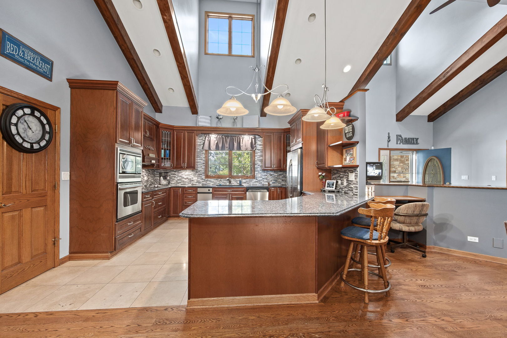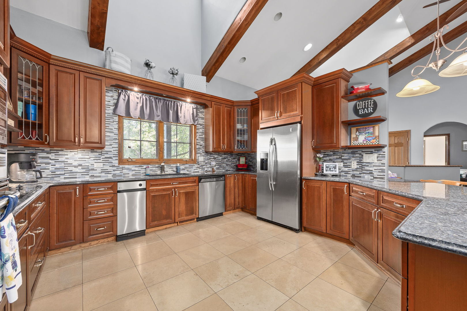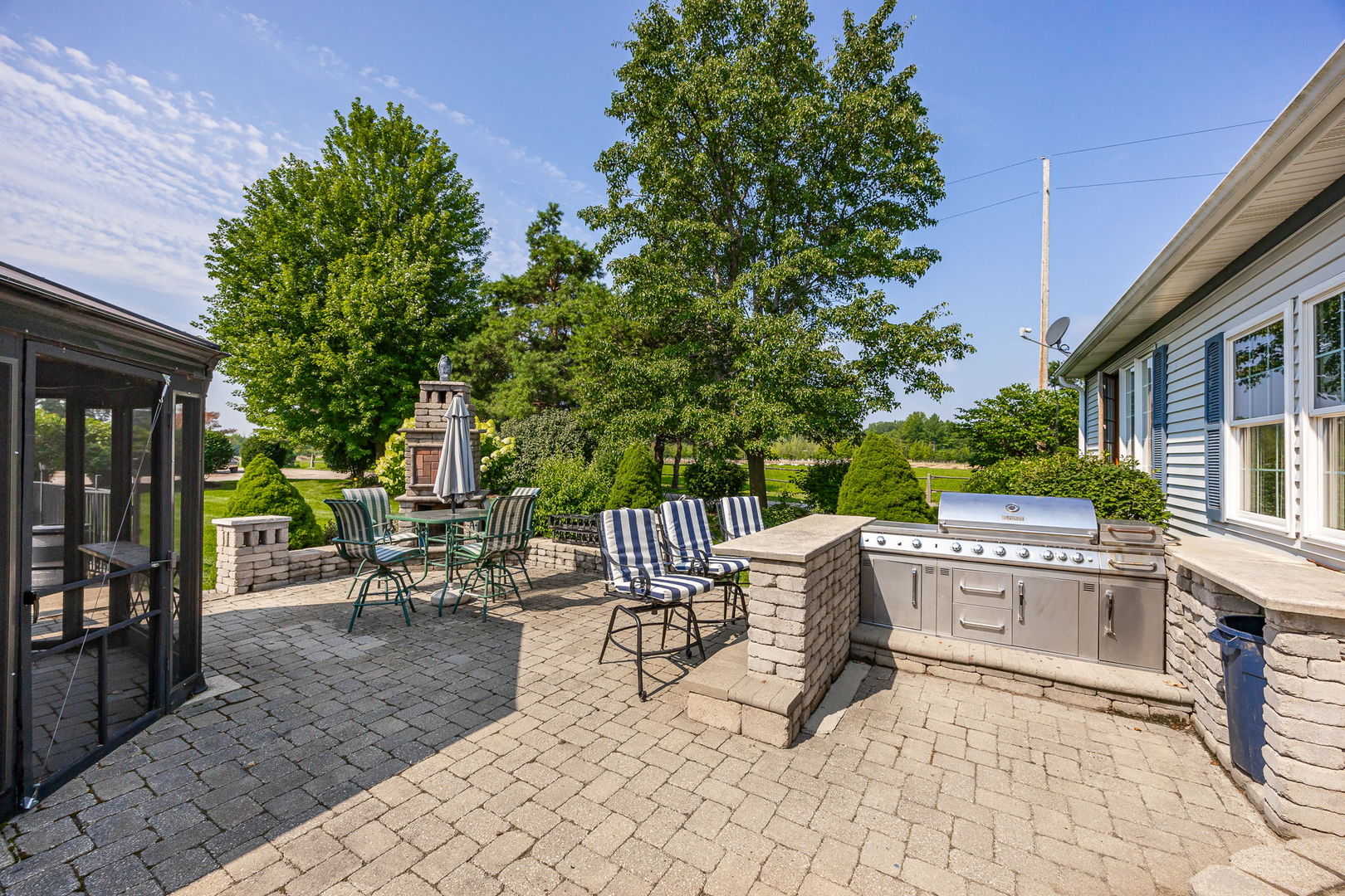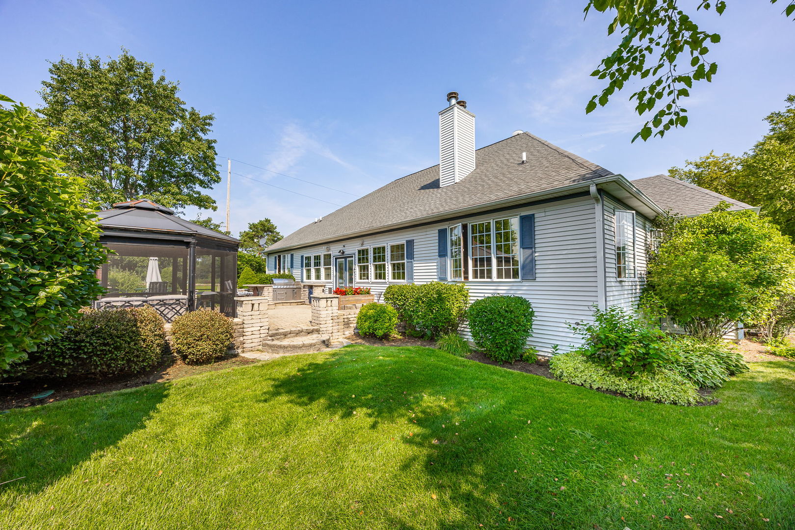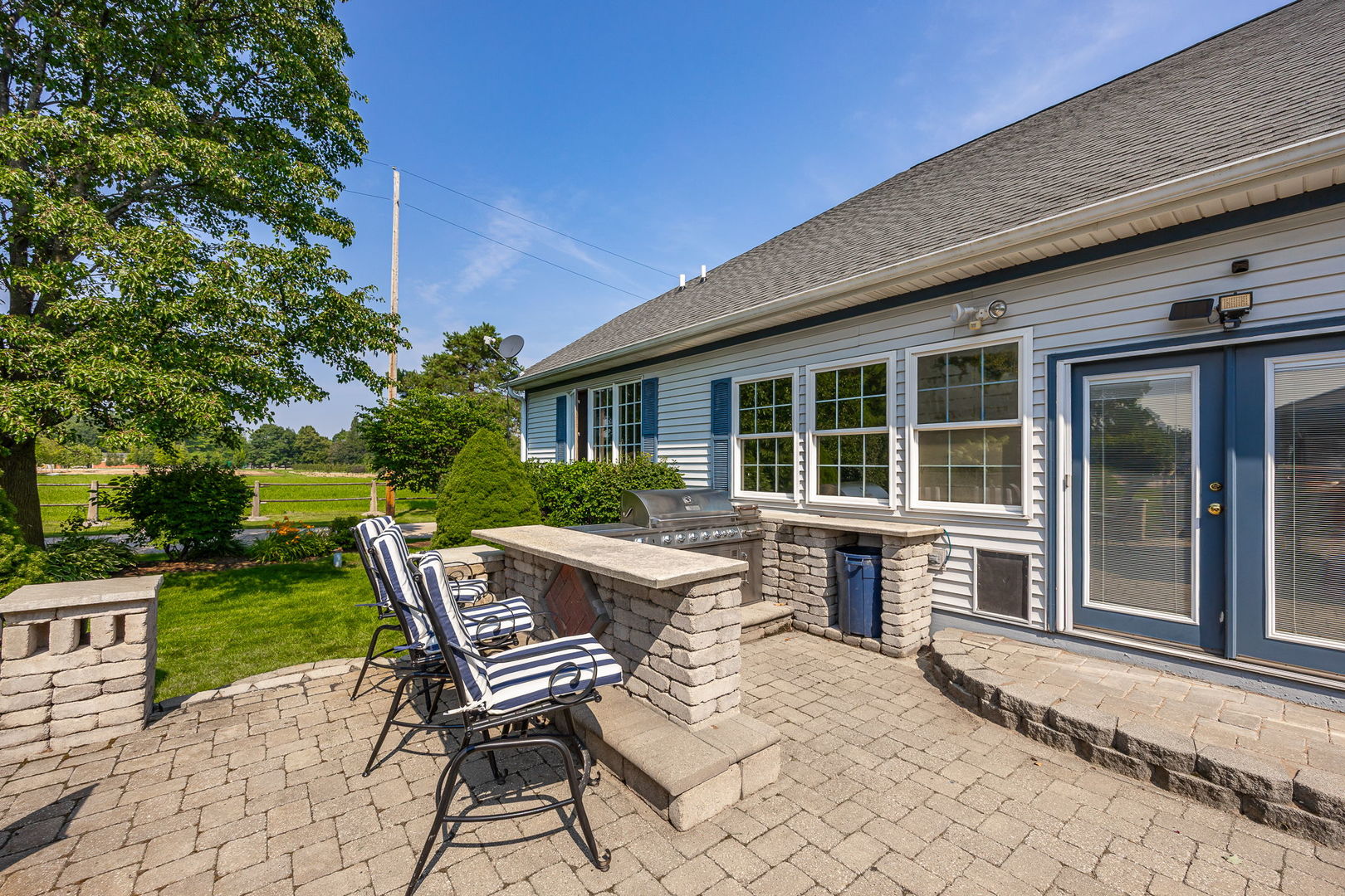Escape to your own private sanctuary set on over 2 acres of peaceful land. Tucked away beyond a private driveway and elegant circular entrance, this exquisite custom-built brick ranch is perfectly nestled on a sprawling rural lot, embraced by a tranquil forest preserve and a picturesque tree farm. Whether you envision serene country living or require ample space for a home-based business, this exceptional property offers it all including a substantial pole barn with generous room for equipment, recreational vehicles, or prized collections. The expansive grounds open up endless possibilities for multi-use living, recreation, or expansion. Step inside and be captivated by soaring cathedral ceilings and striking exposed wood beams in the great room, where rustic charm meets refined design. The heart of the home boasts a spacious, well-appointed chef’s kitchen designed for both functionality and effortless entertaining. Gleaming hardwood floors, strategically placed overstory windows, and a wealth of natural light flow seamlessly throughout, enhancing the warmth and elegance of every room. The main level is thoughtfully designed with two luxurious primary suites, each featuring their own inspired spa baths, a cozy fireplace and custom walk-in closets ideal for multi-generational living or hosting with sophistication and comfort. A third bedroom, complete with its own private en-suite bath, offers an inviting retreat for guests. Built-in shelving adds tasteful charm and convenience to the home’s overall aesthetic. Through glass French doors, extend your living experience into a beautifully enclosed Florida/Sun Room with heated floors-an all-season escape. Entertain in style or unwind in the fully finished lower level, a true extension of the home’s luxurious living space. Featuring a full bar, kitchenette, heated floors, a stylish tiled fireplace, additional bedroom, and full bathroom, this space provides exceptional versatility perfectly suited for an in-law suite or a private haven for a family member seeking independence. Outdoors, enjoy a sweeping brick paver patio with a built-in grill, ideal for al fresco dining and entertaining. Take a dip in the sparkling in-ground pool, retreat to your private pool house, or find peace in the calming sounds of your own waterfall pond. Completing this extraordinary offering is a heated three-car garage, combining practicality with luxury. This is more than a home it’s an experience. A destination where refined rustic, comfort, and versatility converge to create resort-style living at its finest. Located in a quiet neighborhood with walking trails, parks, and just minutes from I-90, shopping, and dining.