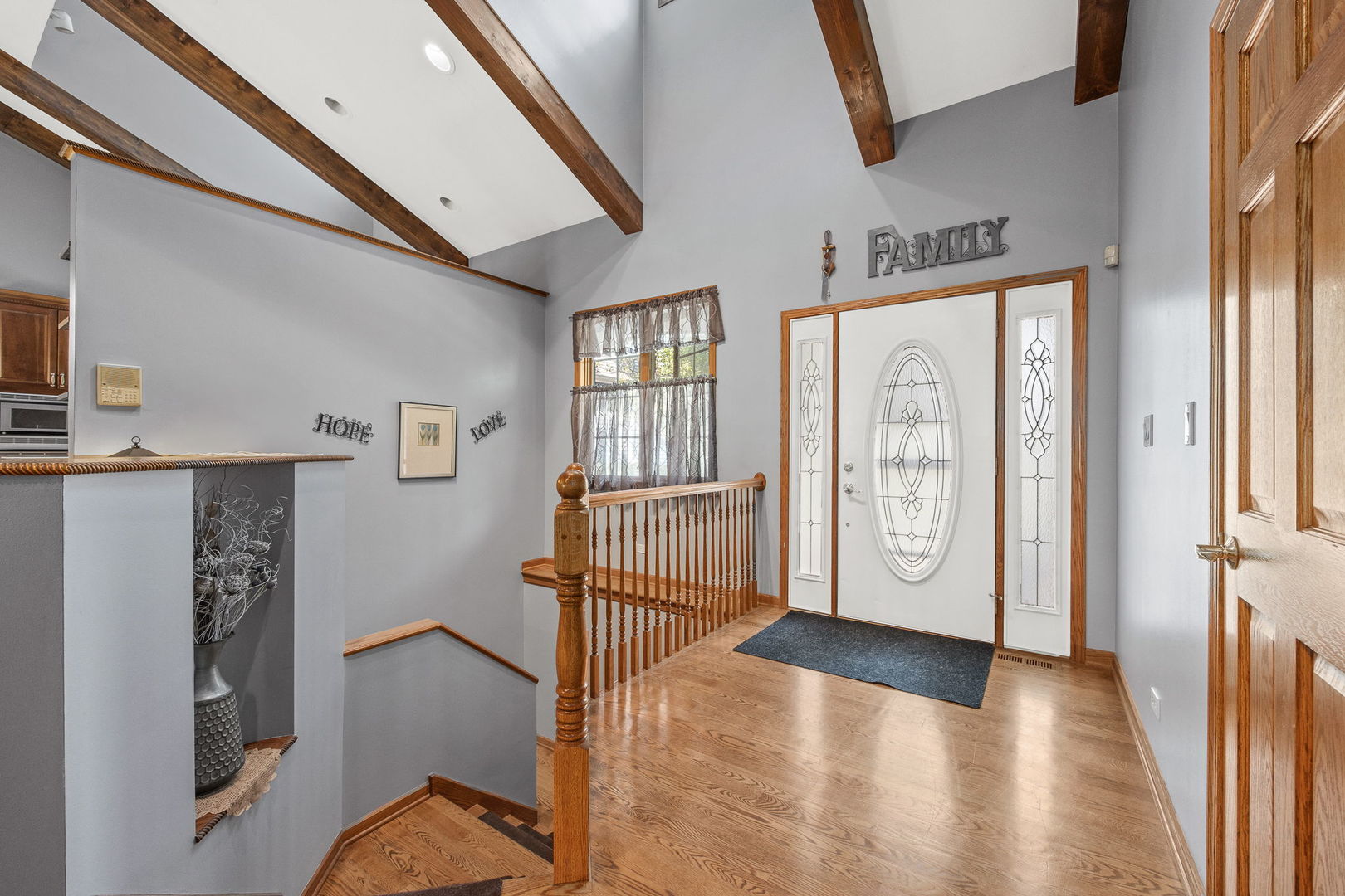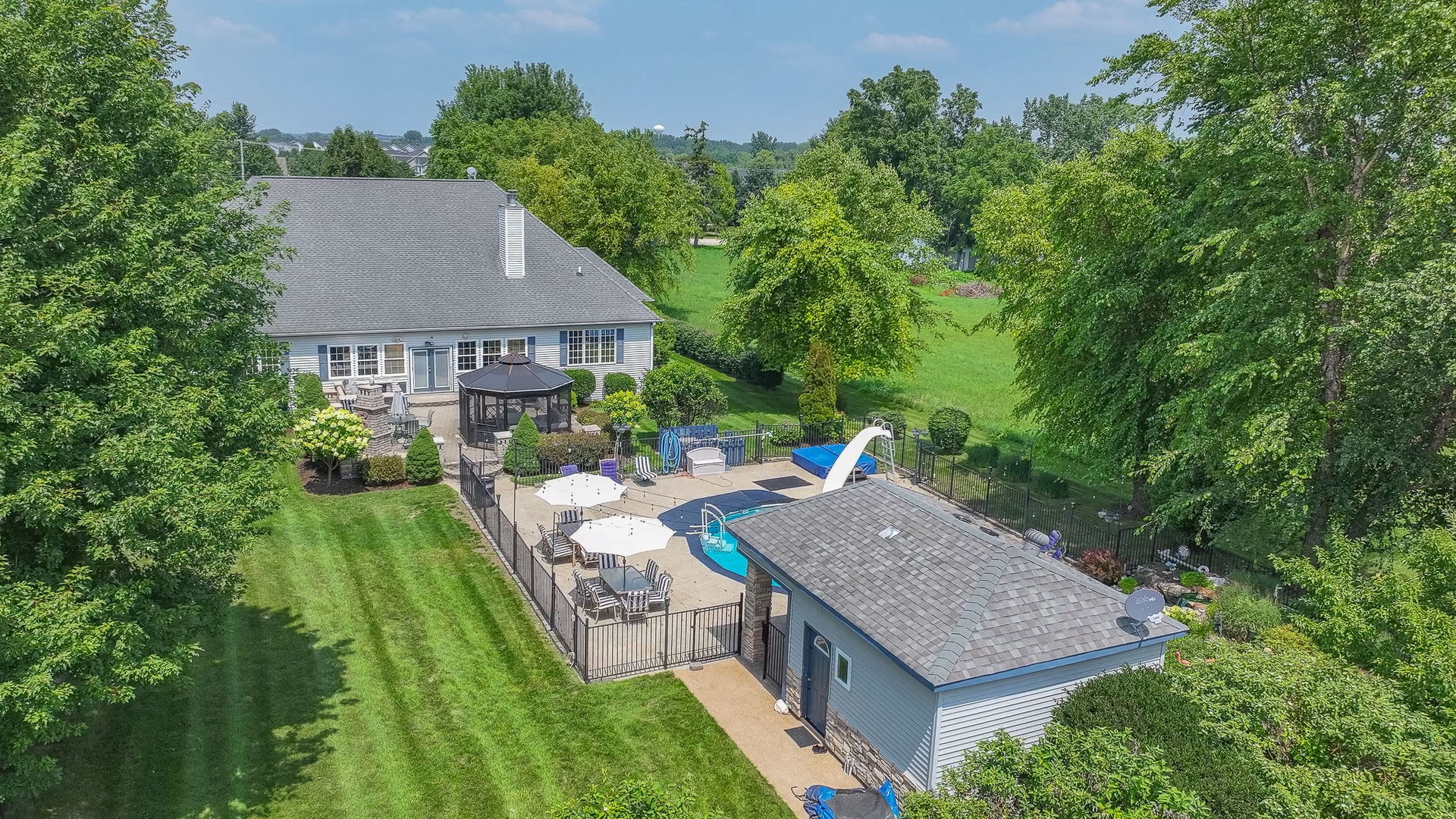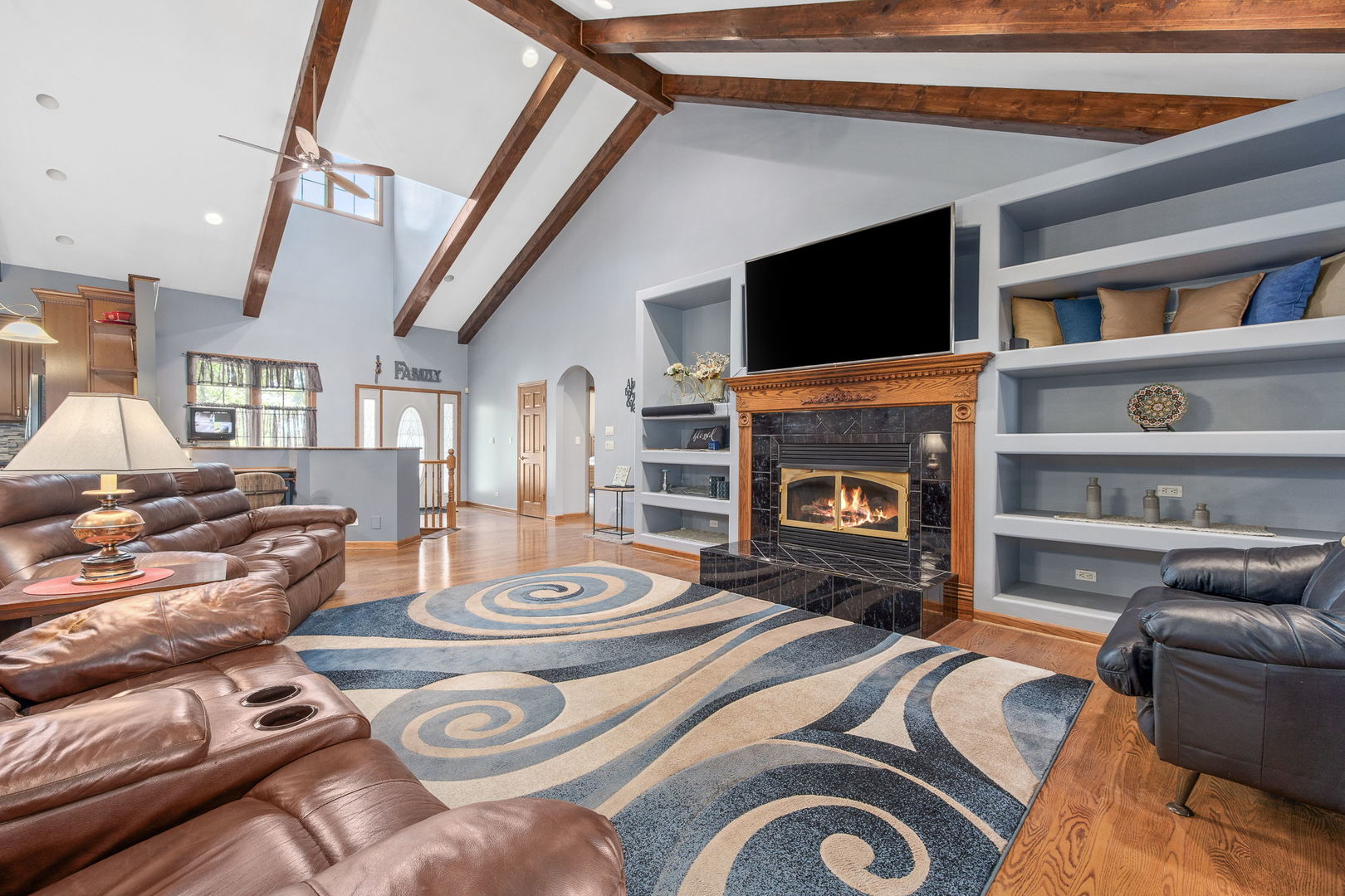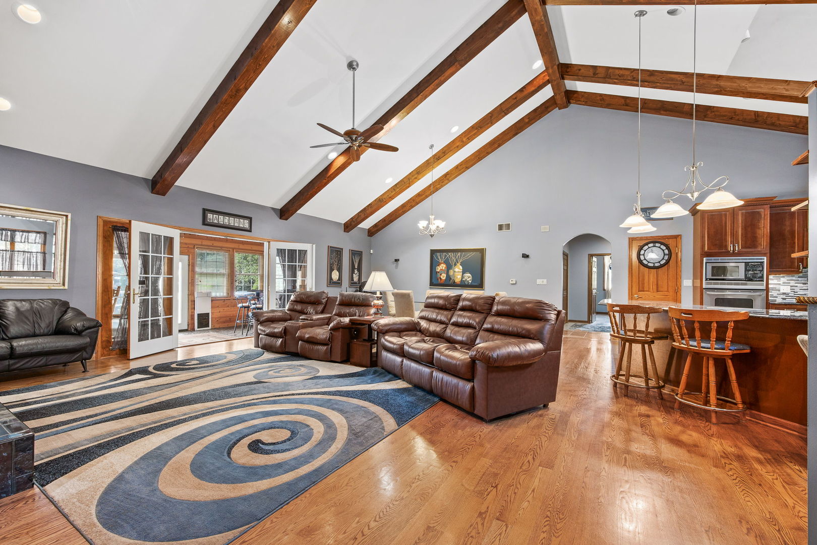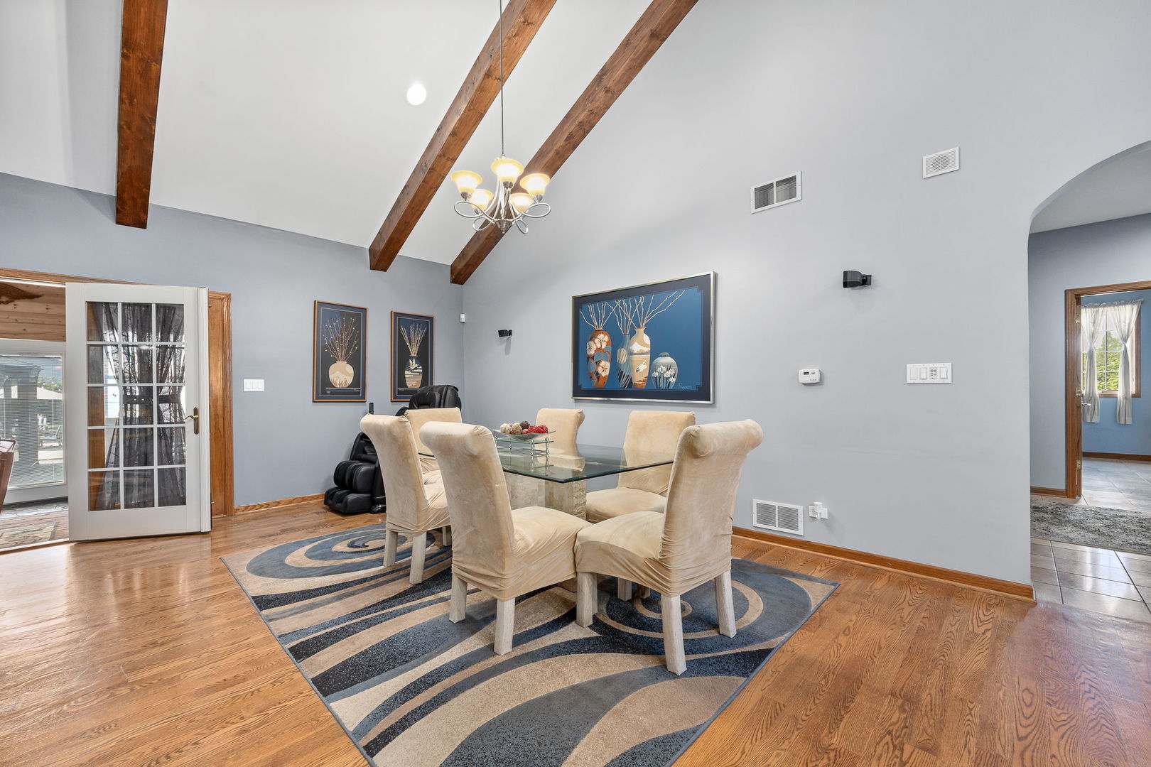 Escape to your own private sanctuary set on over 2 acres of peaceful land. Tucked away beyond a private driveway and elegant circular entrance, this exquisite custom-built brick ranch is perfectly nestled on a sprawling rural lot, embraced by a tranquil forest preserve and a picturesque tree farm. Whether you envision serene country living or require ample space for a home-based business, this exceptional property offers it all including a substantial pole barn with generous room for equipment, recreational vehicles, or prized collections. The expansive grounds open up endless possibilities for multi-use living, recreation, or expansion. Step inside and be captivated by soaring cathedral ceilings and striking exposed wood beams in the great room, where rustic charm meets refined design. The heart of the home boasts a spacious, well-appointed chef’s kitchen designed for both functionality and effortless entertaining. Gleaming hardwood floors, strategically placed overstory windows, and a wealth of natural light flow seamlessly throughout, enhancing the warmth and elegance of every room. The main level is thoughtfully designed with two luxurious primary suites, each featuring their own inspired spa baths, a cozy fireplace and custom walk-in closets ideal for multi-generational living or hosting with sophistication and comfort. A third bedroom, complete with its own private en-suite bath, offers an inviting retreat for guests. Built-in shelving adds tasteful charm and convenience to the home’s overall aesthetic. Through glass French doors, extend your living experience into a beautifully enclosed Florida/Sun Room with heated floors-an all-season escape. Entertain in style or unwind in the fully finished lower level, a true extension of the home’s luxurious living space. Featuring a full bar, kitchenette, heated floors, a stylish tiled fireplace, additional bedroom, and full bathroom, this space provides exceptional versatility perfectly suited for an in-law suite or a private haven for a family member seeking independence. Outdoors, enjoy a sweeping brick paver patio with a built-in grill, ideal for al fresco dining and entertaining. Take a dip in the sparkling in-ground pool, retreat to your private pool house, or find peace in the calming sounds of your own waterfall pond. Completing this extraordinary offering is a heated three-car garage, combining practicality with luxury. This is more than a home it’s an experience. A destination where refined rustic, comfort, and versatility converge to create resort-style living at its finest. Located in a quiet neighborhood with walking trails, parks, and just minutes from I-90, shopping, and dining.