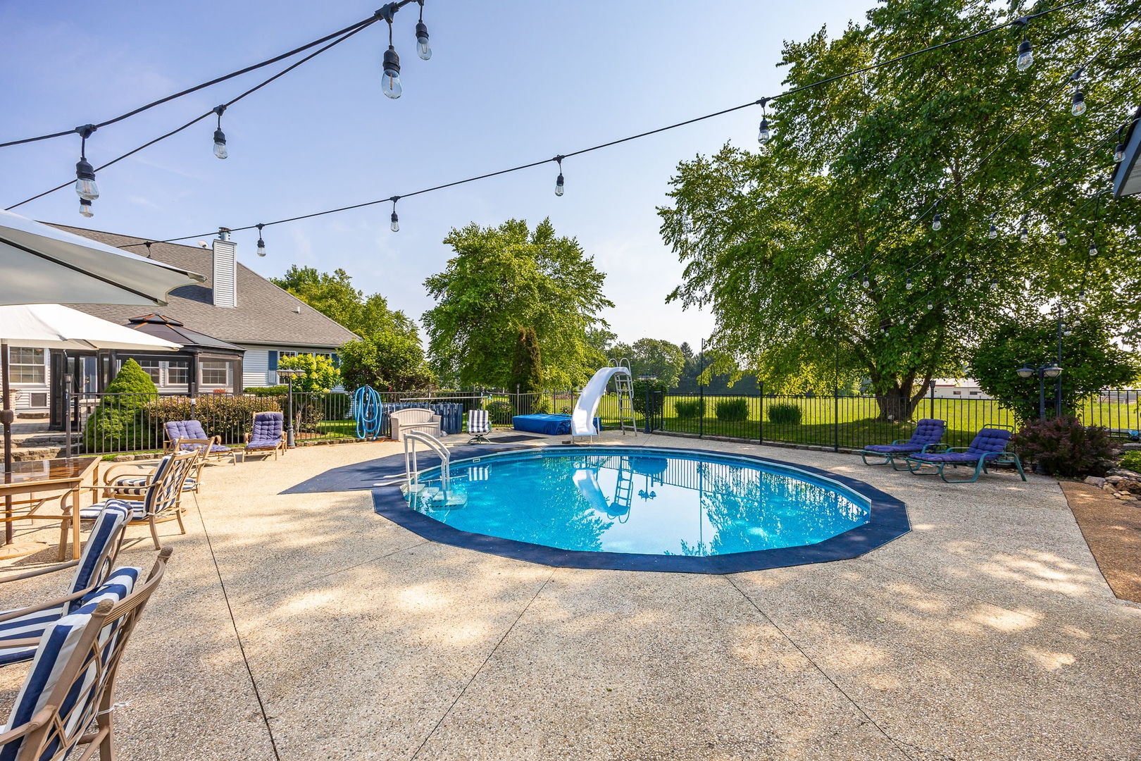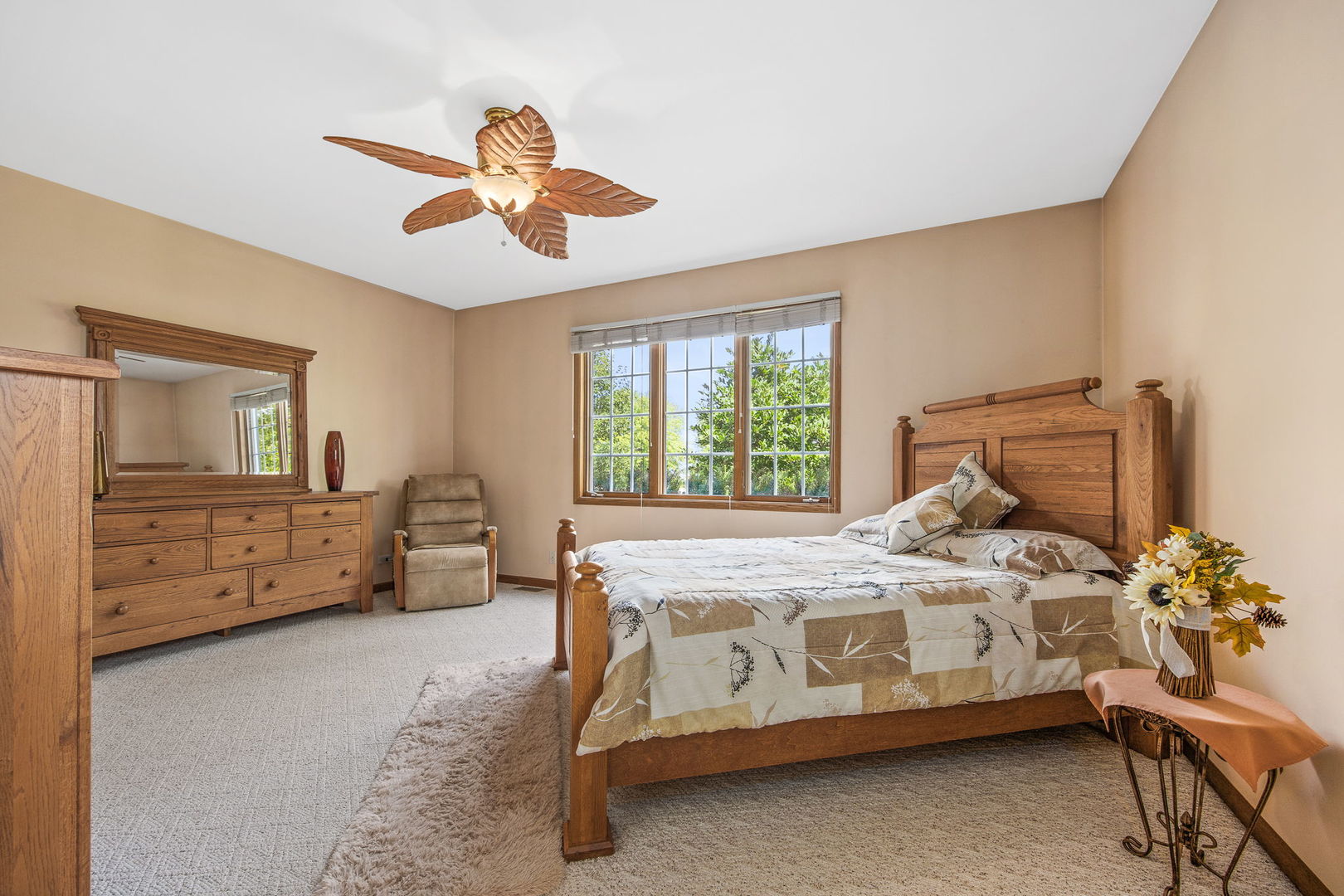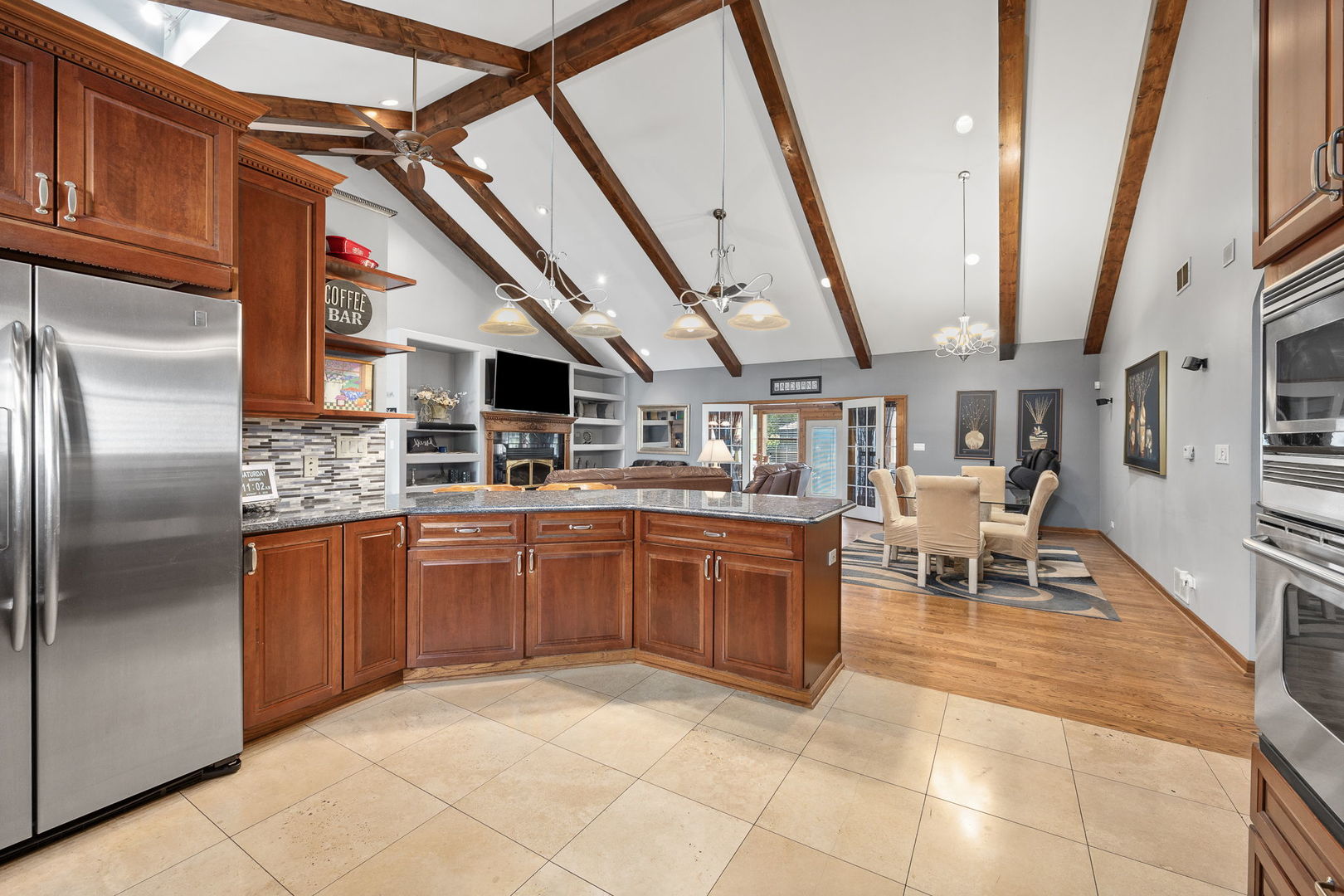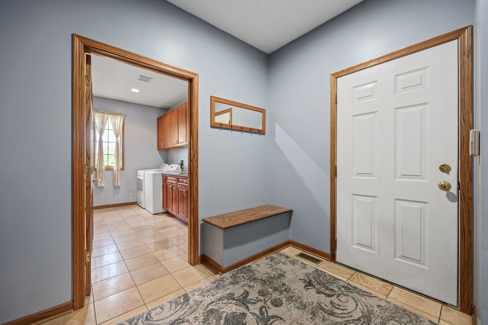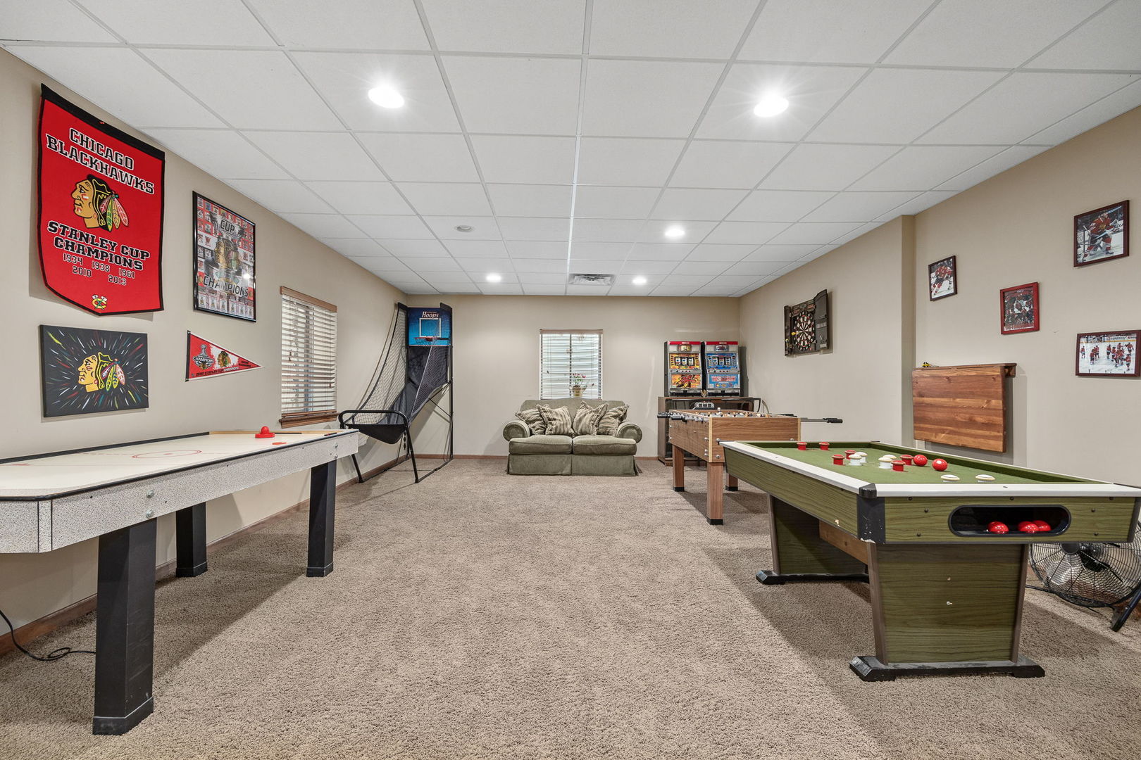Escape to your own private sanctuary set on over 2 acres of peaceful land. Tucked away beyond a private driveway and elegant circular entrance, this exquisite custom-built brick ranch is perfectly nestled on a sprawling rural lot, embraced by a tranquil forest preserve and a picturesque tree farm. Whether you envision serene country living or require ample space for a home-based business, this exceptional property offers it all including a substantial pole barn with generous room for equipment, recreational vehicles, or prized collections. The expansive grounds open up endless possibilities for multi-use living, recreation, or expansion. Step inside and be captivated by soaring cathedral ceilings and striking exposed wood beams in the great room, where rustic charm meets refined design. The heart of the home boasts a spacious, well-appointed chef’s kitchen designed for both functionality and effortless entertaining. Gleaming hardwood floors, strategically placed overstory windows, and a wealth of natural light flow seamlessly throughout, enhancing the warmth and elegance of every room. The main level is thoughtfully designed with two luxurious primary suites, each featuring their own inspired spa baths, a cozy fireplace and custom walk-in closets ideal for multi-generational living or hosting with sophistication and comfort. A third bedroom, complete with its own private en-suite bath, offers an inviting retreat for guests. Built-in shelving adds tasteful charm and convenience to the home’s overall aesthetic. Through glass French doors, extend your living experience into a beautifully enclosed Florida/Sun Room with heated floors-an all-season escape. Entertain in style or unwind in the fully finished lower level, a true extension of the home’s luxurious living space. Featuring a full bar, kitchenette, heated floors, a stylish tiled fireplace, additional bedroom, and full bathroom, this space provides exceptional versatility perfectly suited for an in-law suite or a private haven for a family member seeking independence. Outdoors, enjoy a sweeping brick paver patio with a built-in grill, ideal for al fresco dining and entertaining. Take a dip in the sparkling in-ground pool, retreat to your private pool house, or find peace in the calming sounds of your own waterfall pond. Completing this extraordinary offering is a heated three-car garage, combining practicality with luxury. This is more than a home it’s an experience. A destination where refined rustic, comfort, and versatility converge to create resort-style living at its finest. Located in a quiet neighborhood with walking trails, parks, and just minutes from I-90, shopping, and dining.