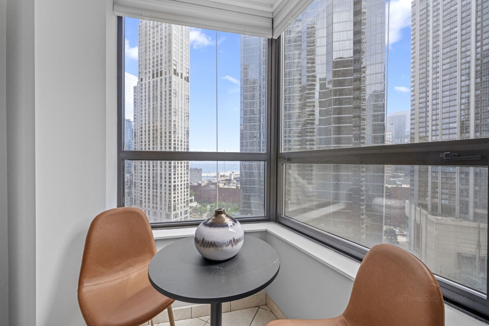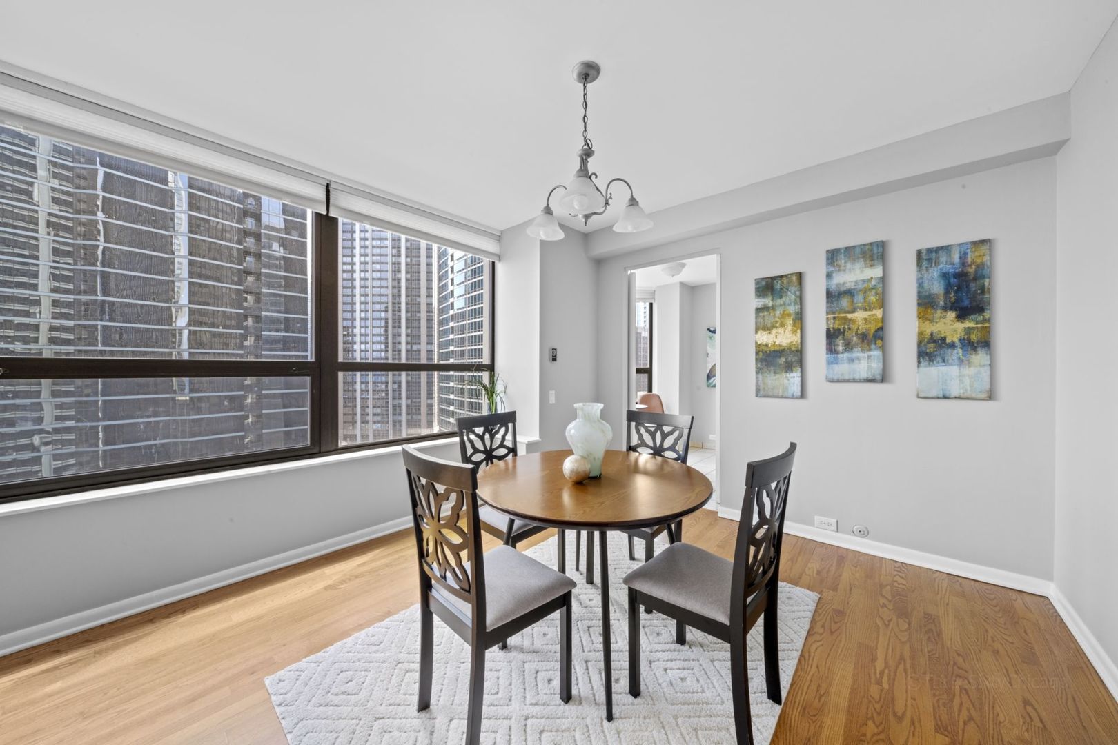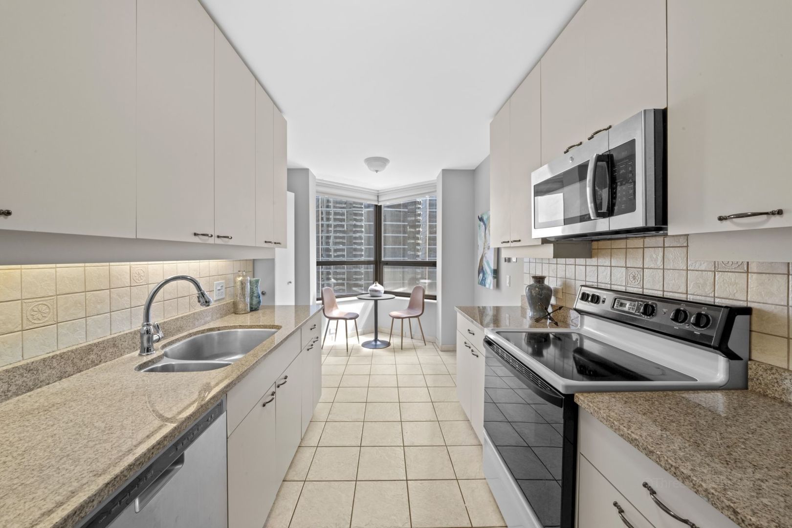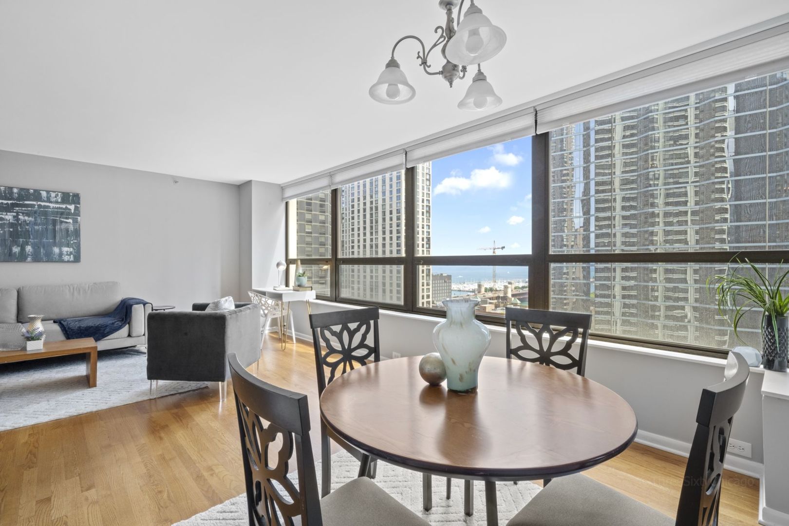 Enjoy sweeping city and lake views from every room in this spacious Streeterville 2 Bed/2 Bath condo. Real hardwood floors and an abundance of natural light flow from South facing windows. Enjoy a view of Navy Pier from the kitchen breakfast nook. The extra large living area and dining space are perfect for entertaining. The primary bedroom features a wall of closet space and an en-suite bath. Unit also features a walk-in storage closet with built-in shelving, in-unit Bosch washer/dryer and a heated garage parking that is included in the price. 400 Ohio is a wonderful full amenity building including 24-hour doorman, fitness center, pool, sauna, sundeck w firepit and grills. Close to transportation, lakefront, Whole Foods, Mag Mile shopping, Northwestern Medical Center, restaurants, nightlife!