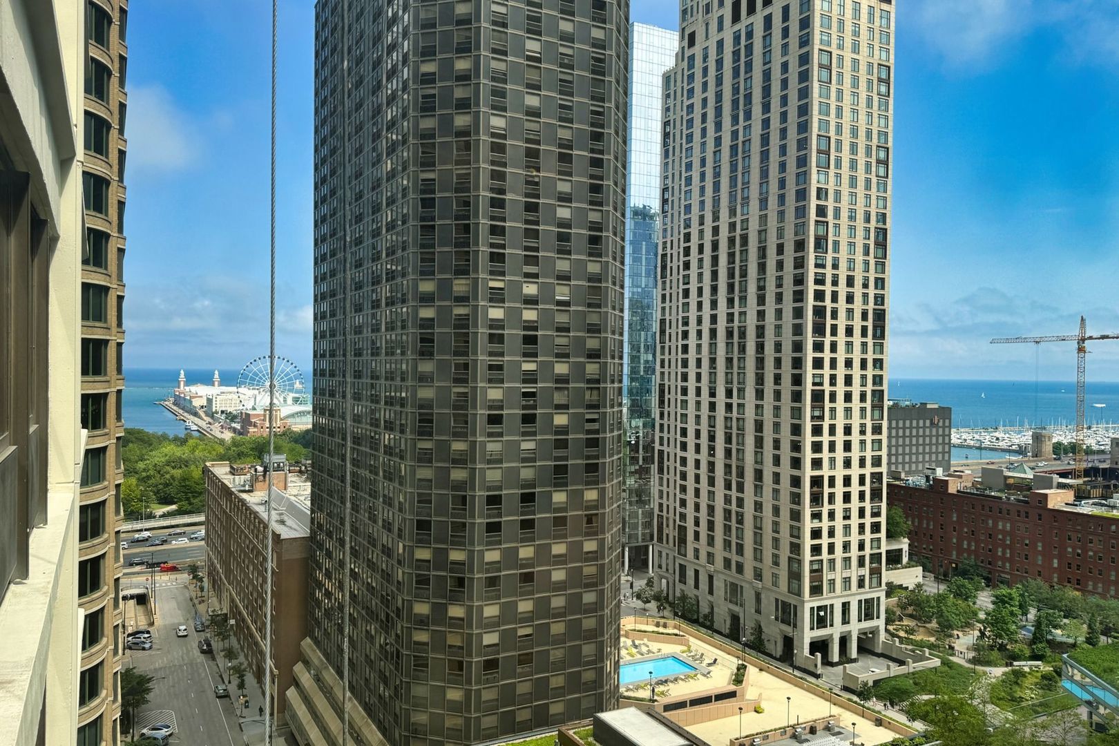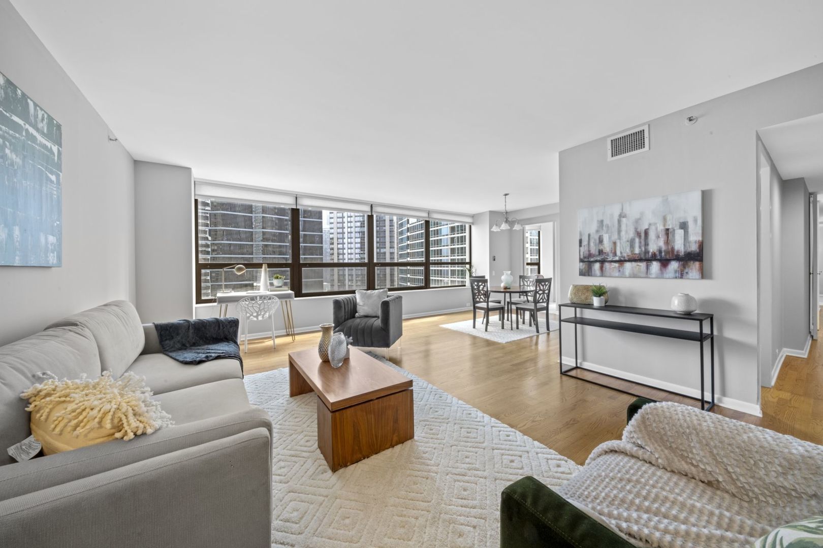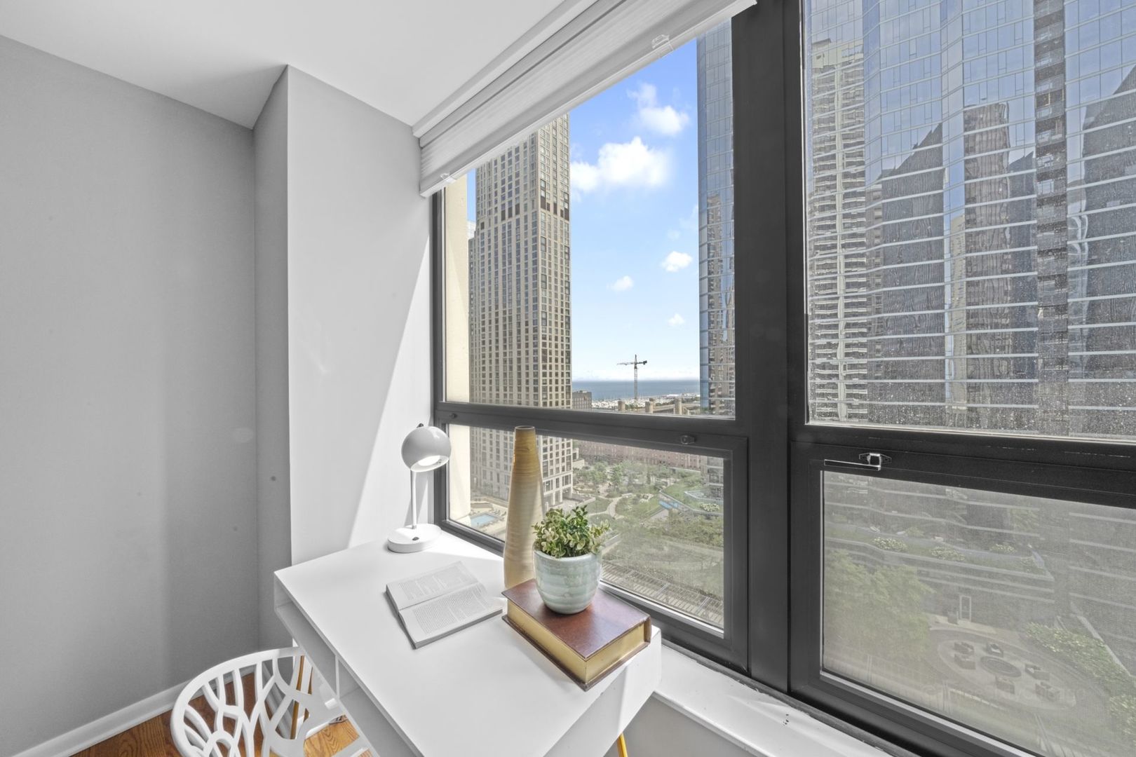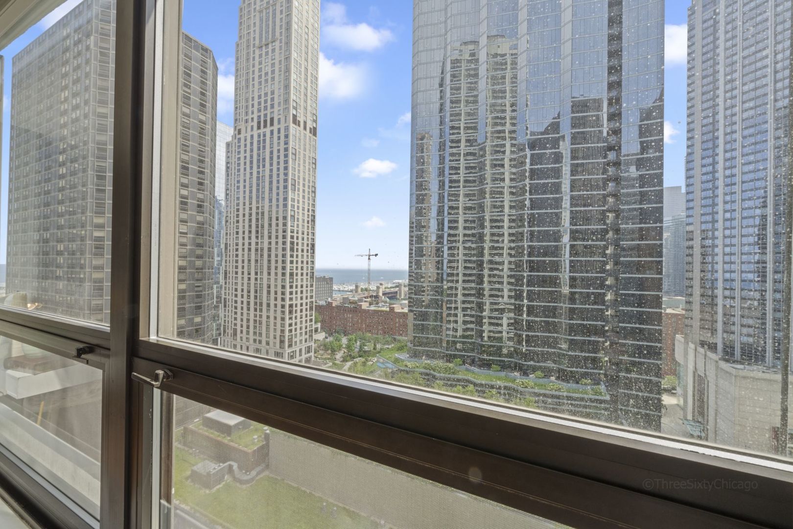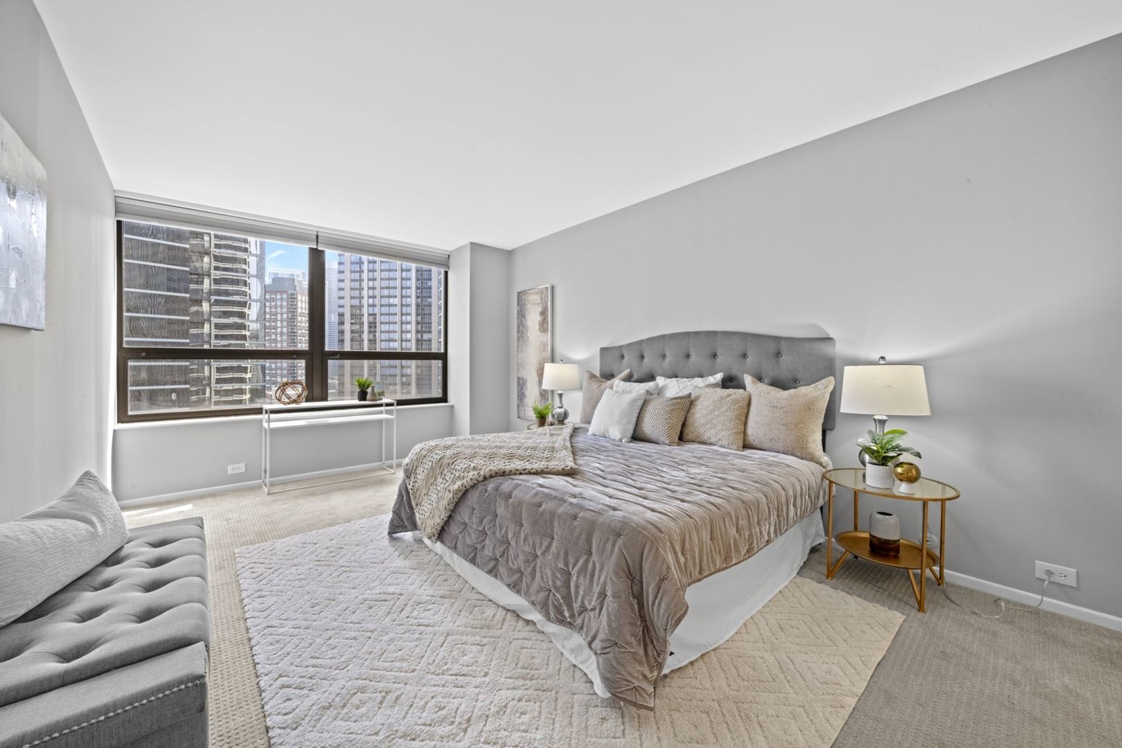 Enjoy sweeping city and lake views from every room in this spacious Streeterville 2 Bed/2 Bath condo. Real hardwood floors and an abundance of natural light flow from South facing windows. Enjoy a view of Navy Pier from the kitchen breakfast nook. The extra large living area and dining space are perfect for entertaining. The primary bedroom features a wall of closet space and an en-suite bath. Unit also features a walk-in storage closet with built-in shelving, in-unit Bosch washer/dryer and a heated garage parking that is included in the price. 400 Ohio is a wonderful full amenity building including 24-hour doorman, fitness center, pool, sauna, sundeck w firepit and grills. Close to transportation, lakefront, Whole Foods, Mag Mile shopping, Northwestern Medical Center, restaurants, nightlife!