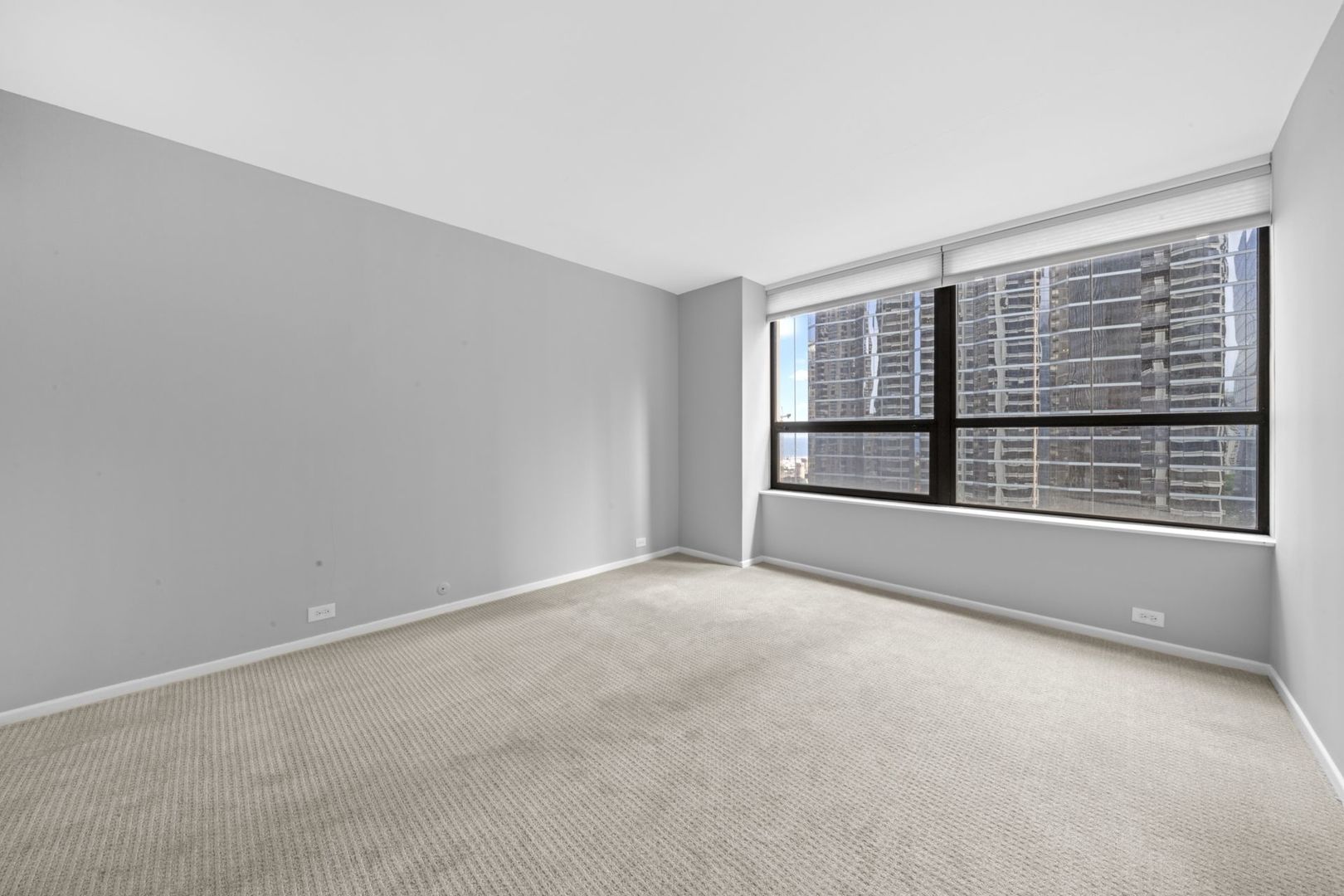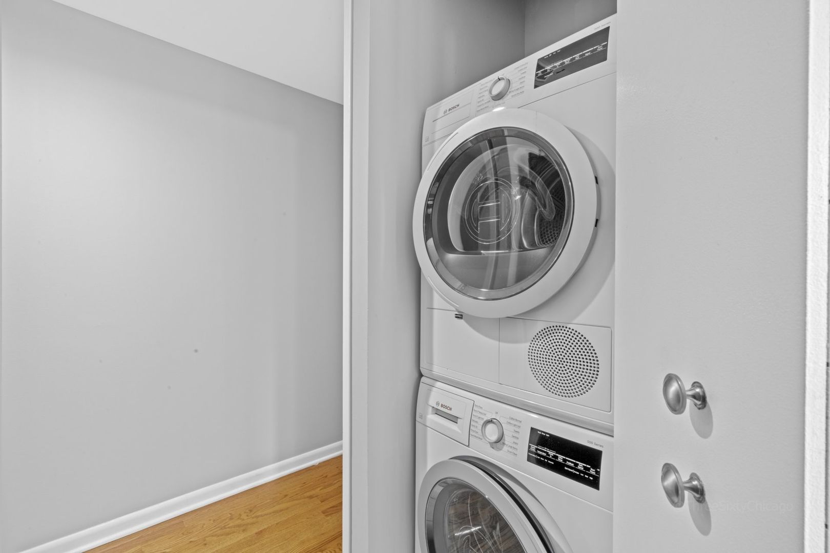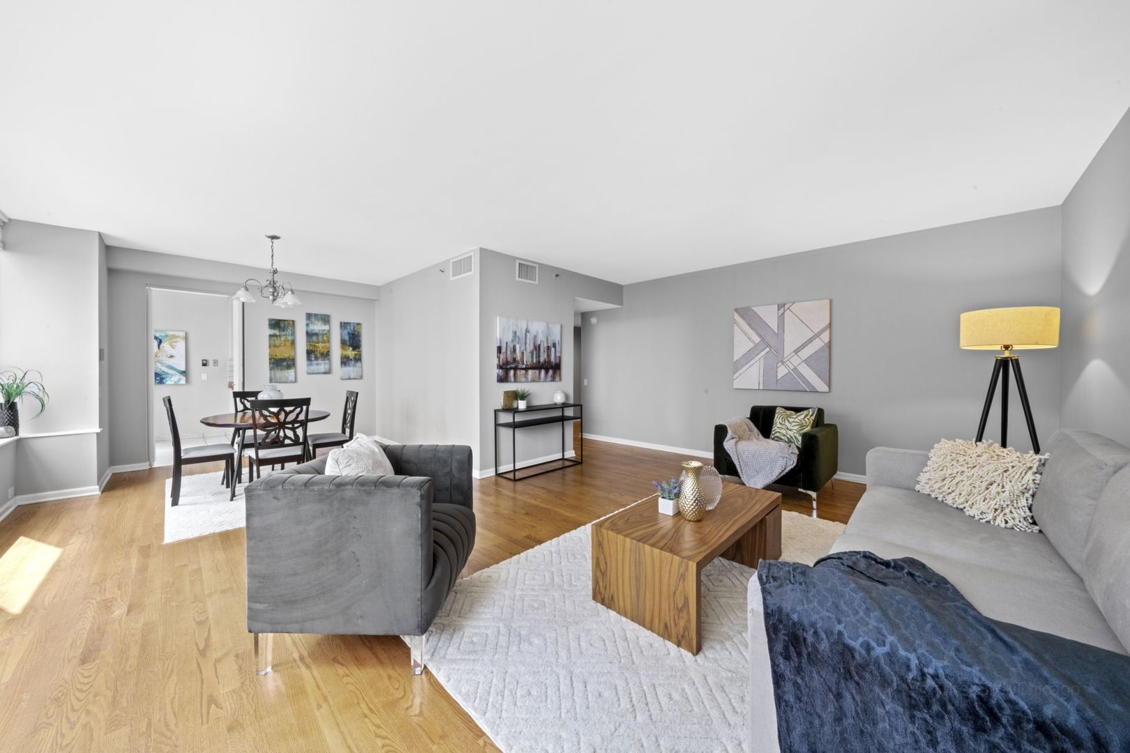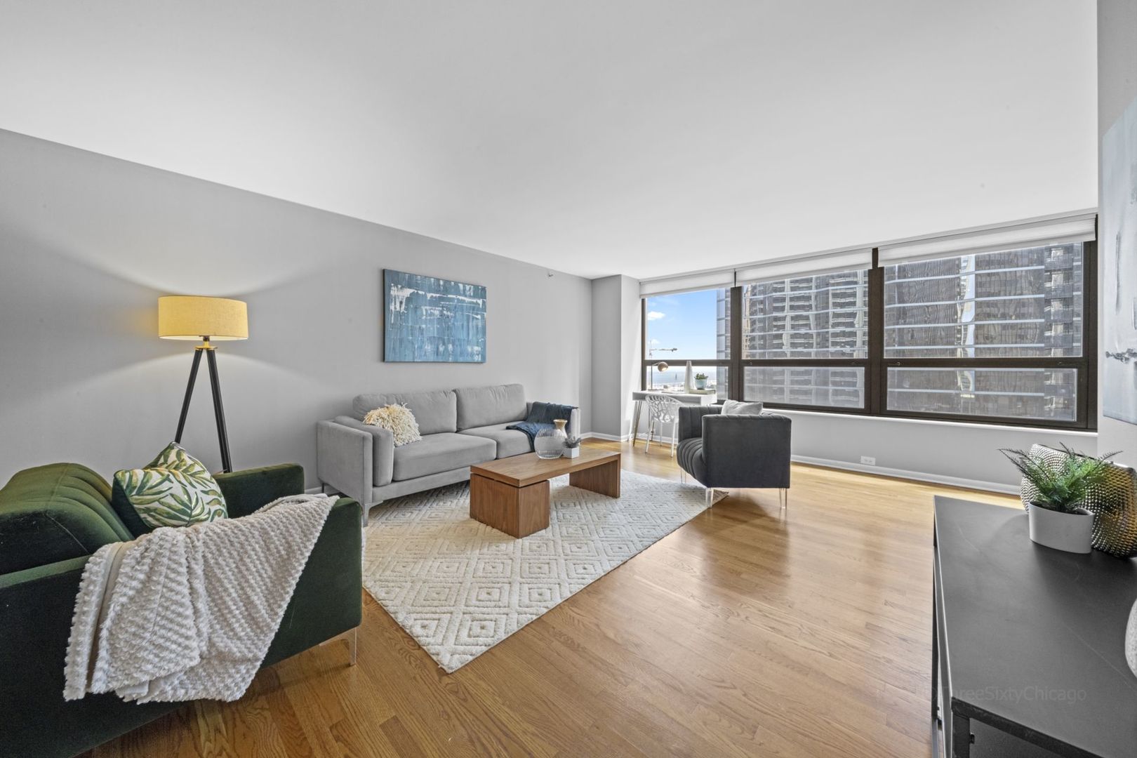 Enjoy sweeping city and lake views from every room in this spacious Streeterville 2 Bed/2 Bath condo. Real hardwood floors and an abundance of natural light flow from South facing windows. Enjoy a view of Navy Pier from the kitchen breakfast nook. The extra large living area and dining space are perfect for entertaining. The primary bedroom features a wall of closet space and an en-suite bath. Unit also features a walk-in storage closet with built-in shelving, in-unit Bosch washer/dryer and a heated garage parking that is included in the price. 400 Ohio is a wonderful full amenity building including 24-hour doorman, fitness center, pool, sauna, sundeck w firepit and grills. Close to transportation, lakefront, Whole Foods, Mag Mile shopping, Northwestern Medical Center, restaurants, nightlife!