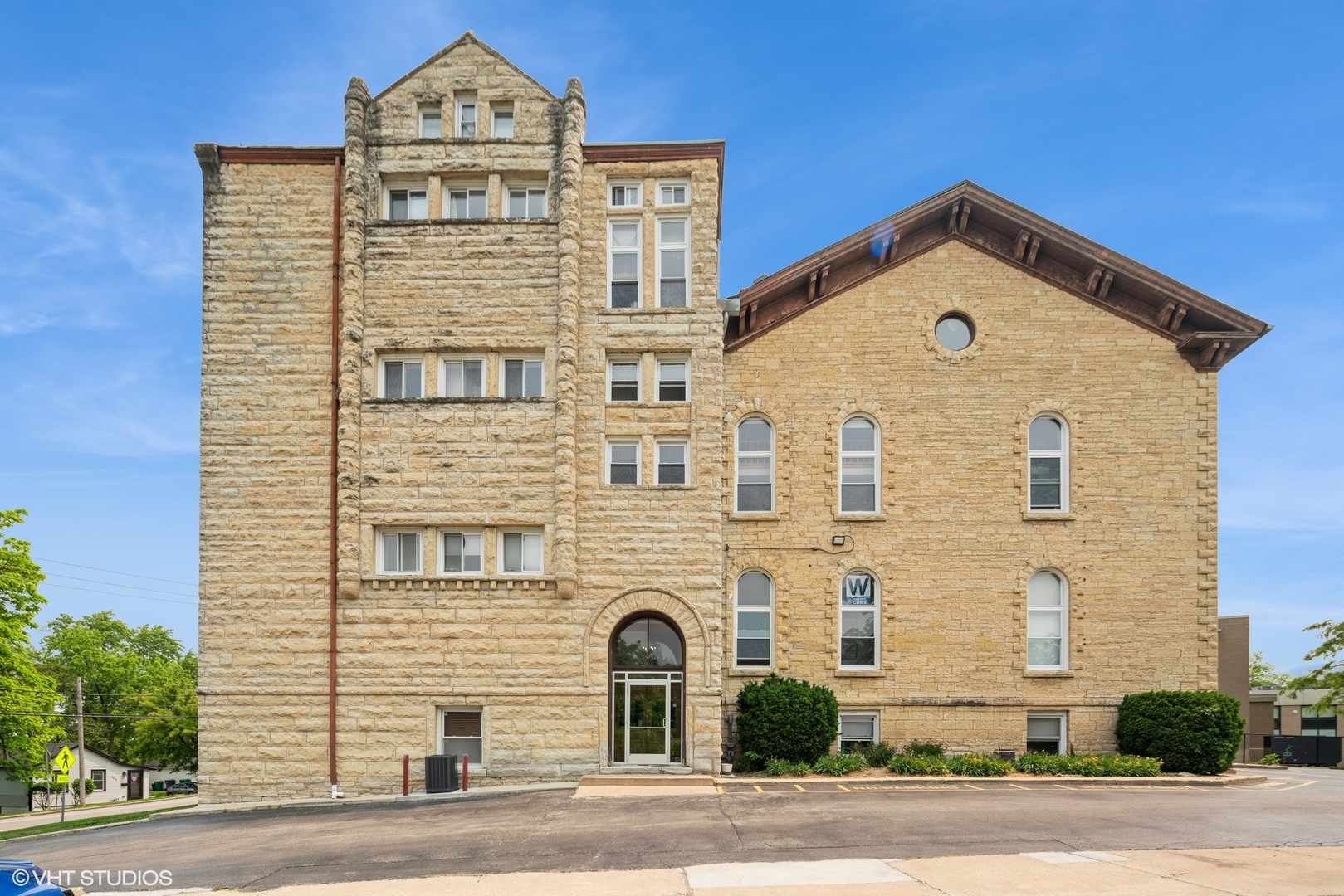 Unique condo with elevator located steps from downtown Lemont. This freshly painted unit is move-in ready and has a large porthole window in the living room showcased on a limestone wall. High quality engineered hardwood flooring newly installed in living room and kitchen. Eat-in kitchen with granite countertops has BRAND NEW STAINLESS STEEL APPLIANCES! The limestone wall extends into bedroom one. Both bedrooms have new carpet. Because this unit is on the top floor there is access to two very large storage closets. Updated Bathroom has brand new vanity, mirror and light fixture. Laundry facilities are in the basement. There are two (tandem) assigned parking spaces. Monthly assessment includes HEAT, WATER, GARBAGE PICK-UP, COMMON INSURANCE, EXTERIOR MAINTENANCE, SNOW REMOVAL