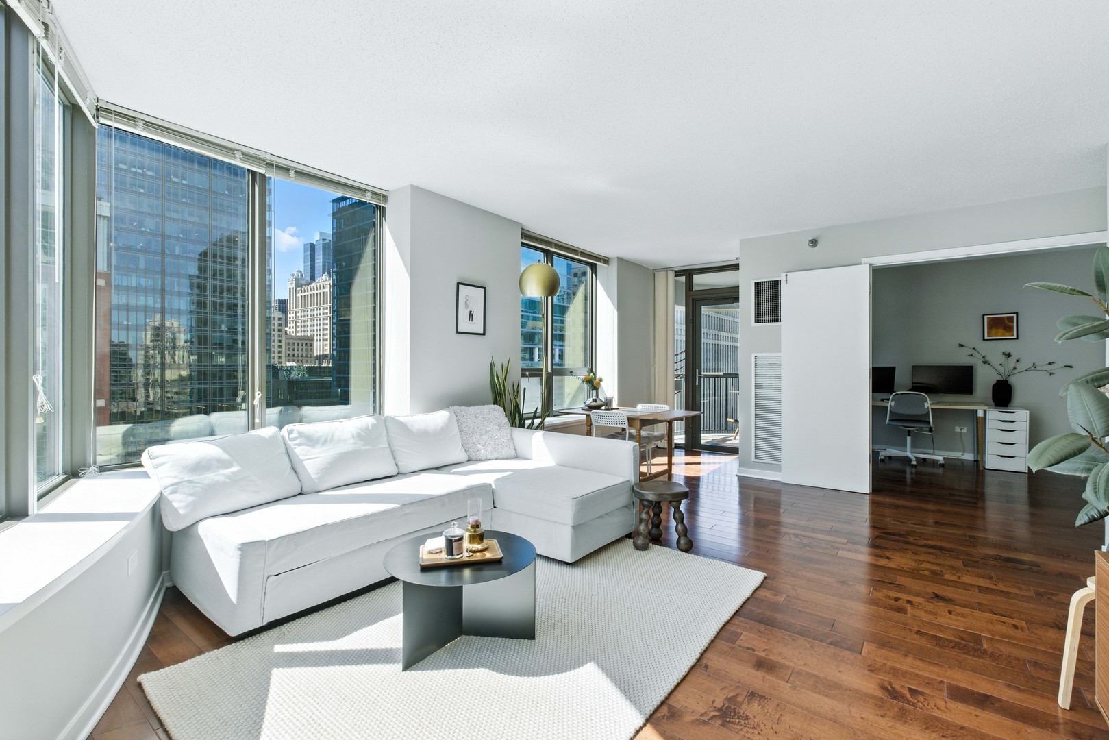 CORNER CONDO WITH SKYLINE VIEWS, PRIVATE BALCONY, IN-UNIT LAUNDRY & EXCEPTIONAL CLOSET SPACE. This high-value corner 2-bedroom residence in the heart of River North offers exceptional space, natural light, and unbeatable convenience. A welcoming foyer and hallway double as the perfect gallery for artwork, leading into a bright, open-concept living area. Expansive floor-to-ceiling windows along two exposures frame sweeping skyline views, including a front-row seat to Chicago’s fireworks, while flooding the home with natural light. Step out onto your private balcony, perfect for morning coffee or evening wine, and enjoy the city from every angle. The PRIMARY SUITE easily fits a king-sized bed with nightstands and dresser, blending comfort with functionality. The versatile SECOND BEDROOM is ideal as a guest room, home office, gym, or media space. Recently updated HARDWOOD FLOORS are in pristine condition, and IN-UNIT LAUNDRY plus an abundance of CLOSET SPACE which is rare for River North and make this home as functional as it is beautiful. Additional STORAGE on the 7th floor (Storage #349) further enhances convenience. 400 N LaSalle offers premier AMENITIES: 24-hour door staff, outdoor pool, sundeck with grills, fitness center, and on-site dry cleaning. Attached garage parking is available for rent. Perfectly situated just steps from River North’s renowned dining, nightlife, and everyday conveniences, this corner home has it all.