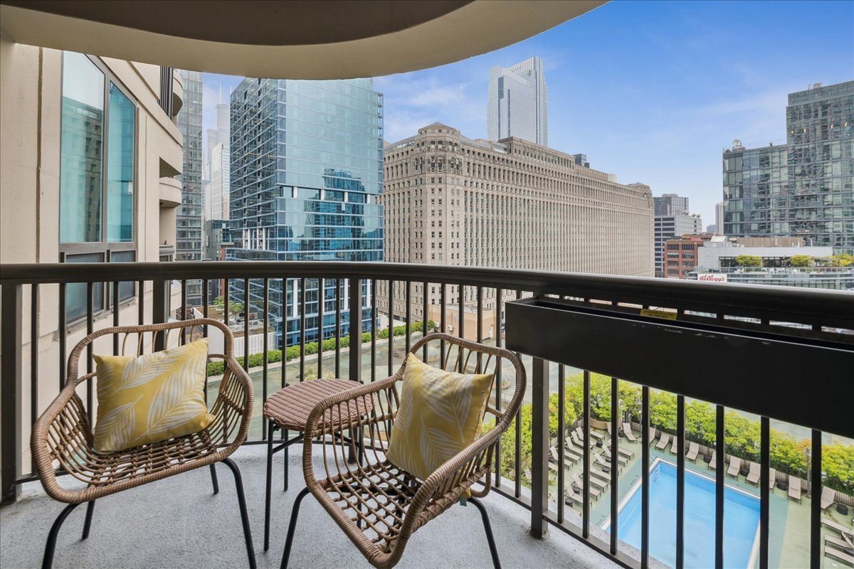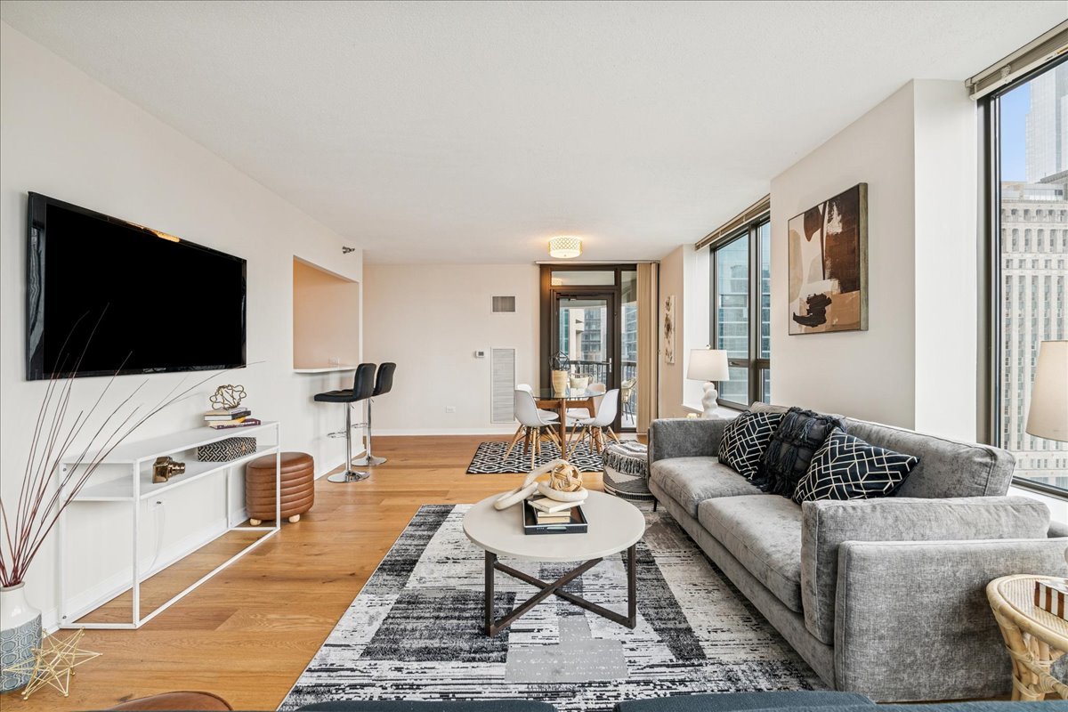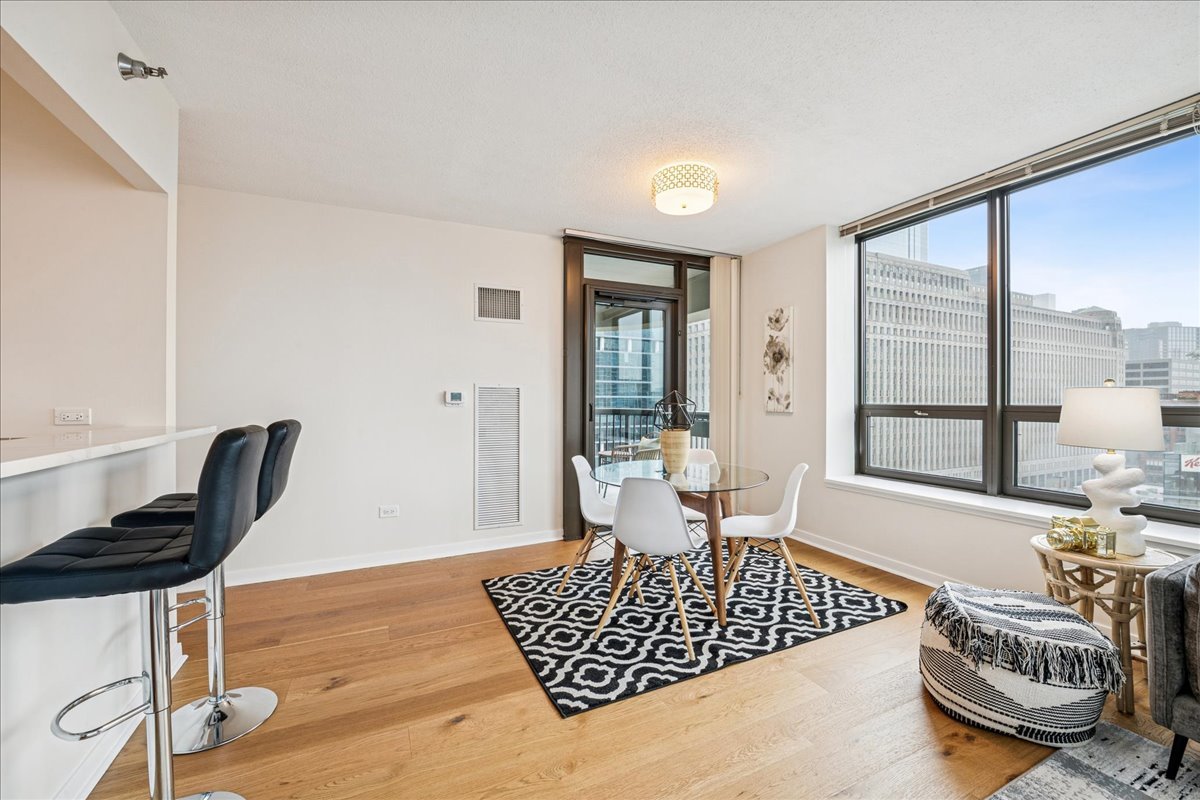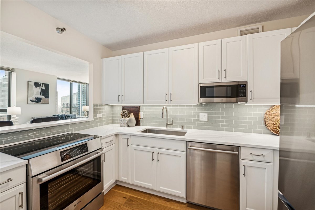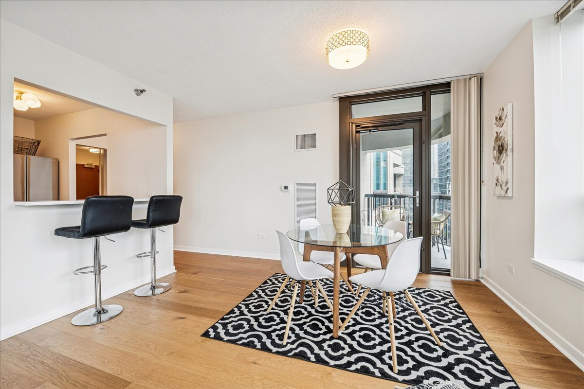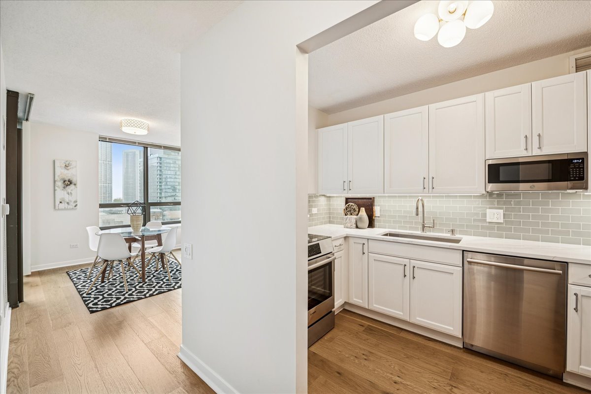This beautifully remodeled 1-bedroom, 1-bathroom corner condo offers the perfect blend of style, comfort, and convenience in one of Chicago’s most desirable neighborhoods: River North. Step into the formal foyer with a tucked-away walk-in closet. Continue down the hallway to the show-stopping, fully renovated kitchen (2024) with new cabinetry, white quartz countertops, a sleek tile backsplash, under-cabinet lighting, deep undermount sink, and high-end appliances including a Bosch induction range/oven, Bosch dishwasher, Samsung refrigerator, and GE microwave. The kitchen island seats 2-3 and opens seamlessly to a spacious dining area that accommodates 6-8 guests, with direct access to your private balcony overlooking the pool deck. The expansive corner living room is framed by oversized windows offering breathtaking city views and dramatic sunsets. The generous primary bedroom easily accommodates a king-size bed and includes a large walk-in closet. The fully renovated bathroom showcases a walk-in shower with Kohler fixtures, a modern Kohler vanity, and a built-in medicine cabinet with front lighting. The laundry features an LG washer/dryer (less than 3 years old). Additional updates include new hardwood floors, fresh paint, modern light fixtures, and new baseboards throughout-truly move-in ready. Building Amenities: Newly renovated 8th-floor fitness center (2023), Resort-style pool deck with pergolas, fire pit, lush landscaping, and four new commercial-grade Weber grills (2025), expansive social/party room with TV, foosball, and ping pong, 24-hour door staff, on-site maintenance, and receiving/dry-cleaning services, secure bike storage, private storage lockers, and dedicated pet relief area, and an active social club hosting regular resident events. Parking is available for lease in the attached garage (approx. $300/month). Perfectly situated just steps from the Riverwalk, East Bank Club, top-rated restaurants, and the Brown & Purple Lines at Merchandise Mart, this home places the very best of Chicago at your doorstep.