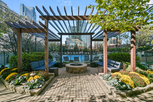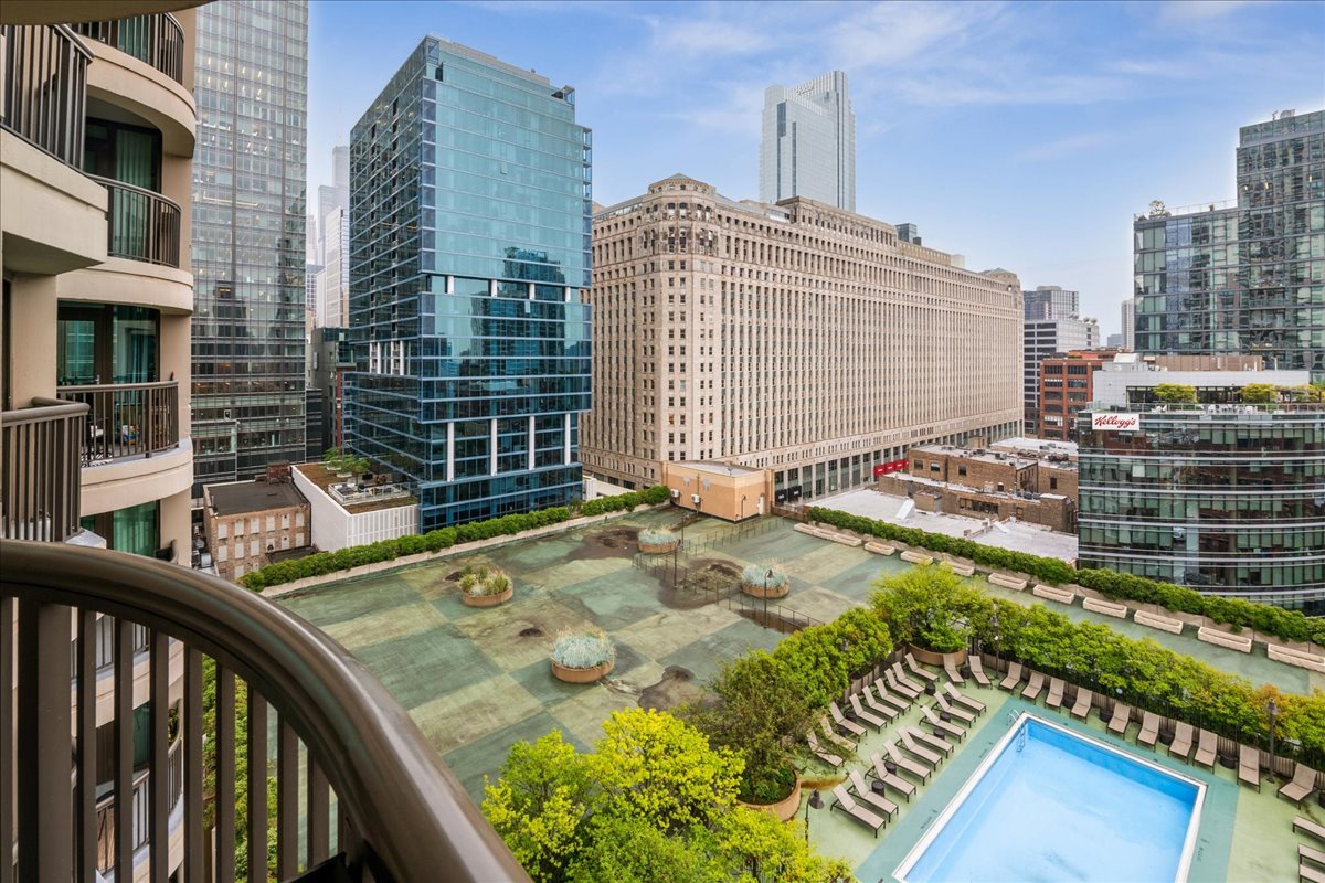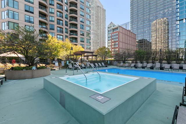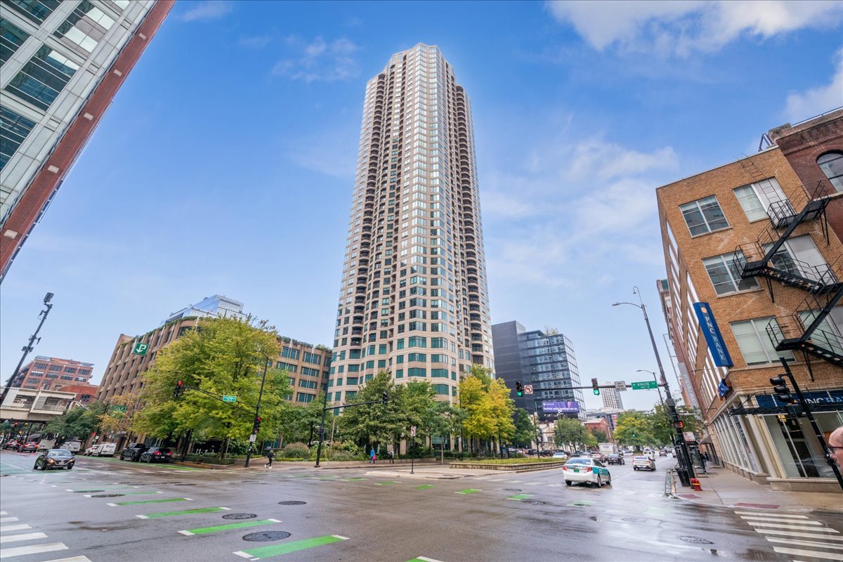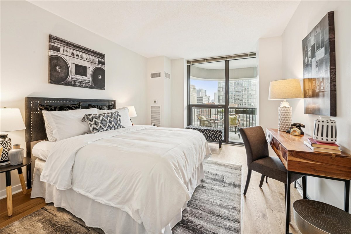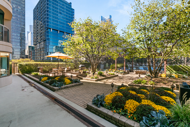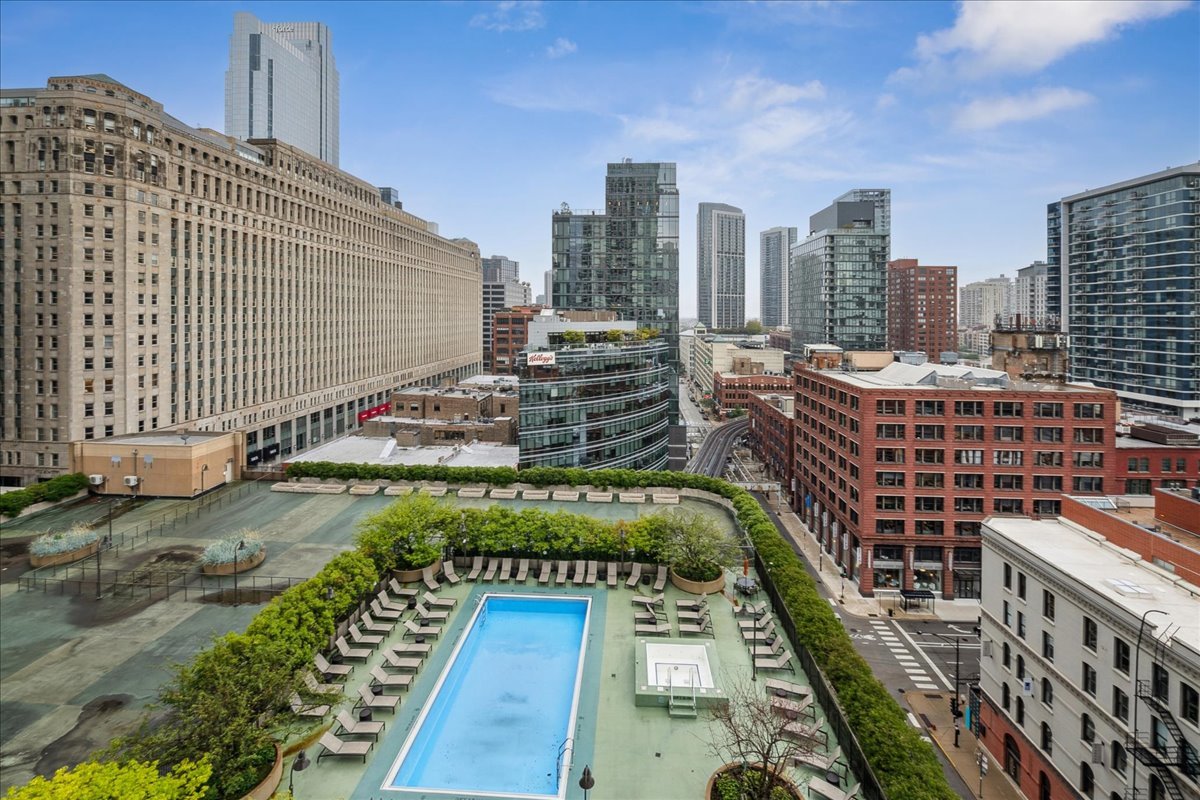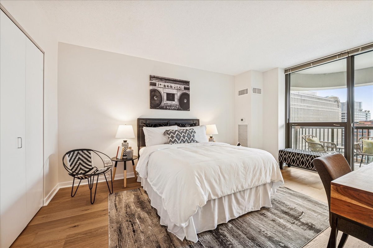 This beautifully remodeled 1-bedroom, 1-bathroom corner condo offers the perfect blend of style, comfort, and convenience in one of Chicago’s most desirable neighborhoods: River North. Step into the formal foyer with a tucked-away walk-in closet. Continue down the hallway to the show-stopping, fully renovated kitchen (2024) with new cabinetry, white quartz countertops, a sleek tile backsplash, under-cabinet lighting, deep undermount sink, and high-end appliances including a Bosch induction range/oven, Bosch dishwasher, Samsung refrigerator, and GE microwave. The kitchen island seats 2-3 and opens seamlessly to a spacious dining area that accommodates 6-8 guests, with direct access to your private balcony overlooking the pool deck. The expansive corner living room is framed by oversized windows offering breathtaking city views and dramatic sunsets. The generous primary bedroom easily accommodates a king-size bed and includes a large walk-in closet. The fully renovated bathroom showcases a walk-in shower with Kohler fixtures, a modern Kohler vanity, and a built-in medicine cabinet with front lighting. The laundry features an LG washer/dryer (less than 3 years old). Additional updates include new hardwood floors, fresh paint, modern light fixtures, and new baseboards throughout-truly move-in ready. Building Amenities: Newly renovated 8th-floor fitness center (2023), Resort-style pool deck with pergolas, fire pit, lush landscaping, and four new commercial-grade Weber grills (2025), expansive social/party room with TV, foosball, and ping pong, 24-hour door staff, on-site maintenance, and receiving/dry-cleaning services, secure bike storage, private storage lockers, and dedicated pet relief area, and an active social club hosting regular resident events. Parking is available for lease in the attached garage (approx. $300/month). Perfectly situated just steps from the Riverwalk, East Bank Club, top-rated restaurants, and the Brown & Purple Lines at Merchandise Mart, this home places the very best of Chicago at your doorstep.