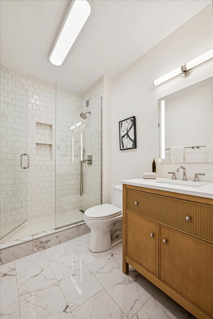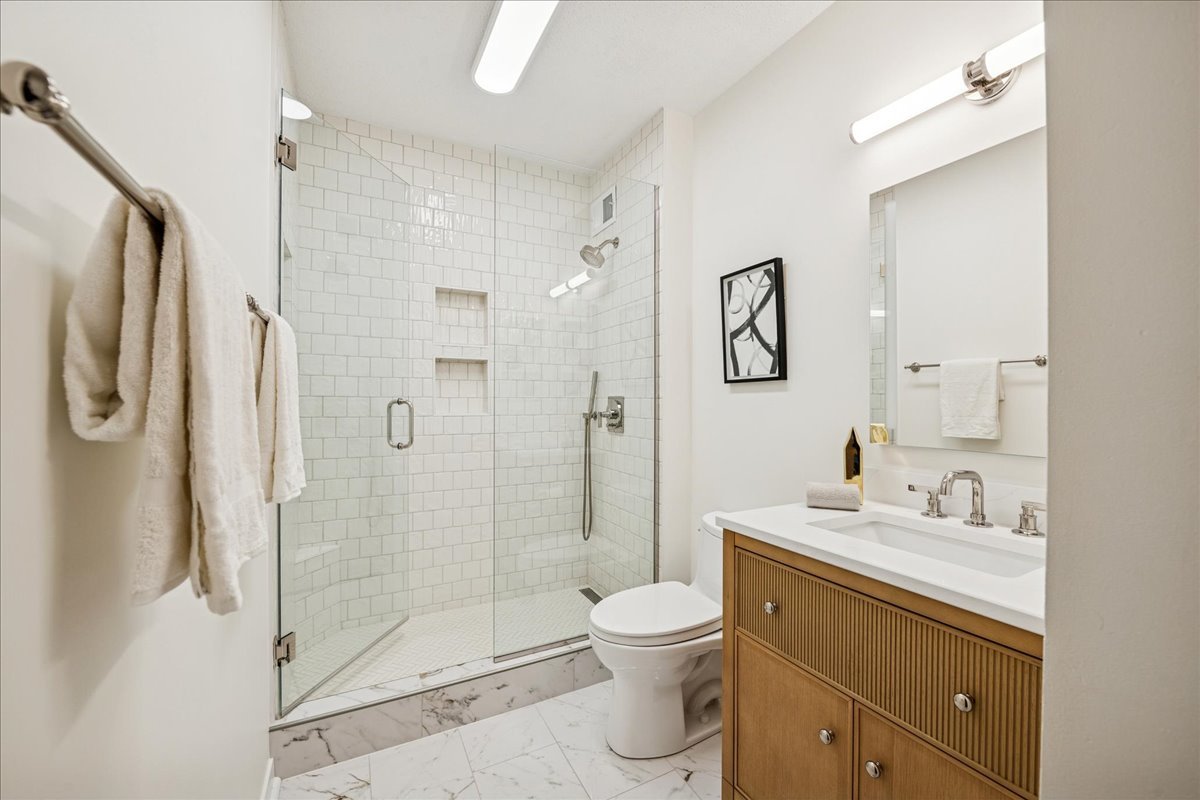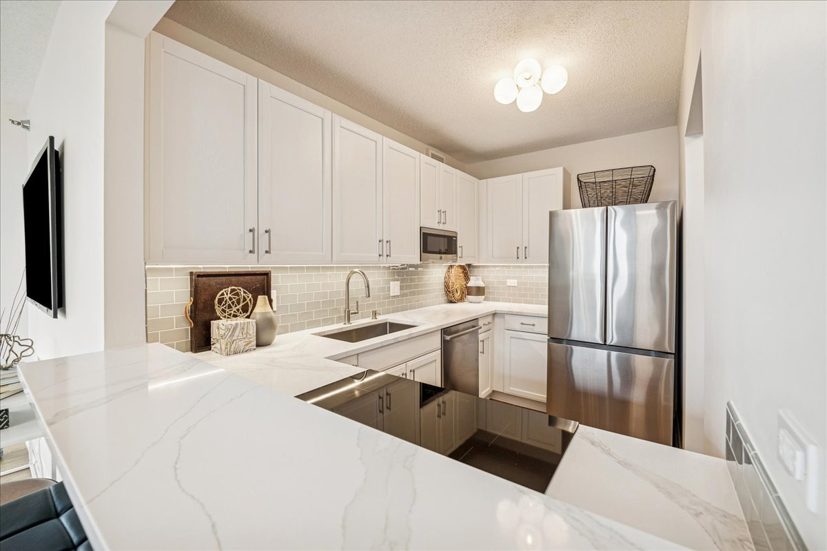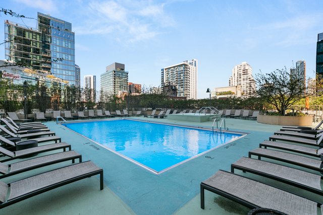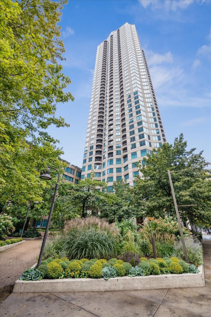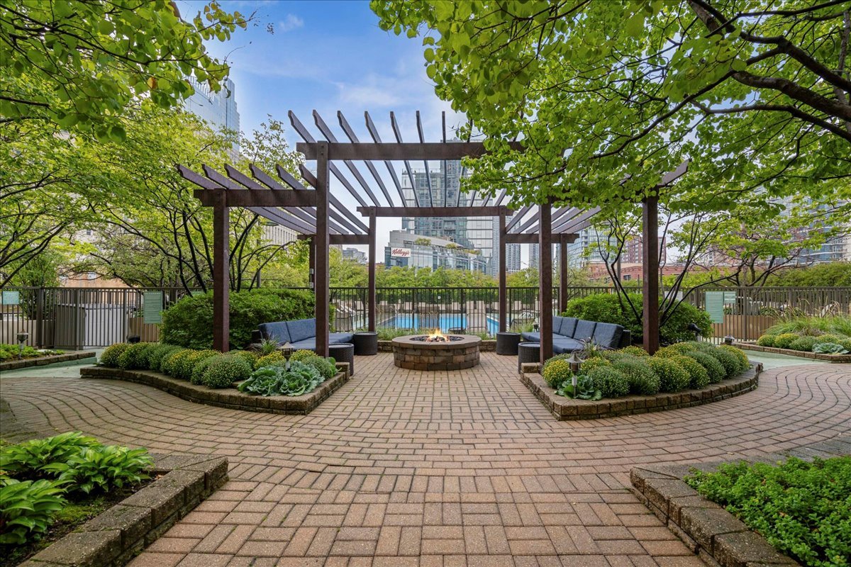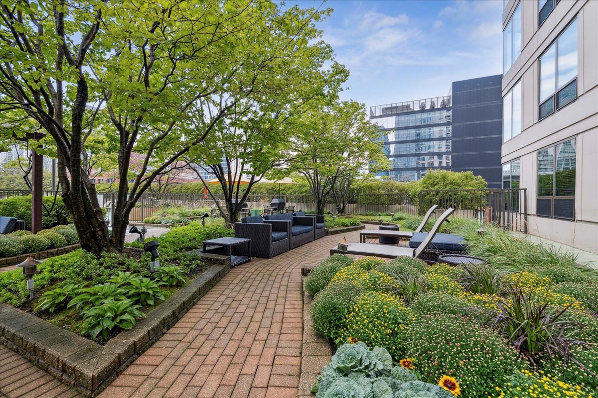 This beautifully remodeled 1-bedroom, 1-bathroom corner condo offers the perfect blend of style, comfort, and convenience in one of Chicago’s most desirable neighborhoods: River North. Step into the formal foyer with a tucked-away walk-in closet. Continue down the hallway to the show-stopping, fully renovated kitchen (2024) with new cabinetry, white quartz countertops, a sleek tile backsplash, under-cabinet lighting, deep undermount sink, and high-end appliances including a Bosch induction range/oven, Bosch dishwasher, Samsung refrigerator, and GE microwave. The kitchen island seats 2-3 and opens seamlessly to a spacious dining area that accommodates 6-8 guests, with direct access to your private balcony overlooking the pool deck. The expansive corner living room is framed by oversized windows offering breathtaking city views and dramatic sunsets. The generous primary bedroom easily accommodates a king-size bed and includes a large walk-in closet. The fully renovated bathroom showcases a walk-in shower with Kohler fixtures, a modern Kohler vanity, and a built-in medicine cabinet with front lighting. The laundry features an LG washer/dryer (less than 3 years old). Additional updates include new hardwood floors, fresh paint, modern light fixtures, and new baseboards throughout-truly move-in ready. Building Amenities: Newly renovated 8th-floor fitness center (2023), Resort-style pool deck with pergolas, fire pit, lush landscaping, and four new commercial-grade Weber grills (2025), expansive social/party room with TV, foosball, and ping pong, 24-hour door staff, on-site maintenance, and receiving/dry-cleaning services, secure bike storage, private storage lockers, and dedicated pet relief area, and an active social club hosting regular resident events. Parking is available for lease in the attached garage (approx. $300/month). Perfectly situated just steps from the Riverwalk, East Bank Club, top-rated restaurants, and the Brown & Purple Lines at Merchandise Mart, this home places the very best of Chicago at your doorstep.